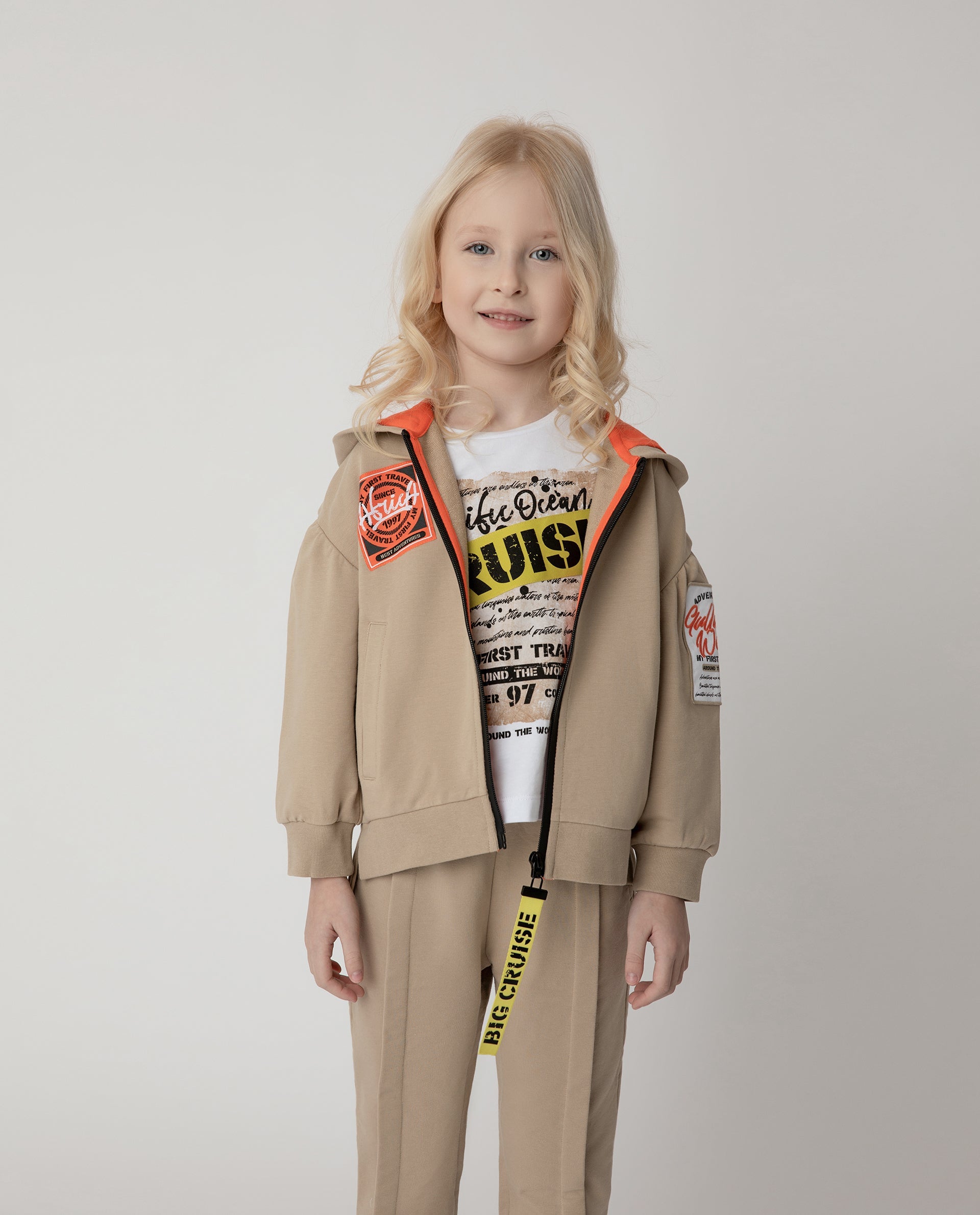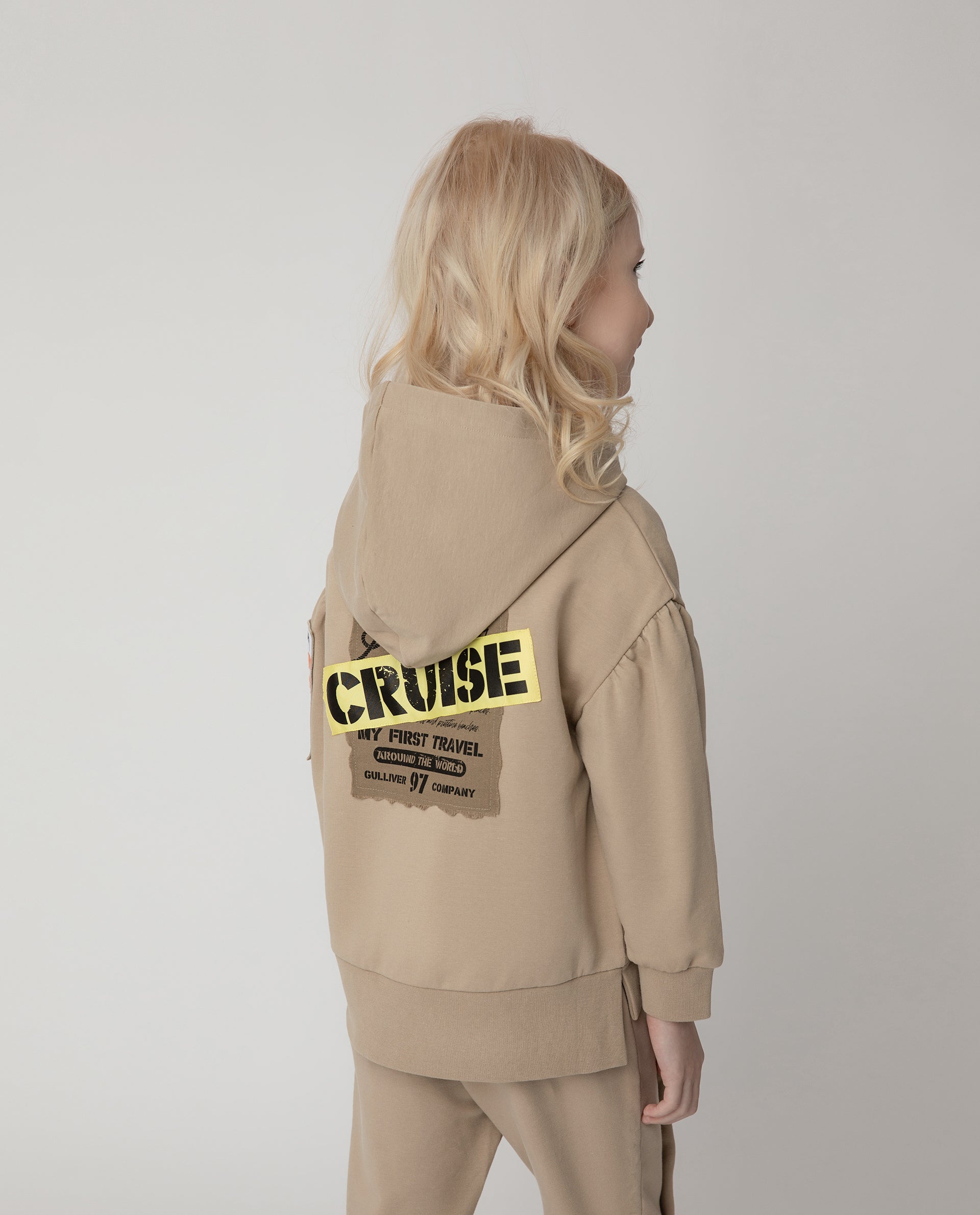 Стилен суитшърт от футер с еластан – бестселър за сезон Пролет/Лято. Обемна форма – умерен овърсайз, удължена линия на гърба, паднало рамо, акцент върху ръкавите – конструктивното решение на модела формира ярък и изразителен образ. Той се подсилва от модерните детайли: отворен край на платката, жакардов ластик от вътрешната страна на качулката, цип с матово гумирано покритие, стилен накрайник (пулер) от лента с шрифтов принт, както и жакардови емблеми и пришити декори с шрифтов принт.