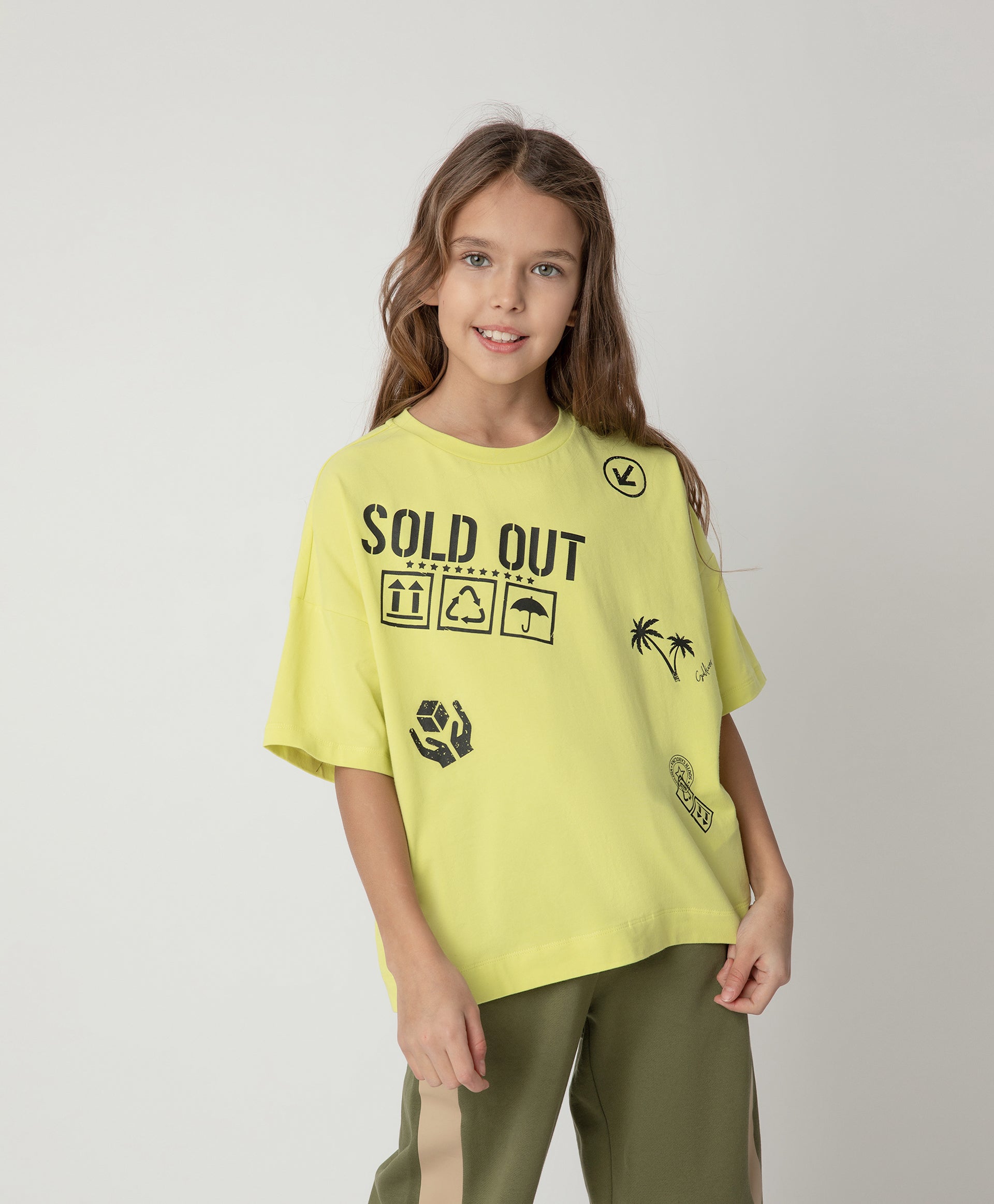 Ярък акцент в летния гардероб – салатова тениска със свободен силует – прекрасно допълнение към гащеризони, панталони и дънки. Оригиналността на модела се придава от облото деколте с отворен край, контрастните принтове и необичайния декоративен елемент, подчертаващ бунтарския дух на тийнейджърката – капса с карабинер в страничния шев.