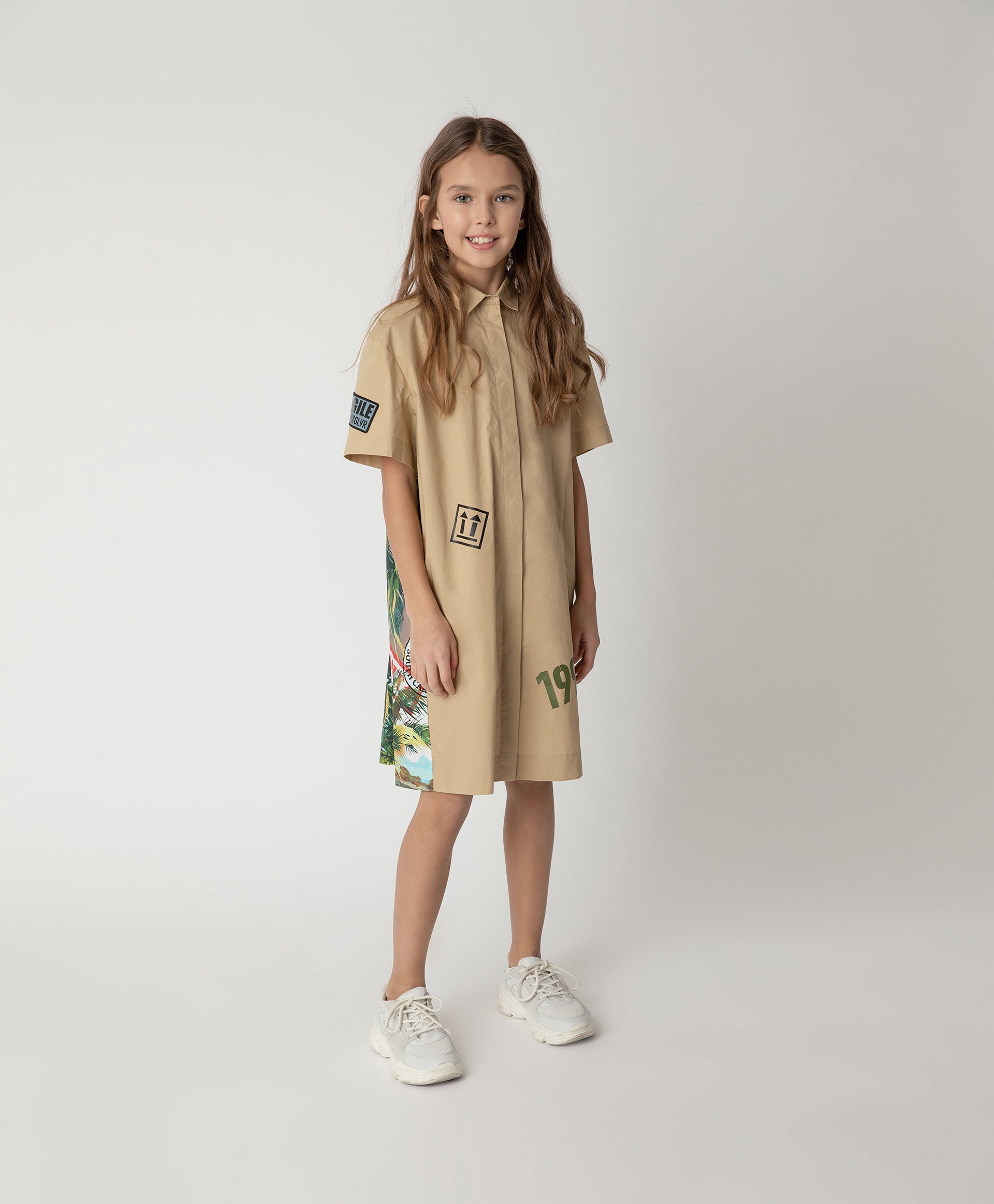 Рокля тип риза с паднало рамо и лек трапецовиден силует, която създава настроение. Изработена от поплин (100% памук) с изнесени странични шевове, които позволяват гърбът да бъде видим – това е важно, тъй като дизайнът е изграден върху комбинация от изчистена материя и орнаментално платно с изразителна сюжетна композиция, създадена чрез дигитален печат. Роклята прави впечатление на ярък и нестандартен модел. Има скрито закопчаване и удобни джобове в страничните шевове. В оформлението са използвани принтове и емблеми.