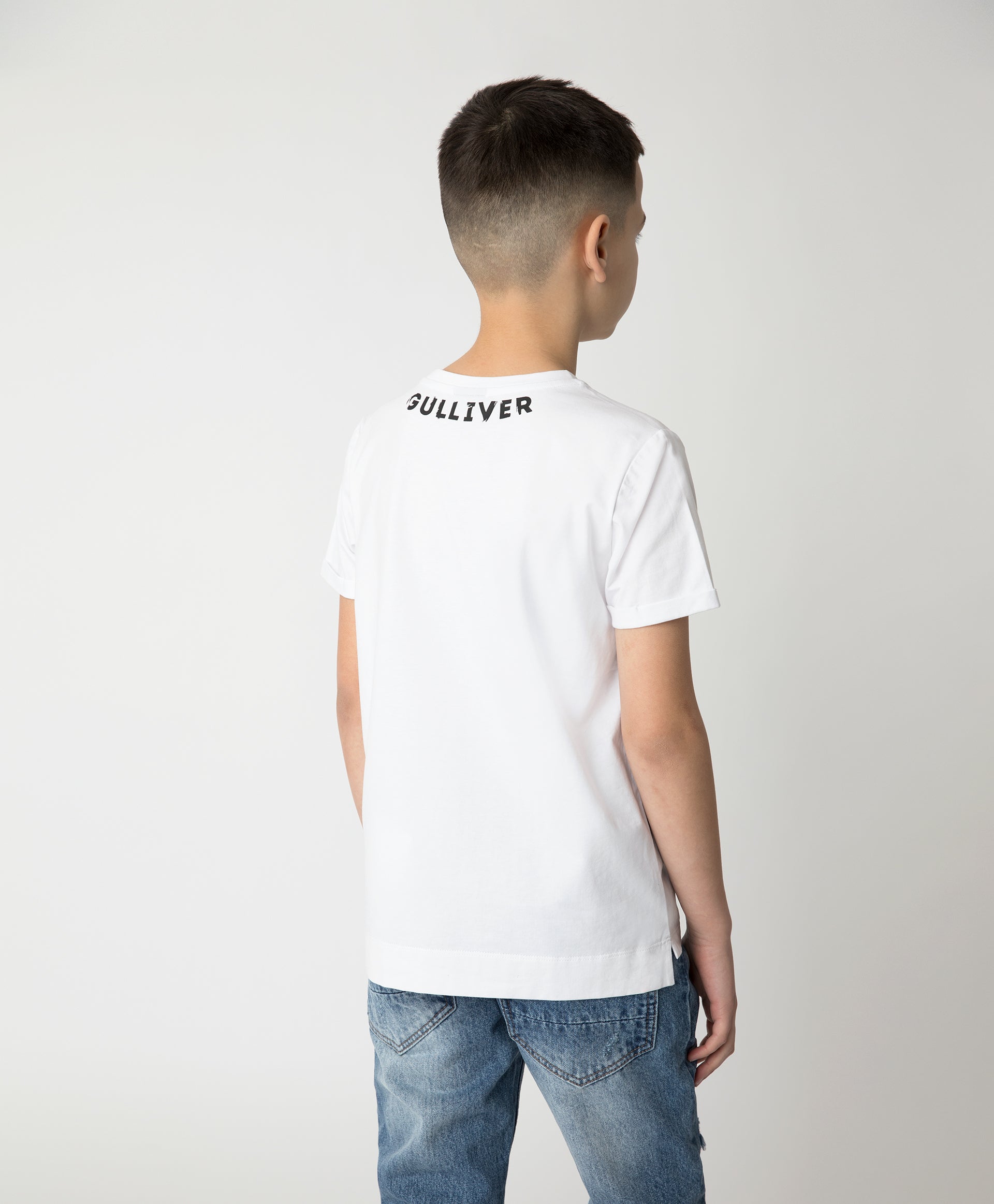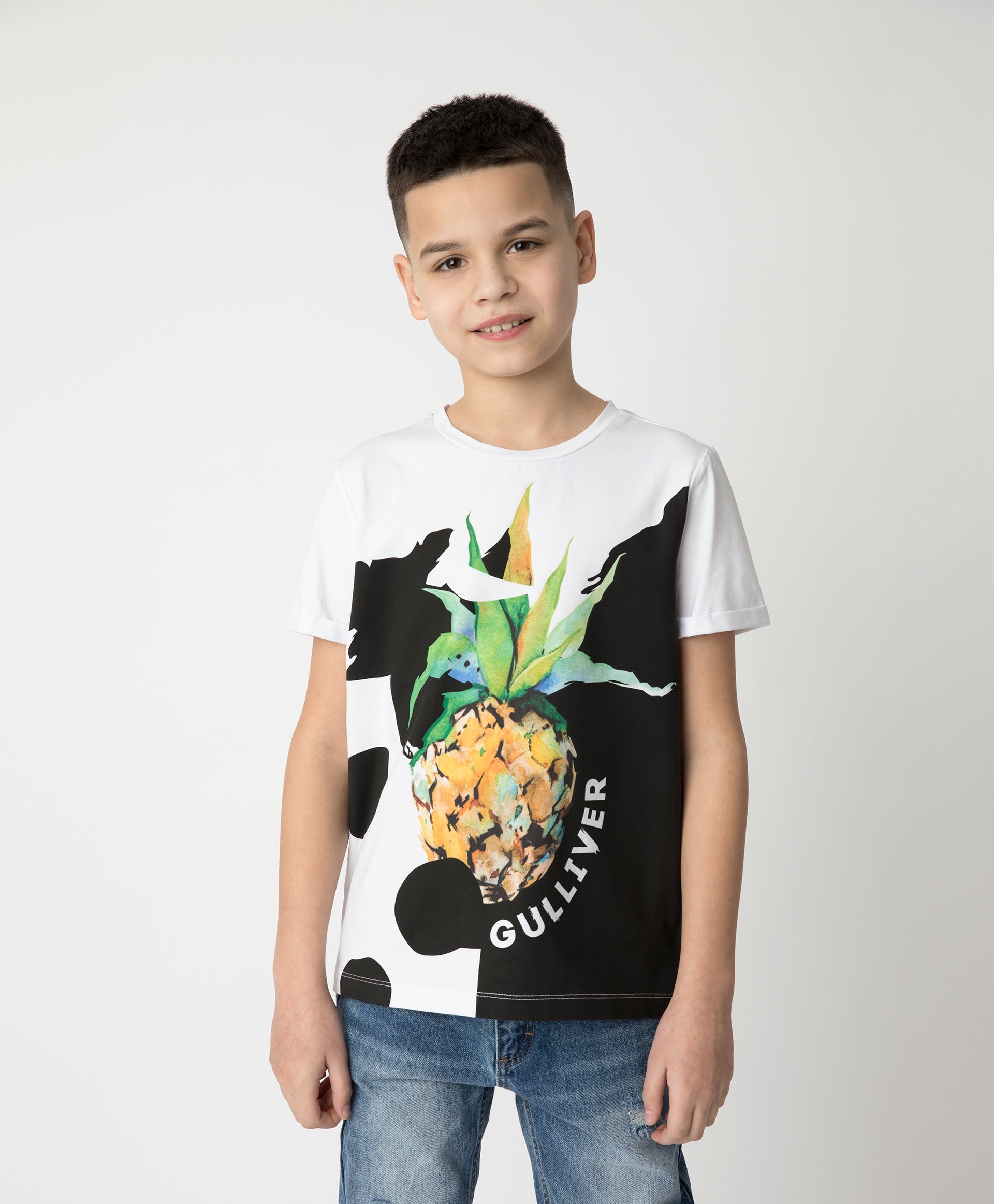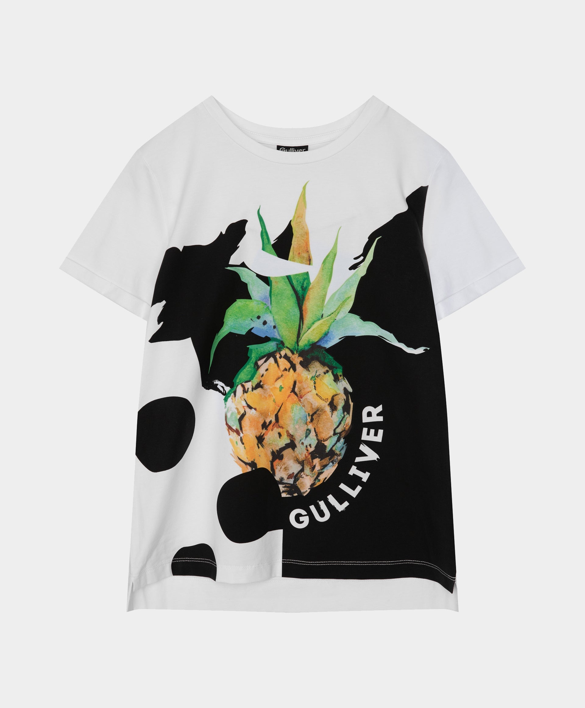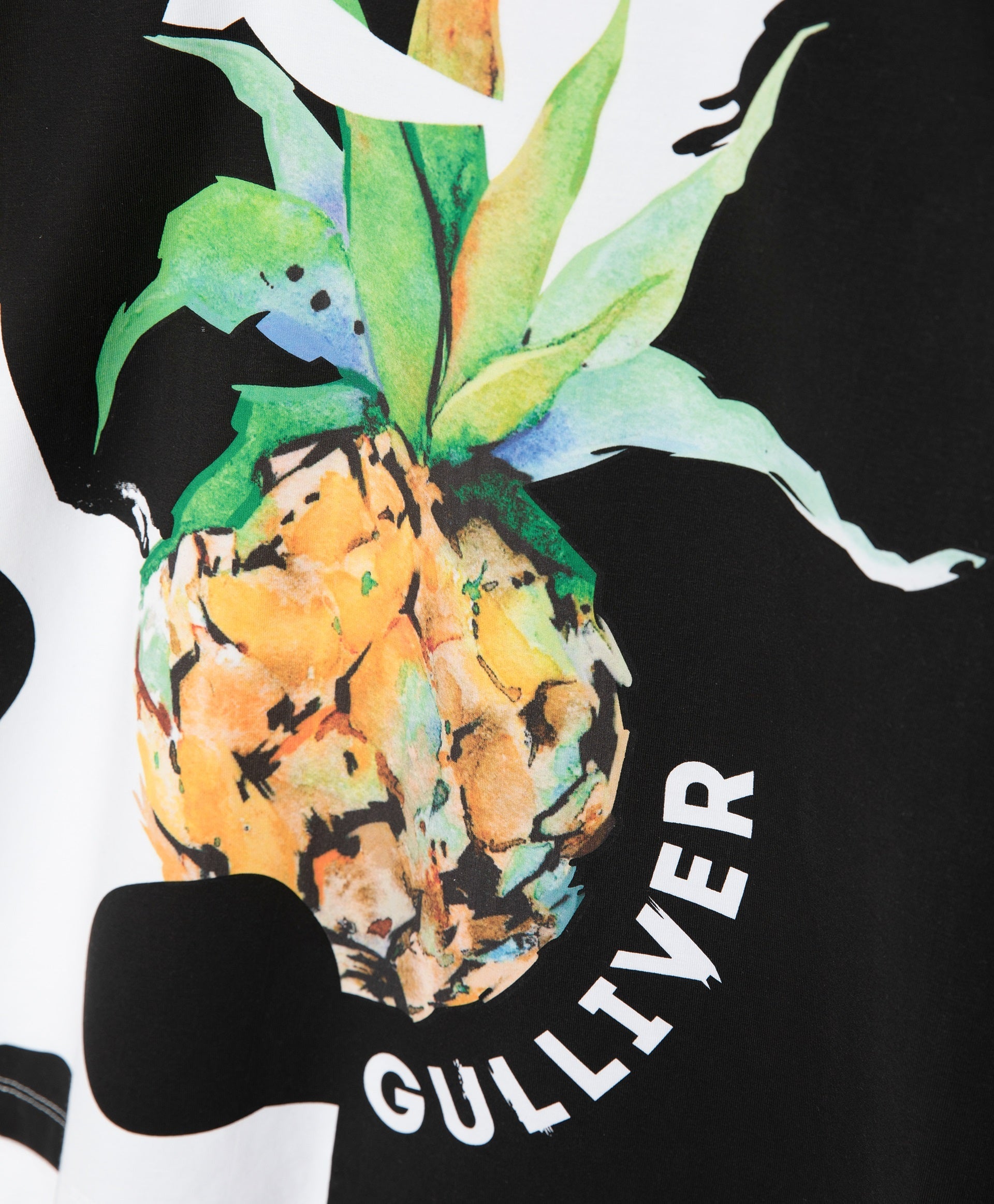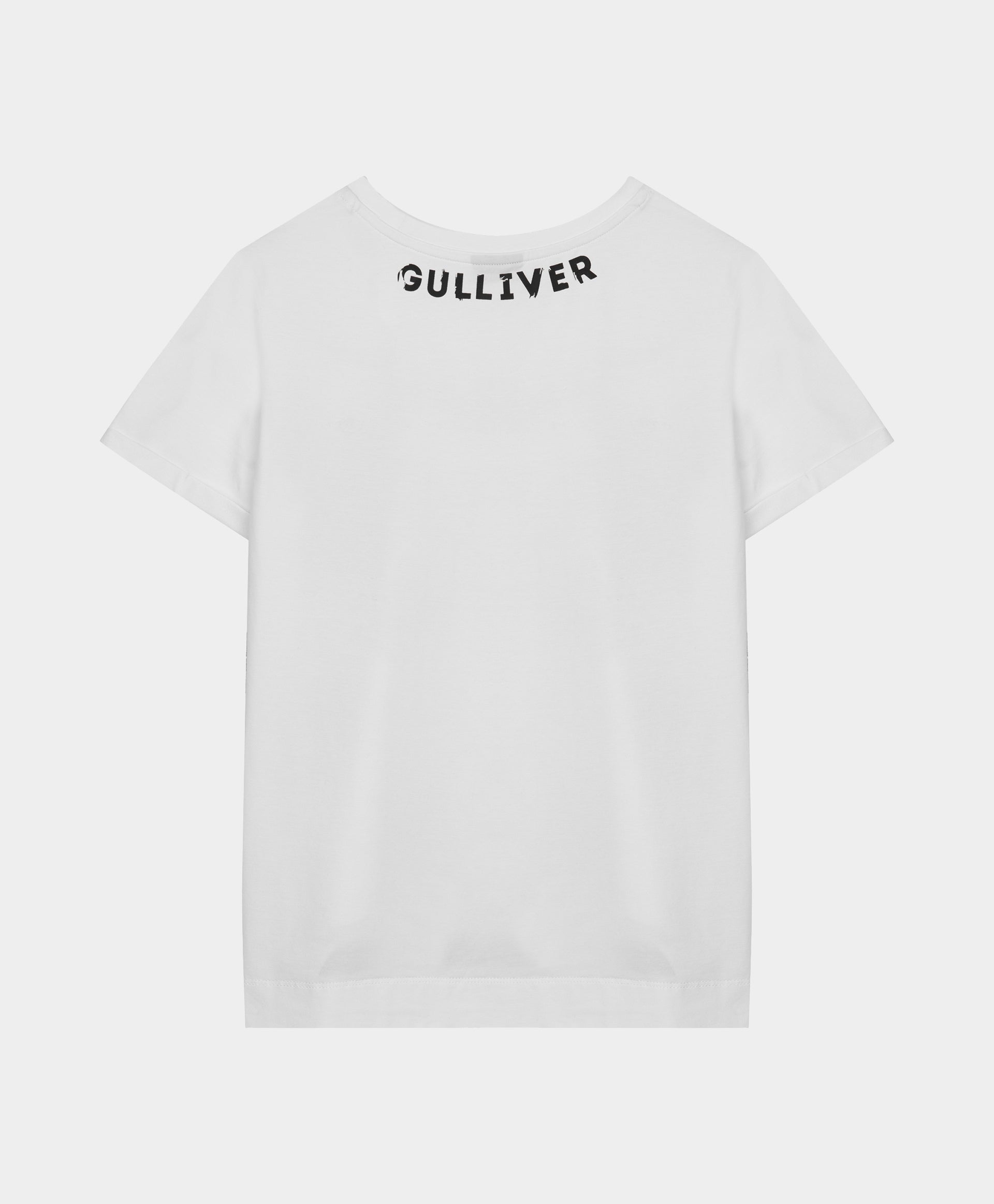 Тениска с голям авторски принт, базиран на черно-бяла графика и ярки фигурални елементи – стилен елемент за летния аутфит. На гърба на тениската е разположен шрифтов принт.