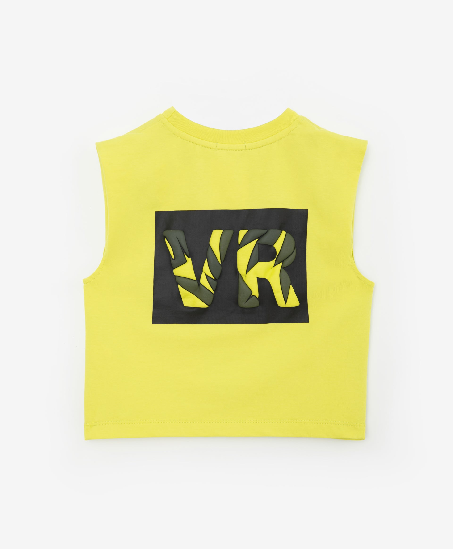 Ярък трикотажен потник със свободна обемна кройка и голям оригинален принт на гърба и отпред – идеална съставка за летния имидж на момичето! Комфортната конструкция с паднало рамо подчертава актуалността на модела и прави потника максимално удобен за носене.