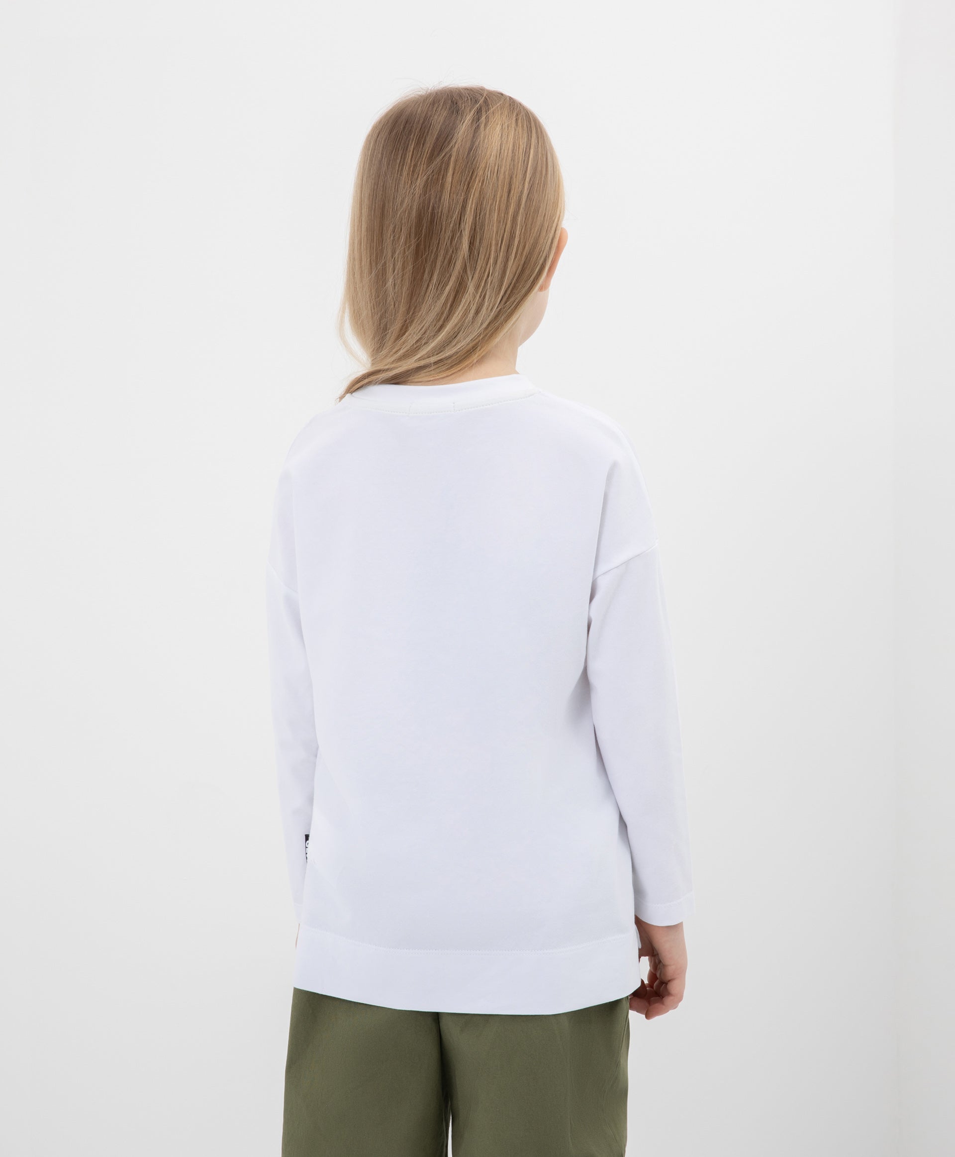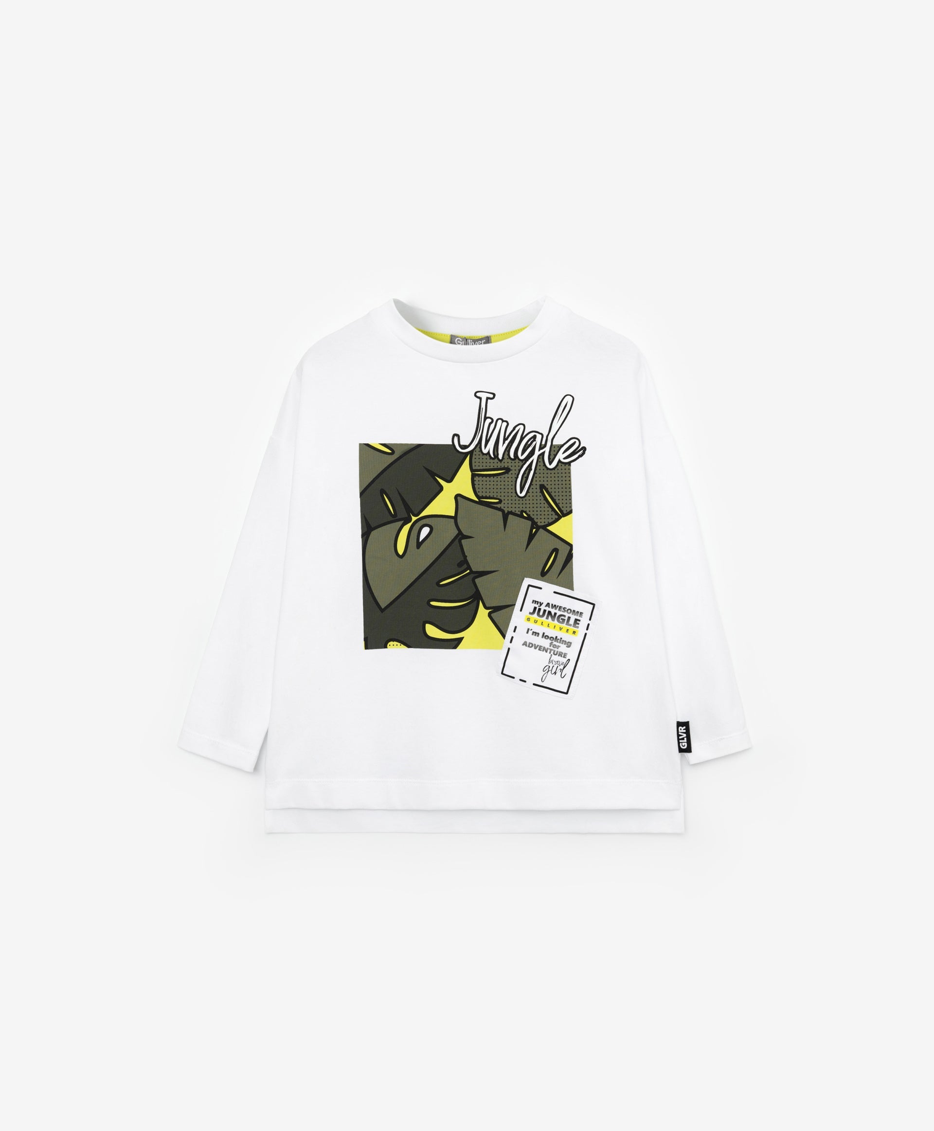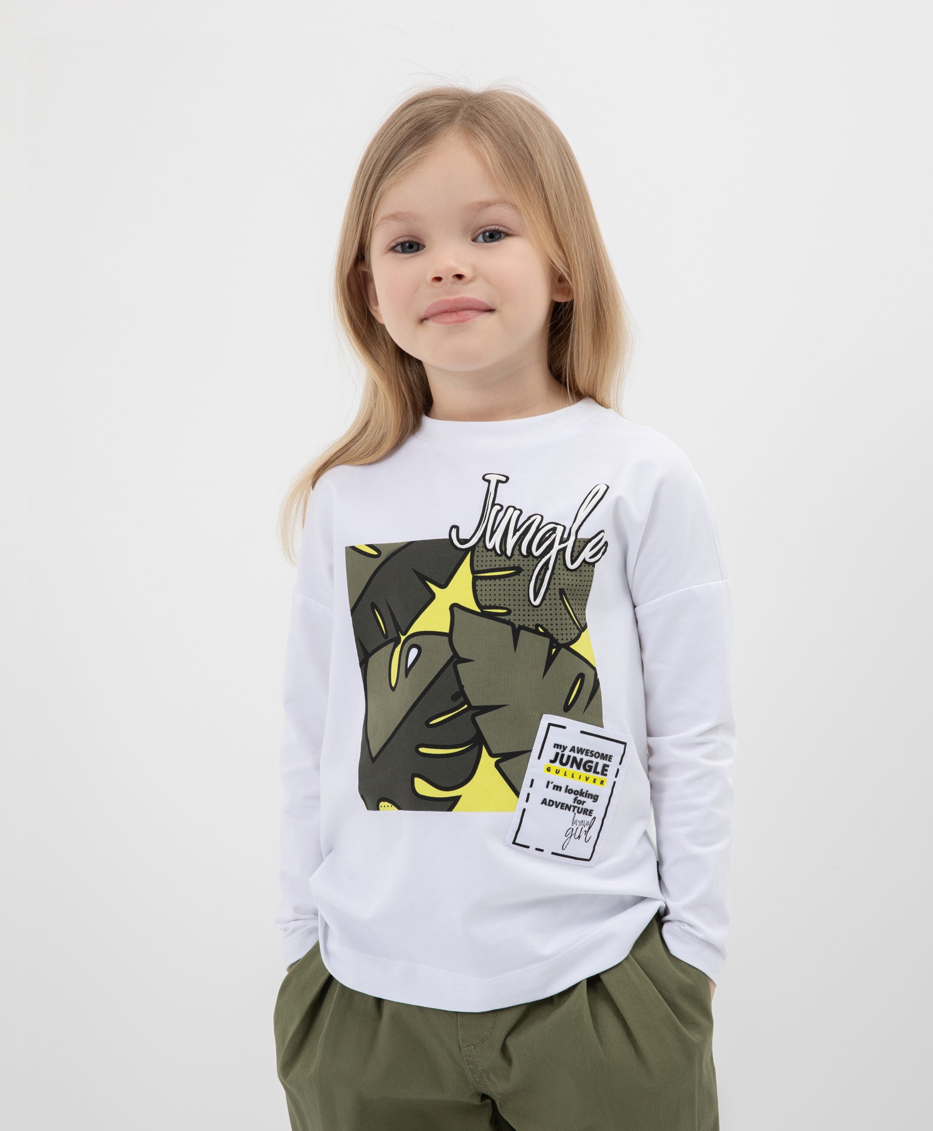 Стилна бяла блуза с дълъг ръкав (лонгслив) със свободна обемна кройка, голям оригинален принт и емблема – идеална част от пролетния гардероб на момичето. Тропическата тематика и интересната техника на декориране я правят ярка, модерна и съвременна. Комфортната конструкция с паднало рамо и удължена линия на гърба подчертава актуалността на модела.