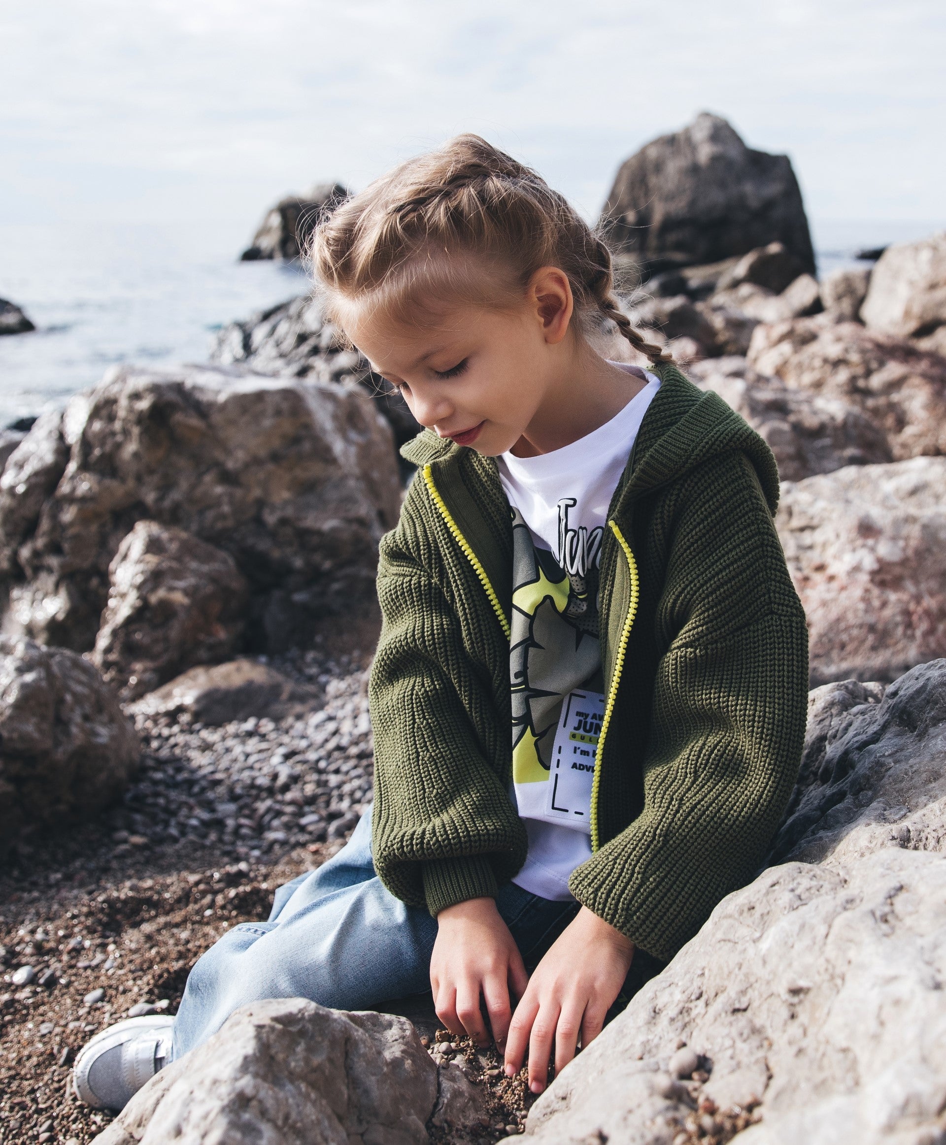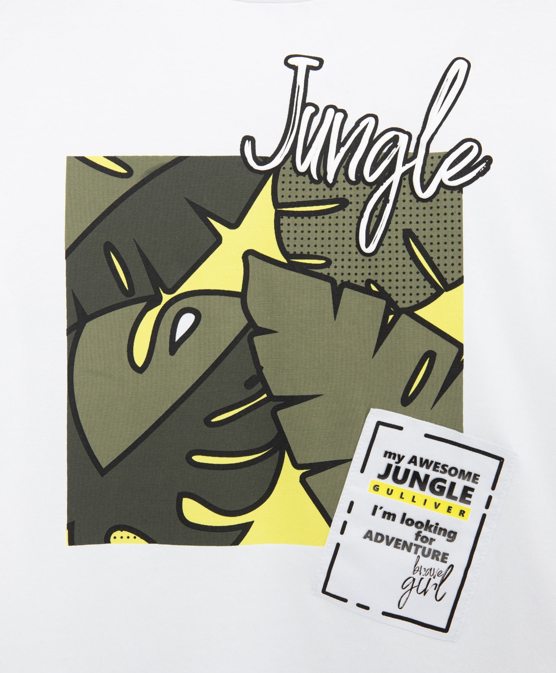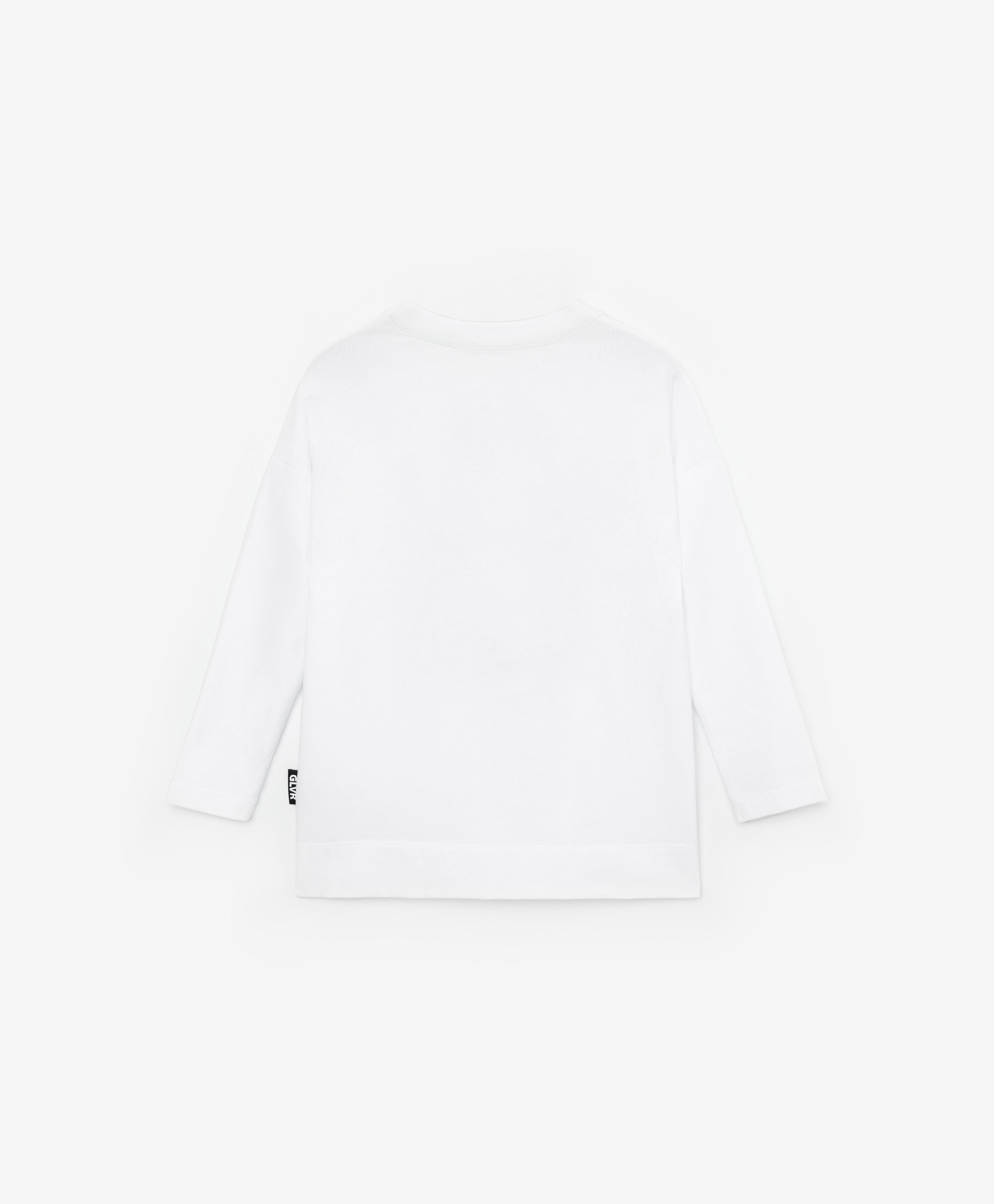 Стилна бяла блуза с дълъг ръкав (лонгслив) със свободна обемна кройка, голям оригинален принт и емблема – идеална част от пролетния гардероб на момичето. Тропическата тематика и интересната техника на декориране я правят ярка, модерна и съвременна. Комфортната конструкция с паднало рамо и удължена линия на гърба подчертава актуалността на модела.