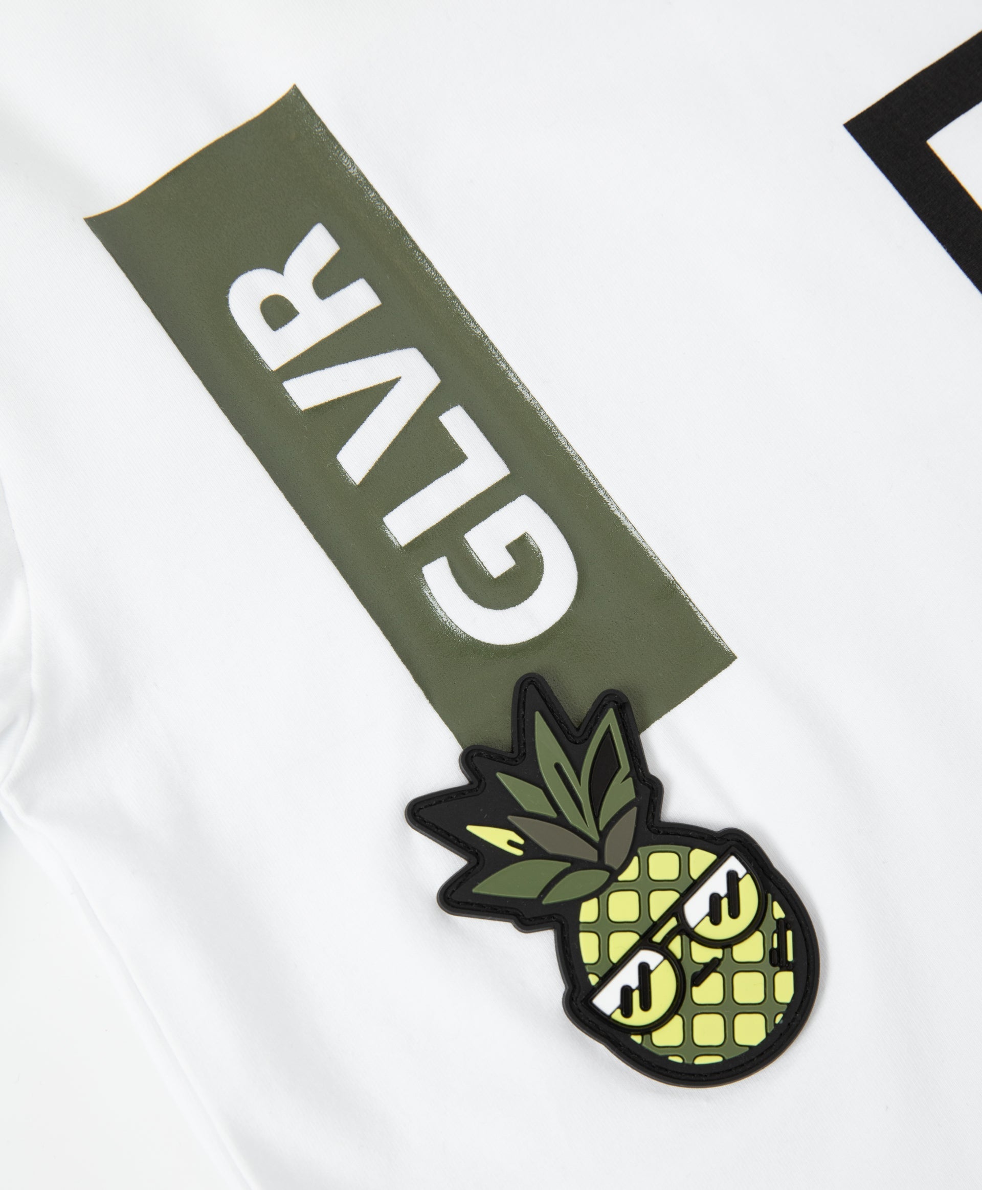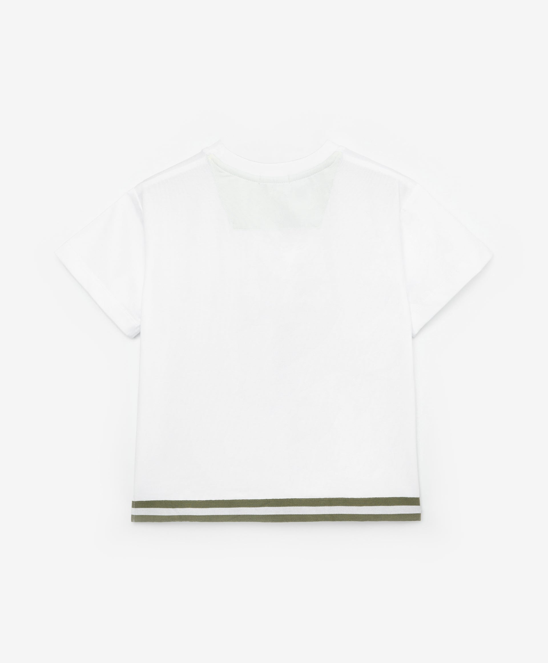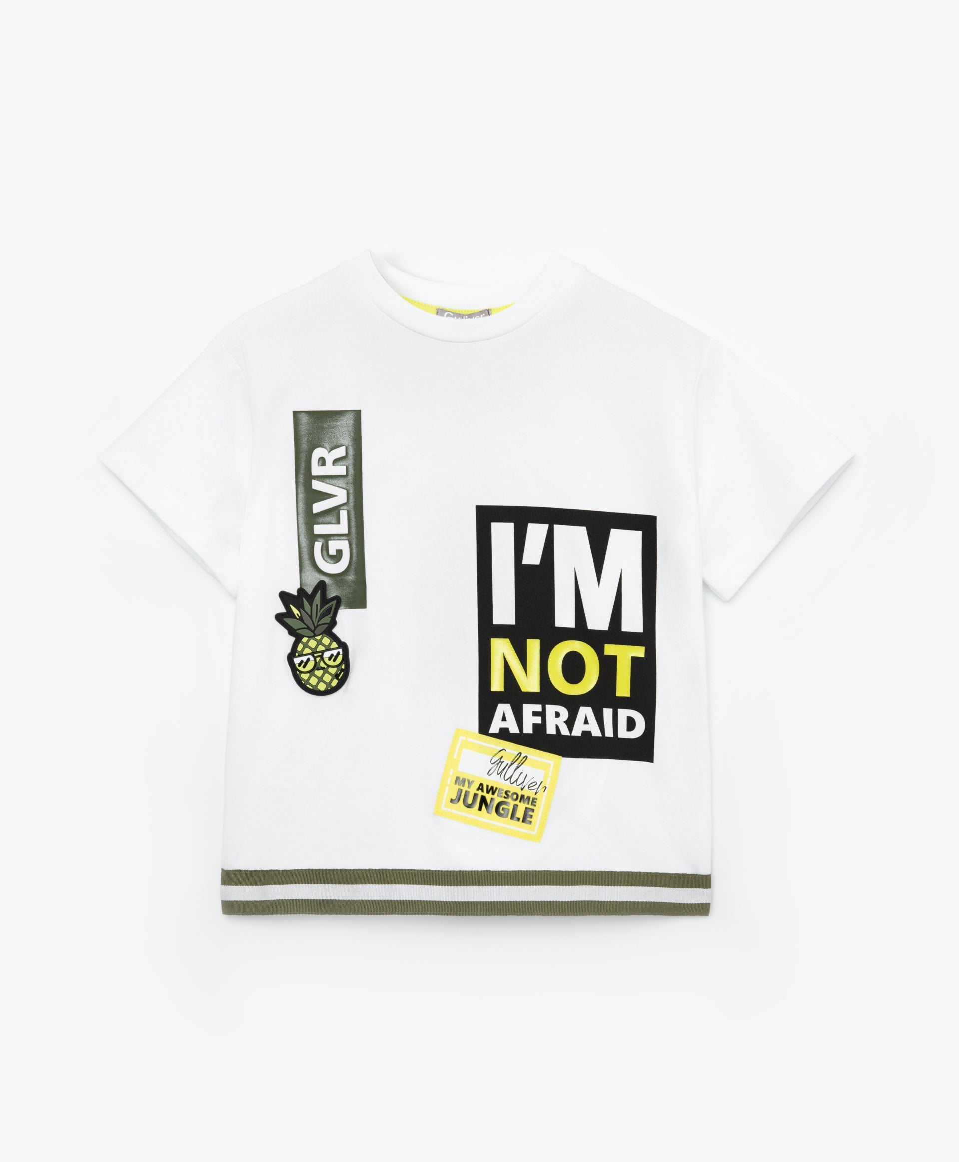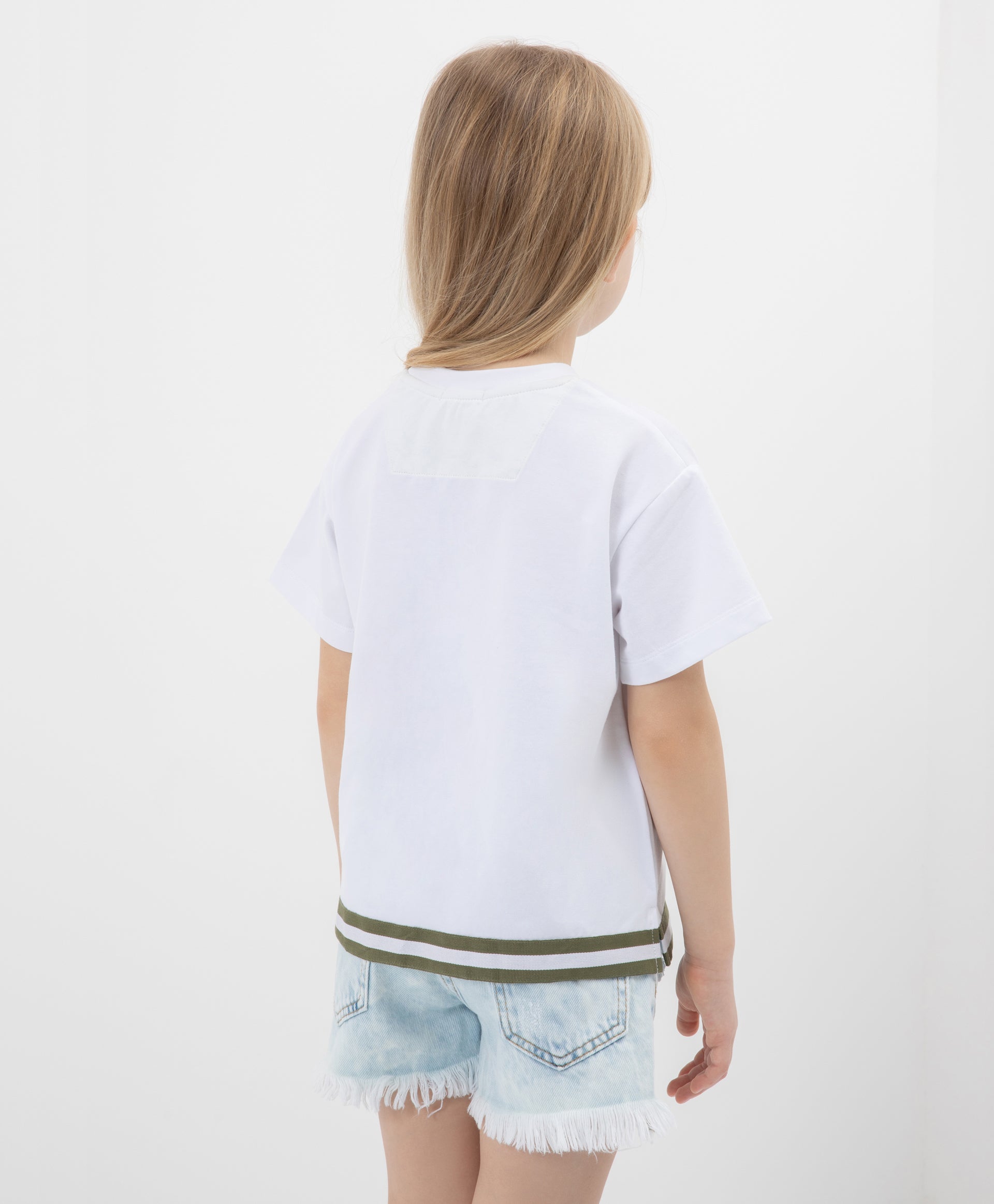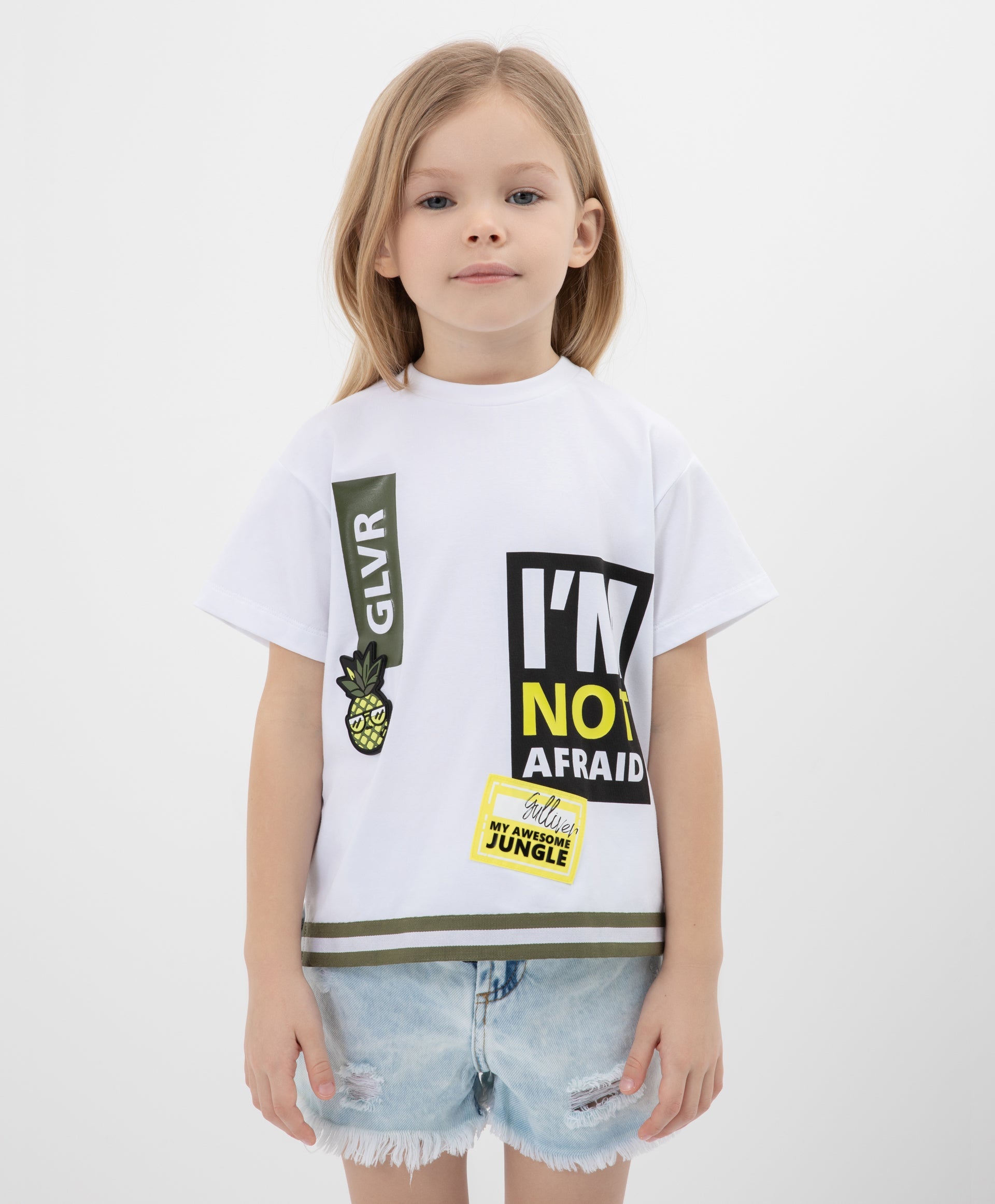 Стилна бяла тениска с къс ръкав – базов елемент за пролетно-летния гардероб на момичето. Интересният дизайн, изграден върху контрастни принтове и оригинални нашивки с използване на репсова лента, пришита в долната част, прави тениската много ярка и атрактивна. Тропическата тематика на декора създава слънчево настроение. Комфортната свободна конструкция с цепки в страничните шевове подчертава актуалността на модела и осигурява максимално удобство при носене.