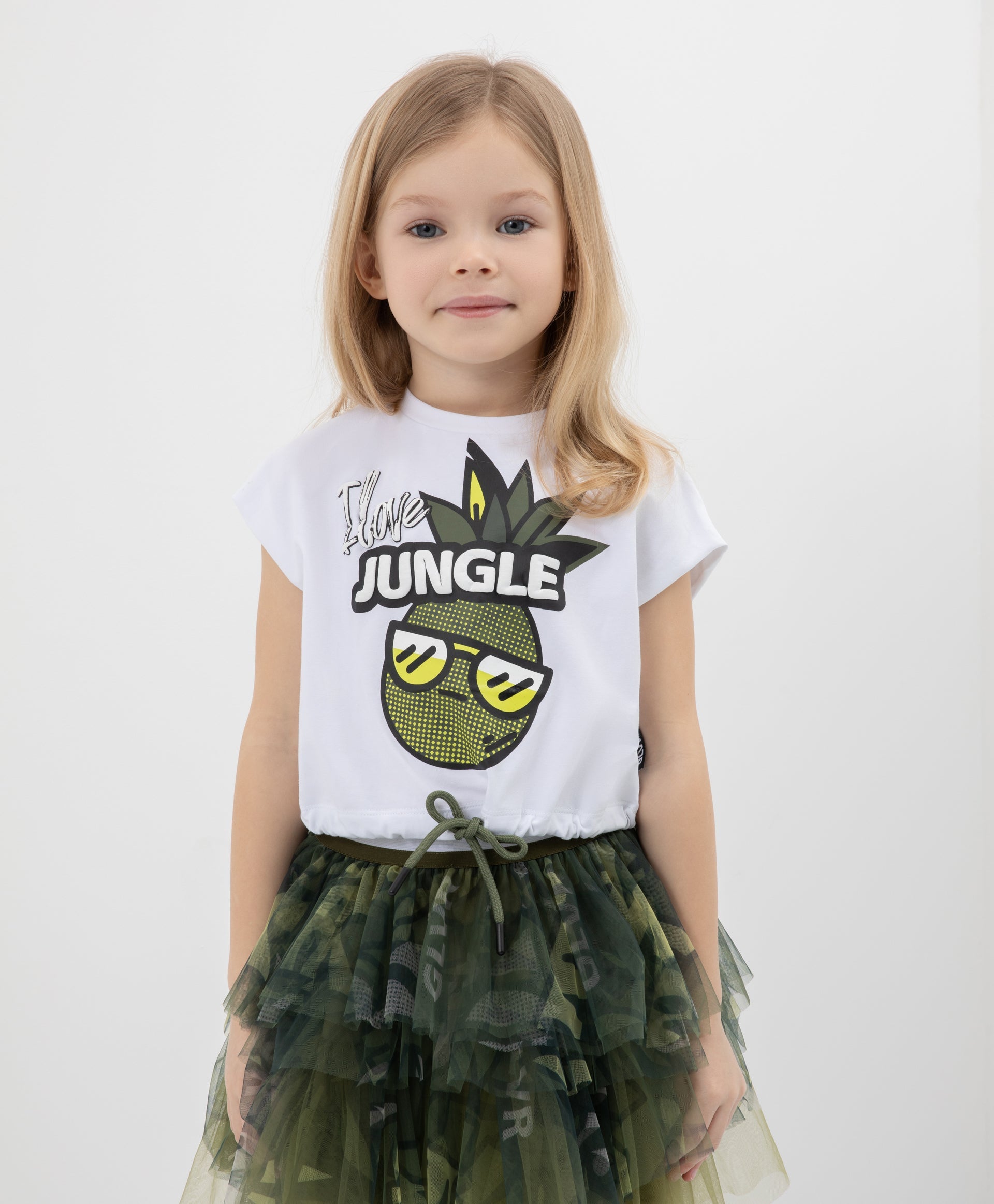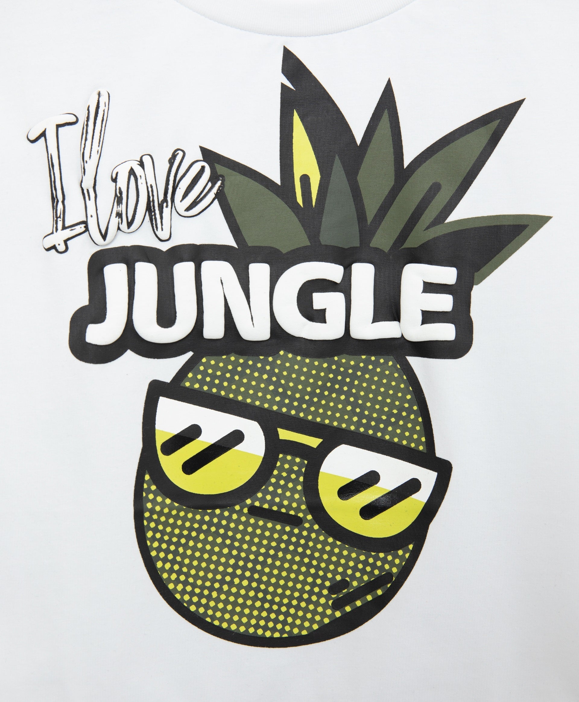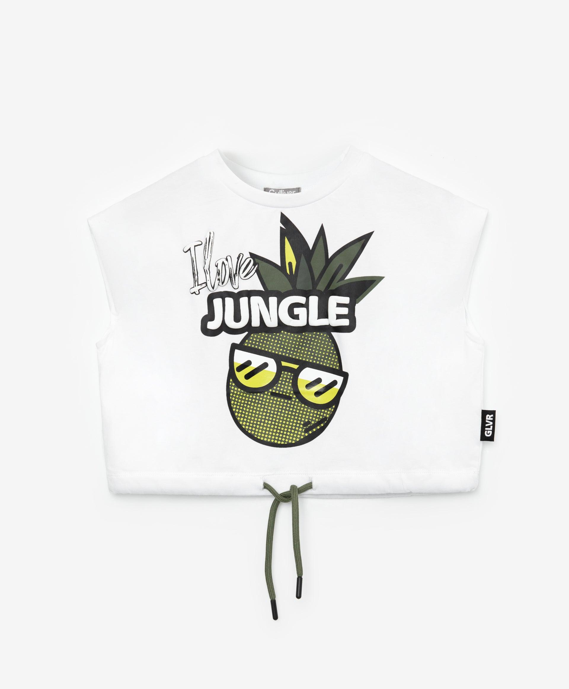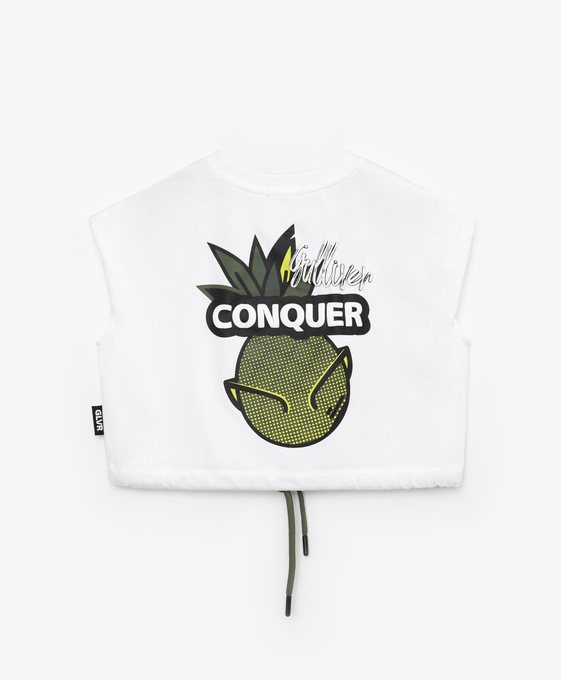 Стилният бял потник отразява най-актуалните трендове на сезон Пролет-Лято. Скъсената дължина, падналото рамо и обемната форма създават модерен съвременен силует, базиран на комфорта, непринудеността и свободата на движенията. Акцентът на модела е забавният принт – стилизирано изображение на ананас, разположено на гърба (изглед отзад) и отпред (изглед отпред). Ярката графика е допълнена от цветни връзки с пластмасови накрайници и голям брандиран етикет в страничния шев.