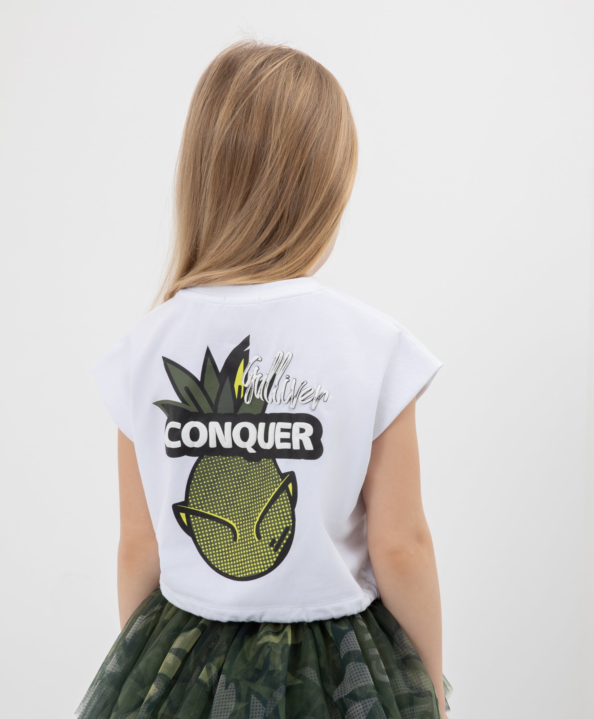 Бял скъсен топ с паднало рамо и принт Gulliver