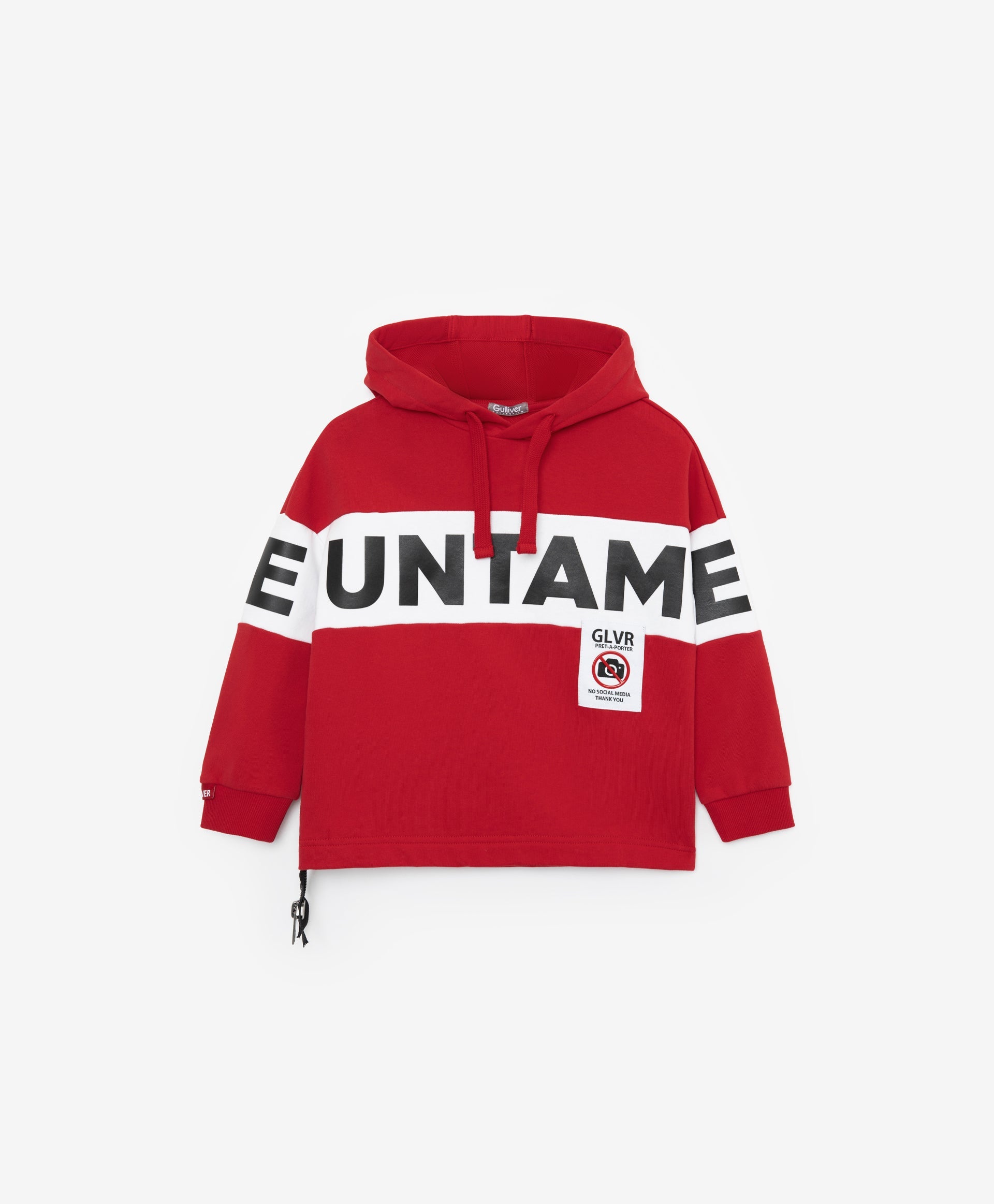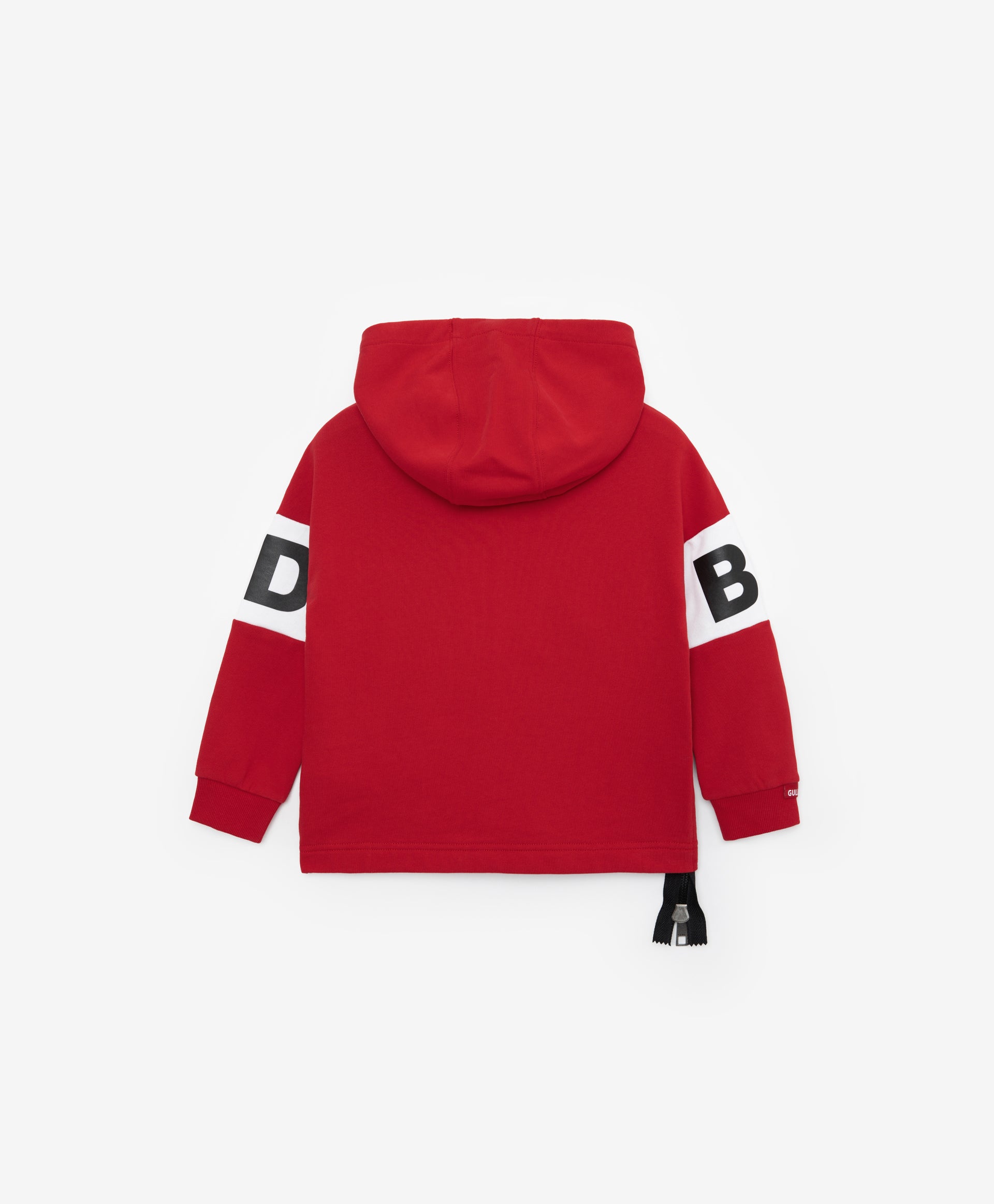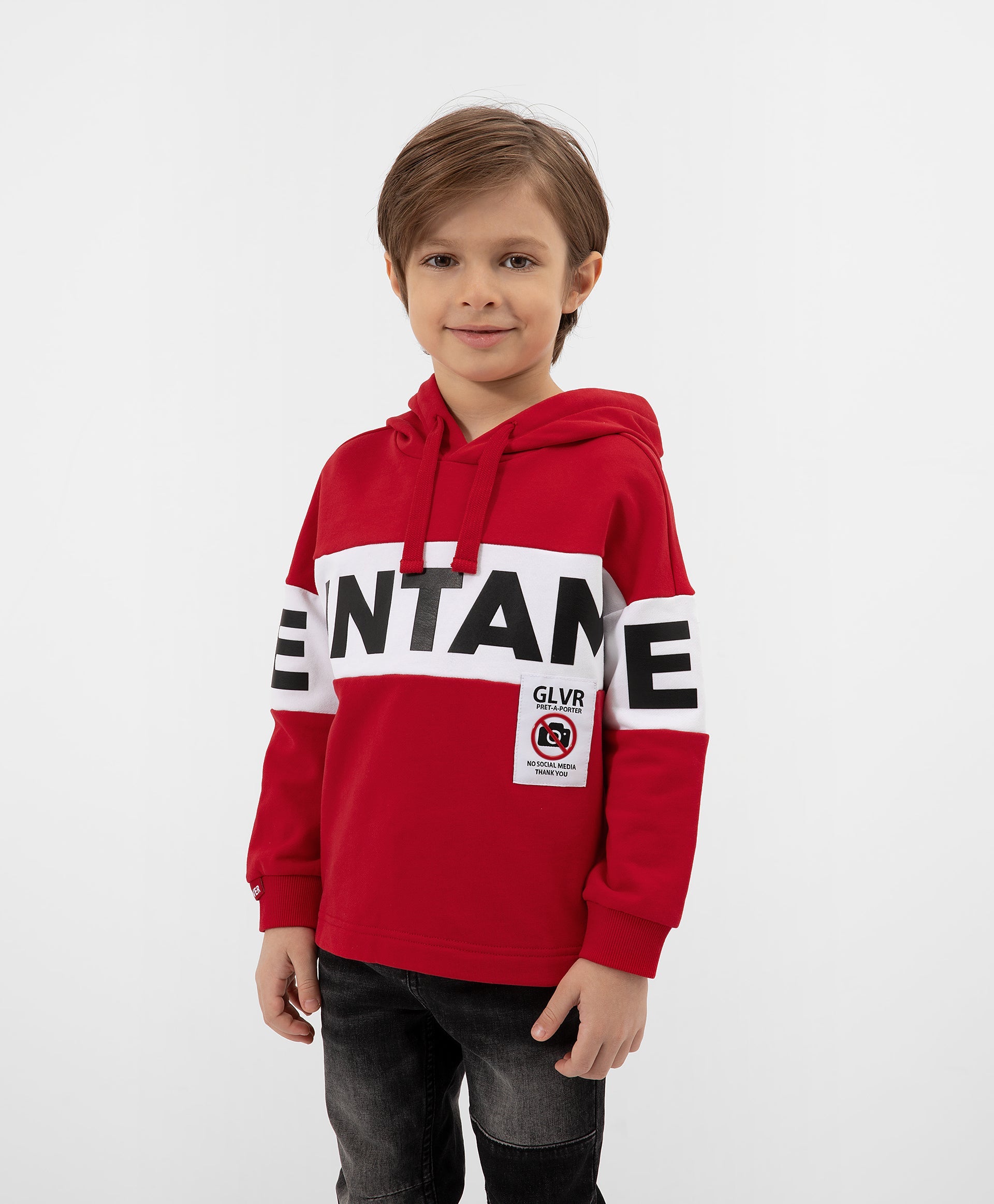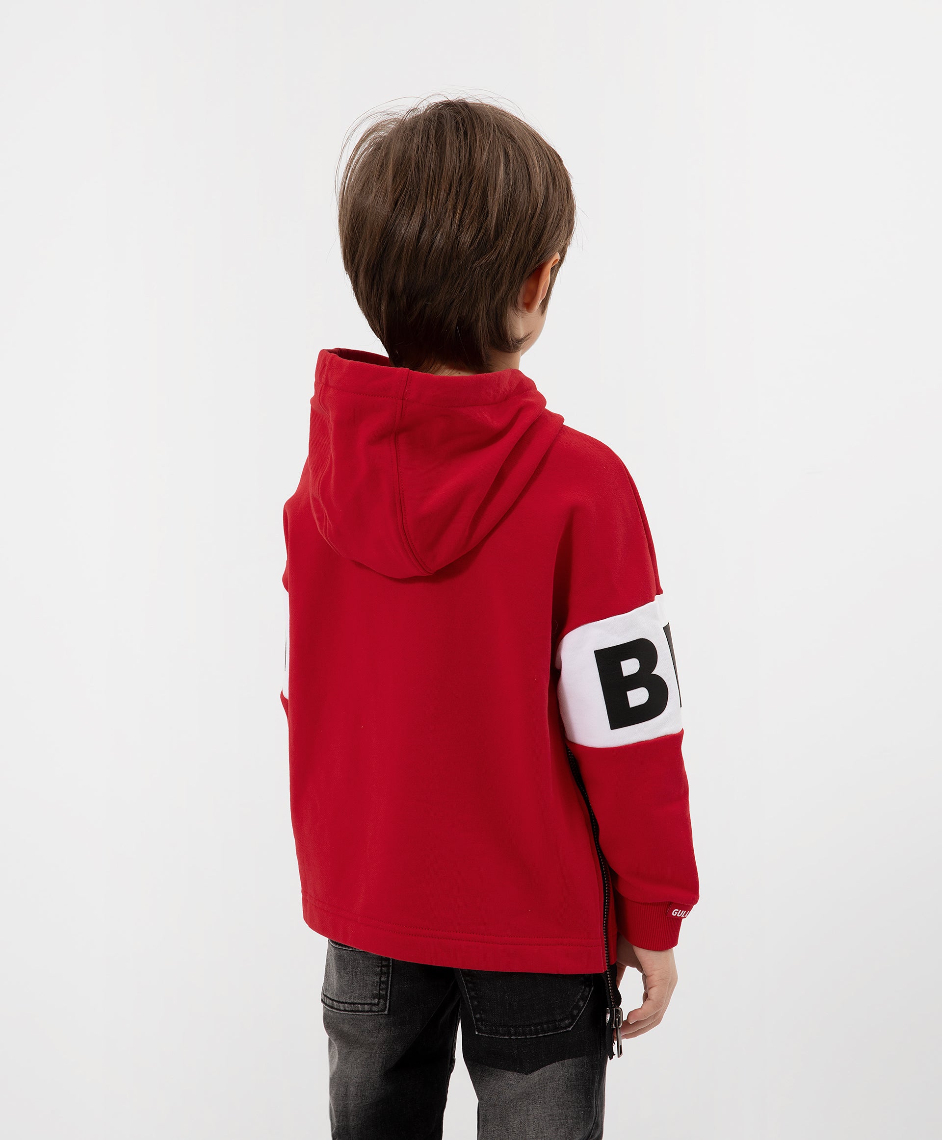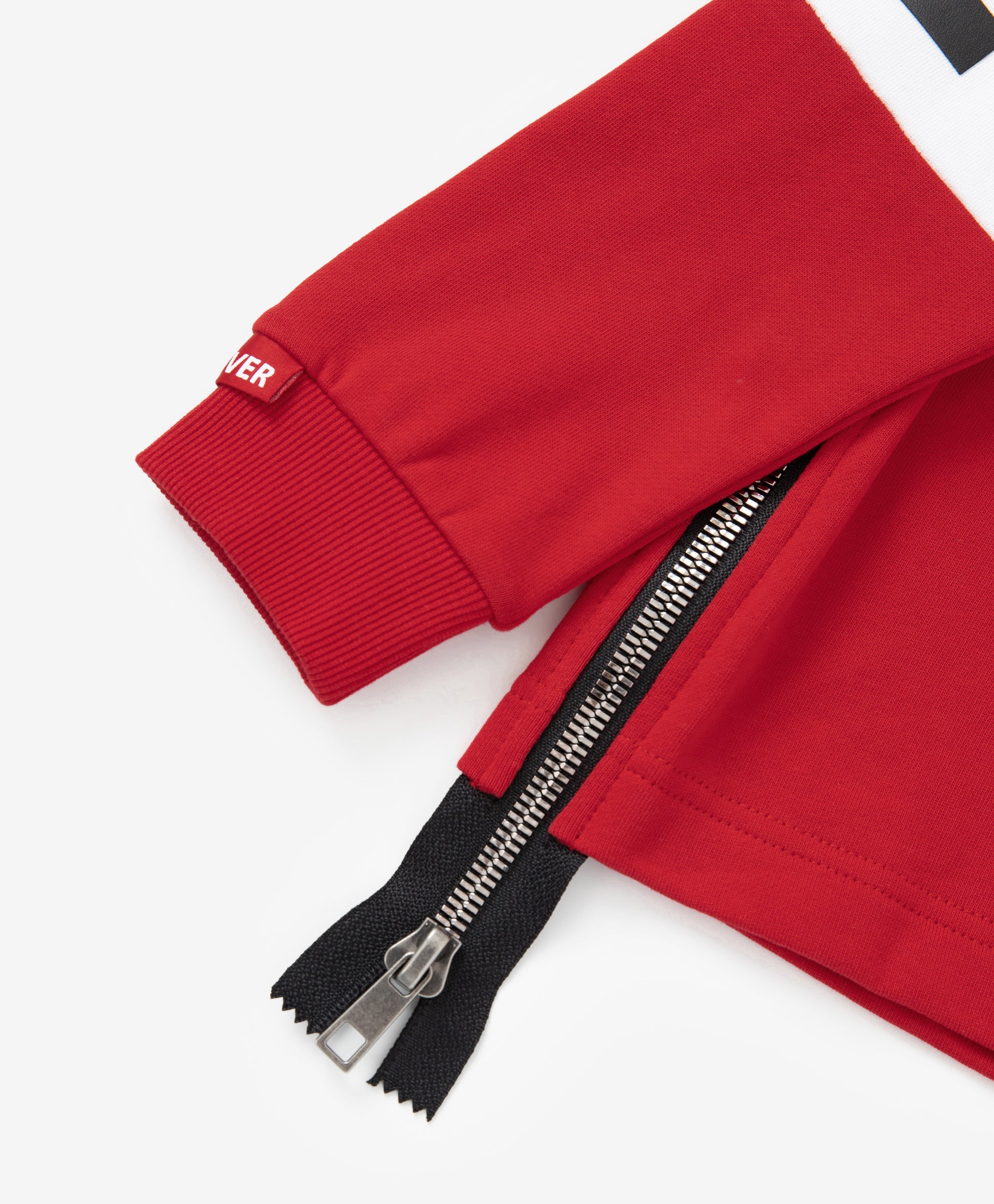 Червеният суитшърт е отражение на модните трендове! Енергичният спортен стил е подкрепен от множество елементи: цветови блокове (color-blocking), голям шрифтов принт по цялата предна част и ръкавите, асиметричен функционален цип и жакардова нашивка. Идеален за динамично ежедневие и разходки.