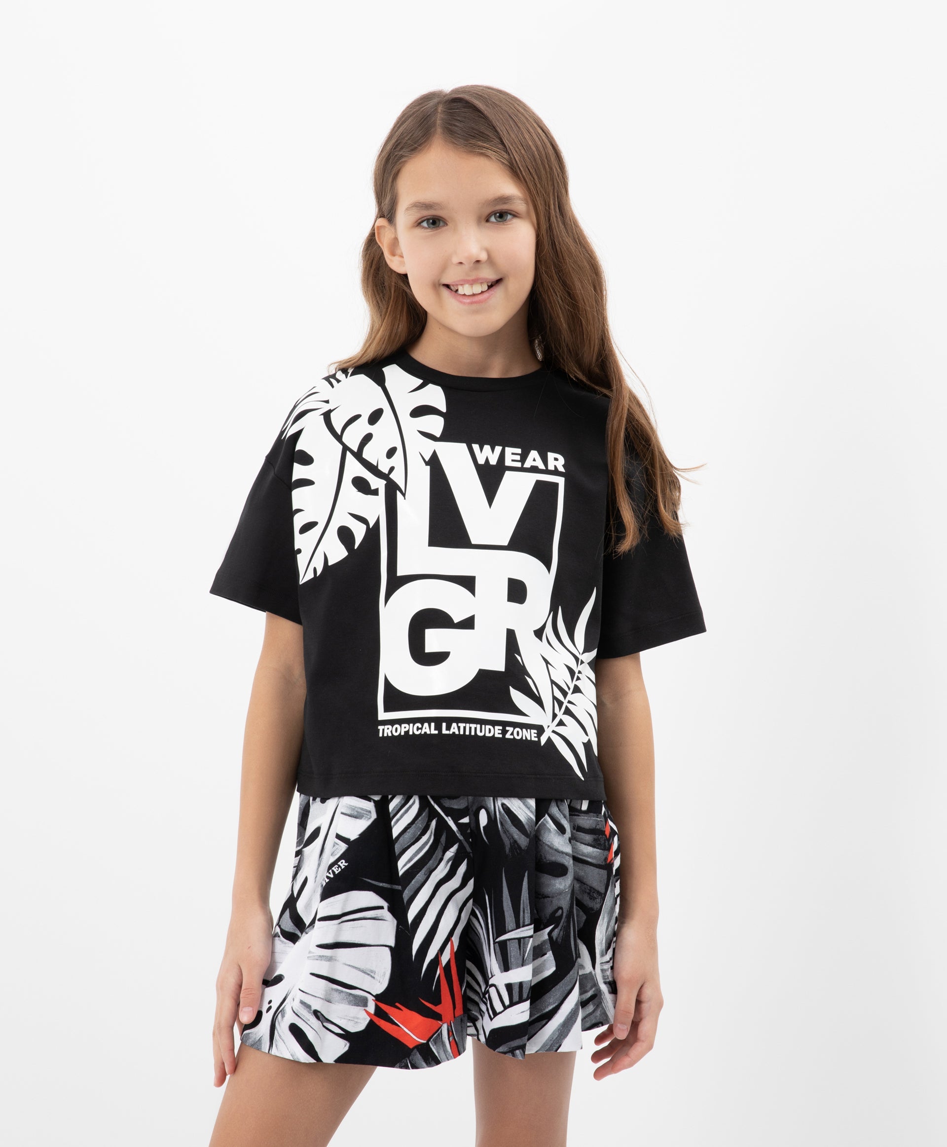 Черна тениска с къс ръкав и голям контрастен принт – основа за летния гардероб на тийнейджърката. Силуетът овърсайз, падналото рамо и наситеният декор с гланцов и лакиран печат подчертават съвременния стил на модела.