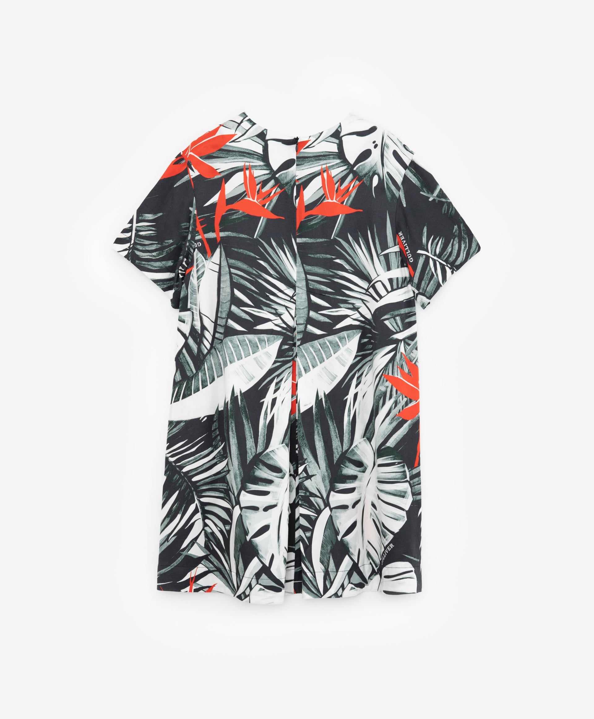 Лека лятна рокля, изработена от тънък, прохладен и формоустойчив сатен. Големият контрастен десен в черно-бяла графика с ярки цветни акценти приляга идеално на лаконичната трапецовидна форма, без нужда от допълнителни детайли. Страничните шевове са изнесени напред и крият удобни джобове. Роклята се закопчава с цип на гърба.