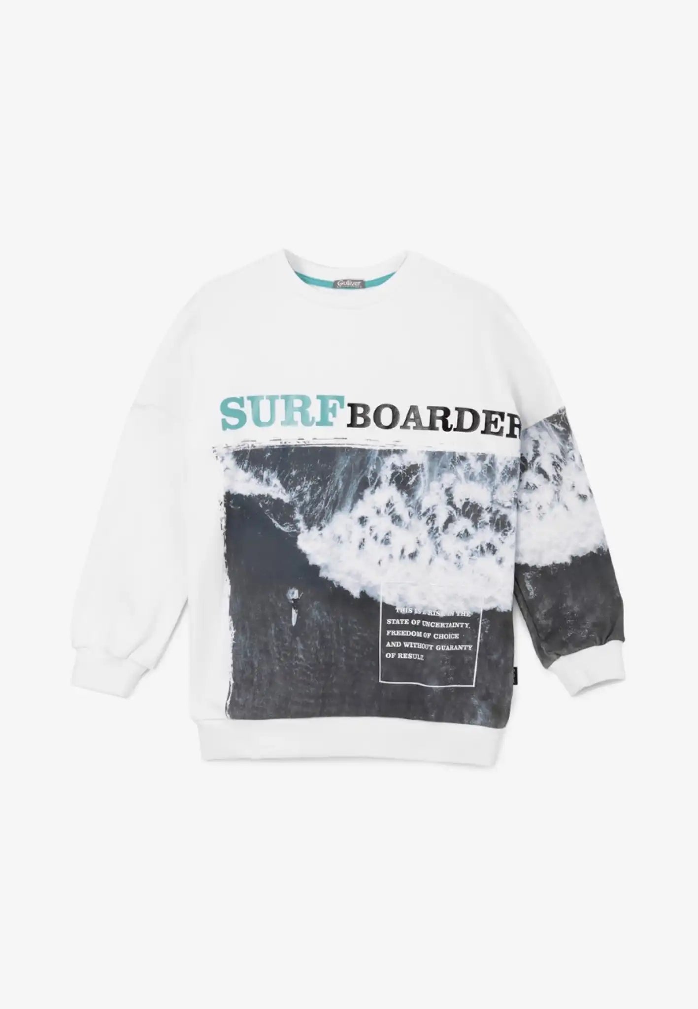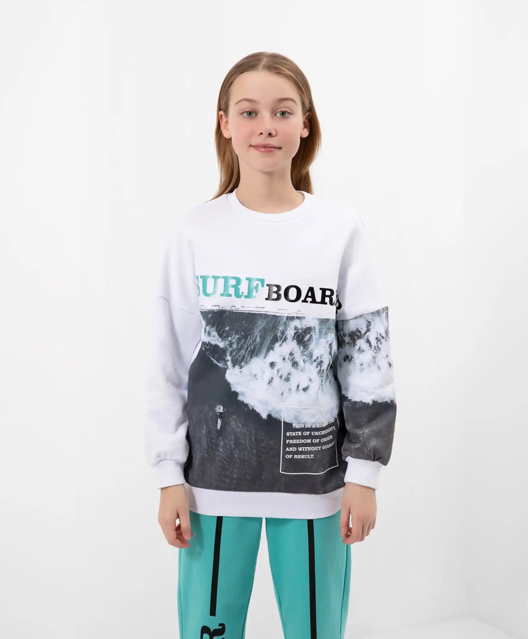 Hanoracul alb este piesa vedetă a sezonului Primăvară-Vară 2022. Arată proaspăt și inovator datorită imprimeului original care combină o imagine fotografică cu grafică alb-negru. Asimetria designului, combinația dintre imprimeul mat și elementele tipografice lucioase, precum și accentele de culoare care adaugă un plus de expresivitate, evidențiază prospețimea și originalitatea modelului. Cu orice pantaloni scurți, blugi sau pantaloni din tricot, hanoracul va completa un set de primăvară-vară care subliniază stilul relaxat și casual al unei fete.