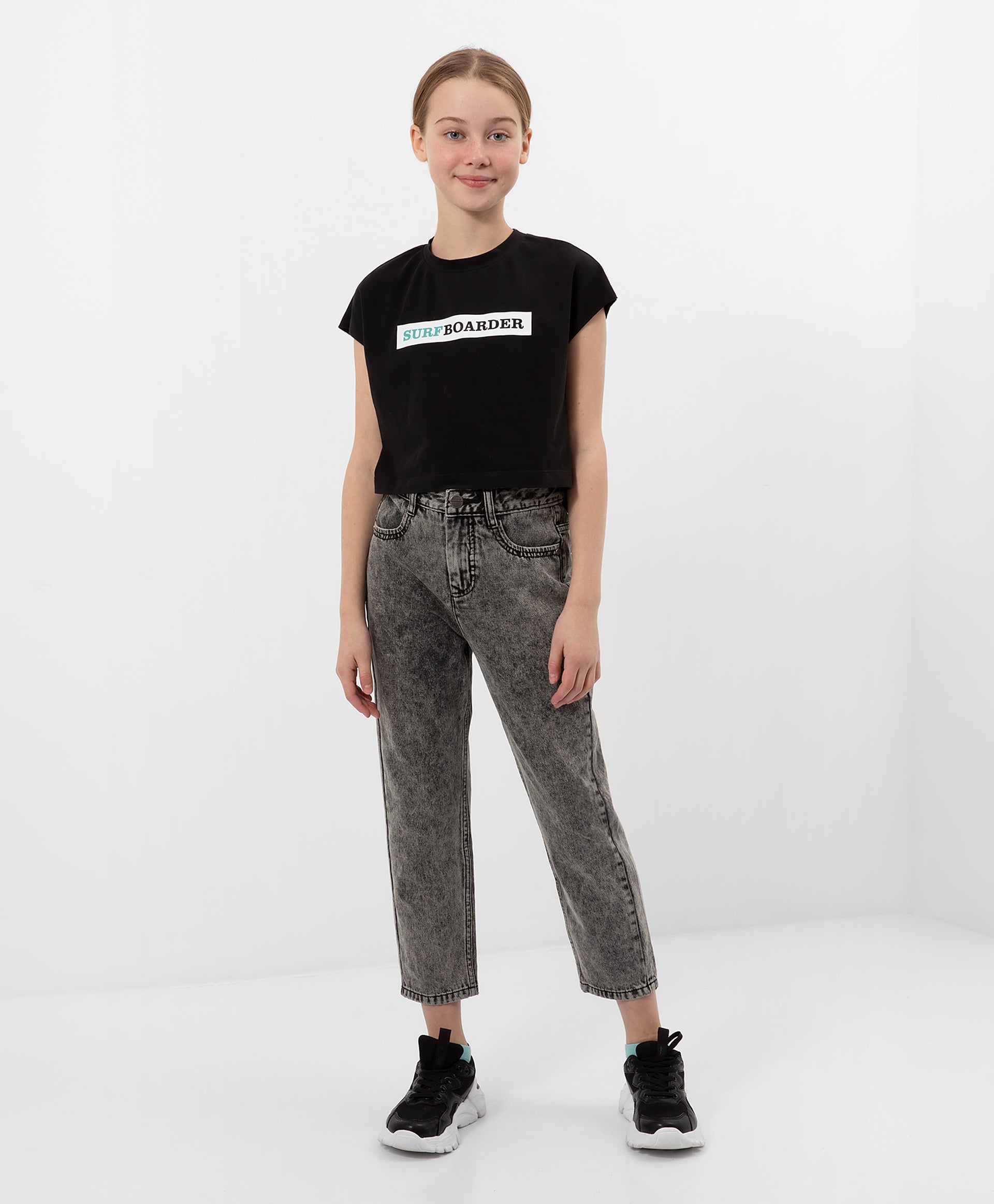 Сиви дънки тип „Mom-fit“ с висока талия – отлично решение за пролетта. Изключително меки, с красив мраморен ефект на „измиване“, дънките изглеждат сдържано и лаконично. Те са идеален партньор за ярък обемен суитшърт, ветровка или елек. Дизайнът е завършен с цветна кожена платка на колана.