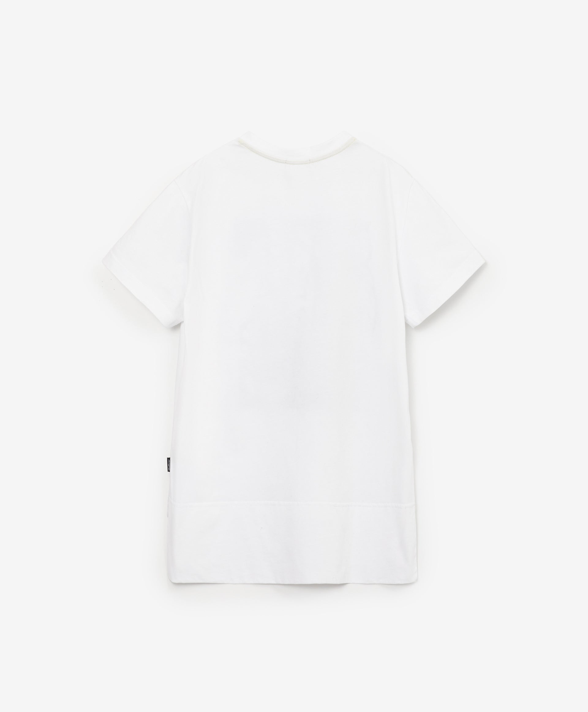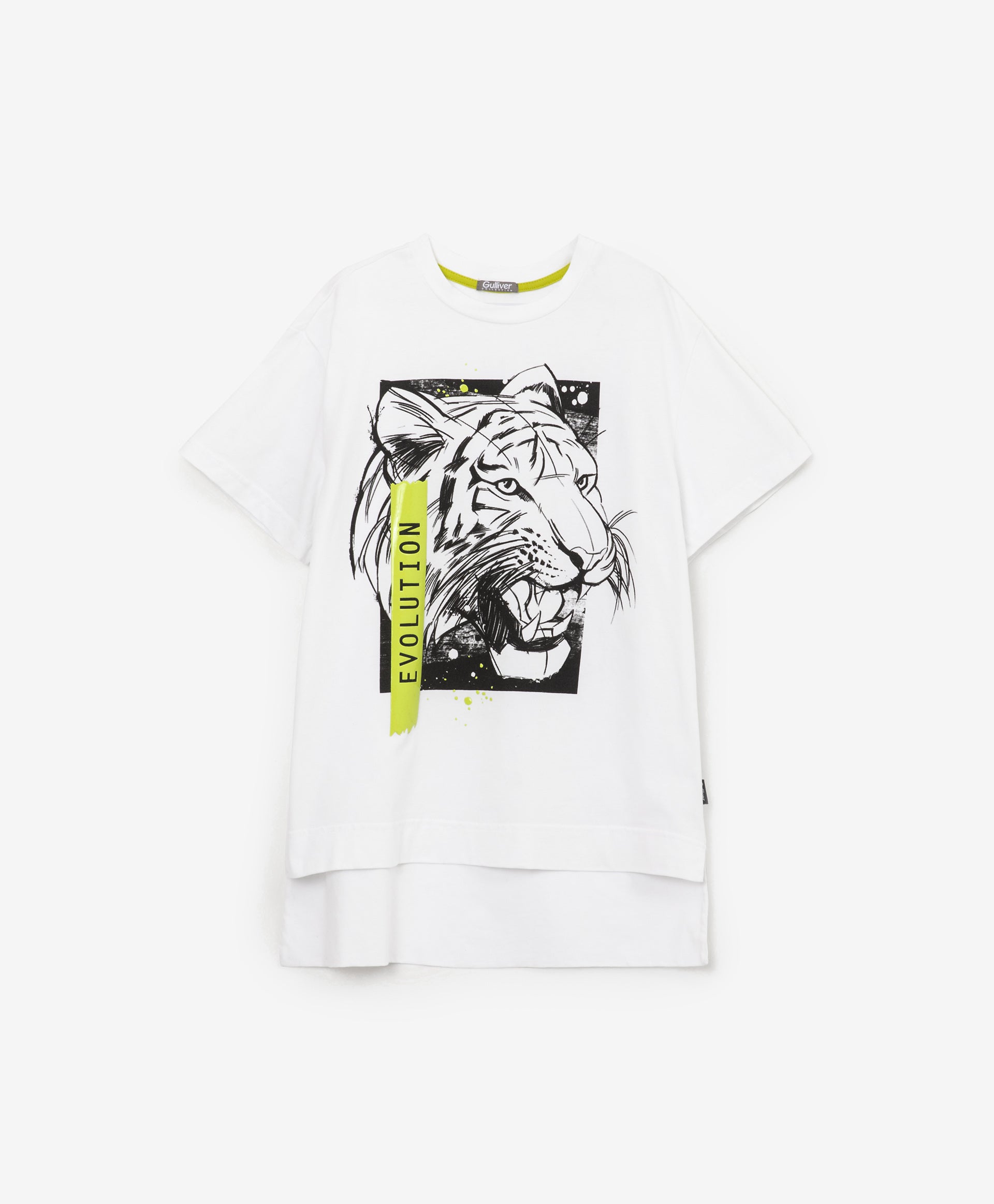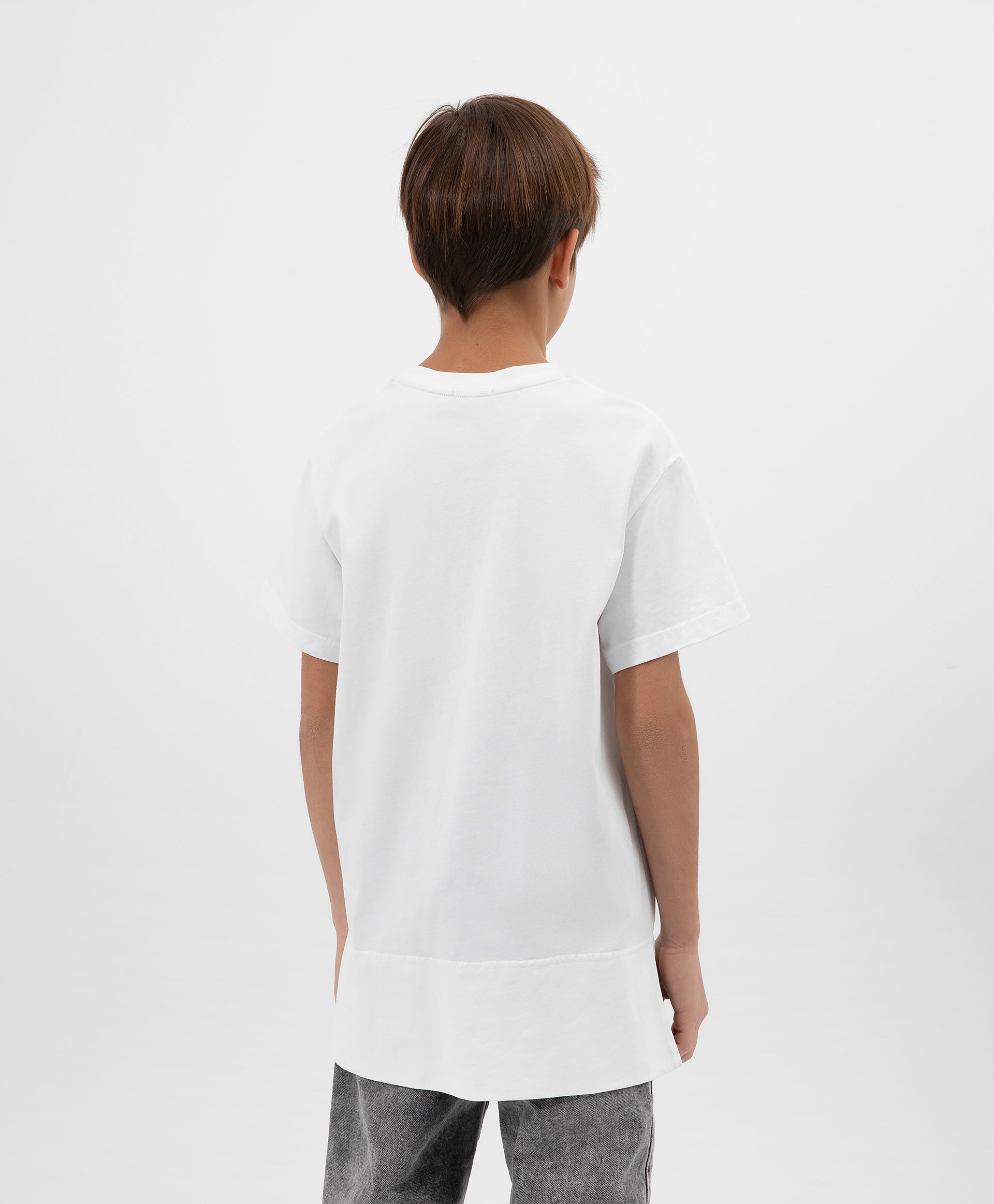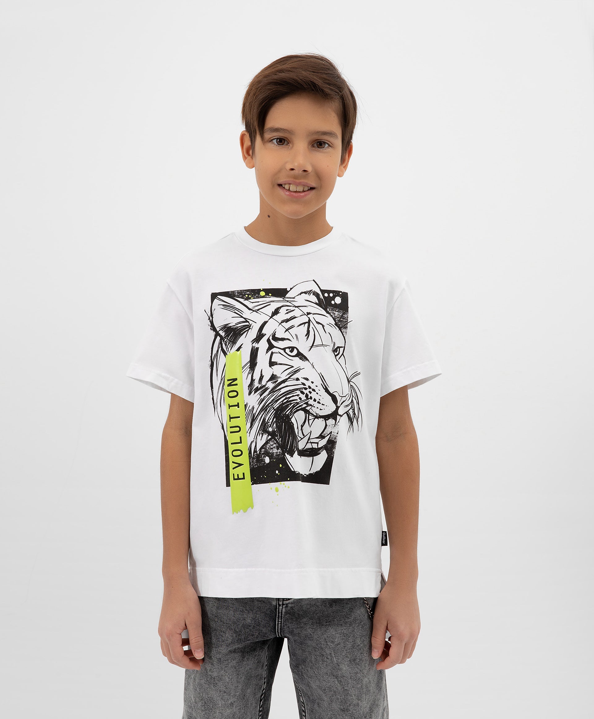 Бяла тениска с голямо графично изображение и лакиран шрифтов принт, изпълнен чрез силиконова техника – основа за ярки, стилни и съвременни летни визии за момчета. Актуалната свободна кройка с удължен гръб и лаконичното дизайнерско решение превръщат тениската в еталон за стил и качество. В съчетание с дънки, панталони или шорти, тя гарантира на тийнейджъра безупречен външен вид.