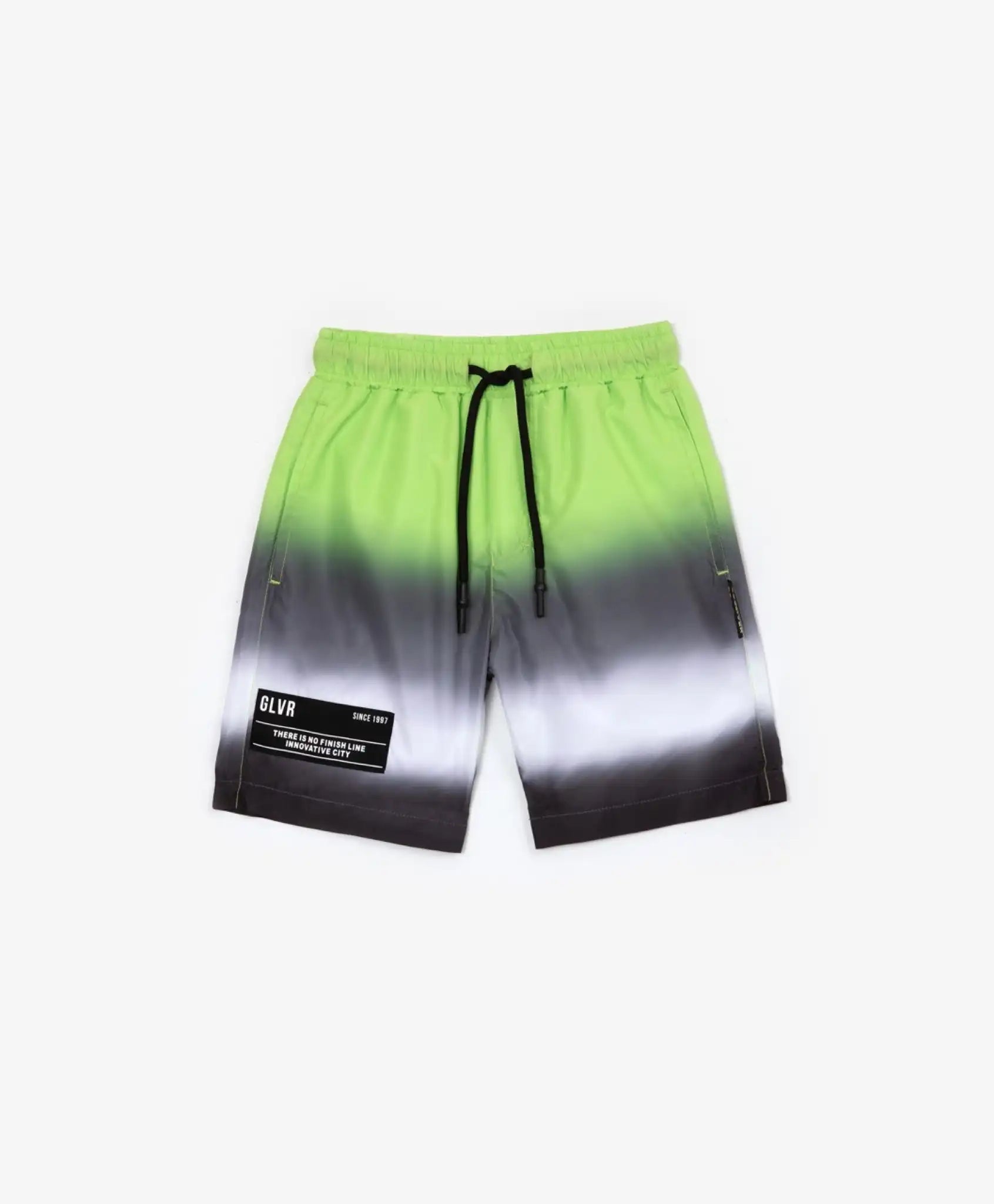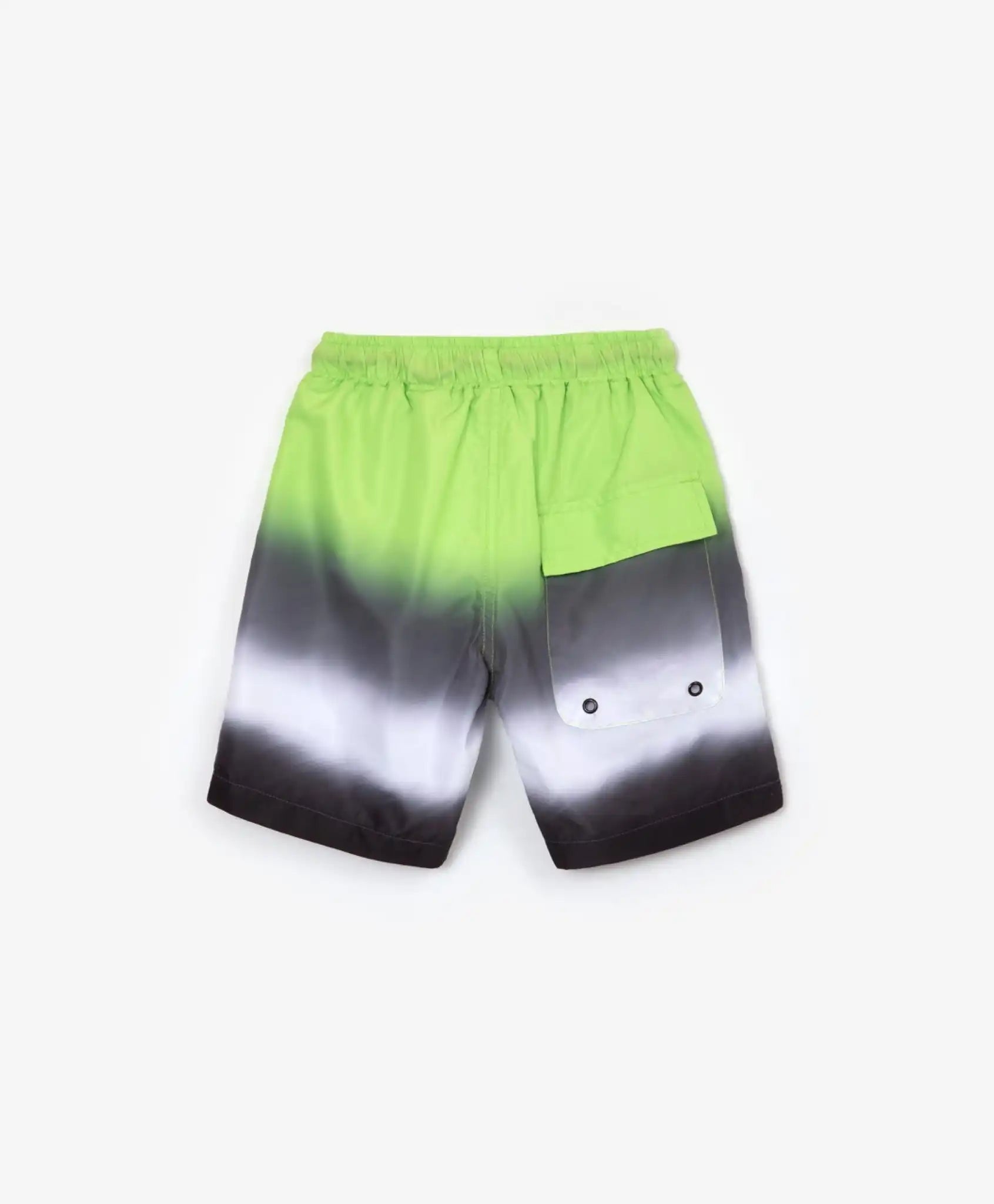 Pantalonii scurți de baie stilizați sunt o alegere excelentă pentru vacanțele la apă. Tranziția interesantă a culorilor, decorațiunea cu bandă neon și patch-ul cu elemente tipografice, alături de buzunarul mare amplasat în spate, evidențiază designul neobișnuit al modelului, făcându-l atractiv și viu colorat. Pantalonii scurți au buzunare practice și un șnur de strângere cu capete contrastante pentru o fixare sigură pe băieții cu o conformație subțire.