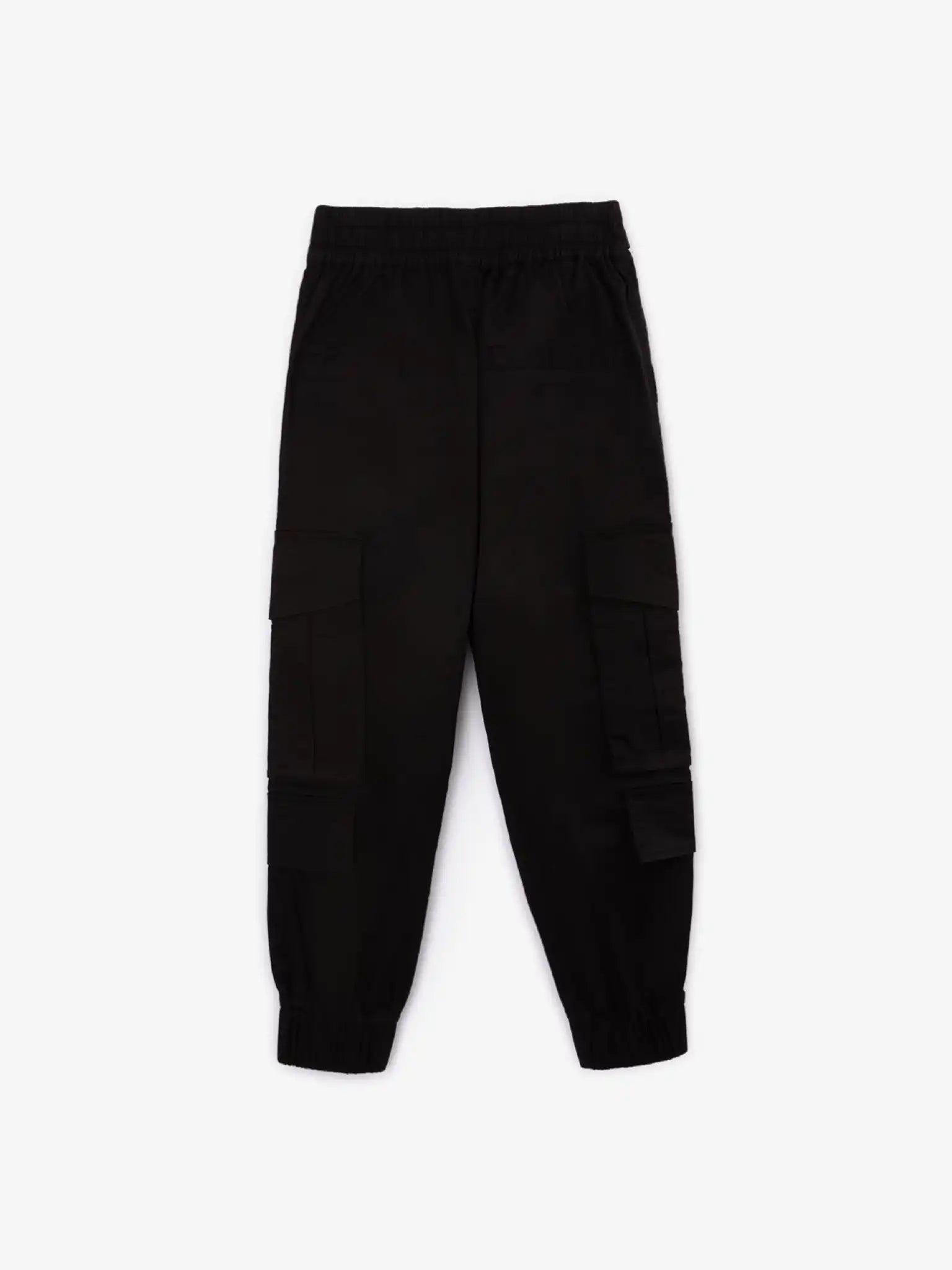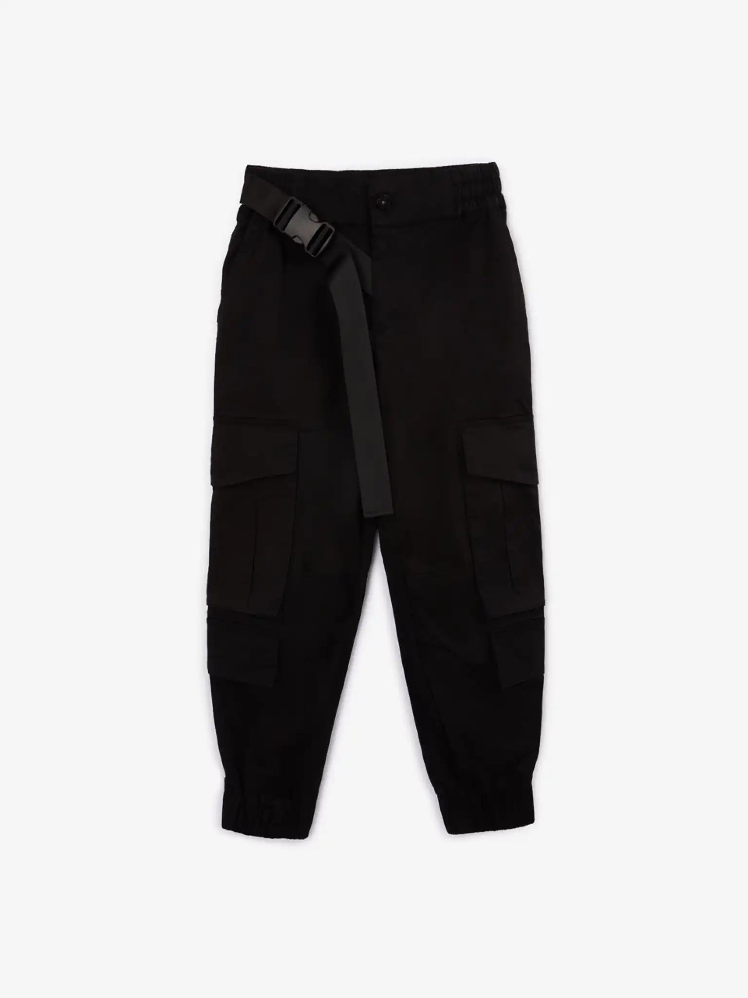 Pantaloni tip "jogger" din tweed moale - cel mai bun motiv pentru a te gândi la reînnoirea garderobei! Designul modelului atrage prin dinamismul și precizia stilului sportiv. Buzunarele cargo voluminoase, cu clapete largi, precum și breteaua diagonală coborâtă de la buzunar spre talie, strânsă cu o cataramă din plastic, conferă modelului un aer nou și robust. Aceștia vor fi pe placul adolescentului creativ, care preferă lucrurile interesante și expresive în locul bazelor plictisitoare și obișnuite. Vor evidenția personalitatea copilului, adăugând culori proaspete stilului său.