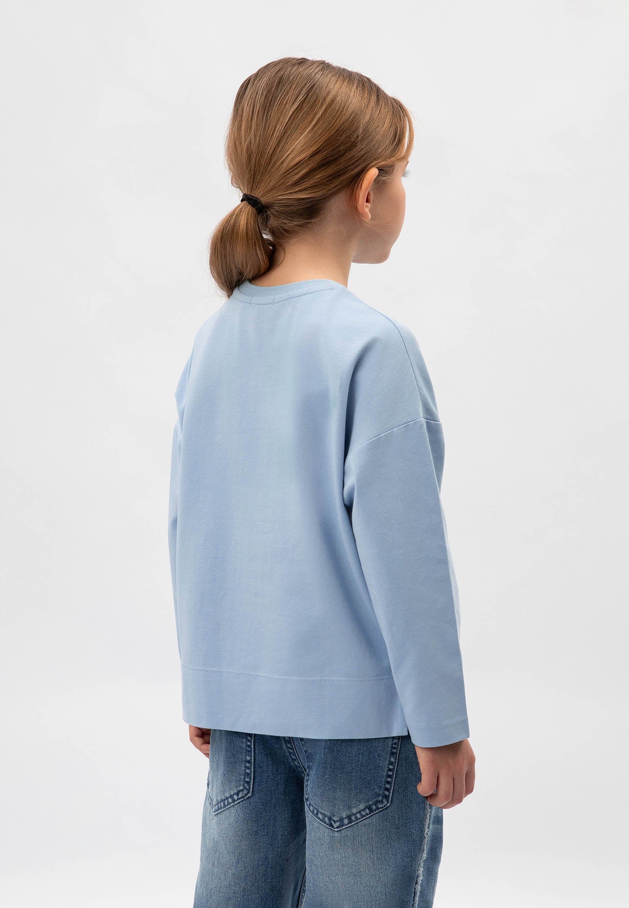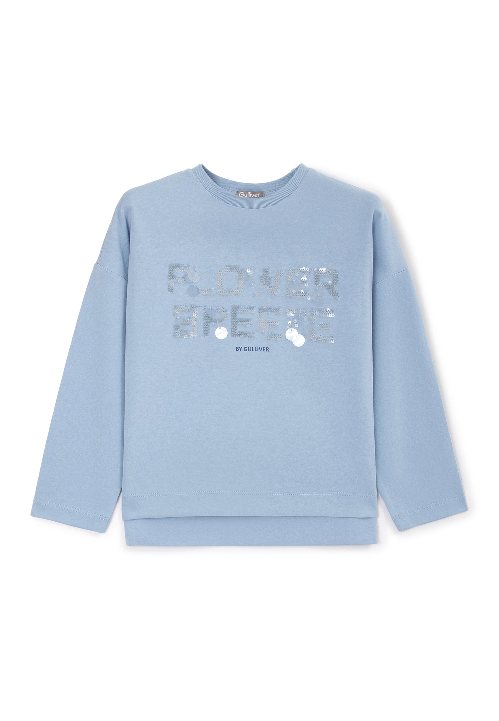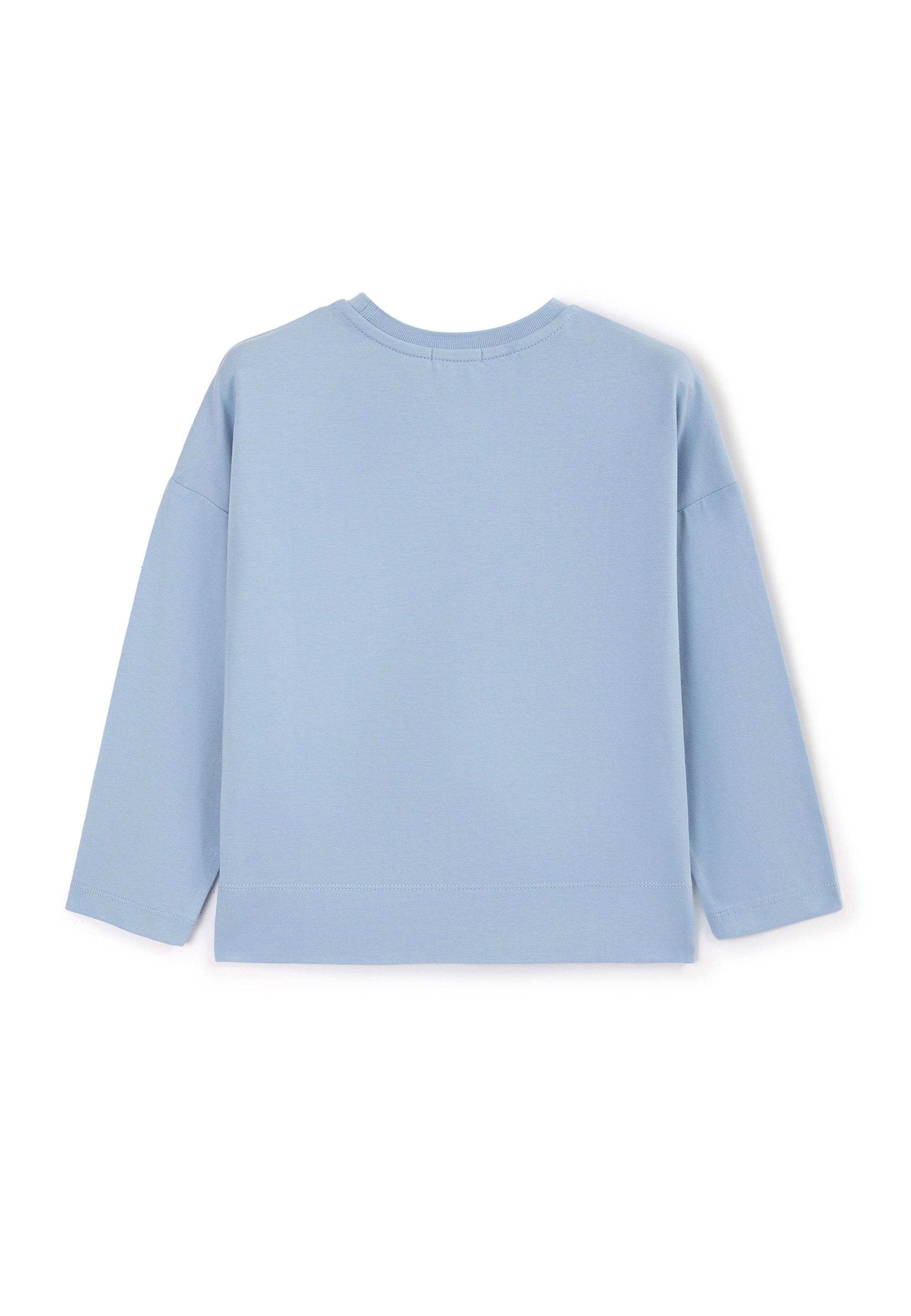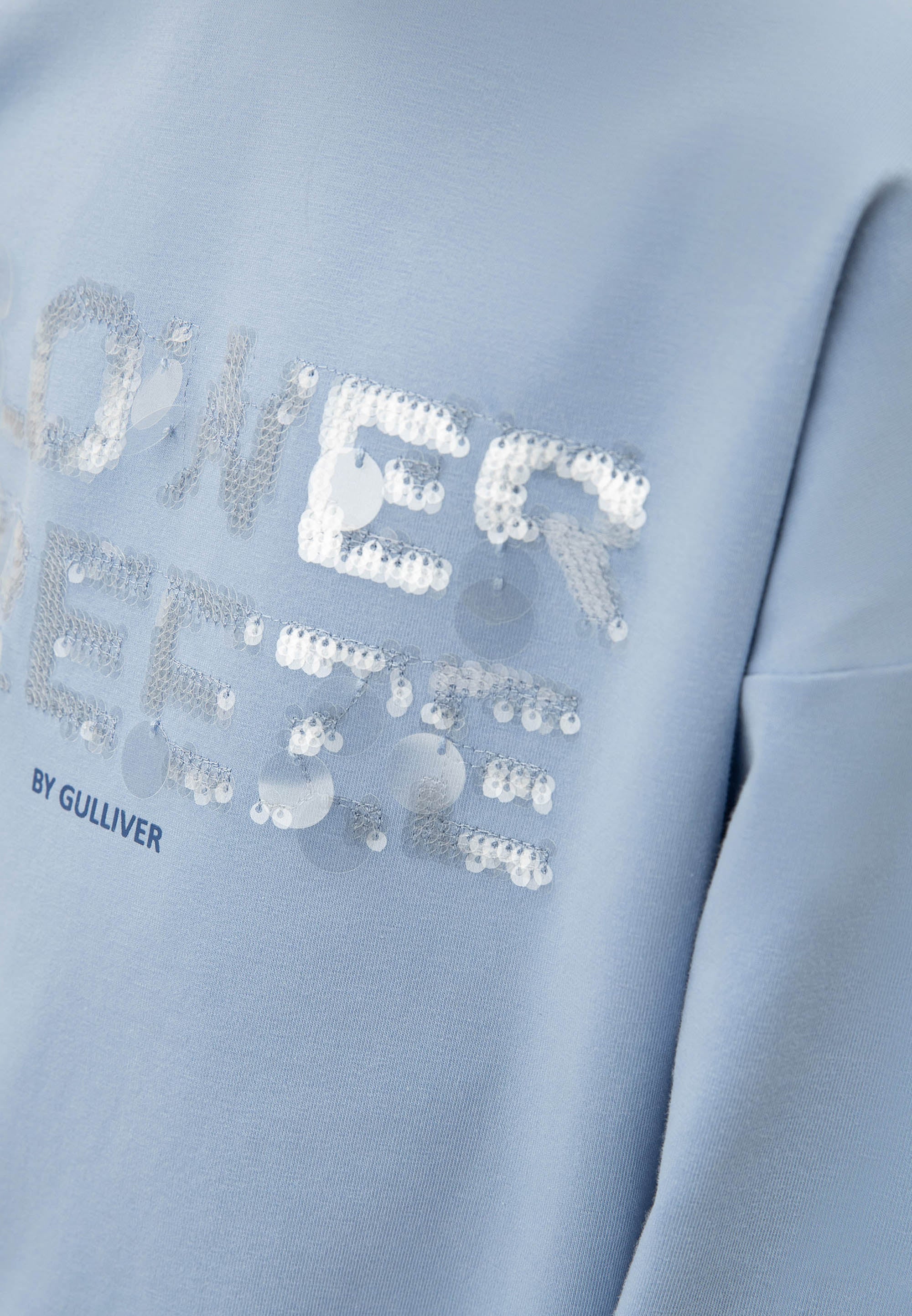 Светлосин лонгслив с удължен гръб и паднала линия на раменете – прекрасен вариант за романтични натури! Изделието е изработено от меко пластично памучно трико. В оформлението на модела е използван шрифтов декор от сияещи пайети. Лонгсливът има рипсено О-образно деколте.