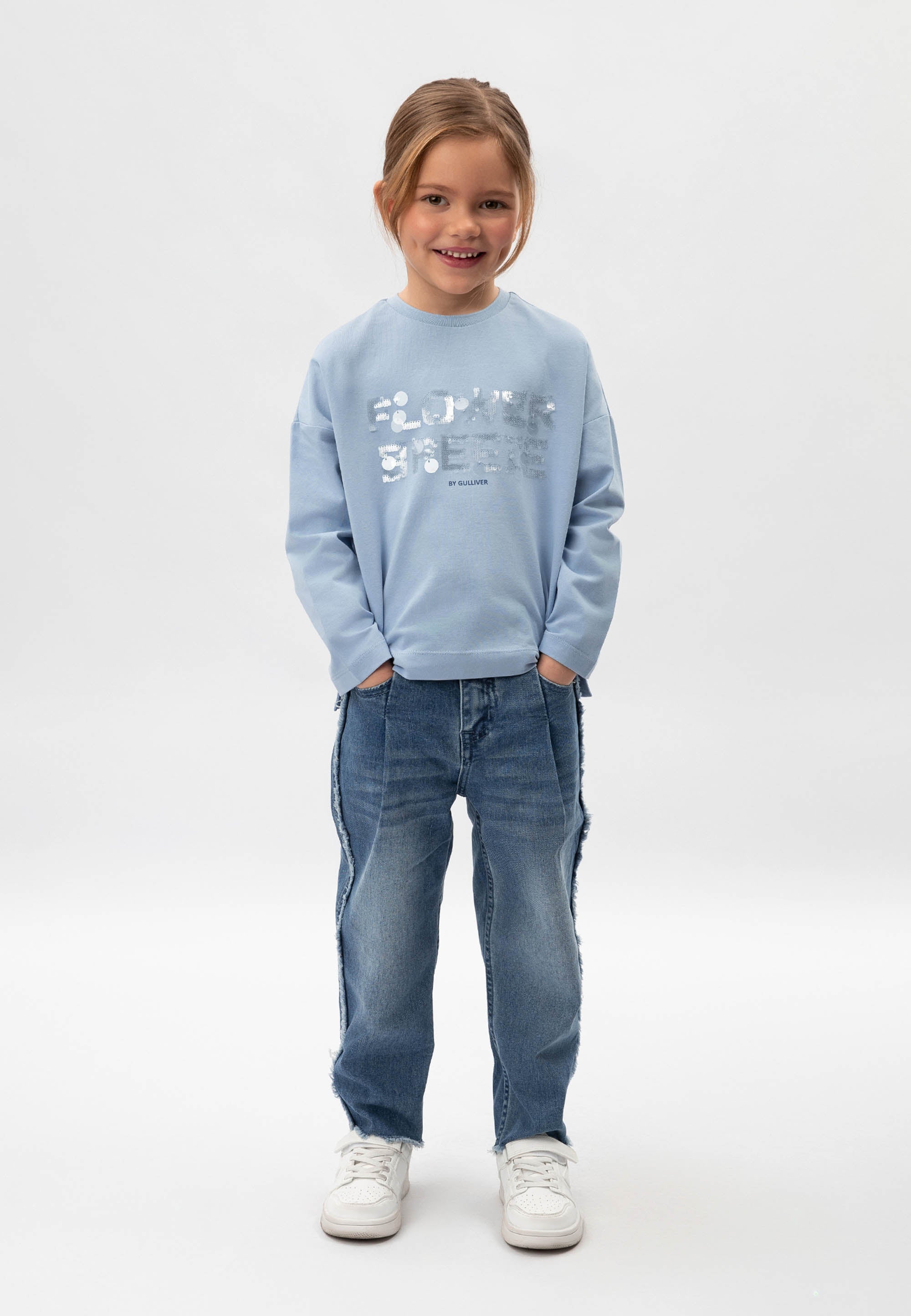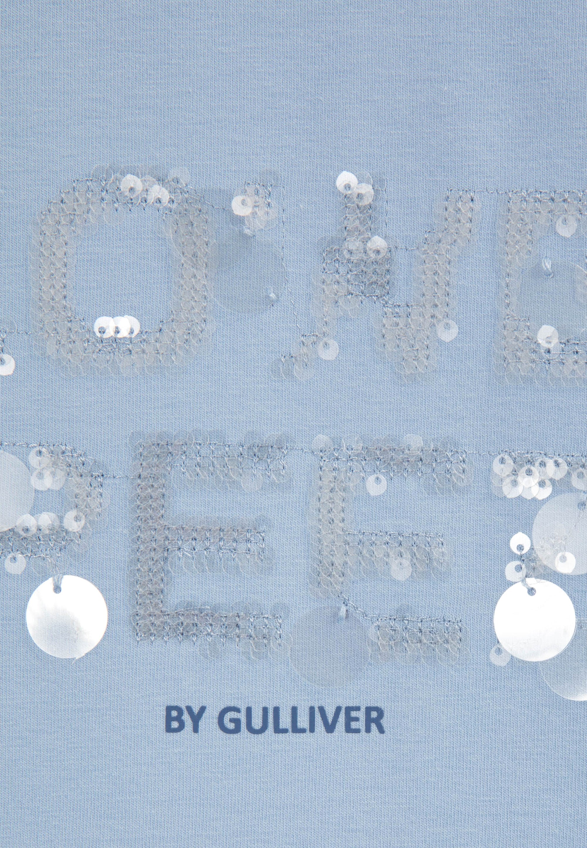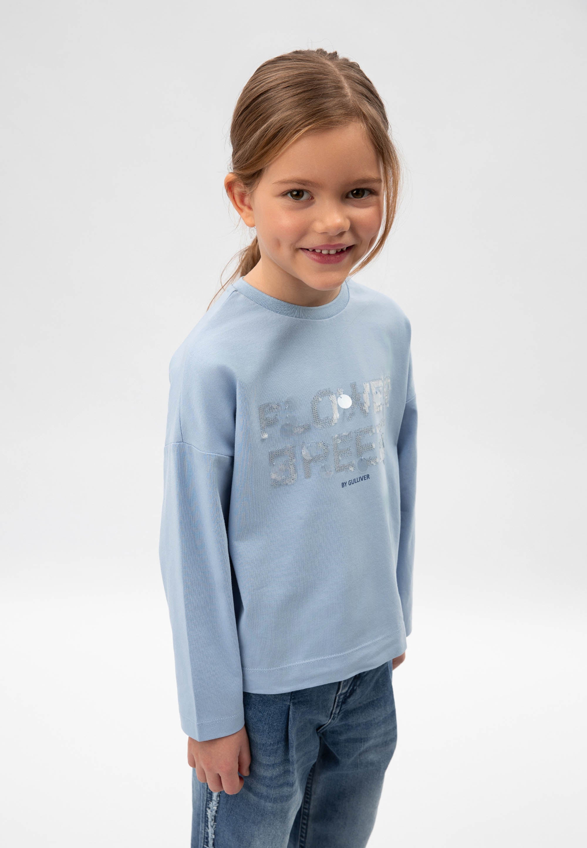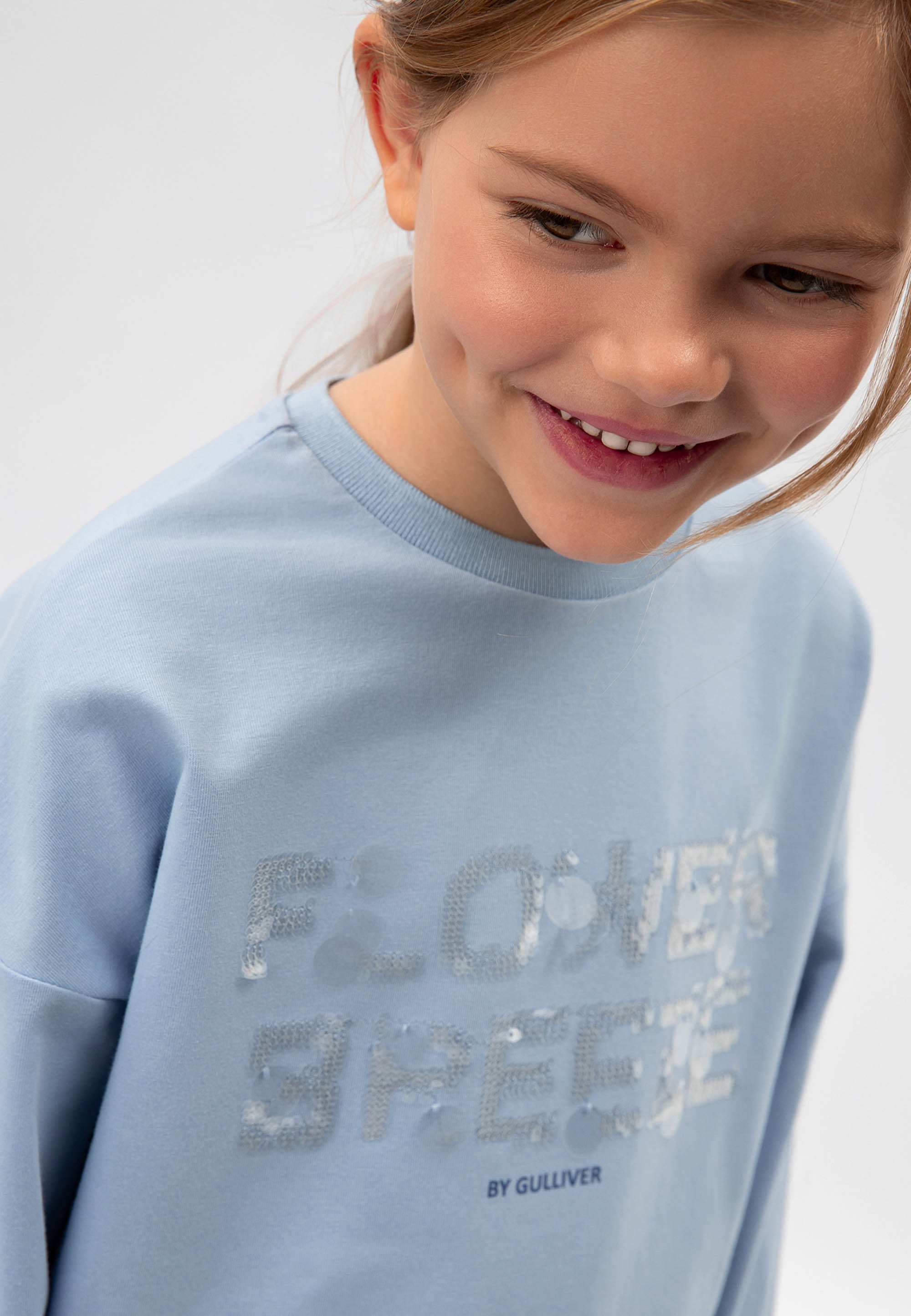 Светлосин лонгслив с удължен гръб и паднала линия на раменете – прекрасен вариант за романтични натури! Изделието е изработено от меко пластично памучно трико. В оформлението на модела е използван шрифтов декор от сияещи пайети. Лонгсливът има рипсено О-образно деколте.