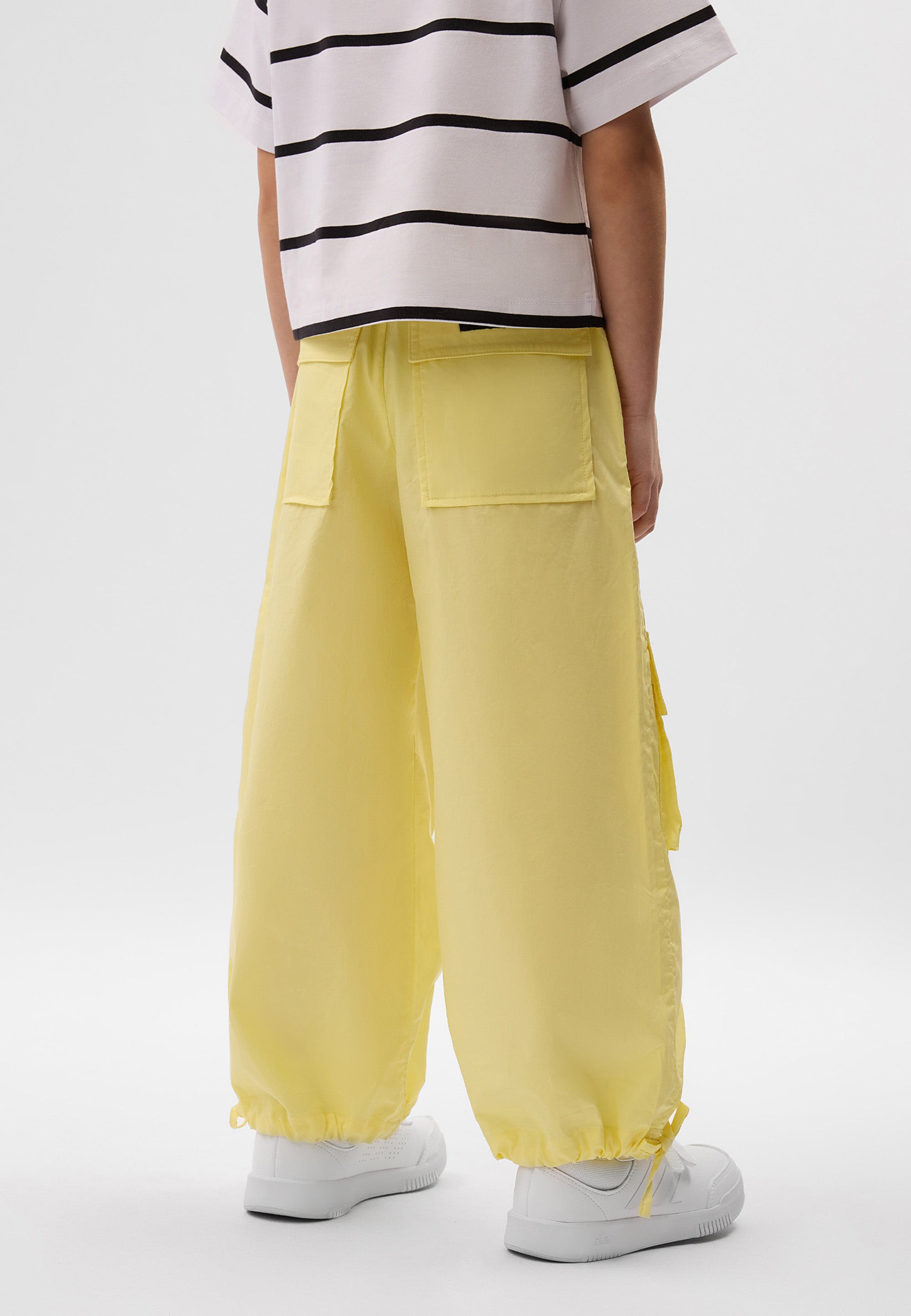 Прогноза за днес: слънчево! Свободни жълти панталони с колан на ластик, изработени от дишащ поплин. Материалът е лек, ефирен, приятен тактилно, лесен за поддръжка и идеално подходящ за ежедневни летни визии. Панталоните имат обемни карго джобове, скосени джобове и накладни джобове в задната част, съответствайки напълно на актуалните трендове на сезона. Връзките в долната част позволяват коригиране на силуета – от свободни разкроени палацо до панталони с О-образна форма, напомнящи шалвари. В оформлението на модела е използвана жакардова нашивка с шрифтови елементи.