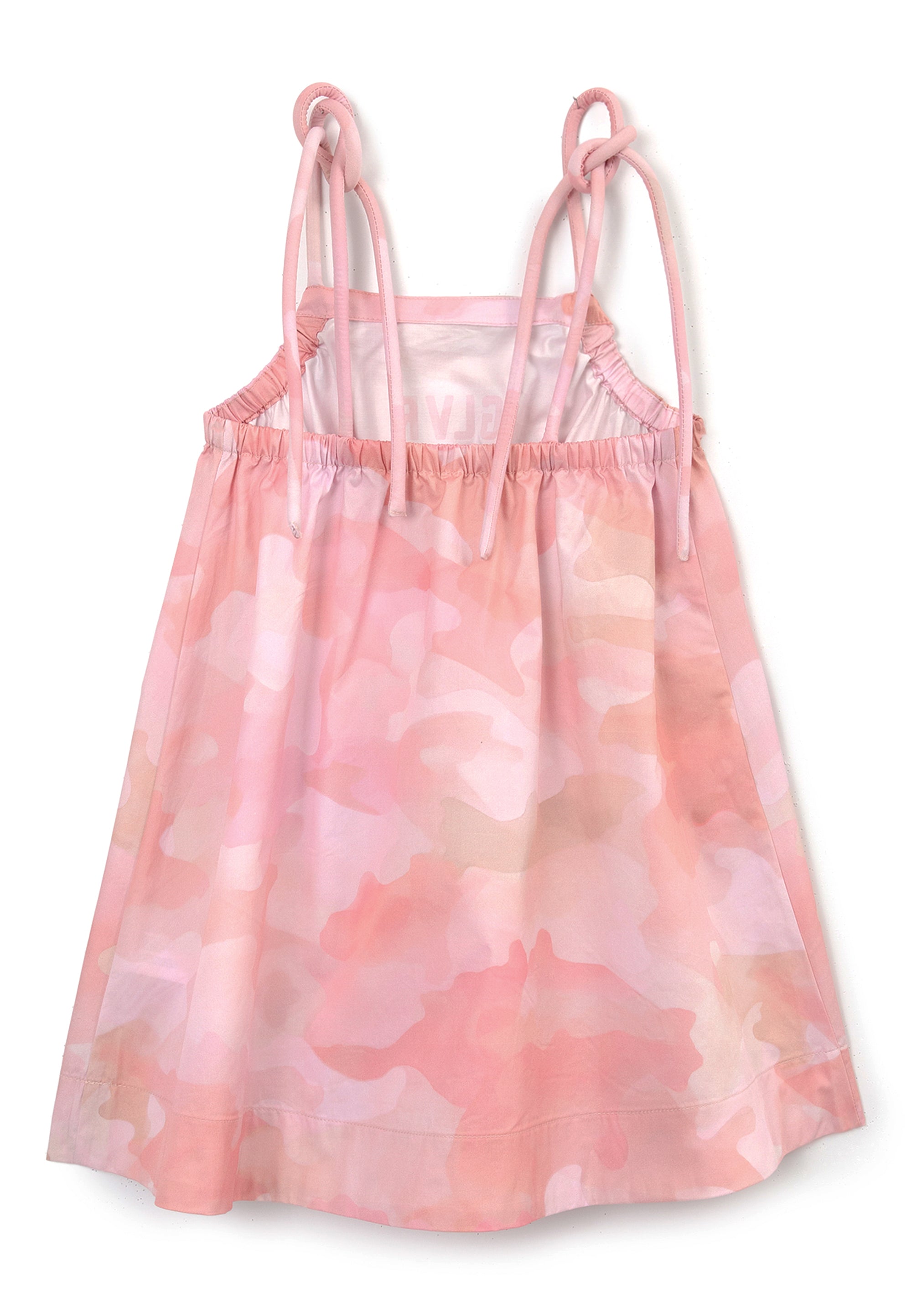 Розов сарафан, сякаш изтъкан от девичи летни сънища! Сарафанът с открит гръб и А-образен силует е изработен от дишащ памучен сатен с характерен матов блясък. Абстрактният десен е изграден върху плавни цветови преходи в розовата палитра, придаващи на изделието свеж и интересен вид. Регулируемите презрамки-шнурове падат красиво в предната част, правейки модела остър и интригуващ. Обемните джобове с капаци придават на сарафана динамика в спортен стил. В оформлението са използвани шрифтови елементи.