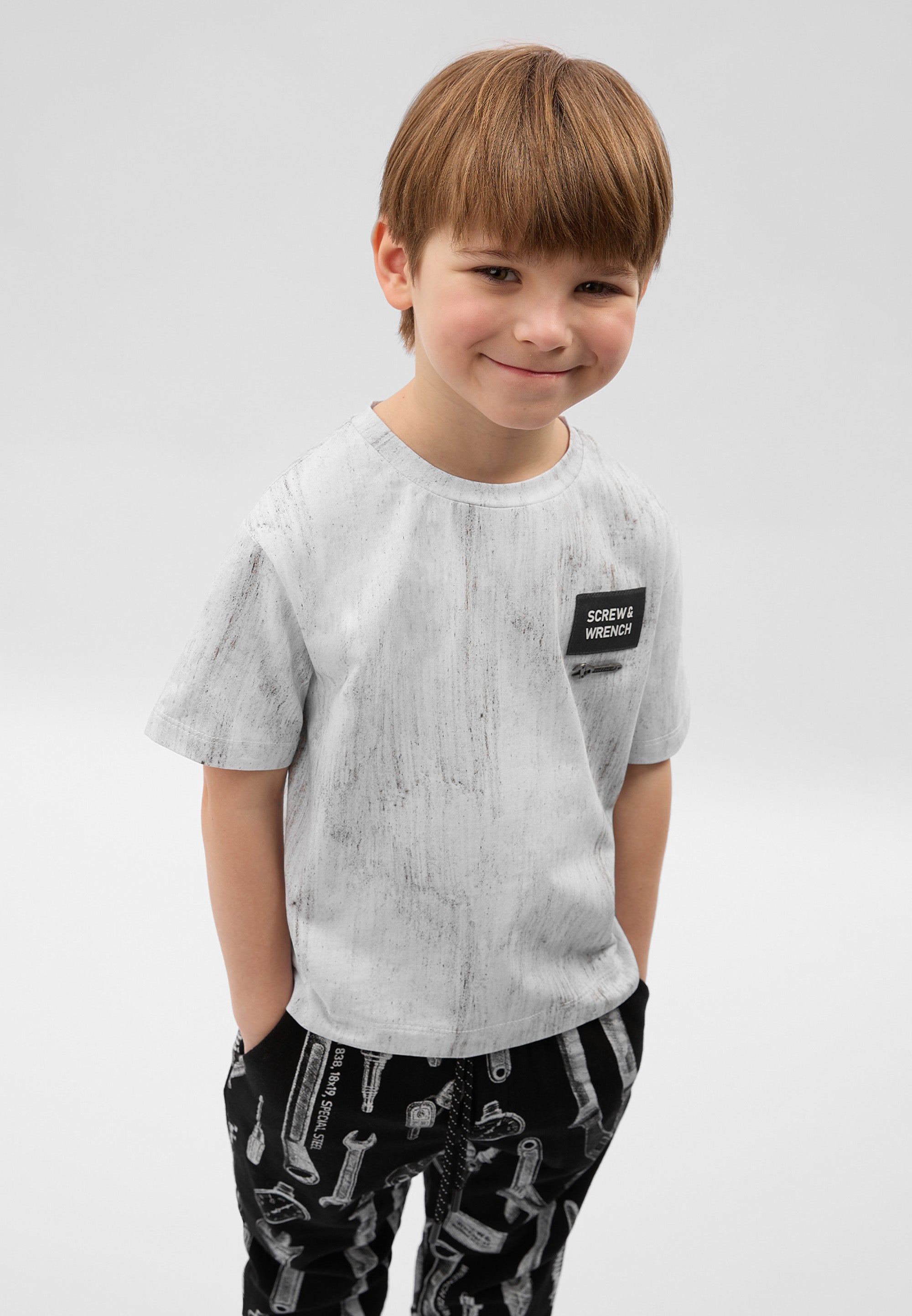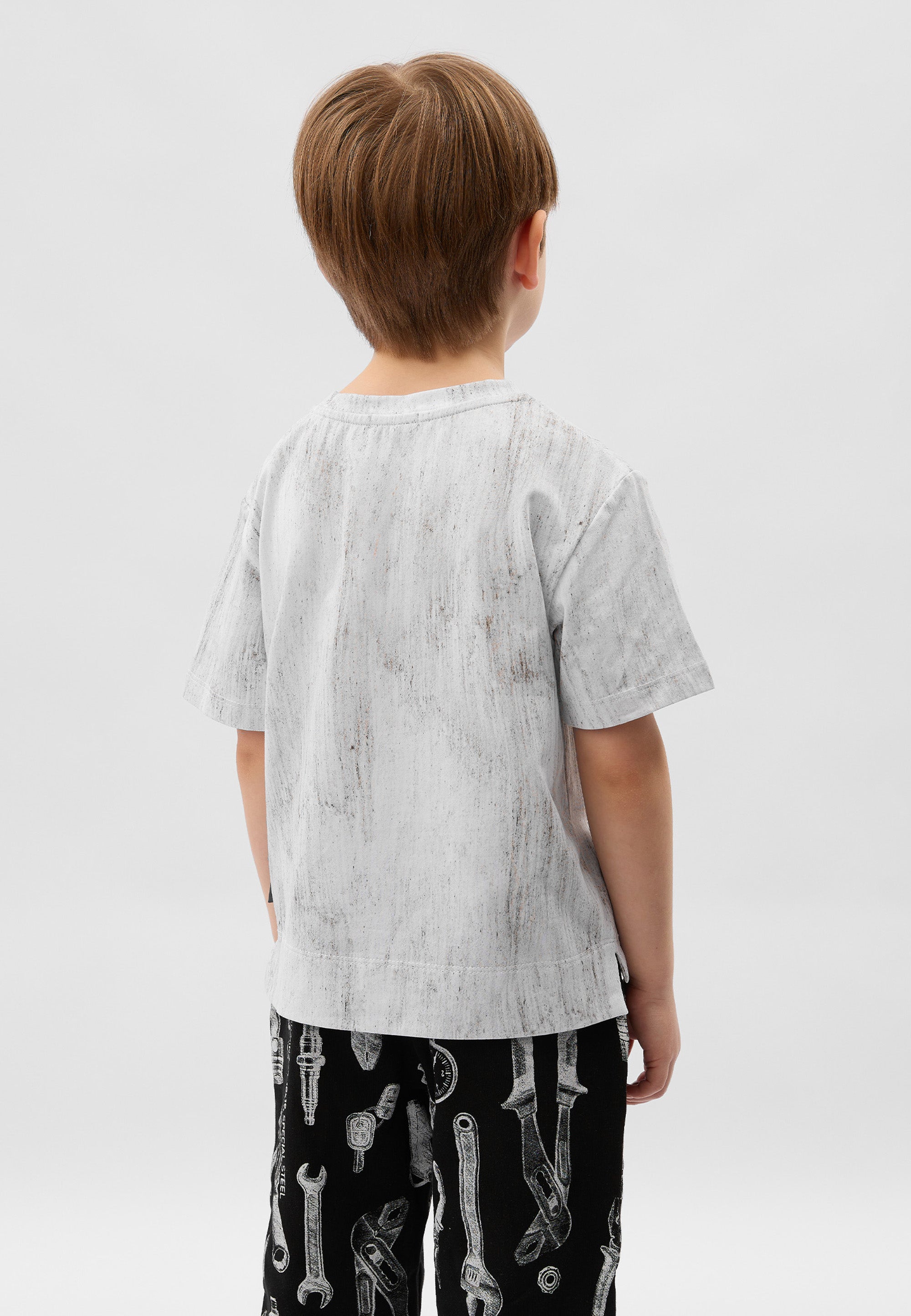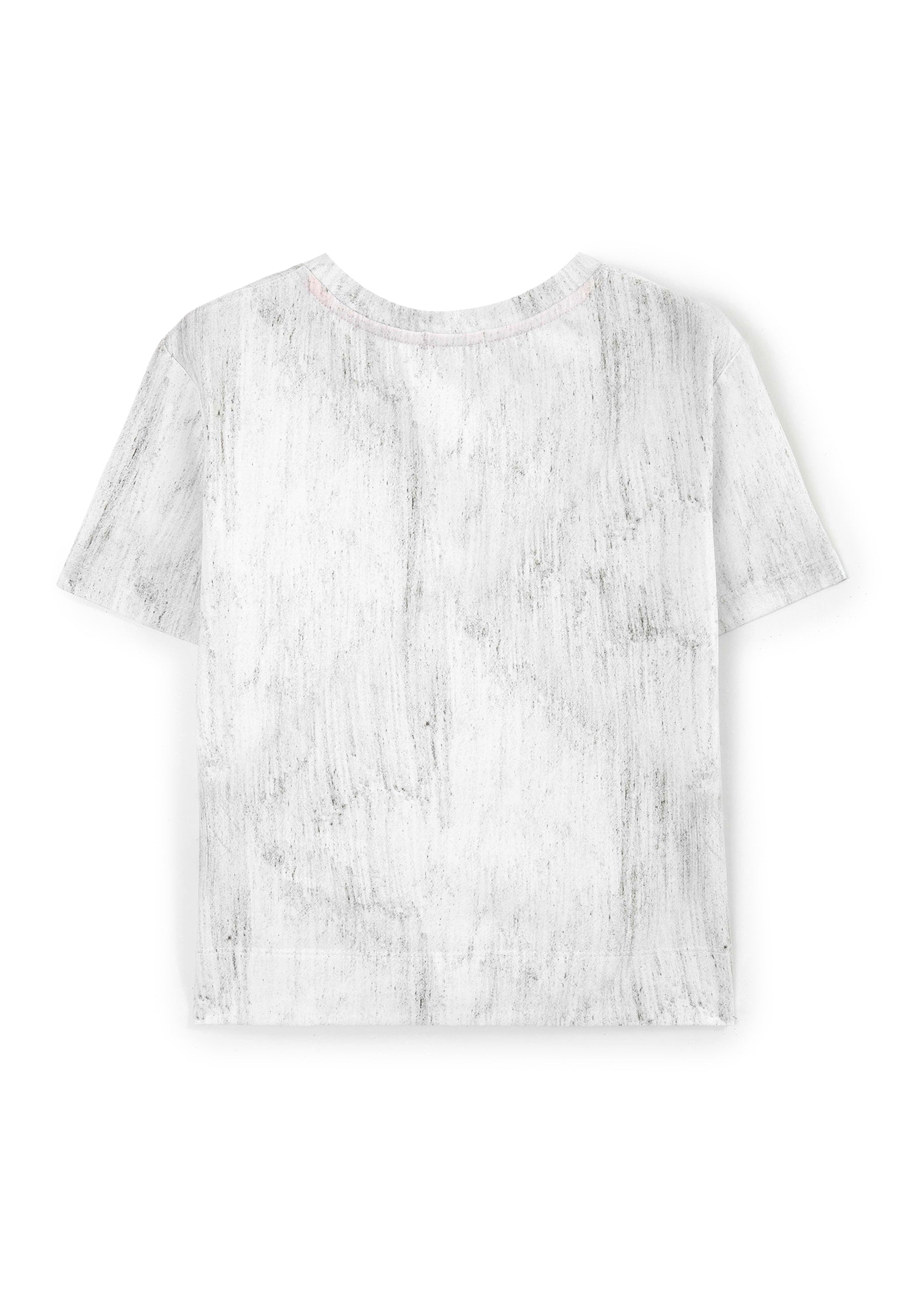 Сива тениска с къс ръкав от пластично памучно трико – базова лятна вещ с „изненада“. Изработена е от меко трико с дискретен десен, имитиращ винтидж ефект на изтритост и неравномерно оцветяване. Модната форма със занижена линия на гърба създава съвременен силует и свобода на движенията. В оформлението е използвана стилна акцентна нашивка.