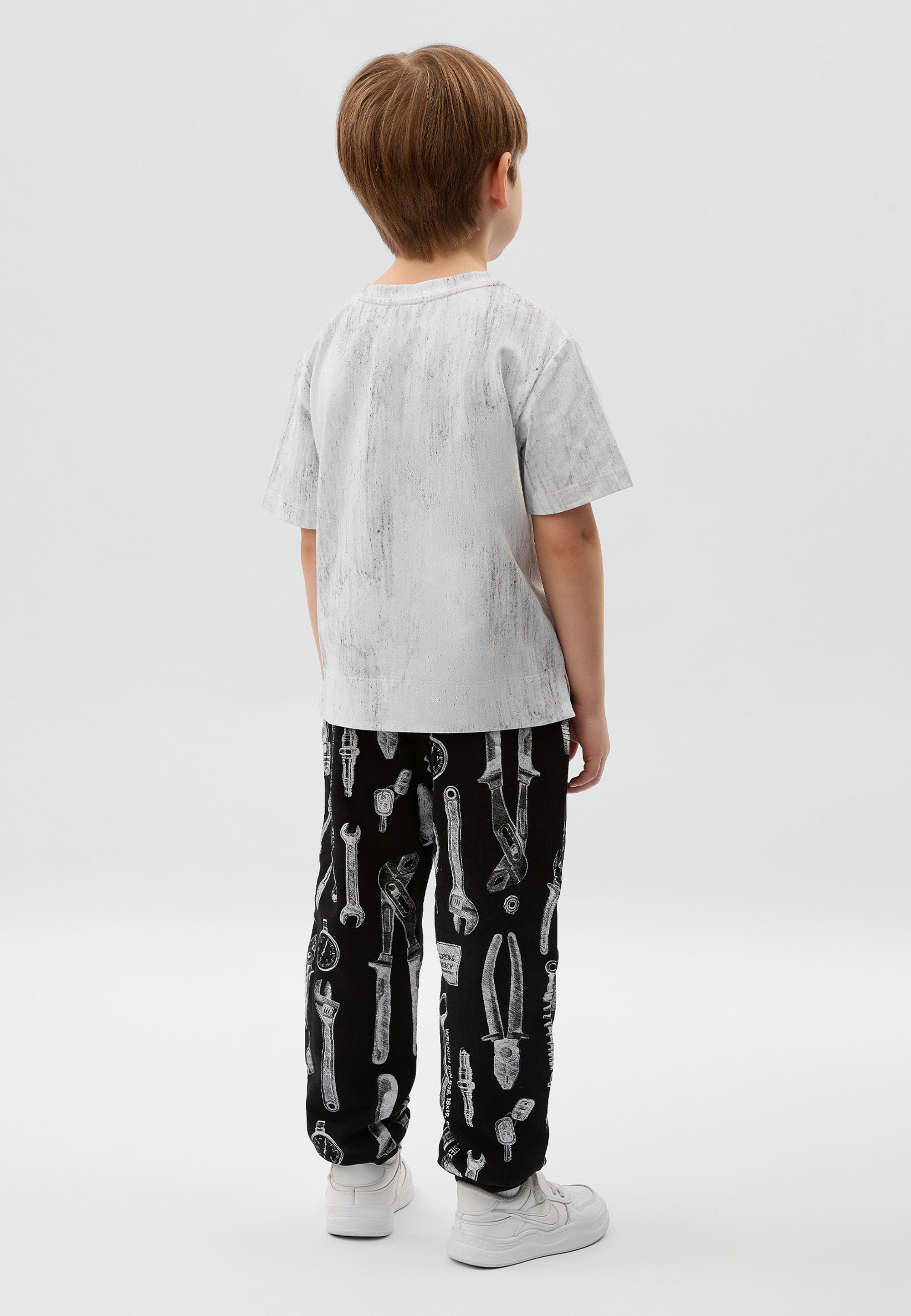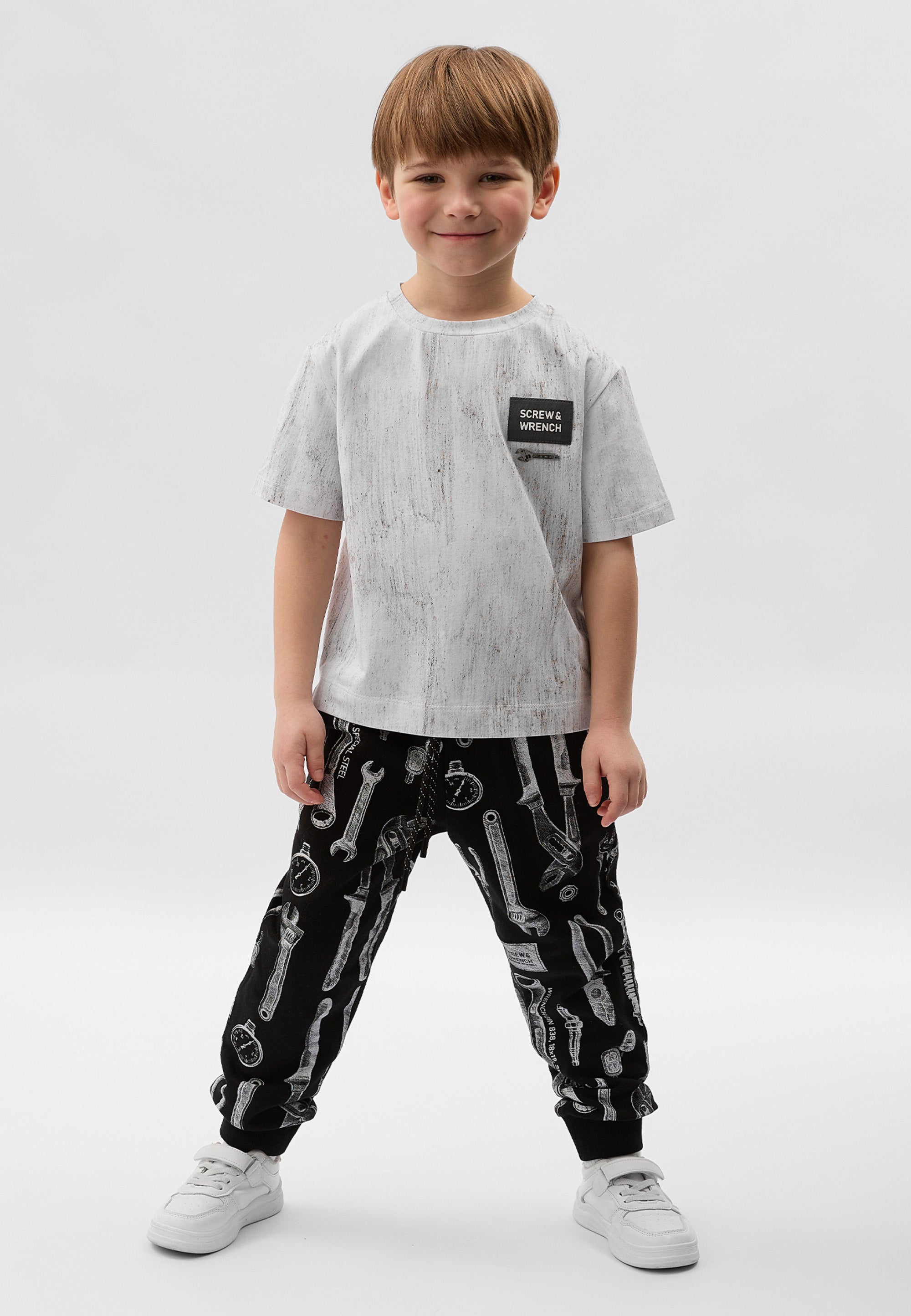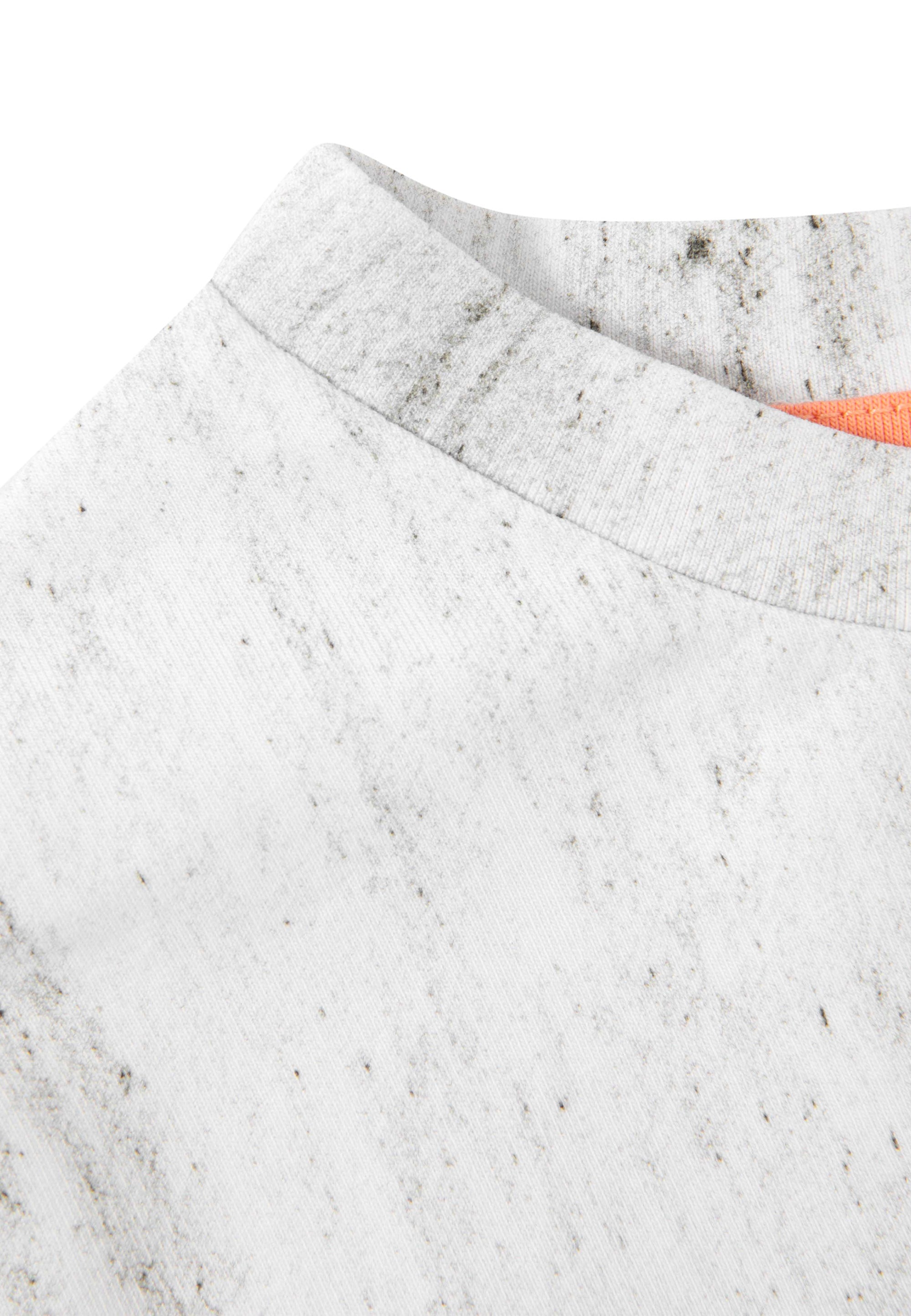 Сива тениска с къс ръкав от пластично памучно трико – базова лятна вещ с „изненада“. Изработена е от меко трико с дискретен десен, имитиращ винтидж ефект на изтритост и неравномерно оцветяване. Модната форма със занижена линия на гърба създава съвременен силует и свобода на движенията. В оформлението е използвана стилна акцентна нашивка.