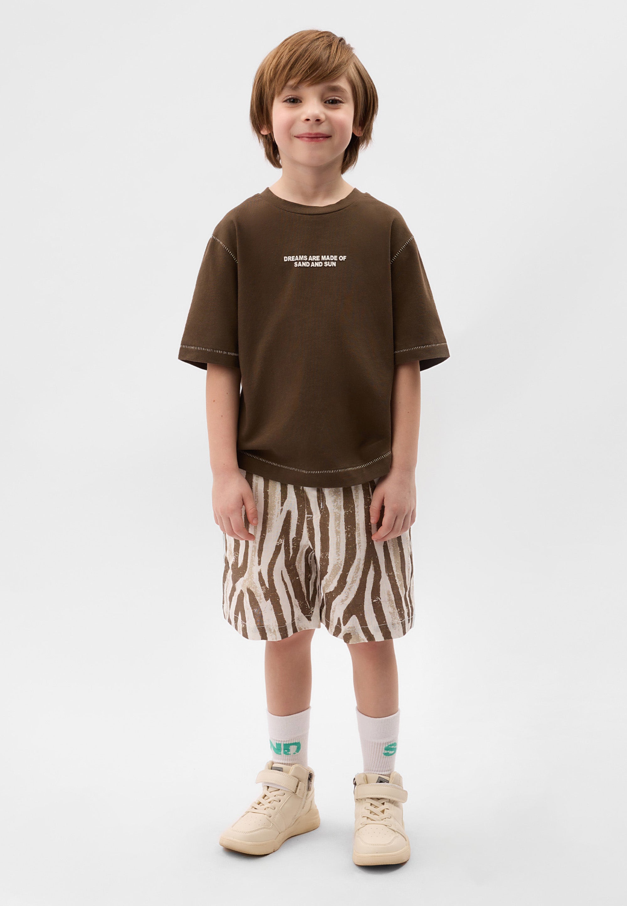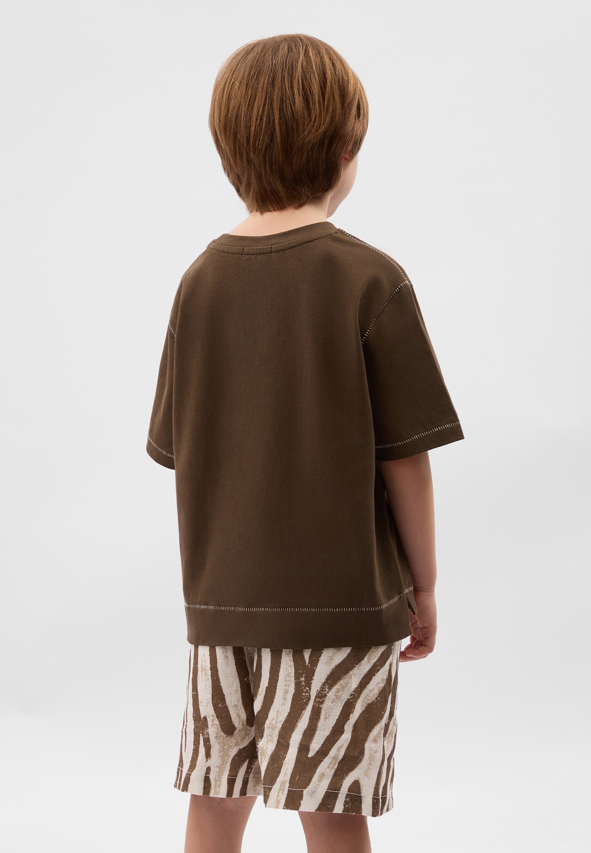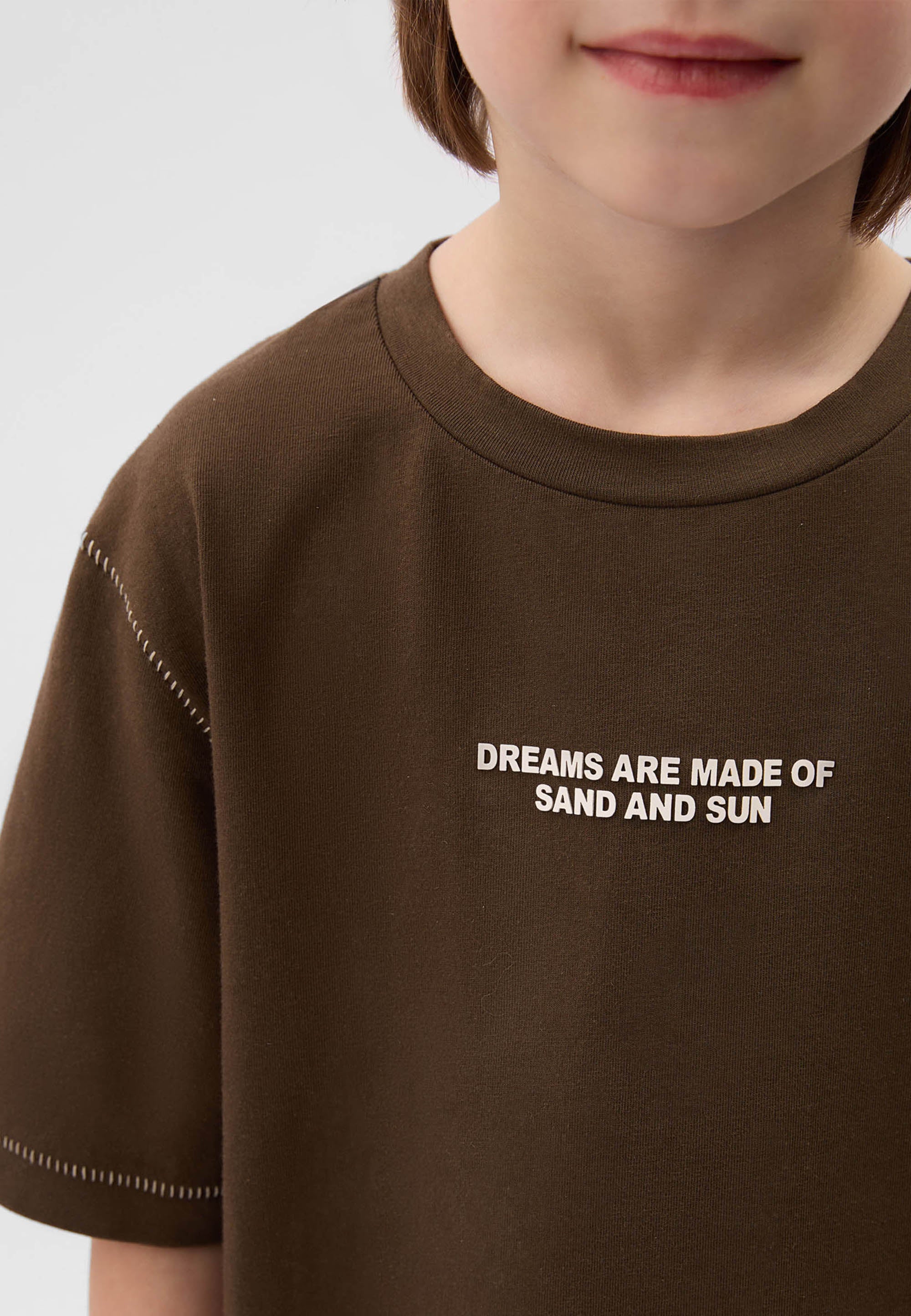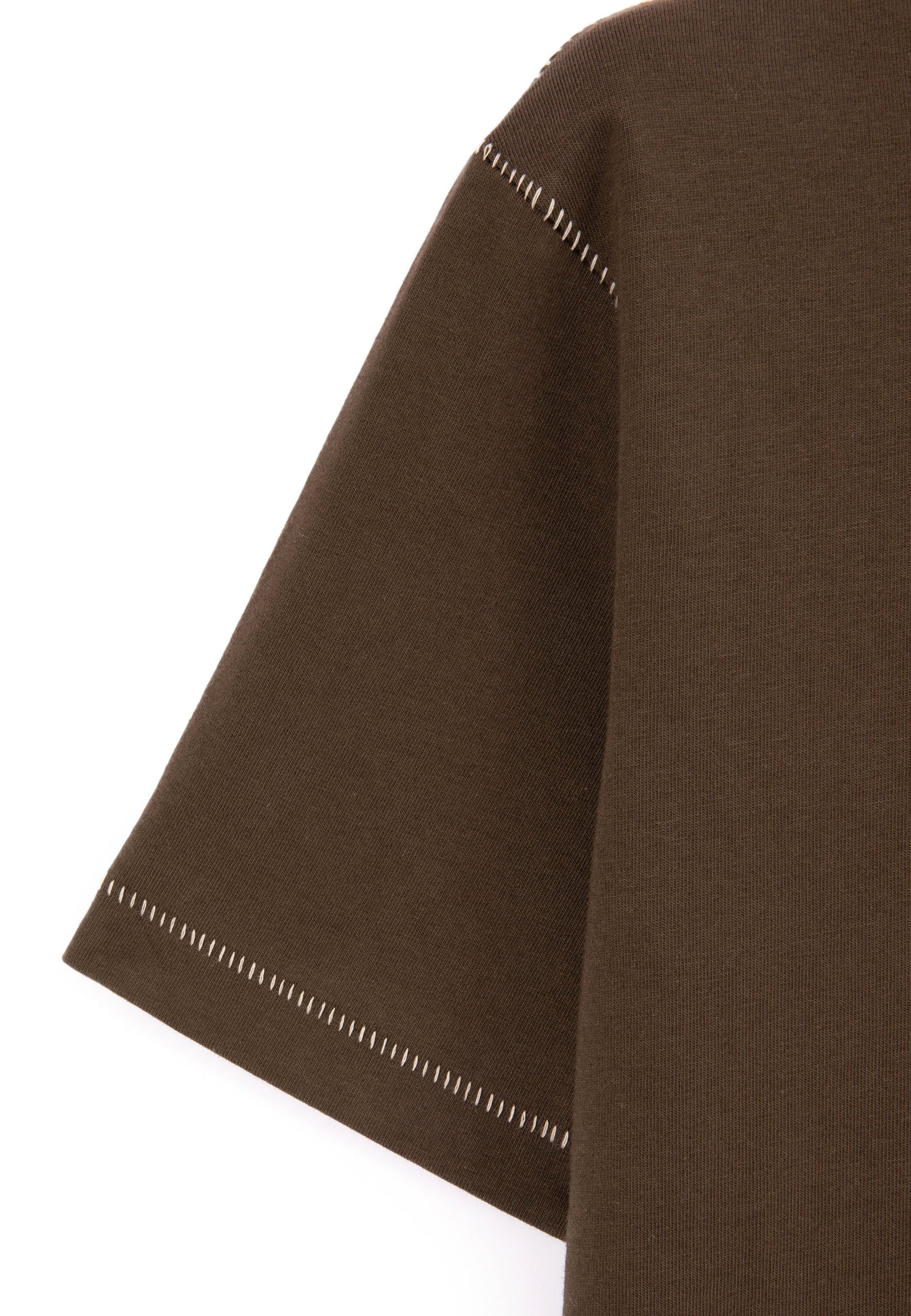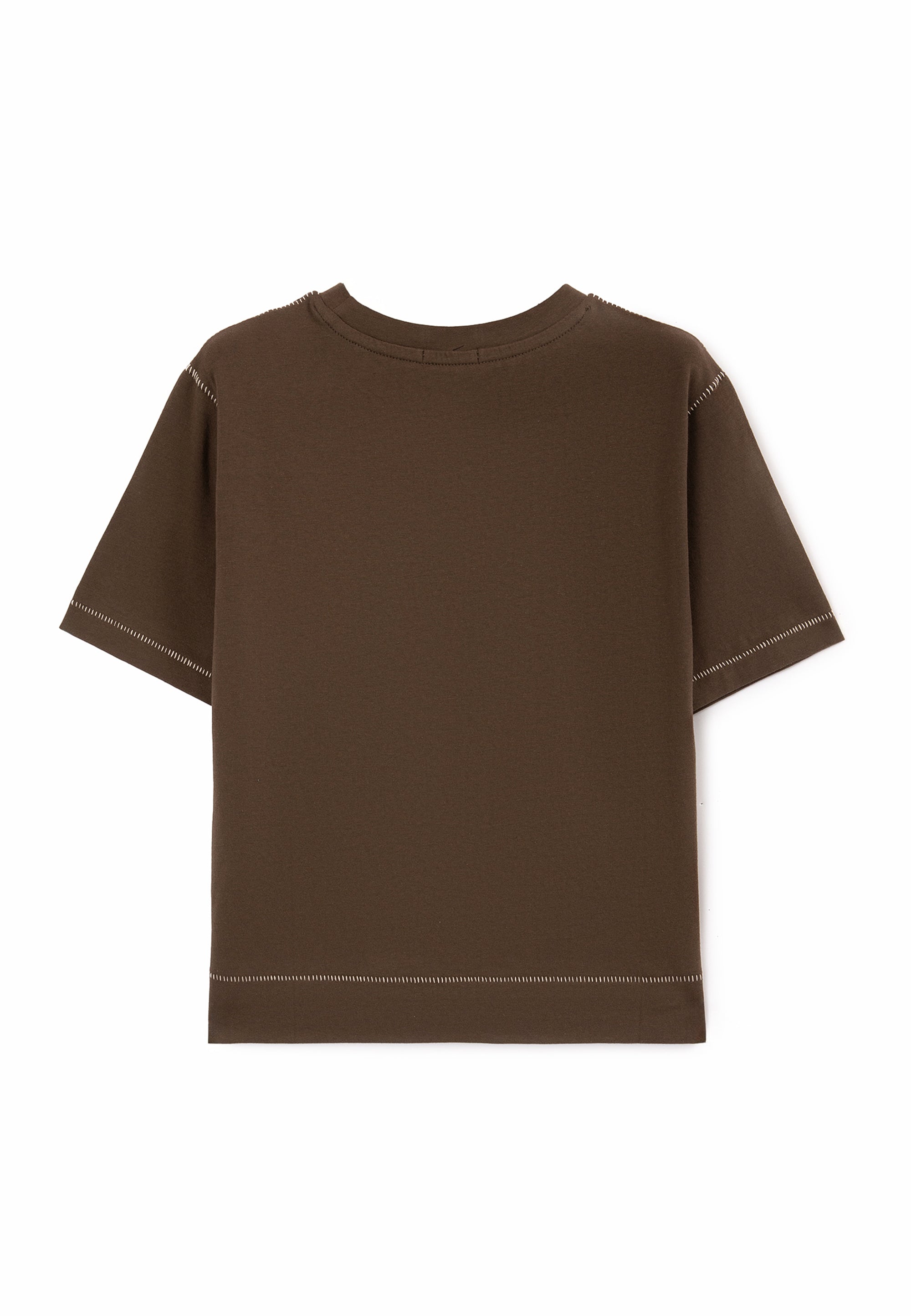 Комфортна кафява тениска – образец за минималистична базова вещ с малки акцентни детайли. Правата свободна форма с паднало рамо и удължен гръб я правят модерна и съвременна. Контрастните декоративни шевове и фактурният шрифтов принт подчертават високото ниво на дизайн и прецизната изработка.