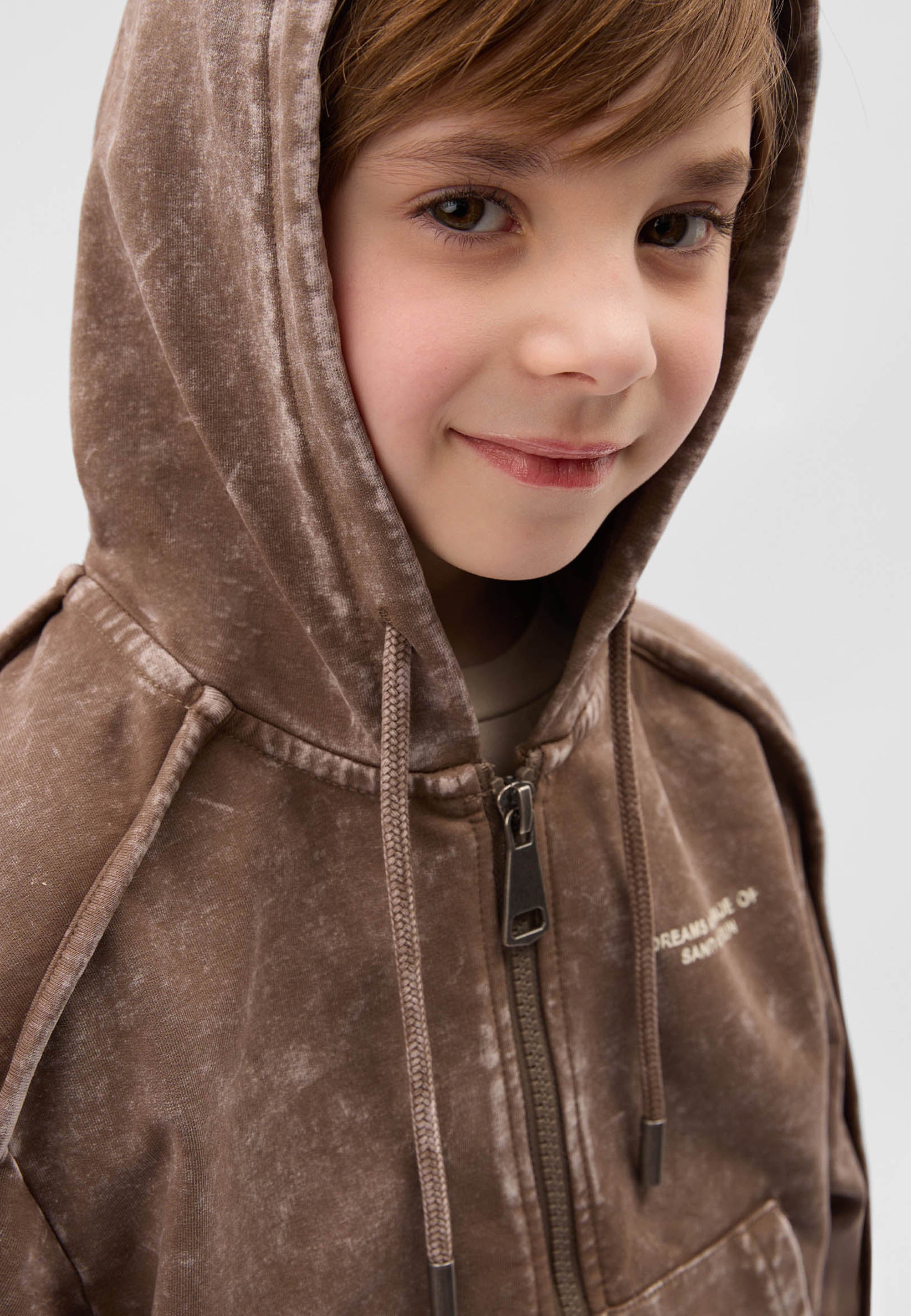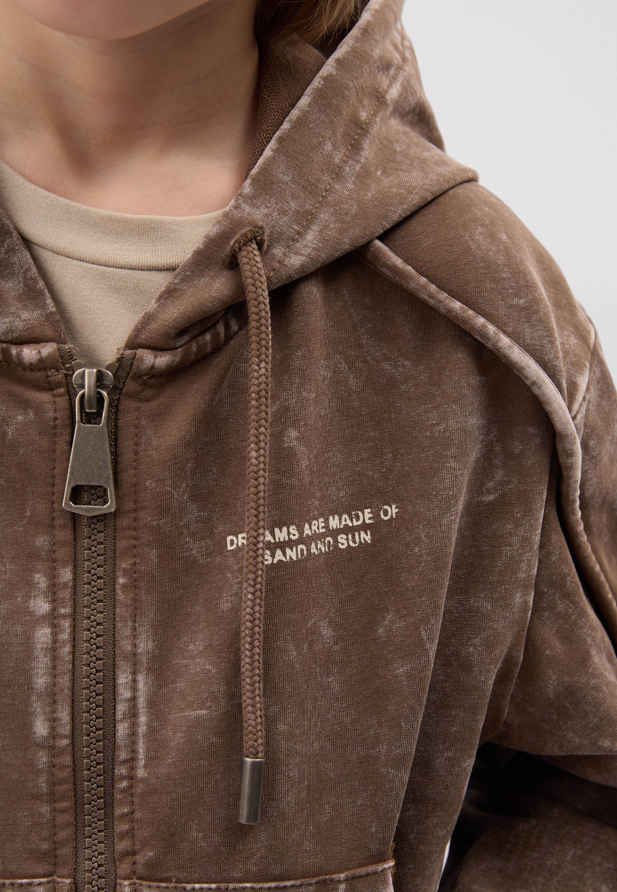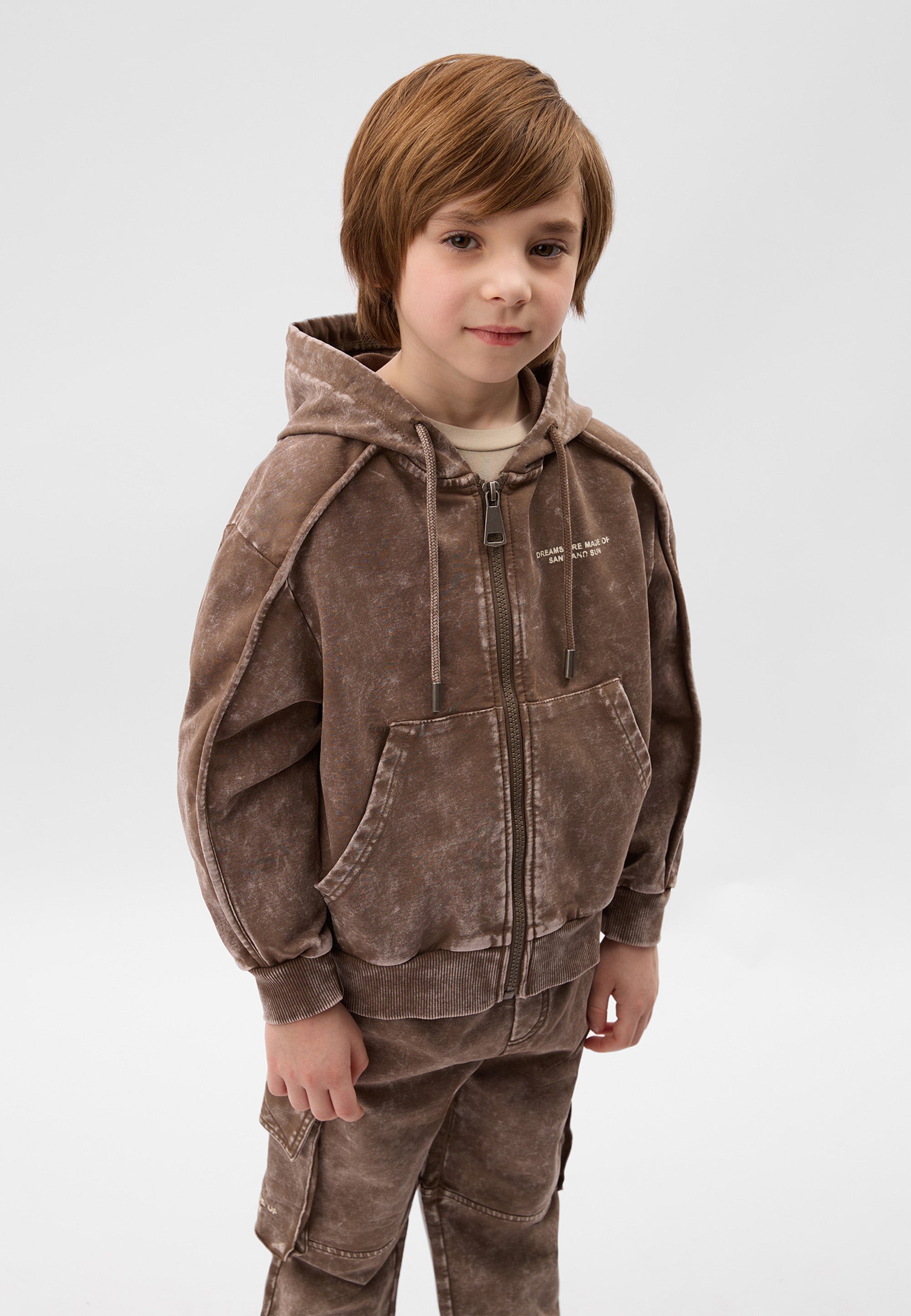 Суитшърт с качулка и цип, изработен от „варен“ футер, ще направи гардероба на детето модерен и функционален! Въпреки базовия силует, суитшъртът има интересни конструктивни детайли – протрити кантове на ръкавите, състарени шевове и големи накладни джобове с ефект на изпиране, които подсилват гръндж стилистиката. Закопчава се с „тракторен“ цип. Дерзкият бунтарски образ се завършва от малък шрифтов принт отпред.