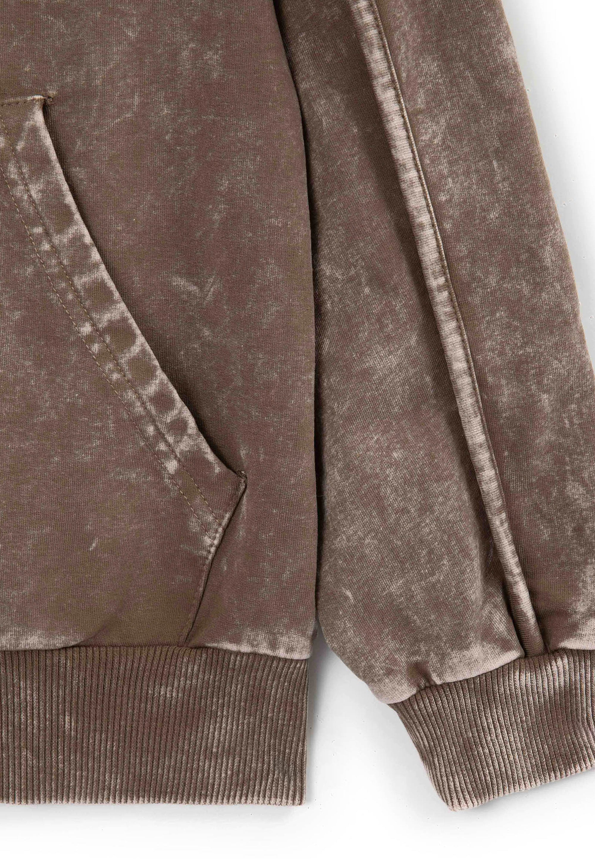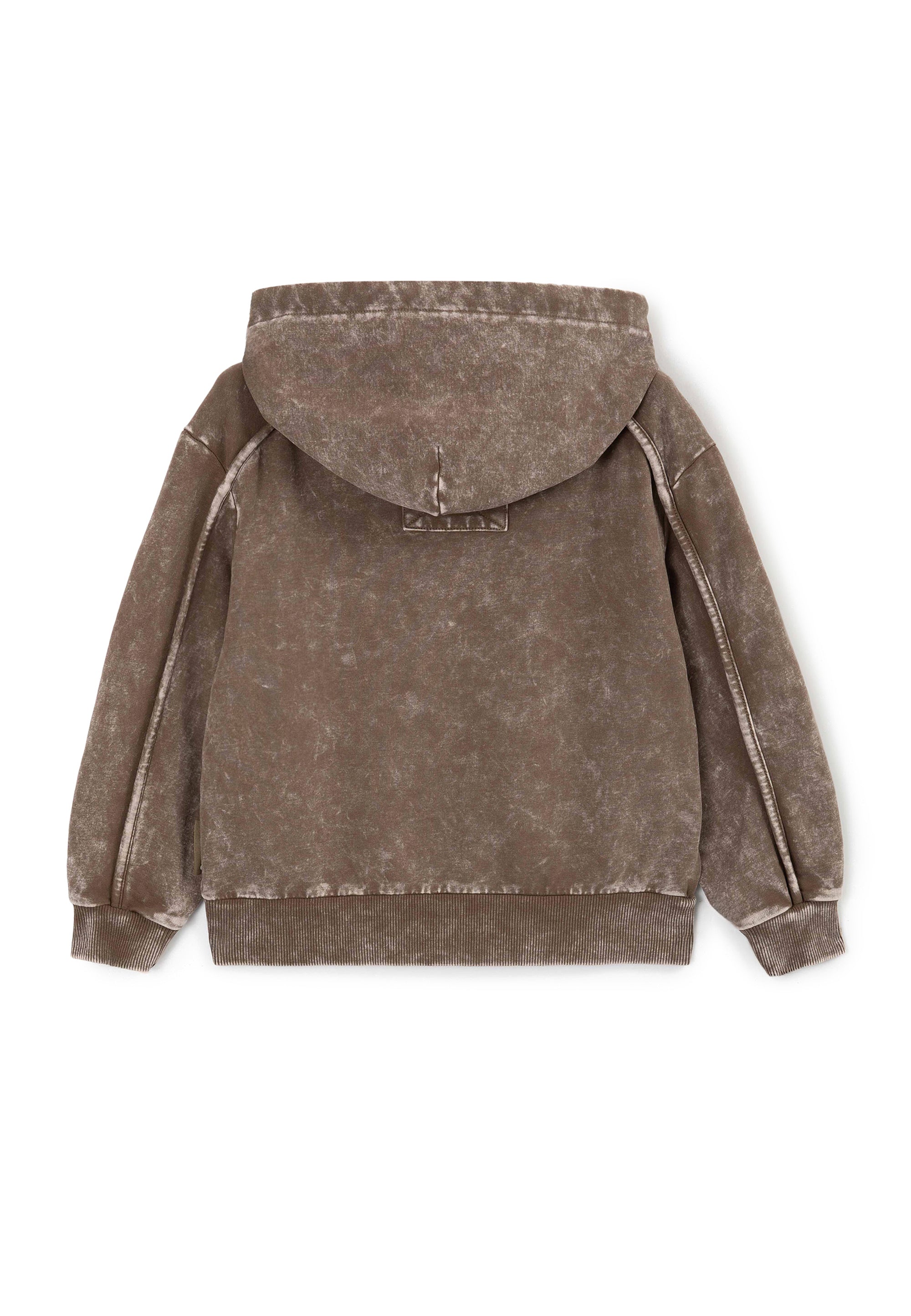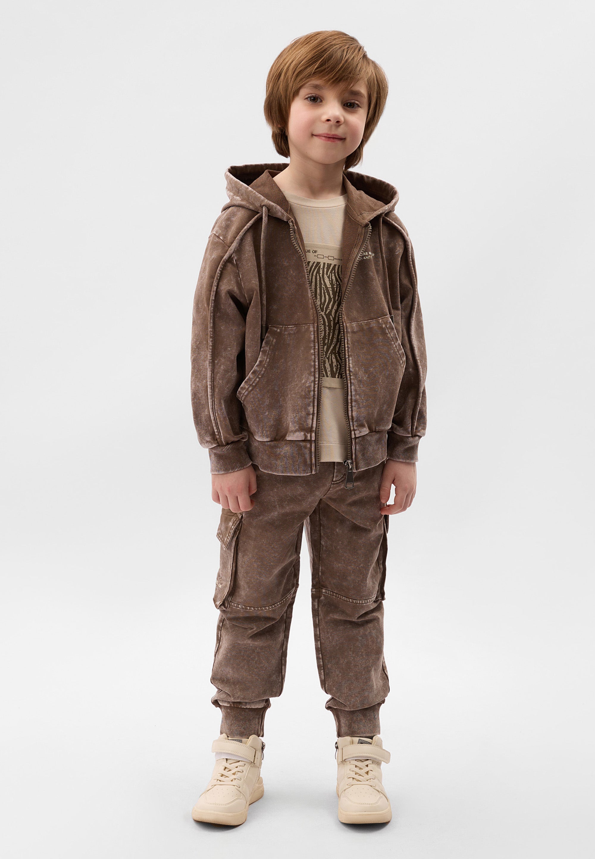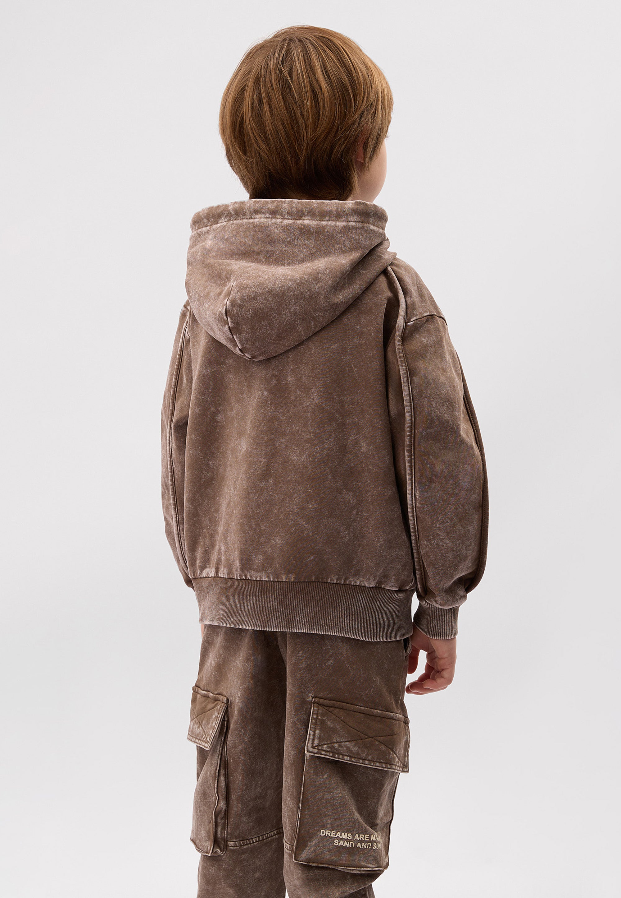 Суитшърт с качулка и цип, изработен от „варен“ футер, ще направи гардероба на детето модерен и функционален! Въпреки базовия силует, суитшъртът има интересни конструктивни детайли – протрити кантове на ръкавите, състарени шевове и големи накладни джобове с ефект на изпиране, които подсилват гръндж стилистиката. Закопчава се с „тракторен“ цип. Дерзкият бунтарски образ се завършва от малък шрифтов принт отпред.