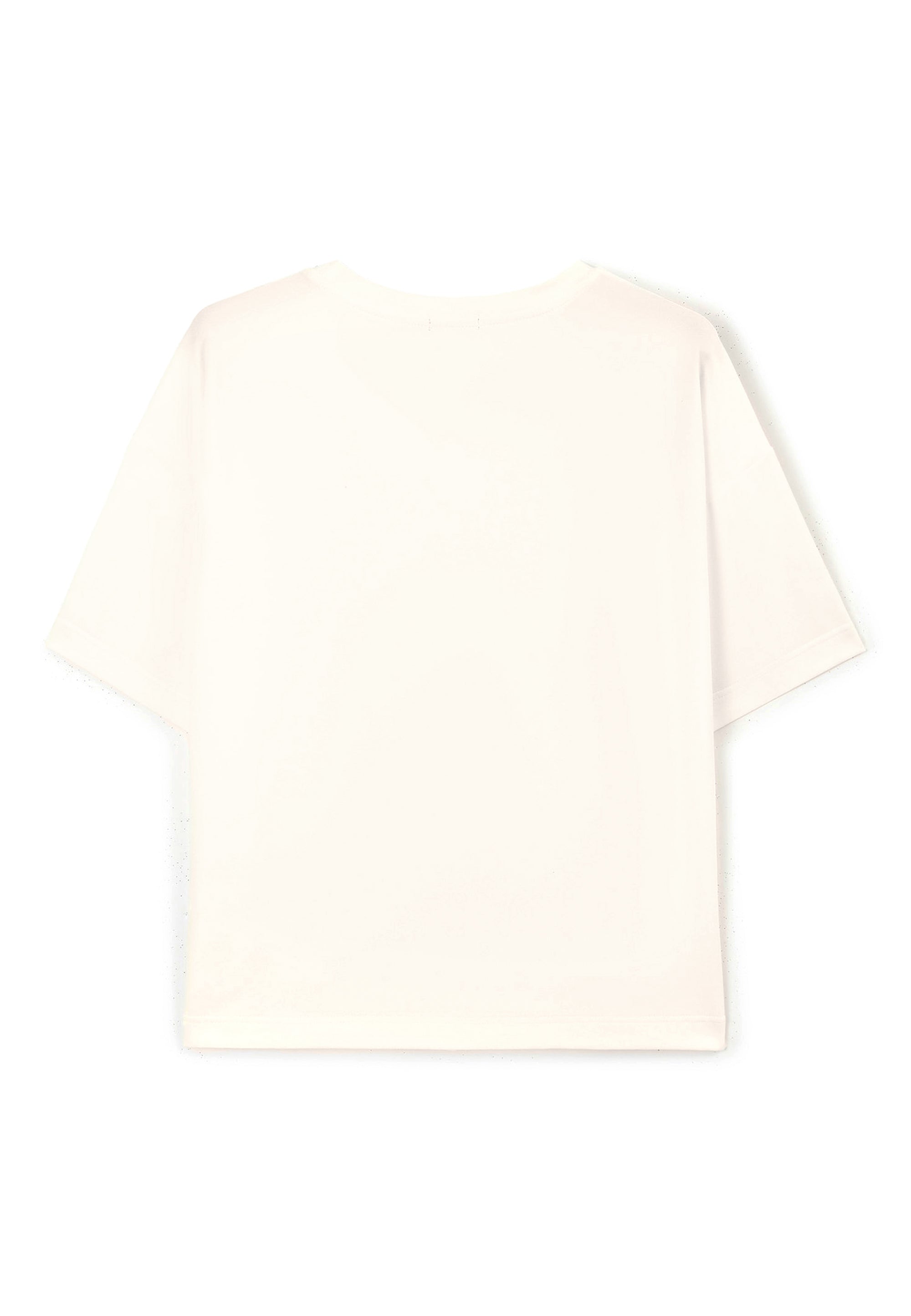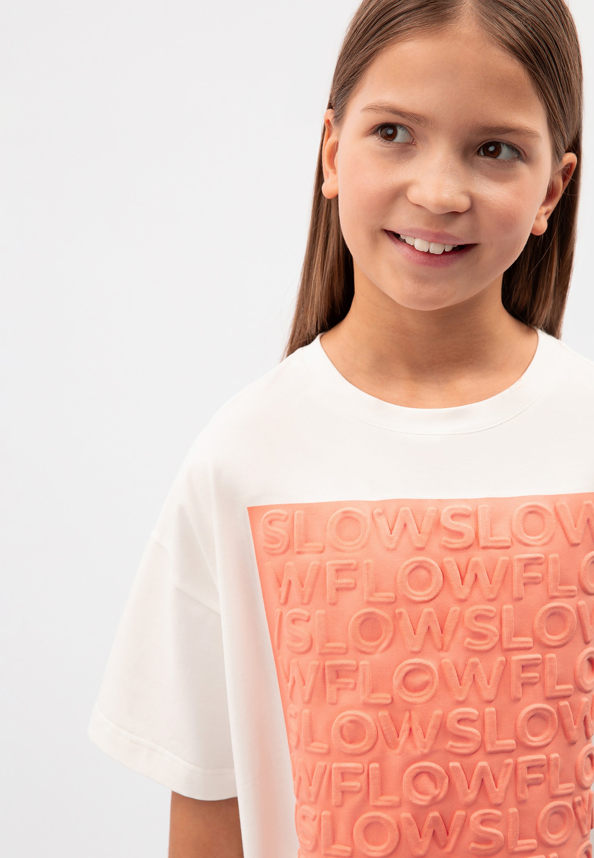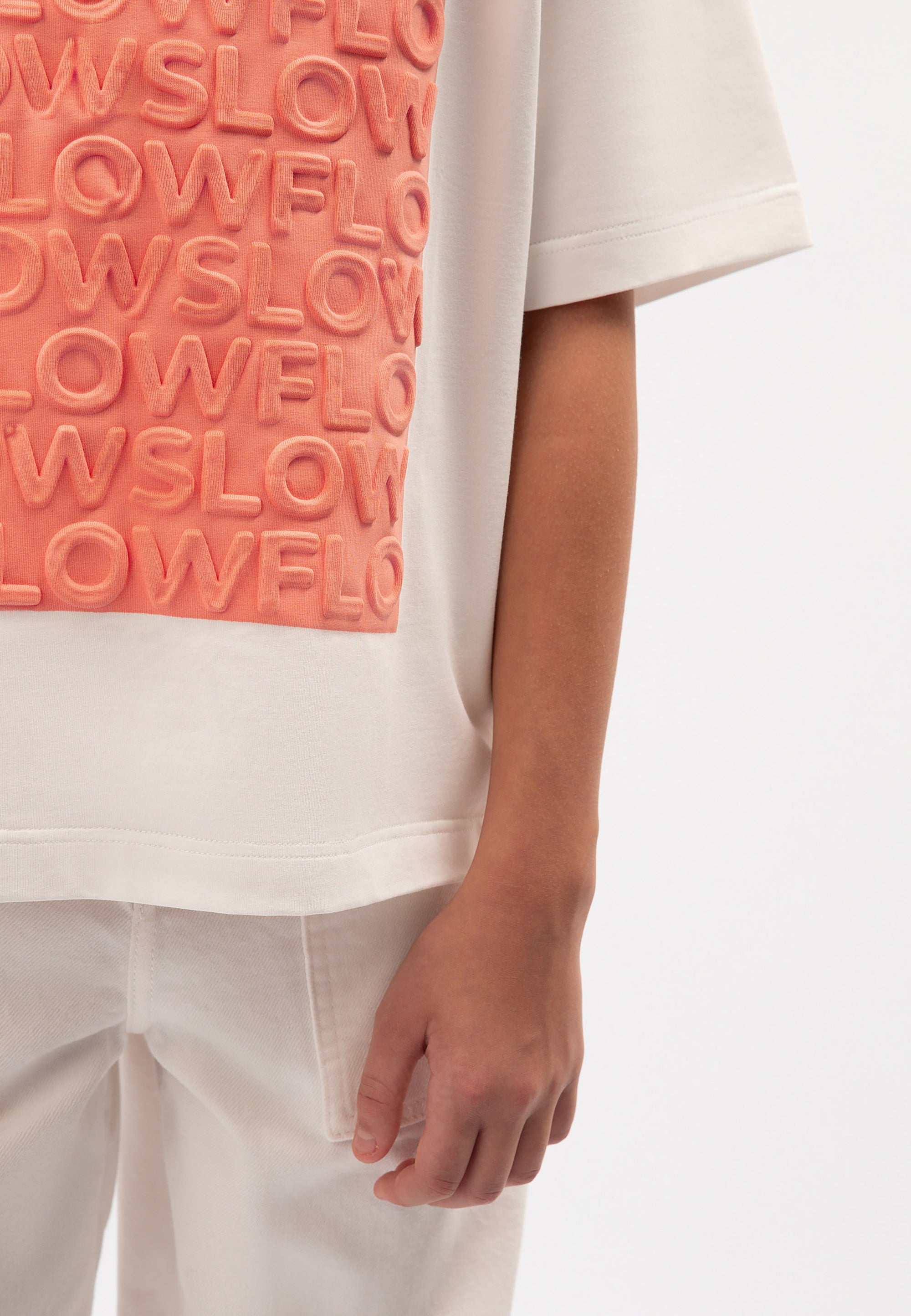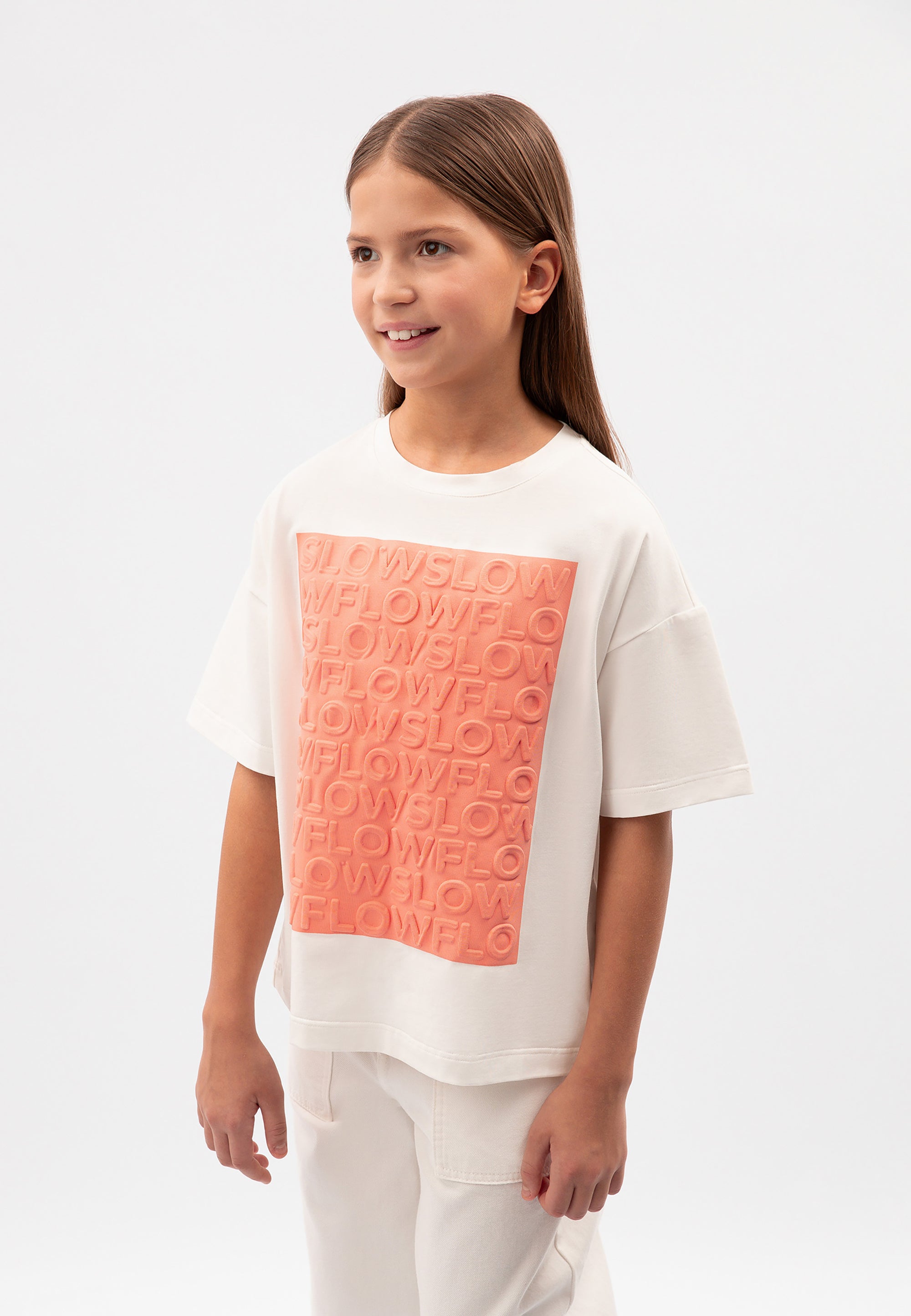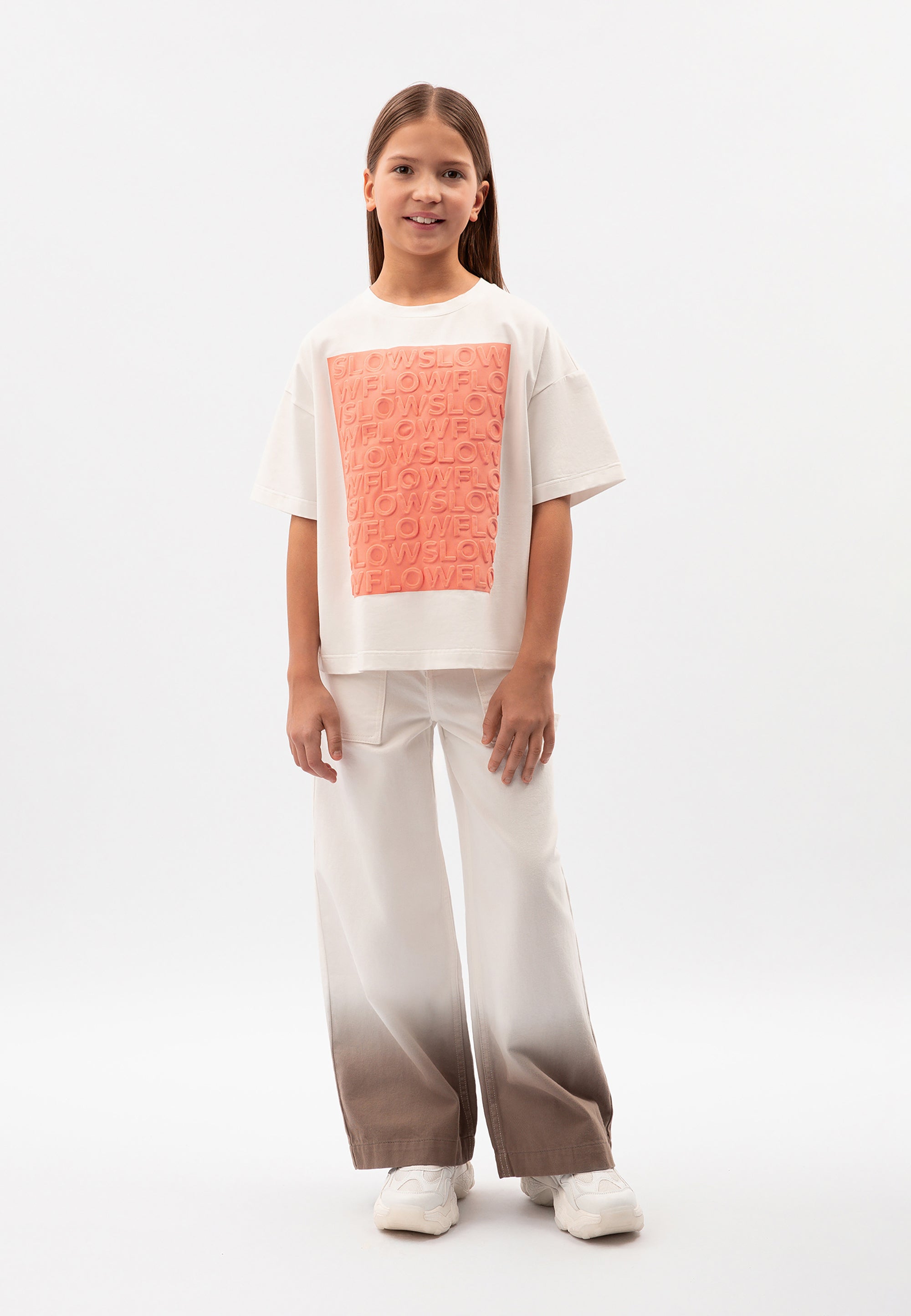 Тениска със силует овърсайз и паднало рамо, изработена от меко трико, ще оформи интересни летни визии в духа на стрийтстайла. Оригиналният дизайн, привличащ вниманието към контрастния правоъгълен декор, прави тениската стилна, лаконична и концептуална. В оформлението на модела са използвани релефни надписи, които изглеждат много красиво и фактурно. Спектърът от възможни комбинации с тениската е безкраен. Както с дънкови шорти, така и с трикотажни панталони, с миди пола или с панталони карго, тениската ще изглежда превъзходно, привличайки вниманието към стилния имидж на момичето.