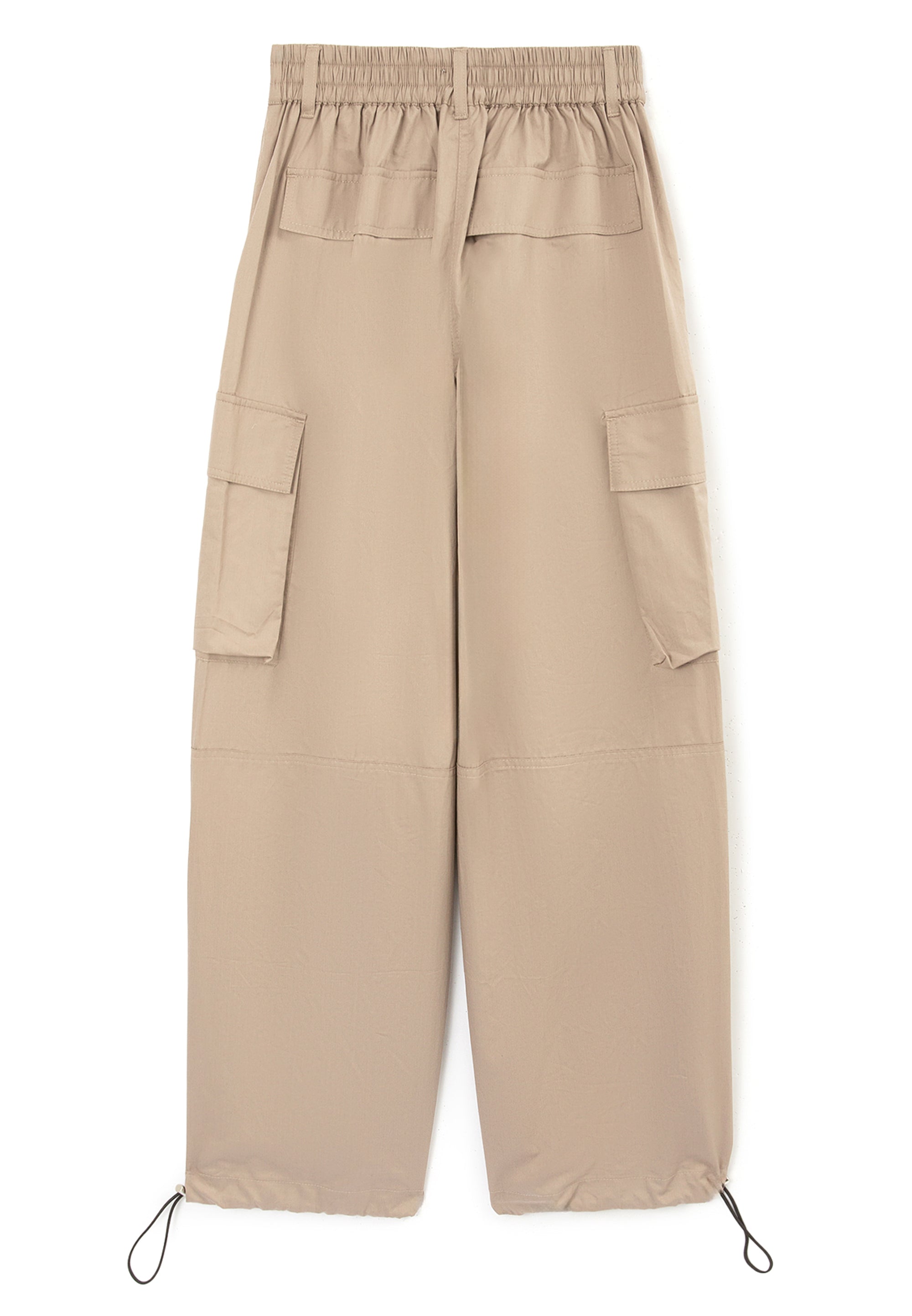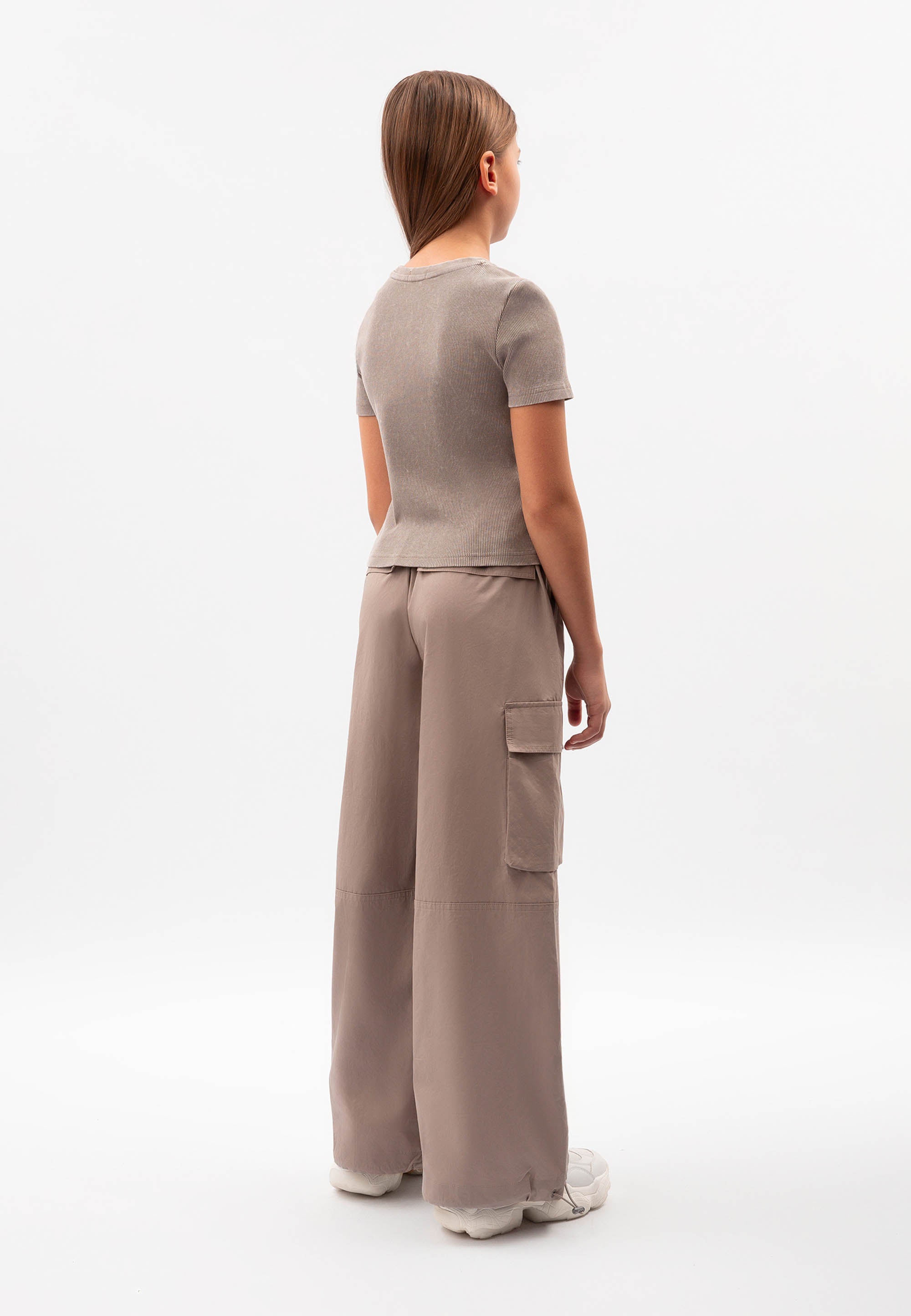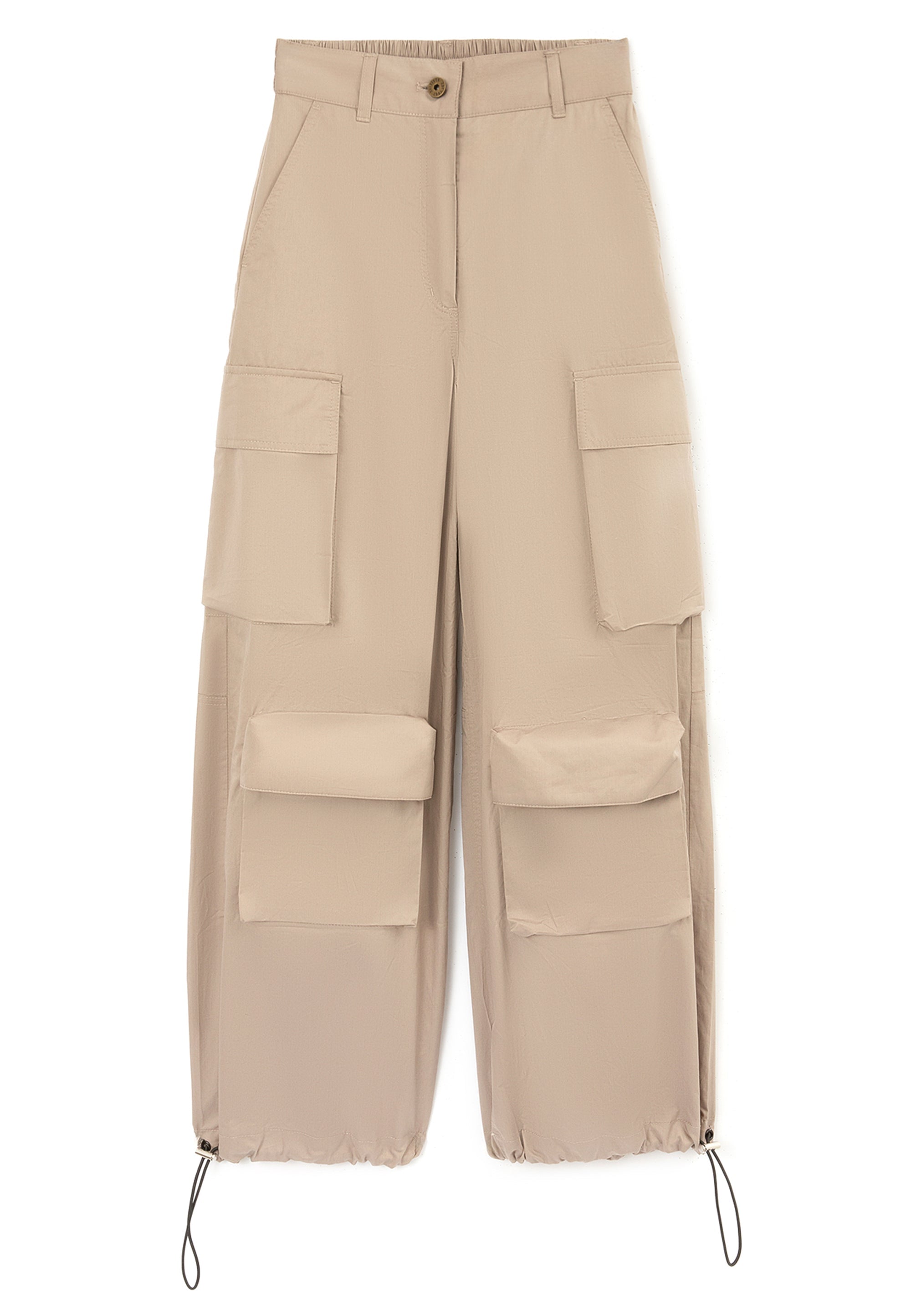 Текстилните панталони с карго джобове са отражение на комфорта, свободата и непринудеността на стрийтстайла! Изработени от гладък памучен сатен, те отлично държат форма, приятни са при допир и са лесни за поддръжка. Четирите обемни джоба, както и удобните скосени джобове в предната част, правят панталоните модерни и функционални — любими на напредналата младеж, почитателките на активния начин на живот и ценителите на свободата на себеизразяване. Особеност на модела е възможността да се регулира формата на крачолите благодарение на връзките в долната част. Чрез затягане на ластиците със стопери, панталоните могат да придобият форма на джогъри, което е много актуално в дъждовен ден, или чрез разхлабването им, да станат свободни с леко разширение надолу. Във всеки случай те ще изглеждат стилно и модерно, придавайки на визията динамика и острота. Панталоните се закопчават с цип и копче.