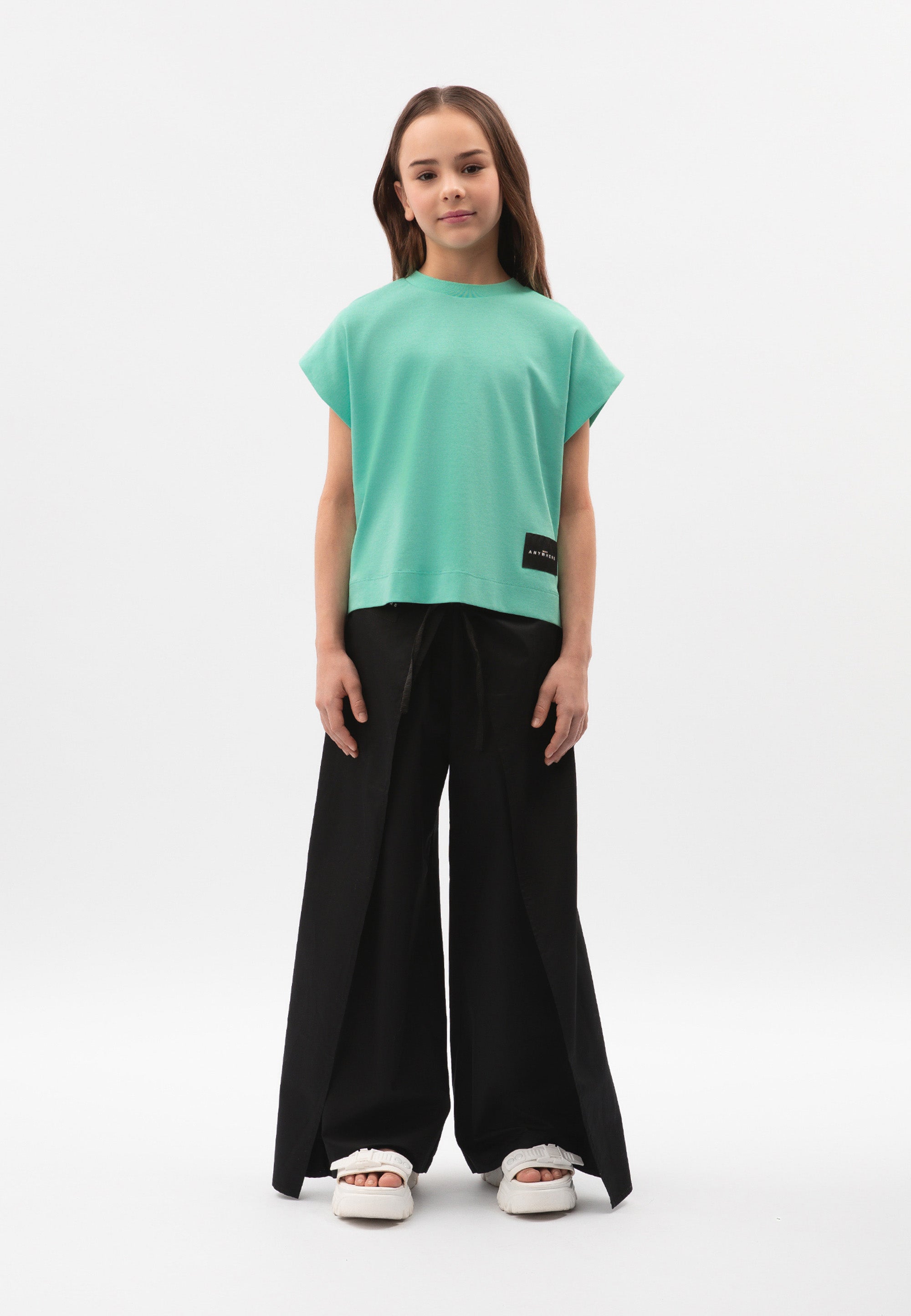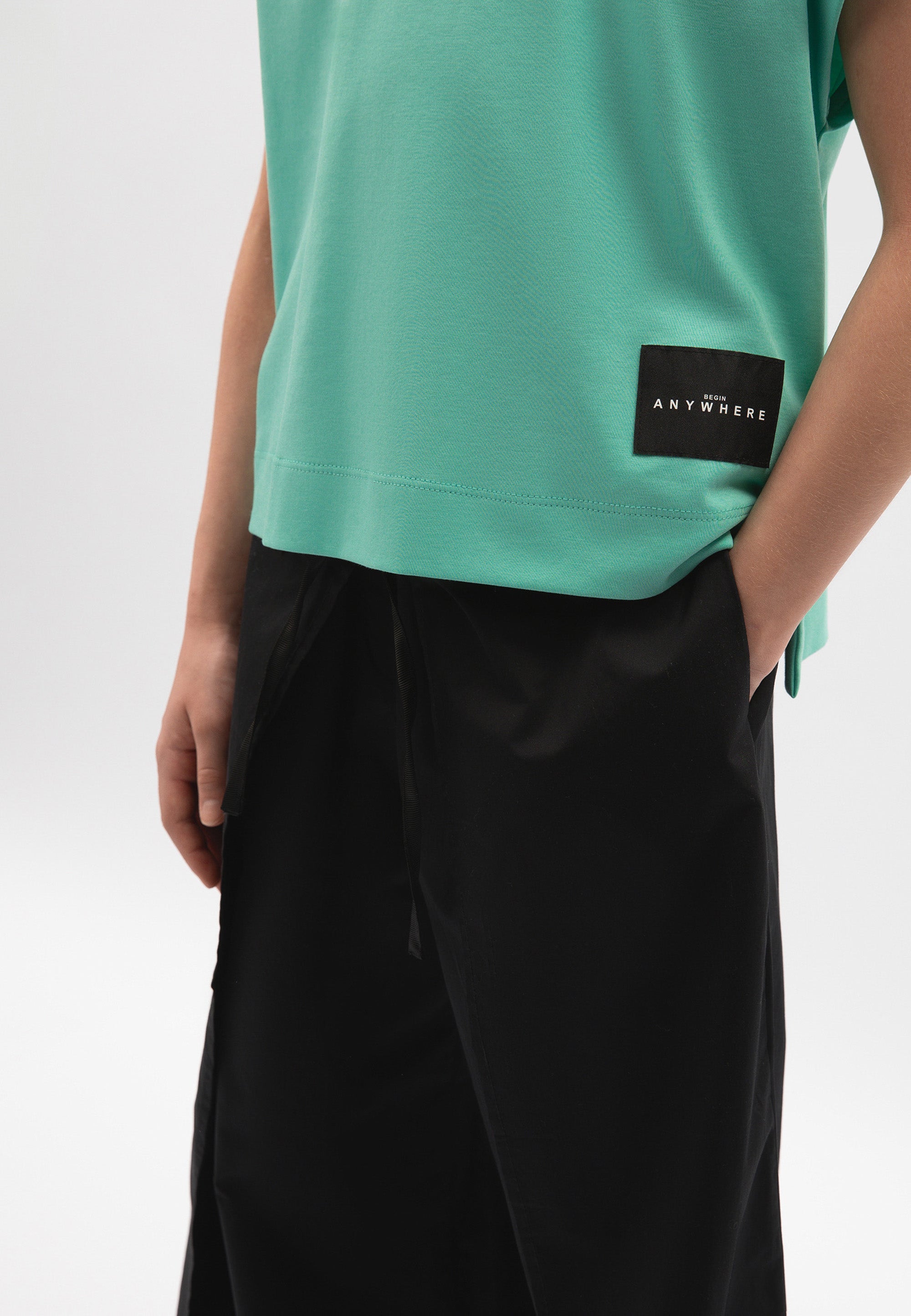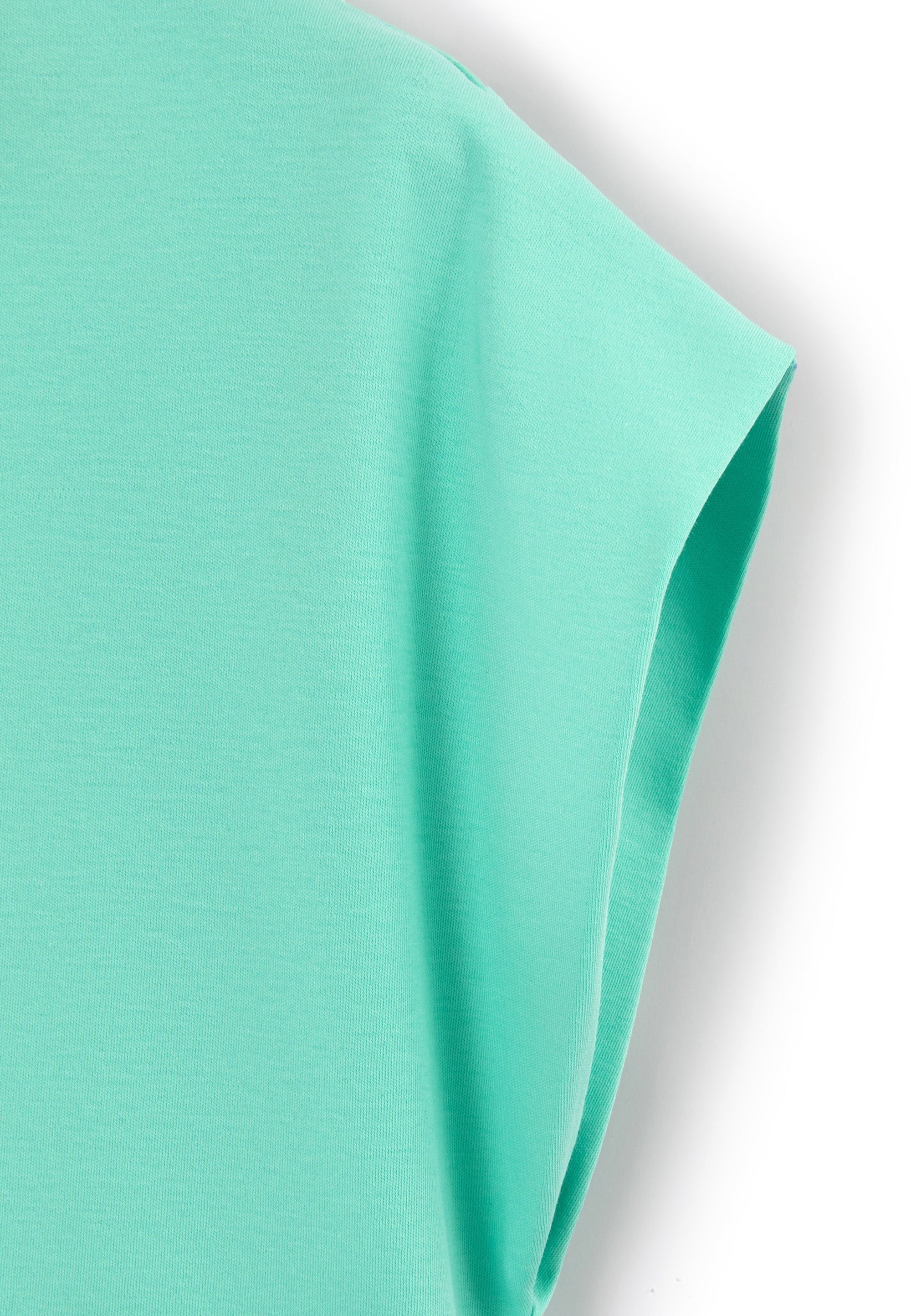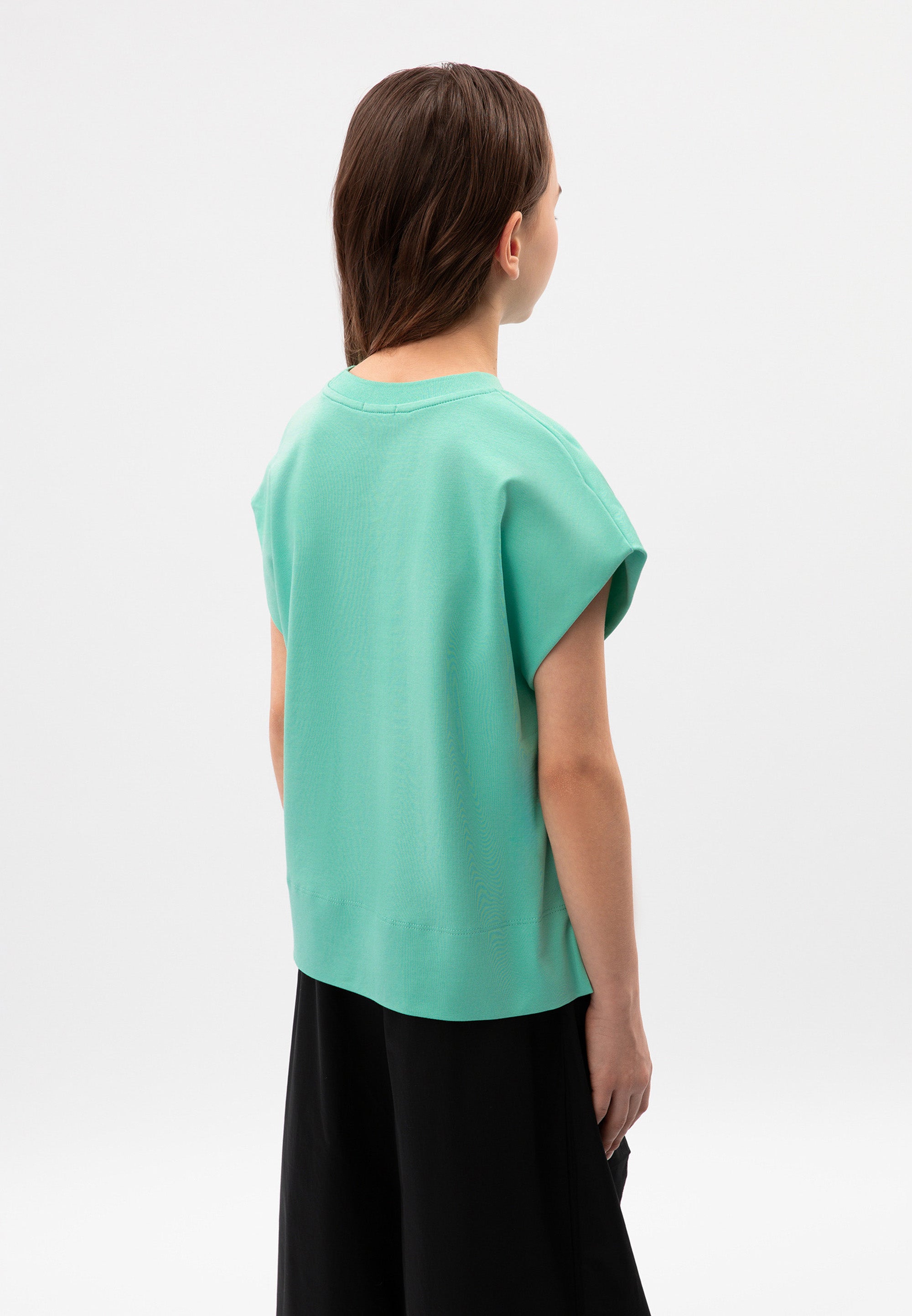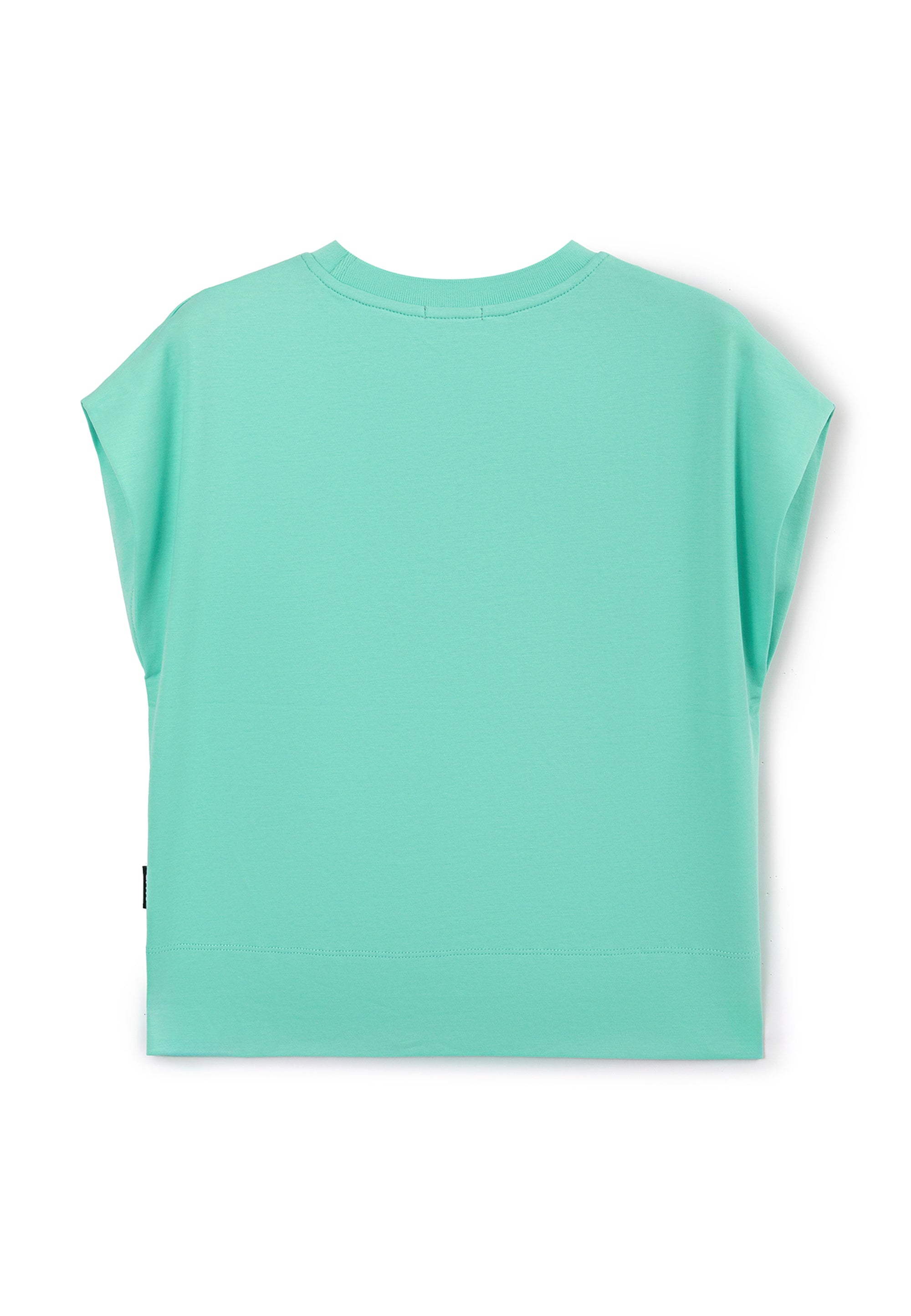 Лаконичната тениска в актуален цвят мента трябва да бъде добавена в списъка със задължителни неща (must-have). Свободната тениска с цялостно изкроени ръкави и удължен гръб ще се впише идеално в лежерните визии за разходки, пътешествия и активен отдих. Тениската е изработена от мерсеризирано памучно трико интерлок, притежаващо гладка копринена повърхност. В дизайна на модела е използвана черна нашивка с надписи.
