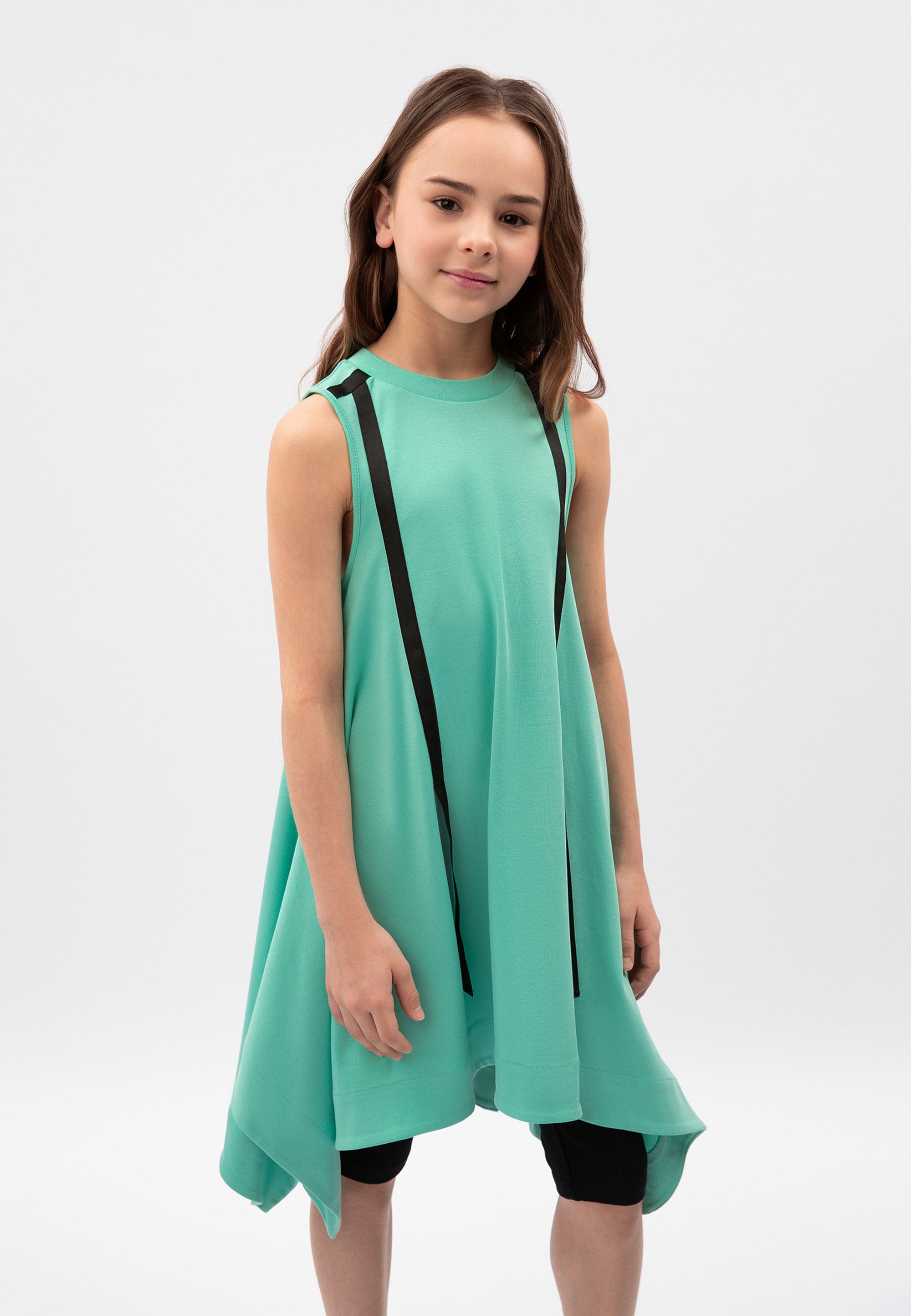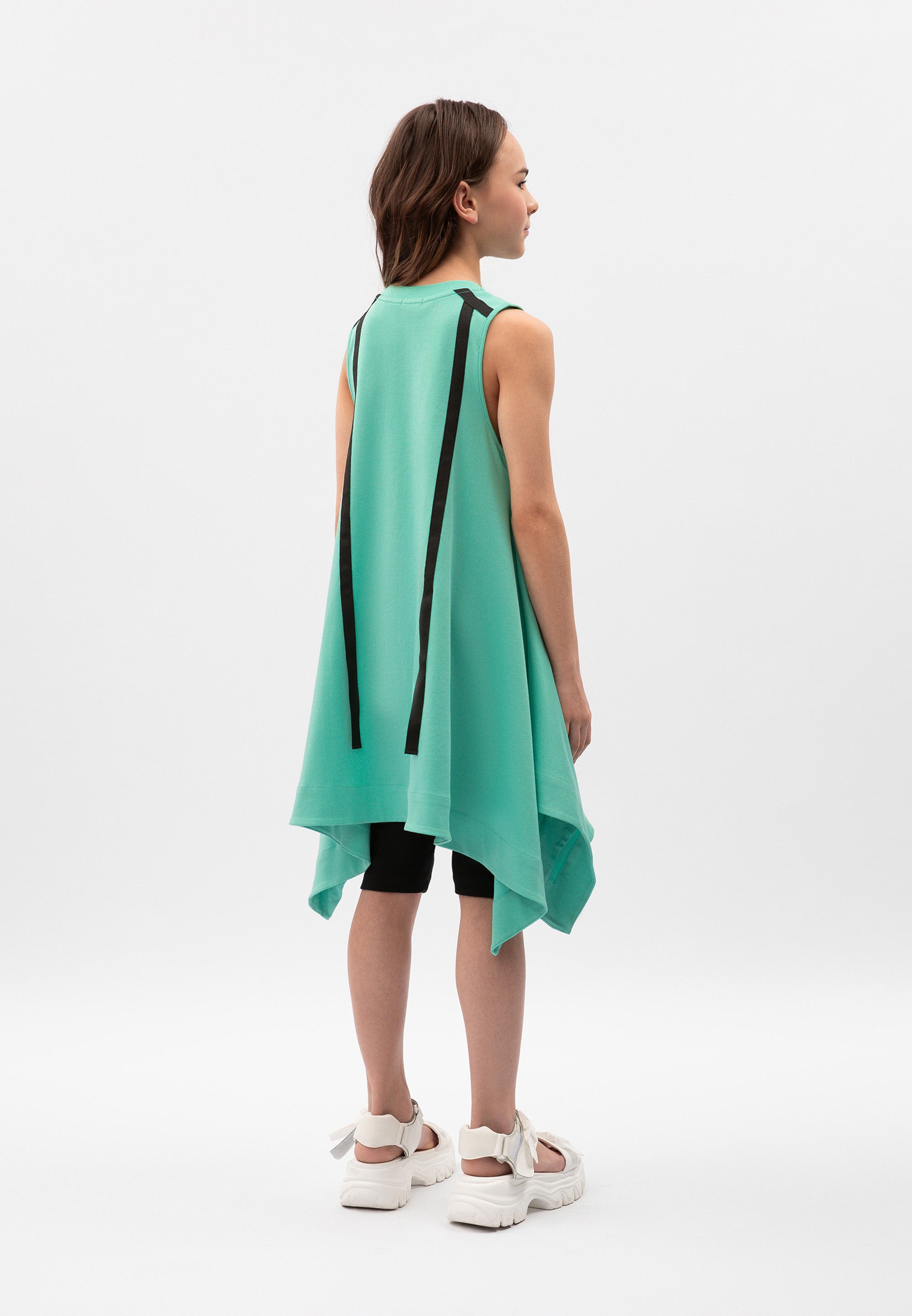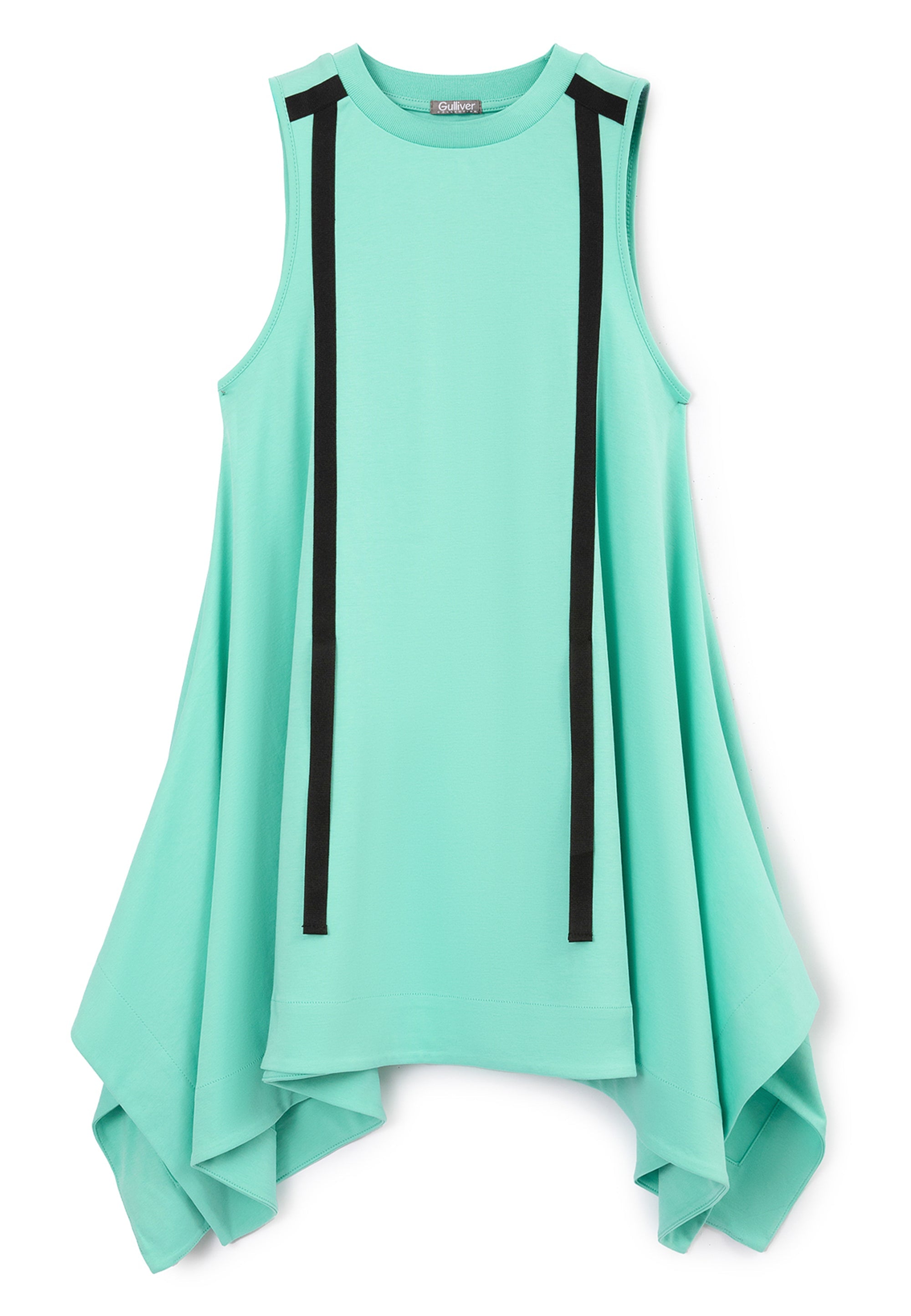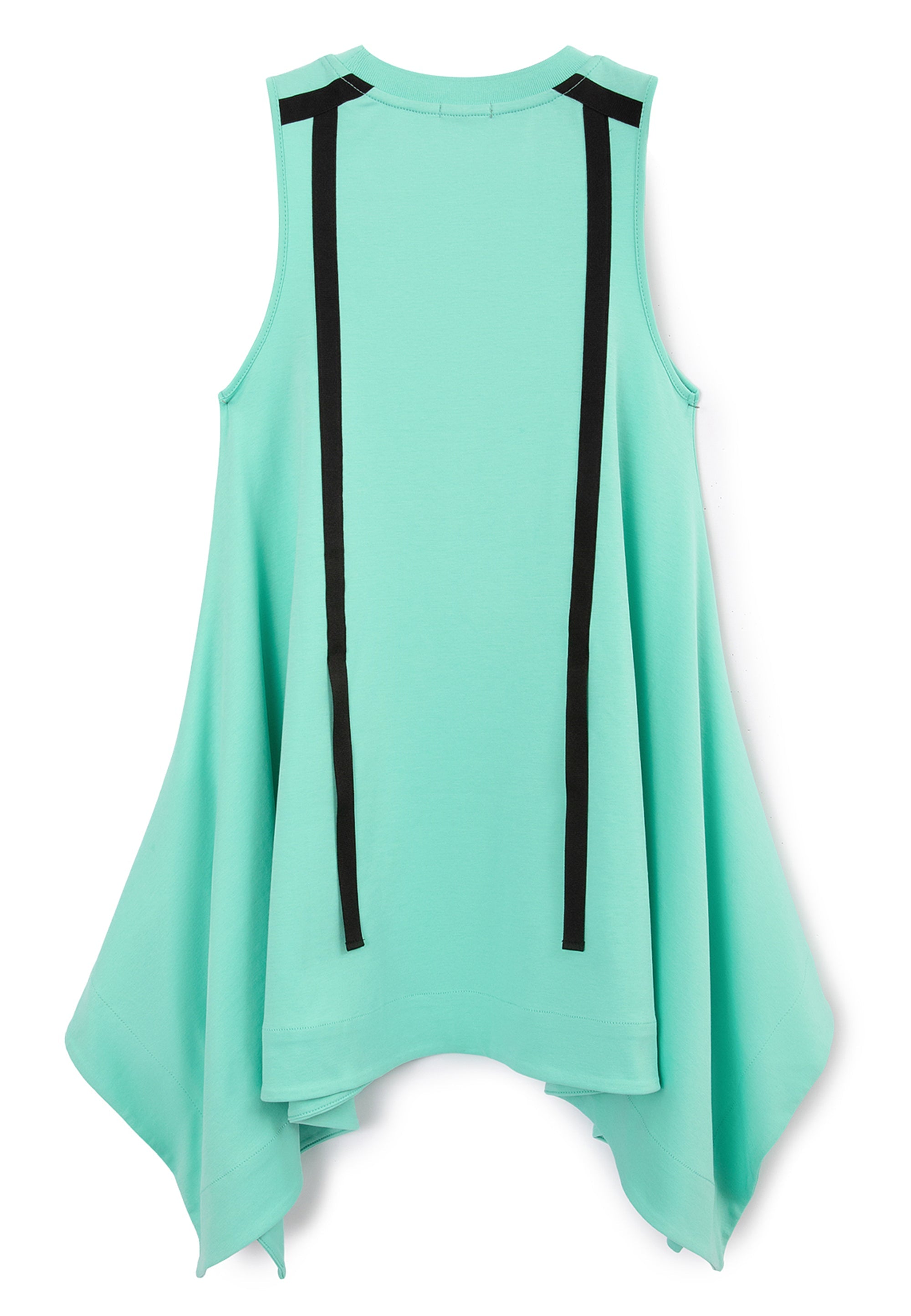 Роклята с А-образен силует е изработена от мерсеризирано памучно трико с гладка копринена повърхност. Дизайнът на модела е изграден върху модерната асиметрична кройка (тип кърпа), формираща неравна долна линия, и оригинални детайли. Завършекът с репсови ленти придава на роклята интересен контраст, прави я графична и ѝ придава ярки черти в спортен стил. Лентите падат свободно, създавайки динамика при движение.