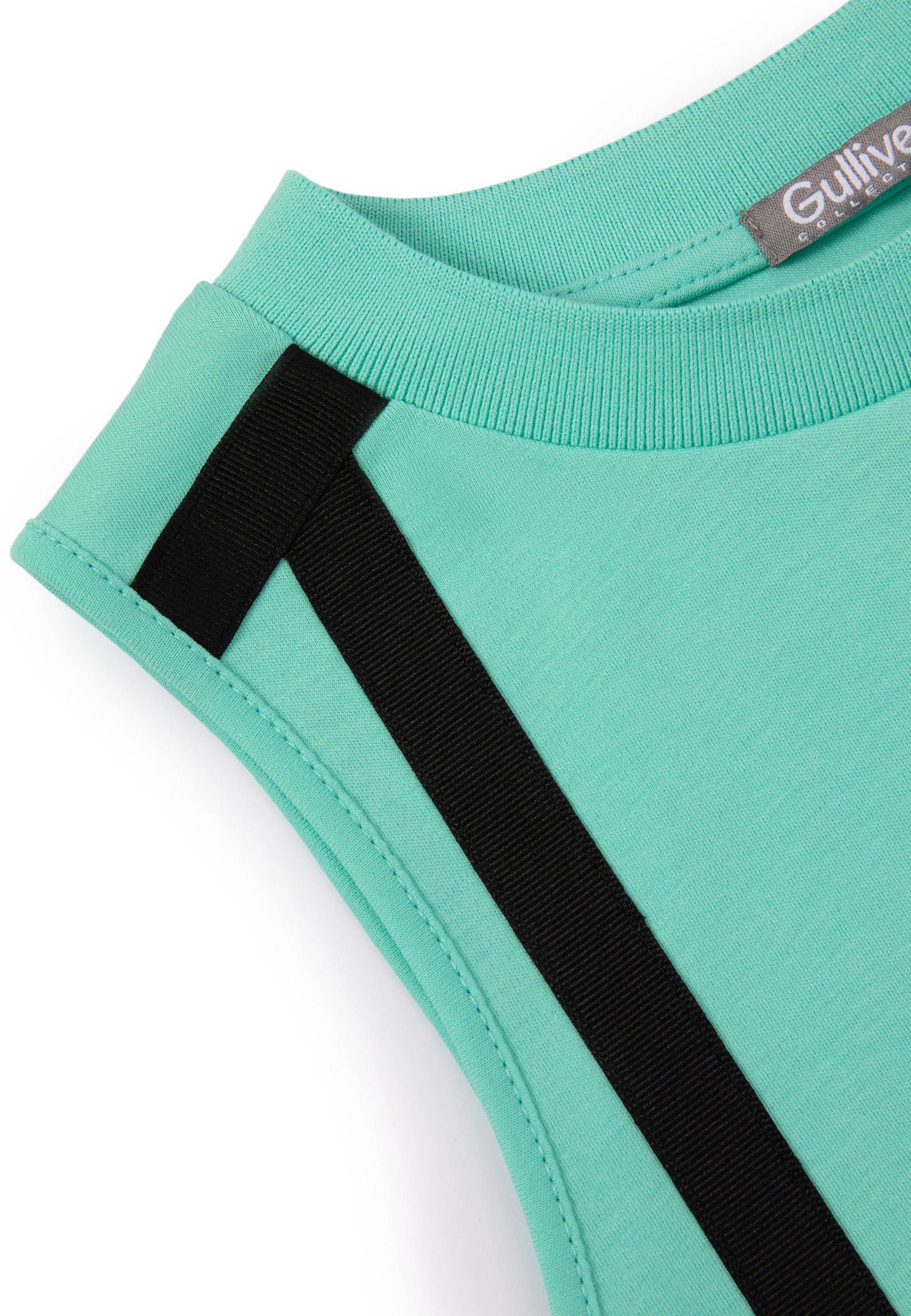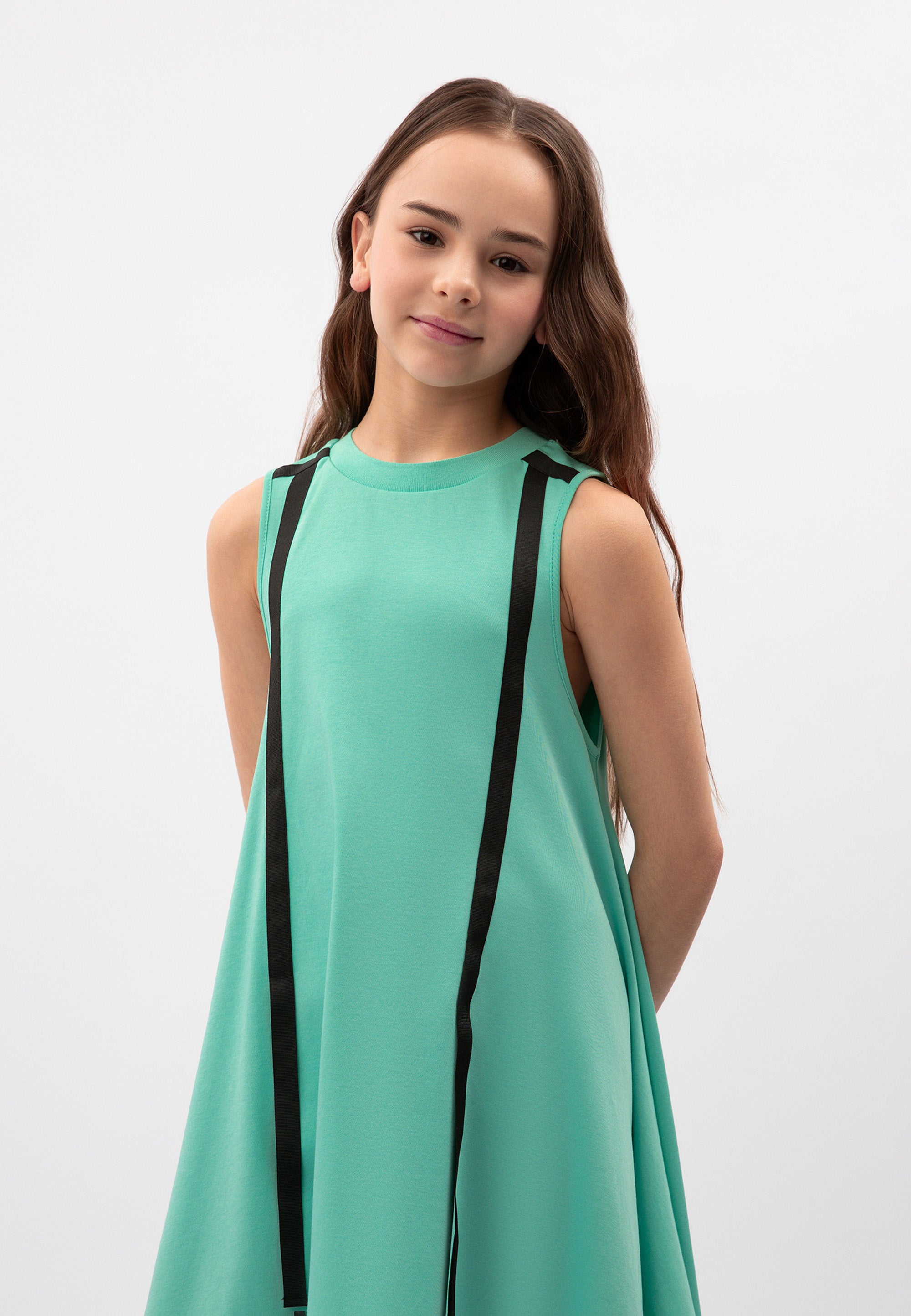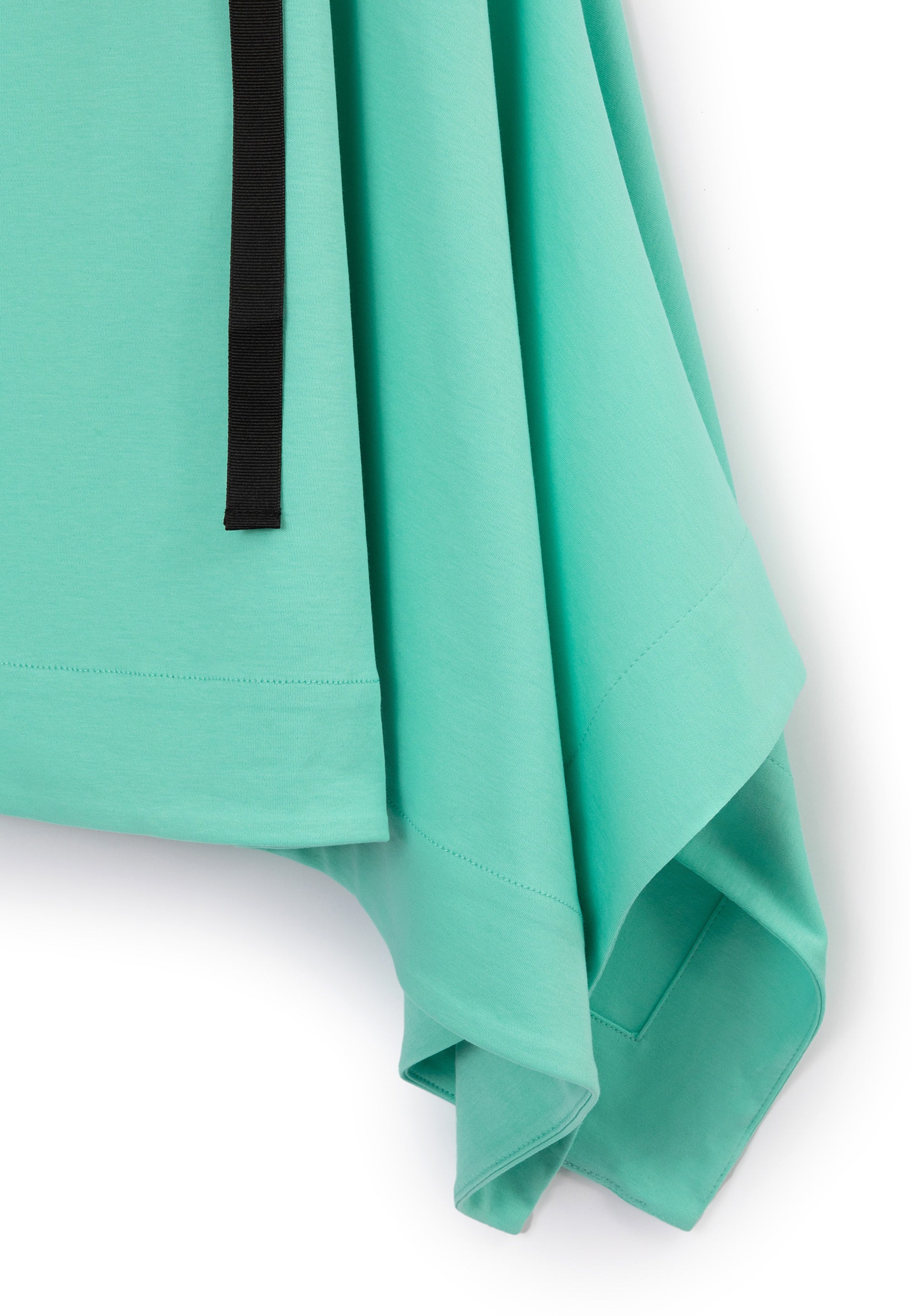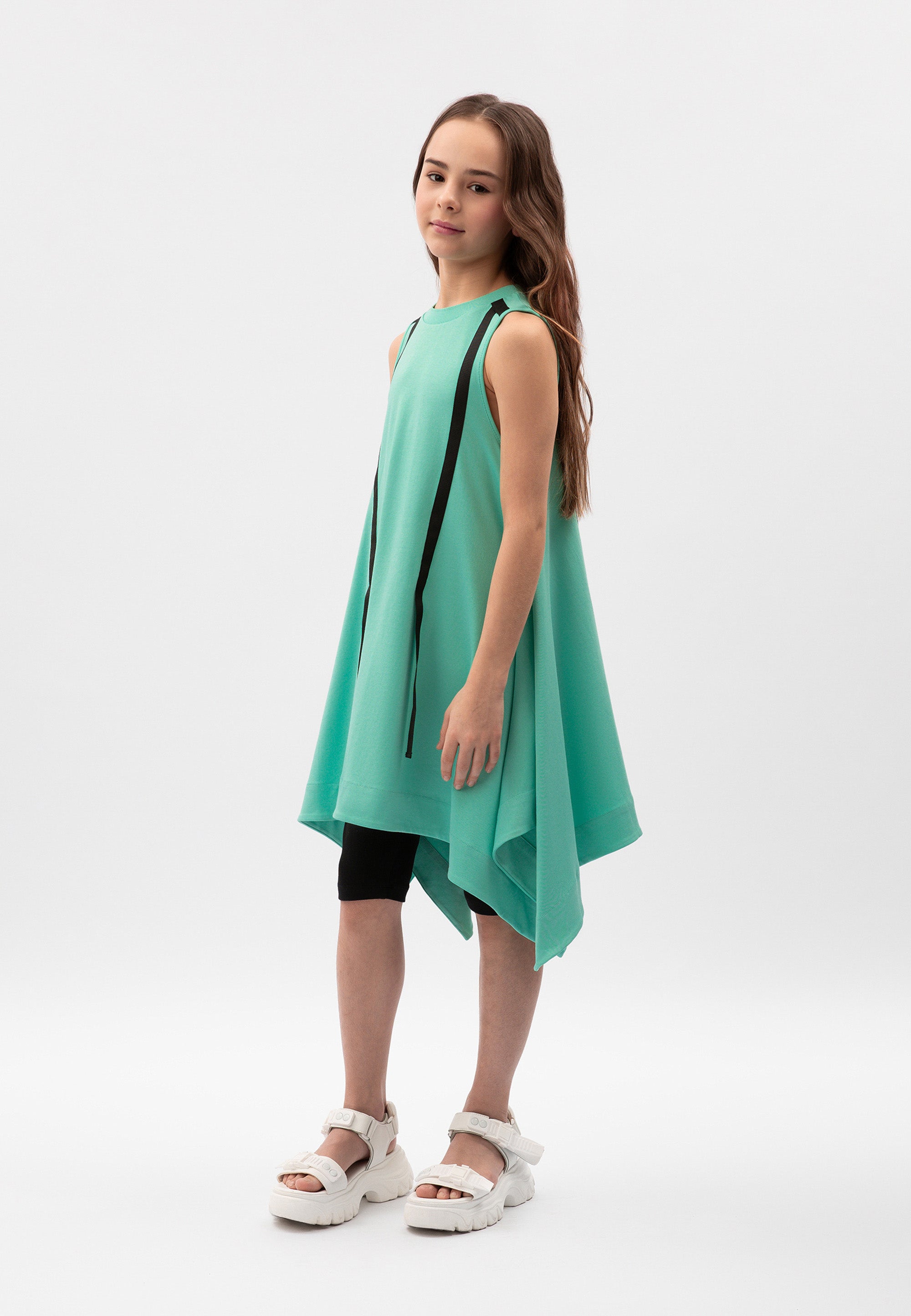 Роклята с А-образен силует е изработена от мерсеризирано памучно трико с гладка копринена повърхност. Дизайнът на модела е изграден върху модерната асиметрична кройка (тип кърпа), формираща неравна долна линия, и оригинални детайли. Завършекът с репсови ленти придава на роклята интересен контраст, прави я графична и ѝ придава ярки черти в спортен стил. Лентите падат свободно, създавайки динамика при движение.