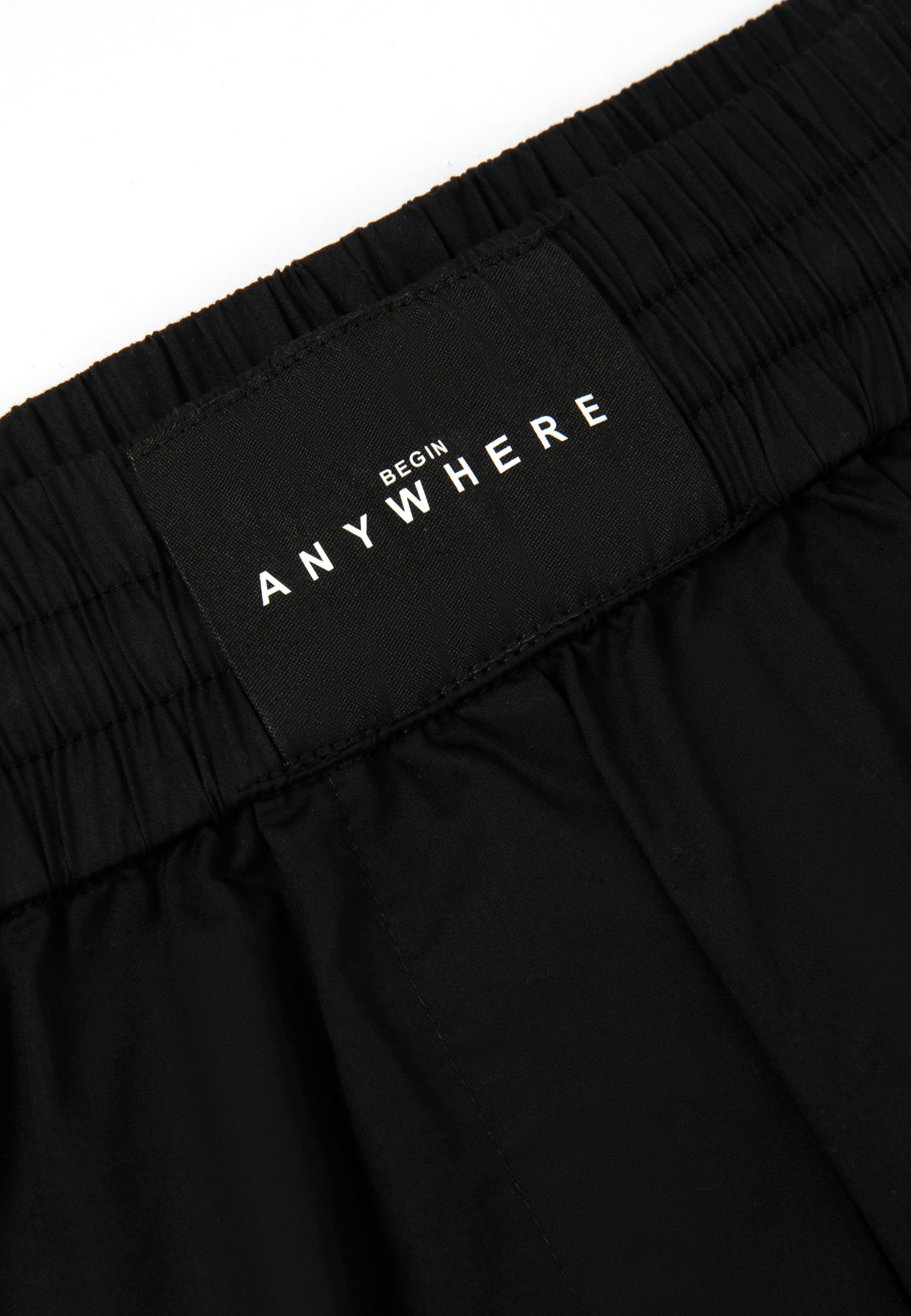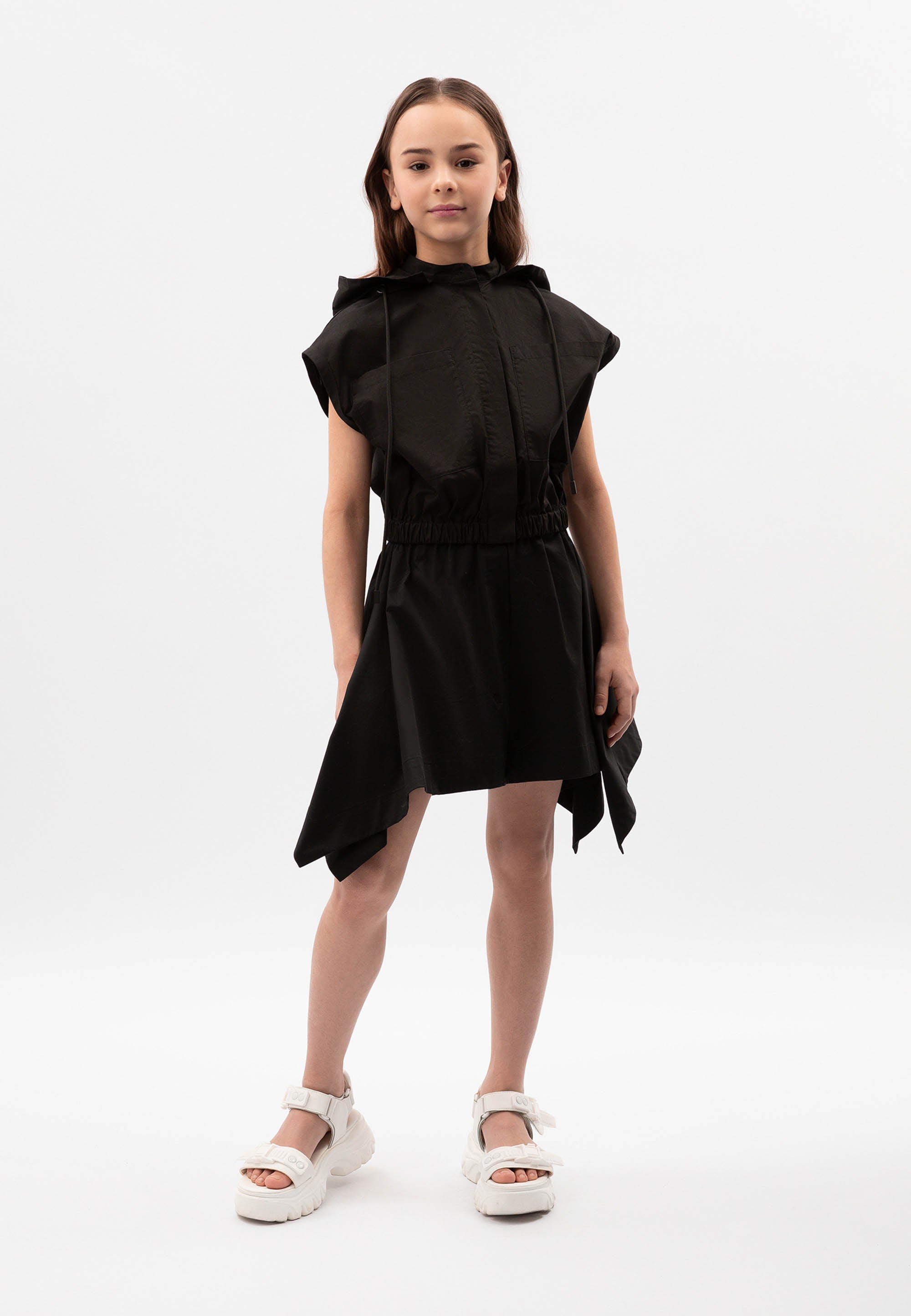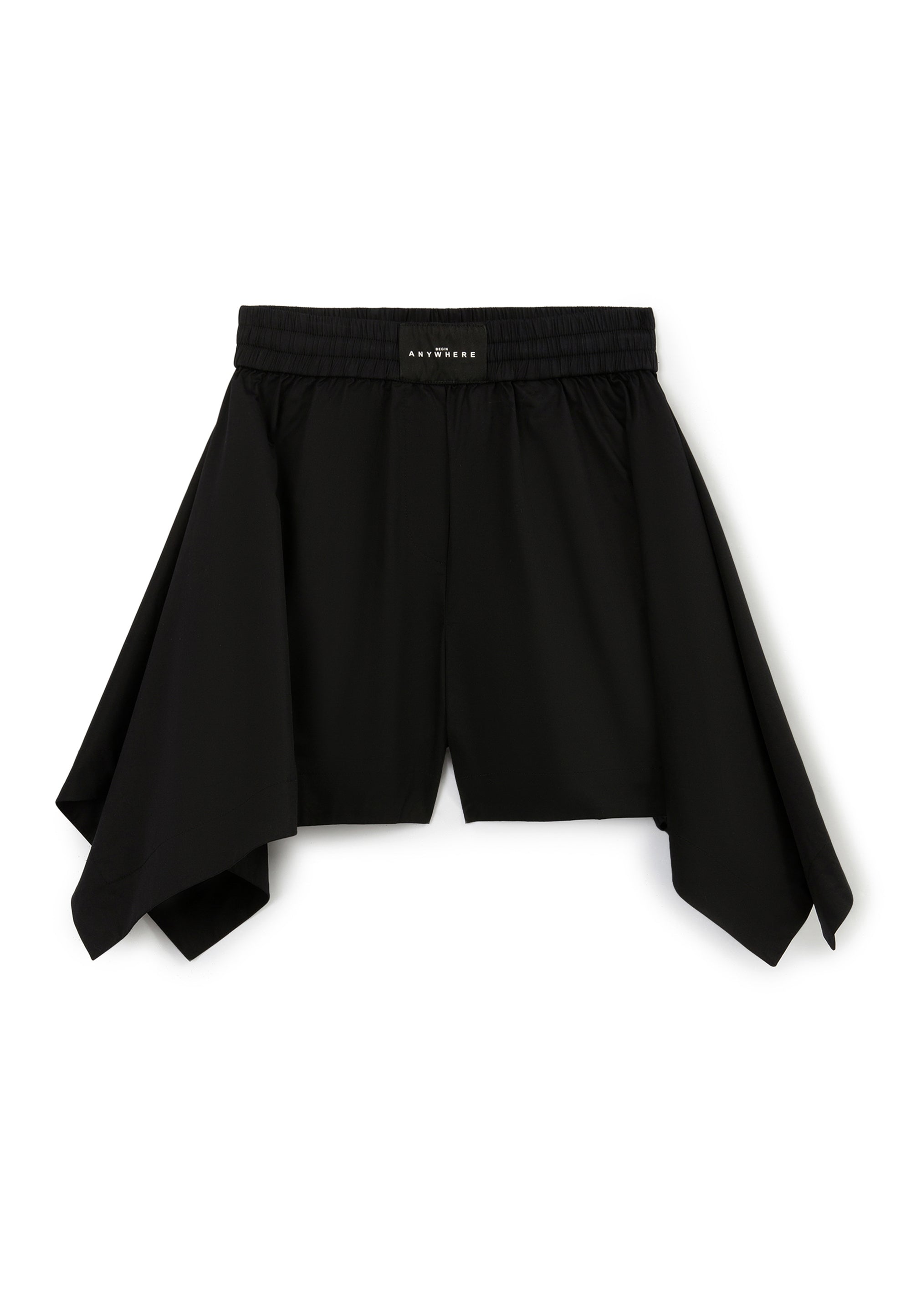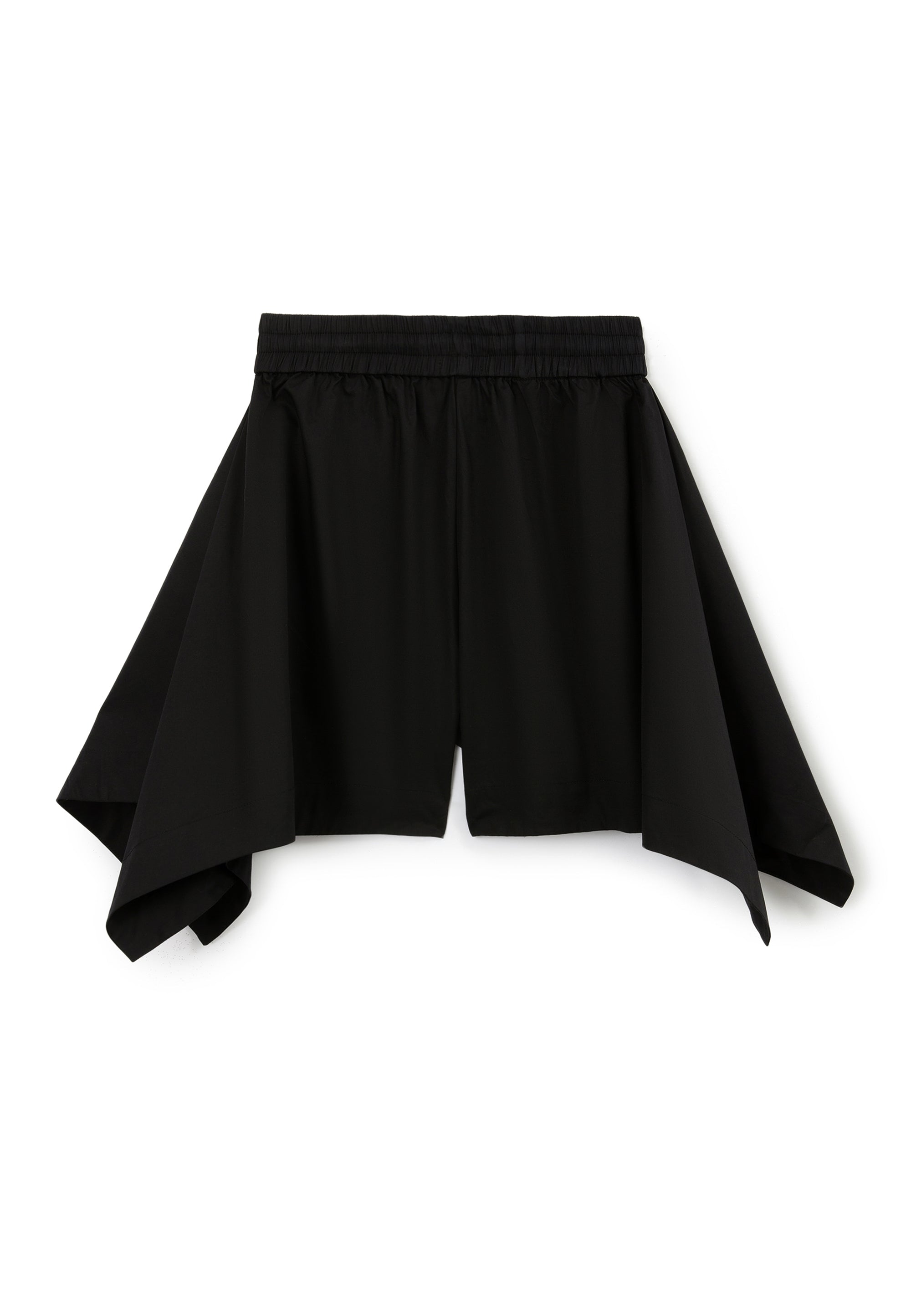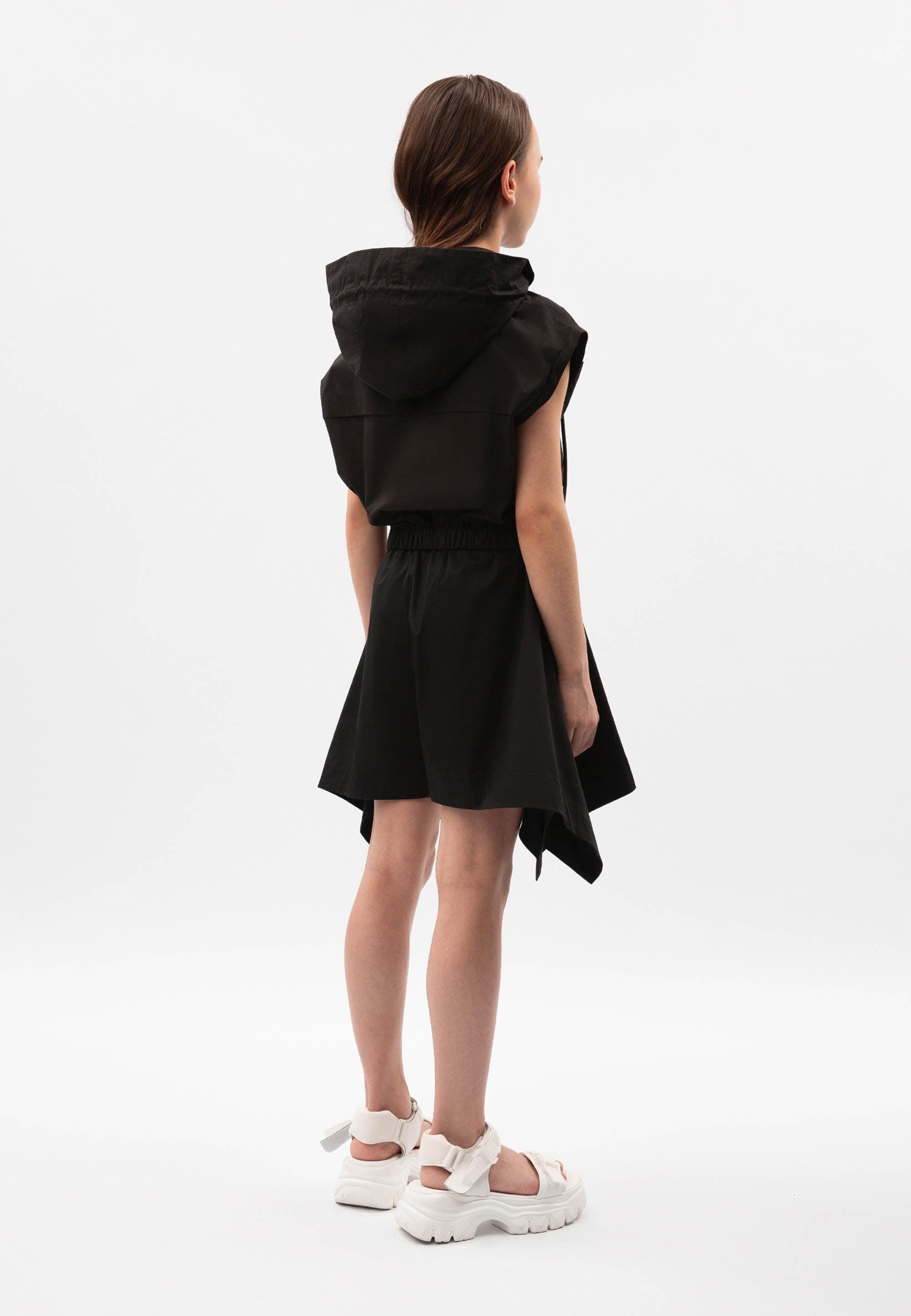 Черни свободни шорти с ластичен колан – прекрасен вариант за момичета тийнейджъри, които ценят дръзкия съвременен дизайн, комфорта и свободата на себеизразяване! Изработени от лек памучен сатен, те са идеални за разходка в горещите летни дни. Нестандартната форма на модела е постигната благодарение на модерната асиметрична кройка (тип кърпа), образуваща неравна долна линия. Ширината на шортите в долната част ги прави да изглеждат като пола-панталон, като по този начин предоставят допълнителни възможности за експерименти с визията. Те изглеждат чудесно както самостоятелно, така и в съчетание с клинове тип „велосипедки“, които подсилват драйва и динамиката на спортния стил. В дизайна на модела е използвана лаконична нашивка с текстови елементи.