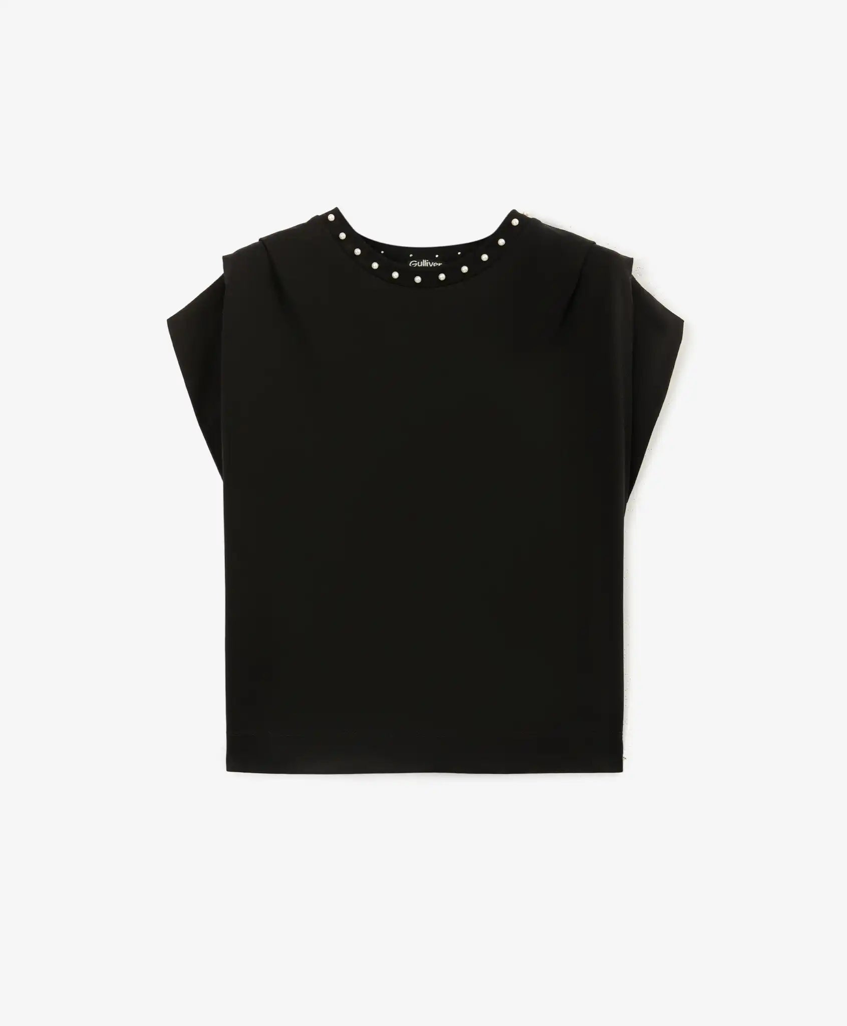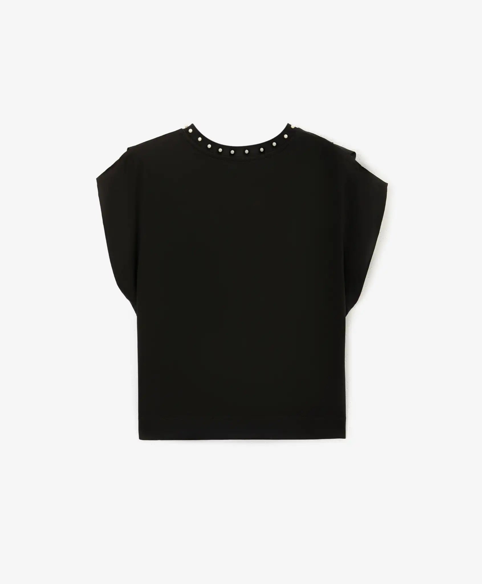 Tricoul simplu în nuanță elegantă de negru este o piesă esențială a garderobei. Modelul lejer, cu mâneci complet decupate, este confecționat din material interlock mercerizat, având o suprafață netedă și mătăsoasă. Este potrivit atât pentru ținute elegante, cât și pentru look-uri casual urbane. Gulerul este decorat cu perle delicate, atașate pe baza tricotată prin știfturi. Perlele adaugă o strălucire rafinată și transformă tricoul într-o piesă sofisticată și elegantă.