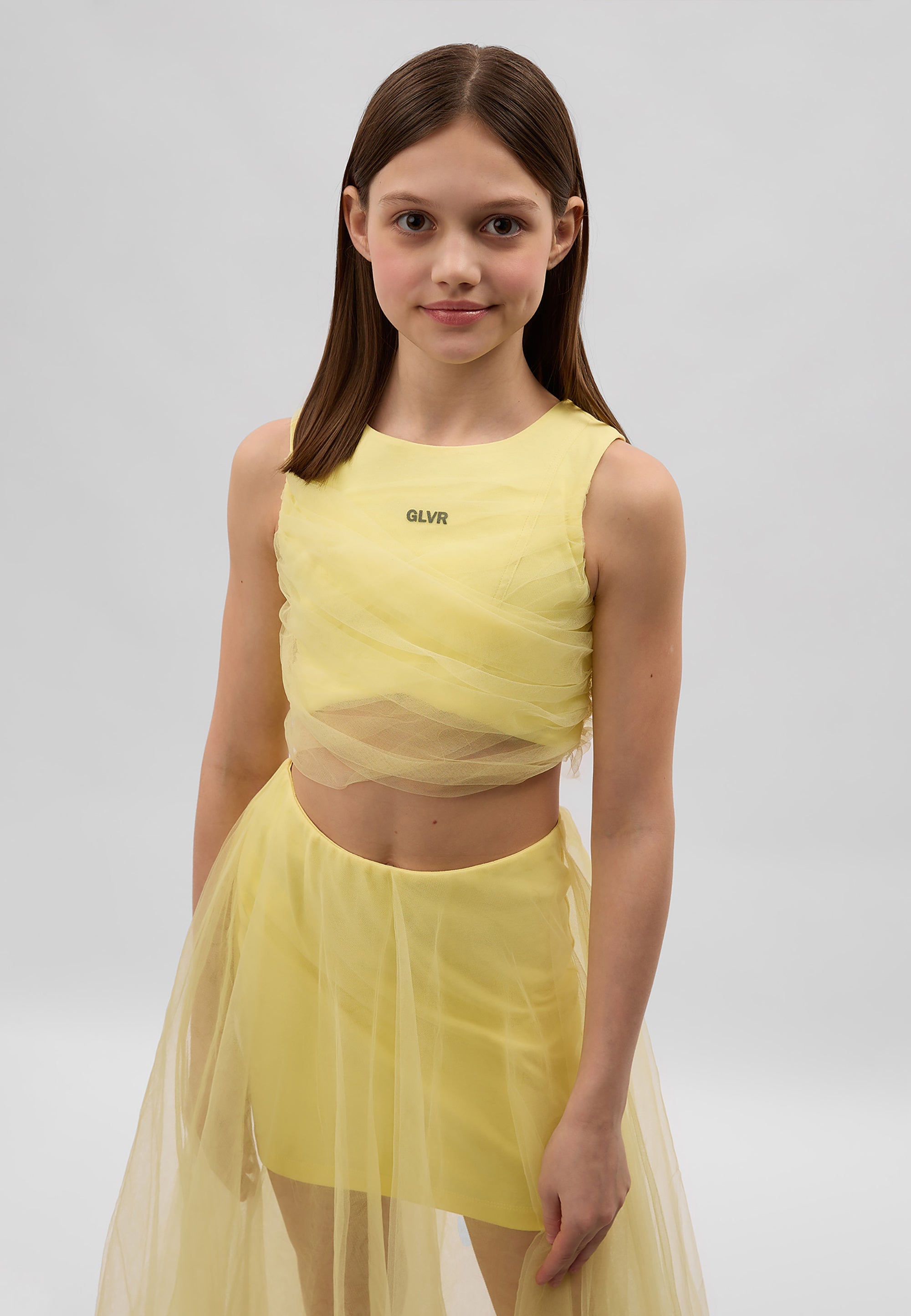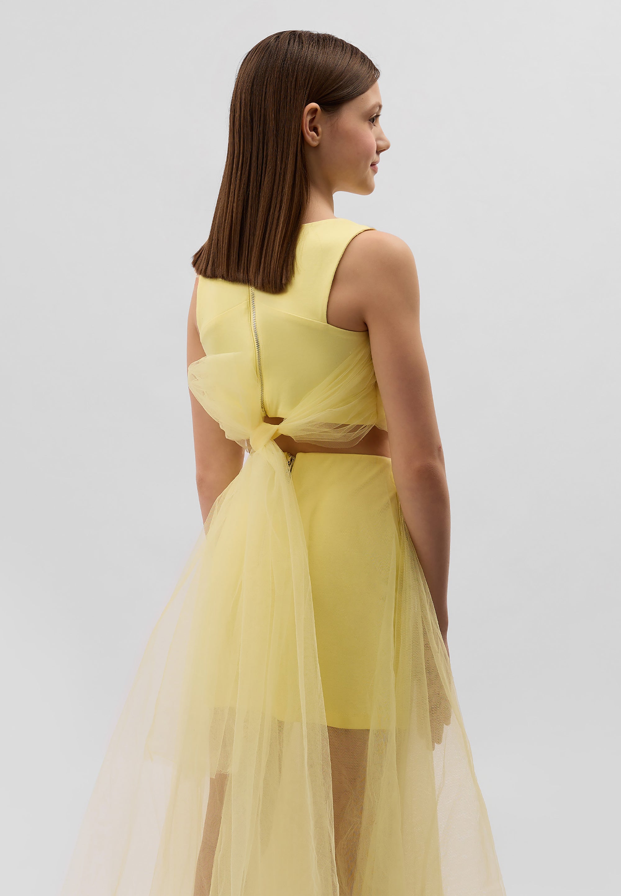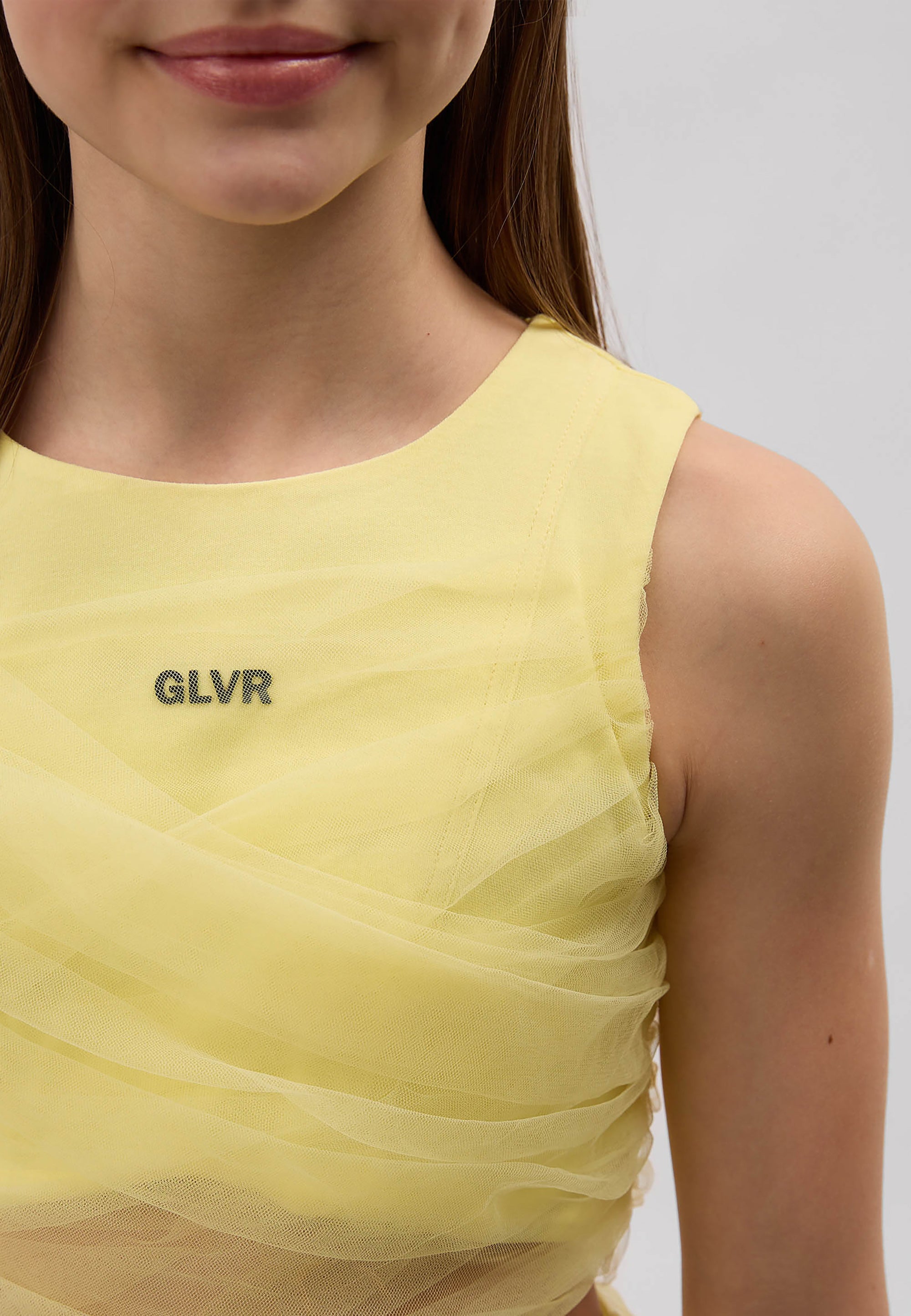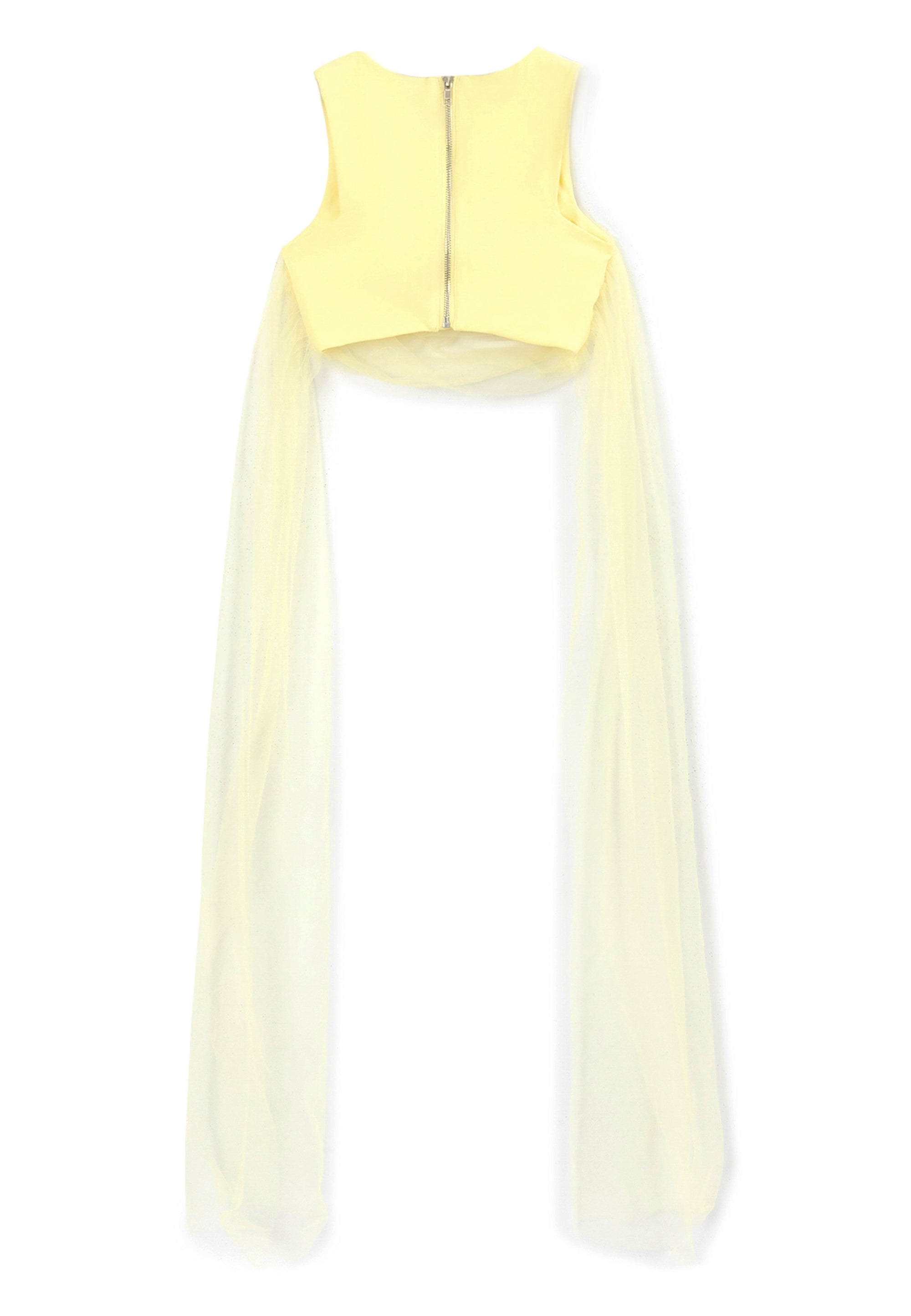 Сякаш фея от вълшебна приказка! Блузата в нежно жълт цвят със сигурност няма да остави момичето незабелязано! Скъсената блуза е изработена от мек и приятен на допир мерсеризиран интерлок. Декорацията с пищна мрежа придава на модела лекота и ефирност, правейки го официален и много женствен. Конструкцията на модела позволява оформяне на визията според настроението. Дългите ленти от мрежа могат да се увият няколко пъти около талията и да се завържат на стегнат възел или панделка, а могат да се оставят да падат свободно, създавайки красив ефект на шлейф при движение. Блузата се закопчава с цип на гърба. Моделът съставя завършен официален комплект с жълтата пола 125GPGJC6103 от същия материал или с всяка друга долна част от празничната колекция на Gulliver „Лемонграс“.