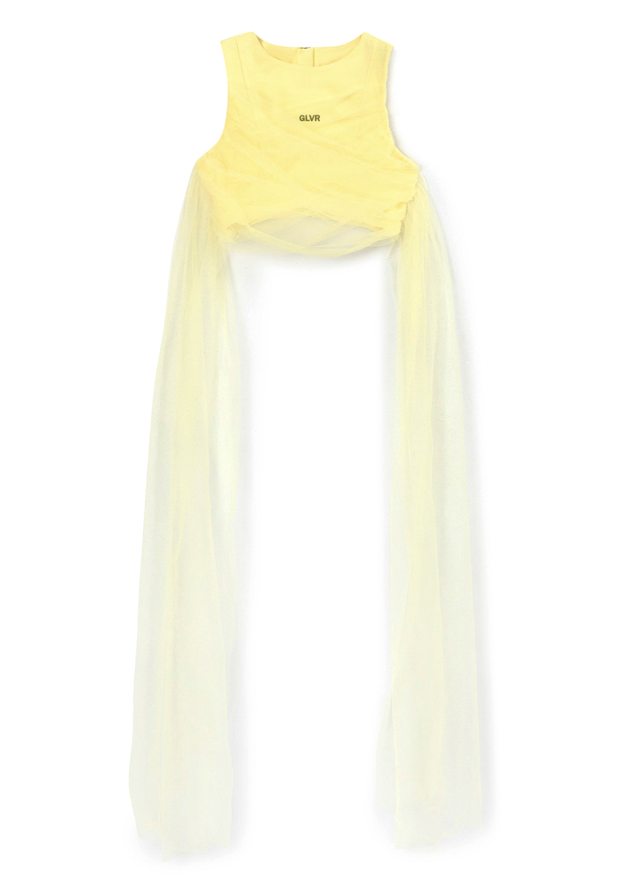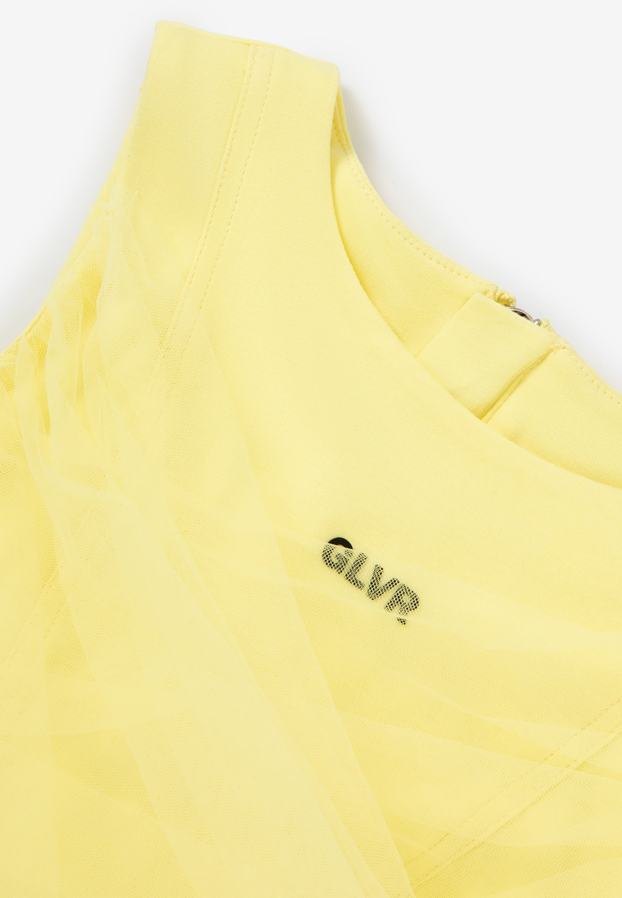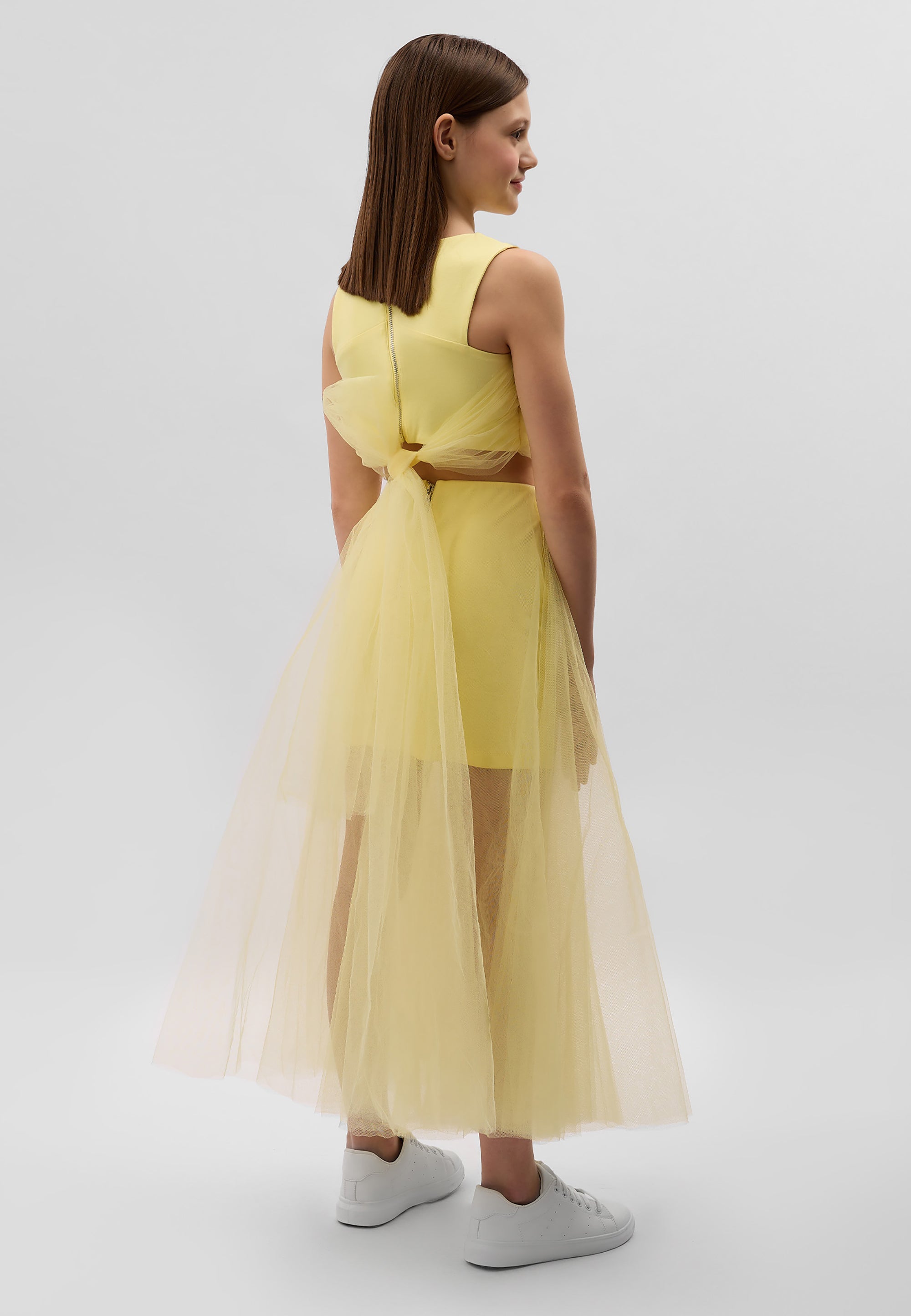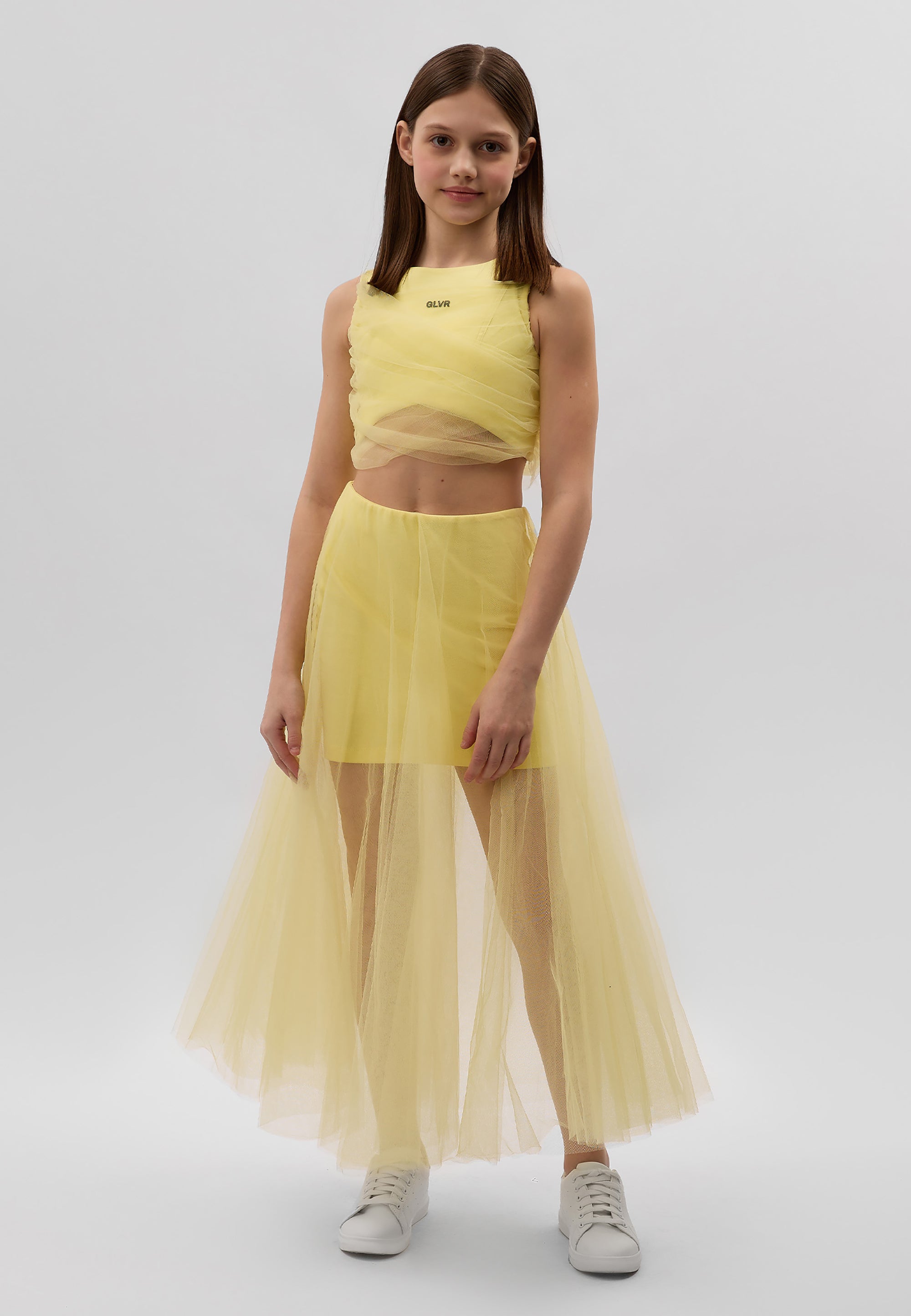 Сякаш фея от вълшебна приказка! Блузата в нежно жълт цвят със сигурност няма да остави момичето незабелязано! Скъсената блуза е изработена от мек и приятен на допир мерсеризиран интерлок. Декорацията с пищна мрежа придава на модела лекота и ефирност, правейки го официален и много женствен. Конструкцията на модела позволява оформяне на визията според настроението. Дългите ленти от мрежа могат да се увият няколко пъти около талията и да се завържат на стегнат възел или панделка, а могат да се оставят да падат свободно, създавайки красив ефект на шлейф при движение. Блузата се закопчава с цип на гърба. Моделът съставя завършен официален комплект с жълтата пола 125GPGJC6103 от същия материал или с всяка друга долна част от празничната колекция на Gulliver „Лемонграс“.