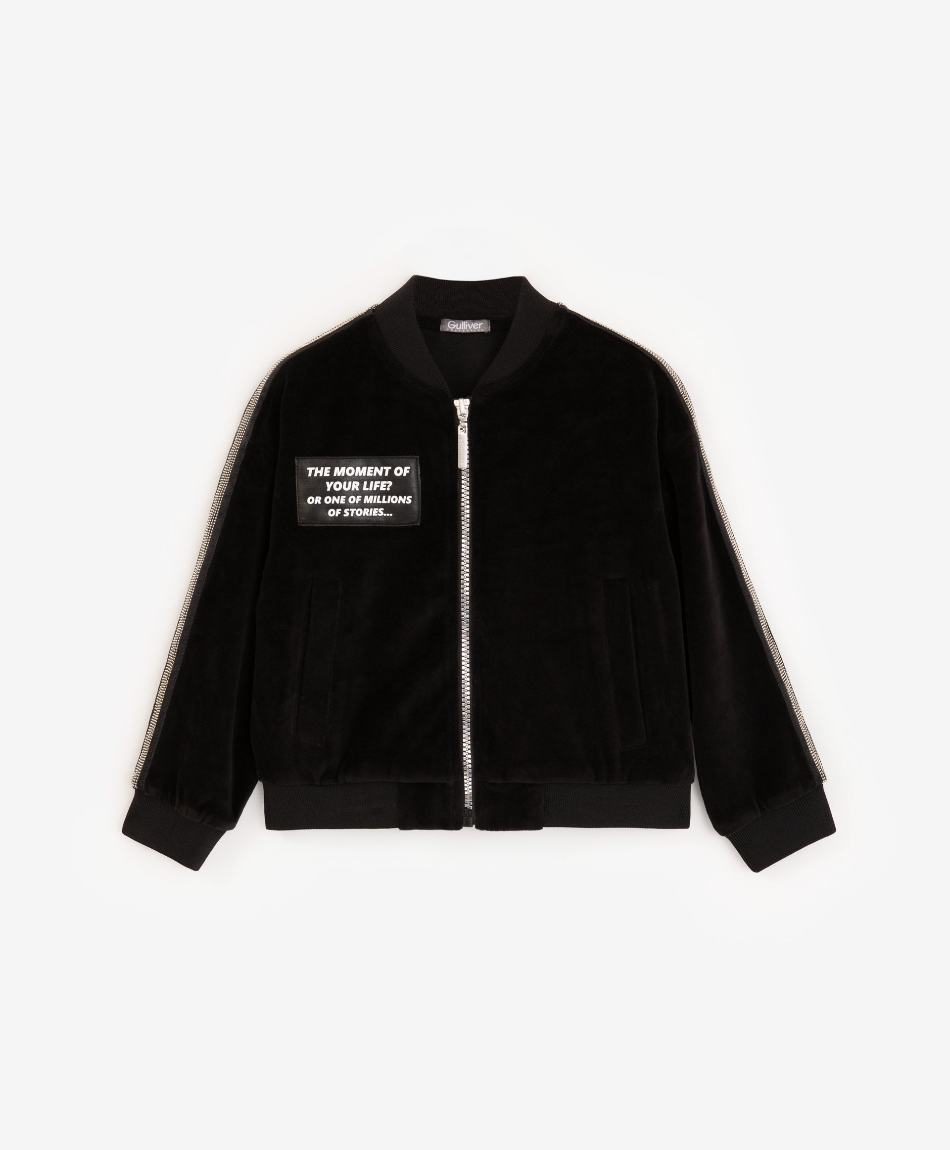 Поразяващ бомбер с овърсайз силует, изработен от кадифе, който ще се превърне в истинско бижу в детския гардероб. Стилният дизайн, изграден върху ярка и изразителна декорация – сребриста лента по ръкавите и жакардова нашивка отпред – прави модела интересен и екстравагантен.