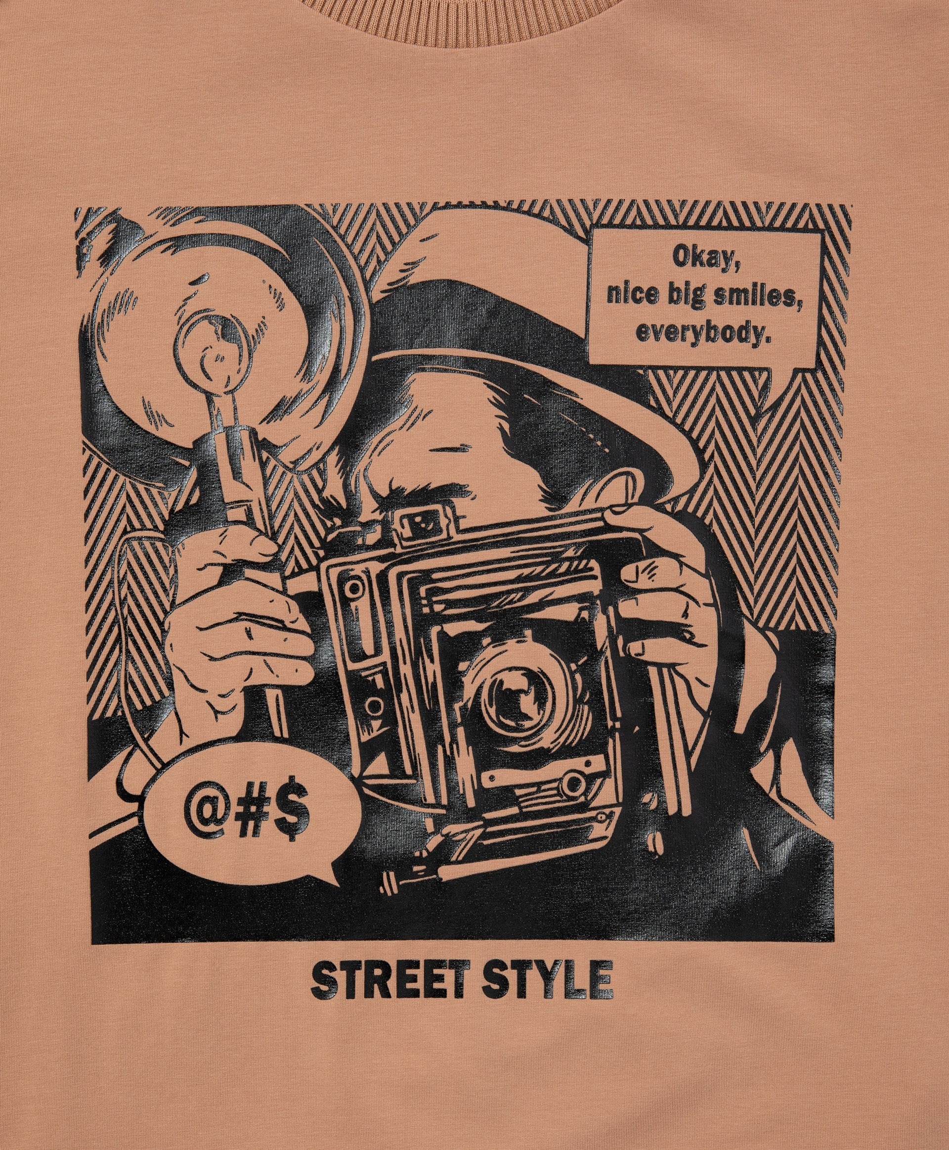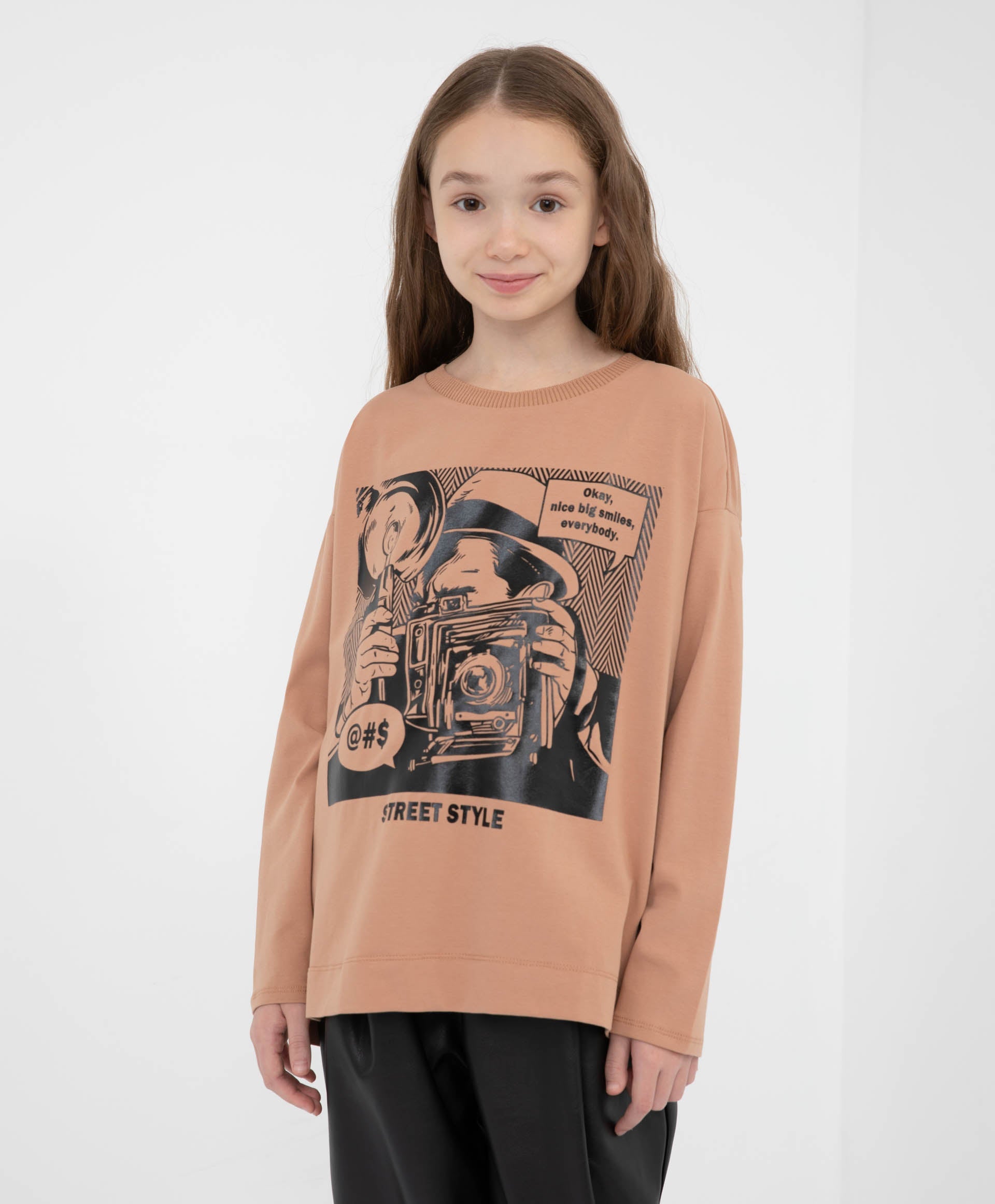 Тениска със силует овърсайз и удължен гръб – задължителен елемент (must-have) в гардероба на момичето. Яката от плетено рипс трико и стилният декор отпред, изпълнен като принт с имитация на метални кристали, правят тениската оригинална и помагат за оформянето на интересни и модерни визии.