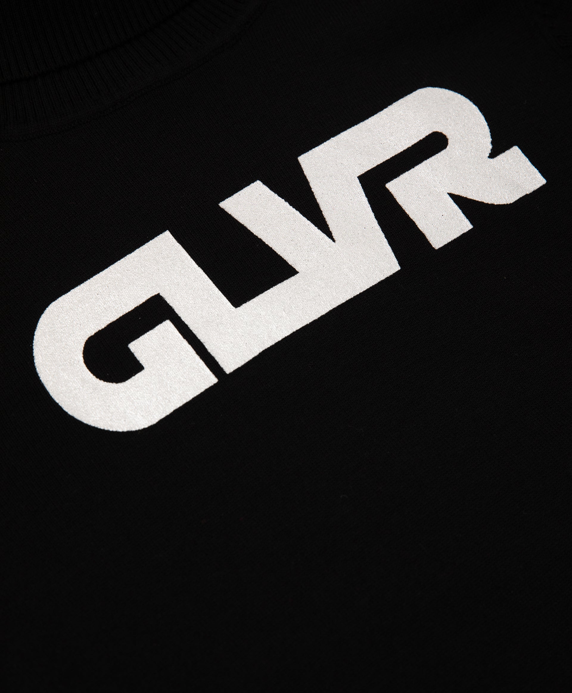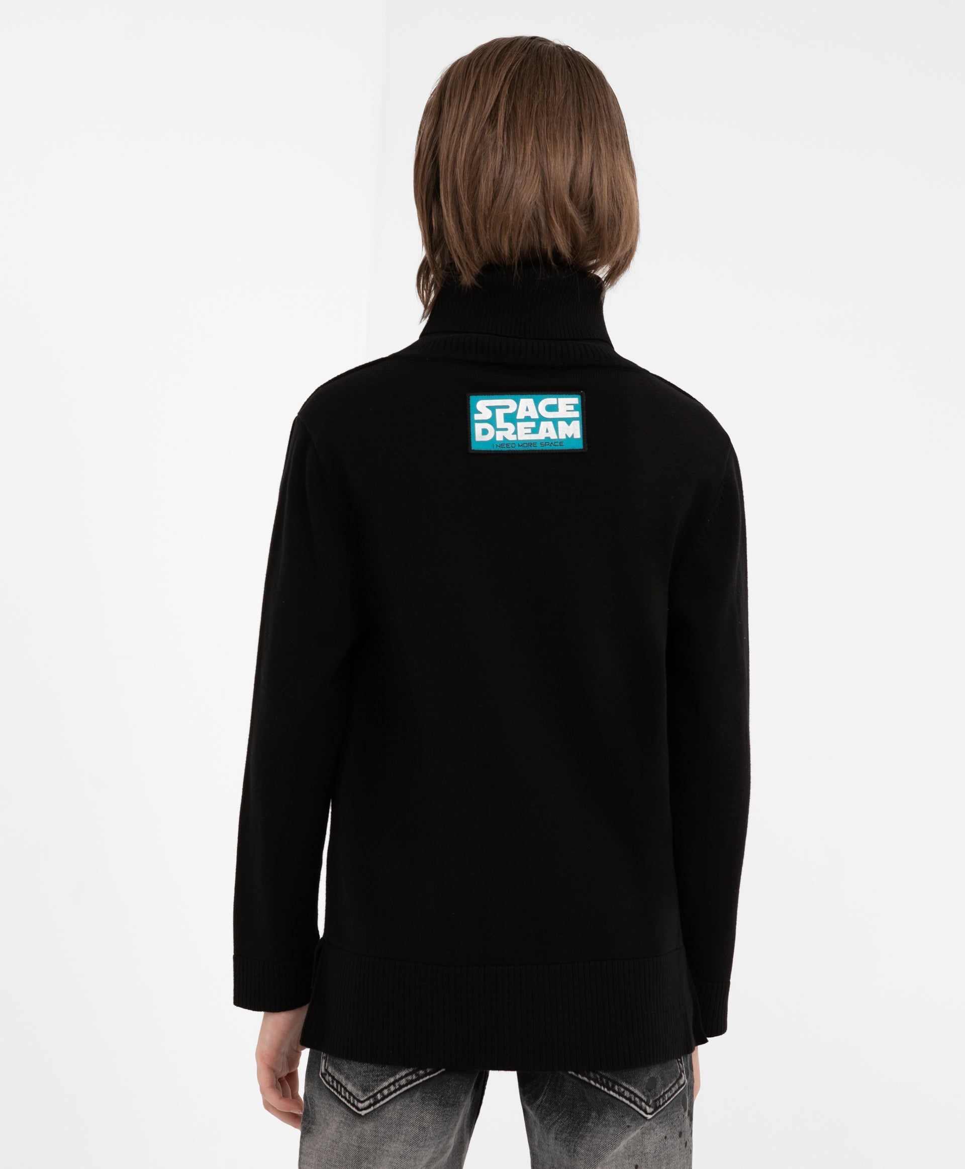 Черна плетена поло-блуза със свободен силует, удължена линия на гърба и цепки – модерен, строг и елегантен вариант. В дизайна и оформлението на модела е използван похватът на лицевите шевове. Големият сребрист принт, изпълнен с фолио техника, подчертава цялостния лаконичен образ на тийнейджъра.