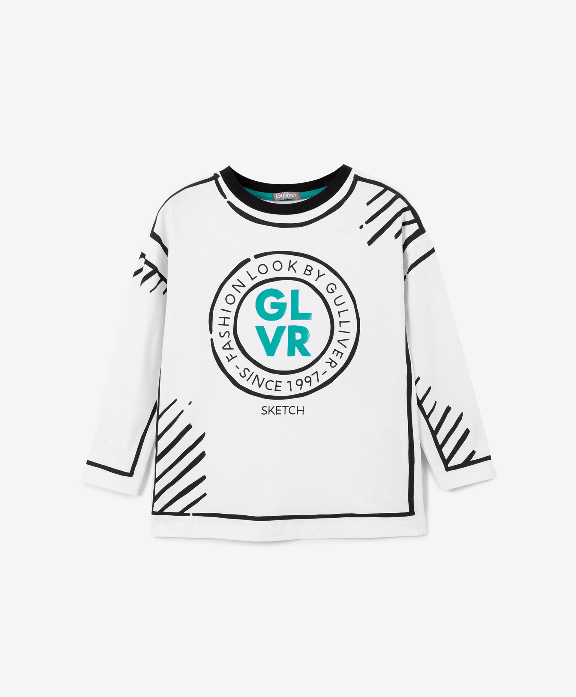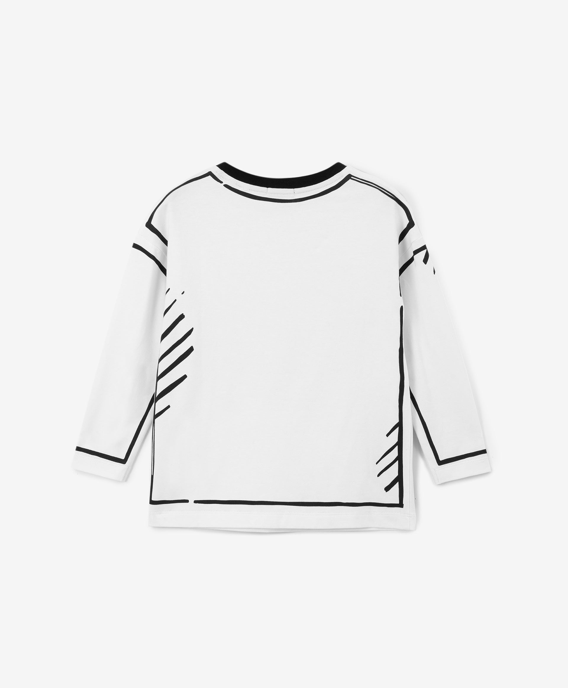Бяла тениска с дълъг ръкав, свободна обемна форма и паднало рамо – стилен, практичен и комфортен вариант! Интересният дизайн на модела, изграден върху ярка и самобитна графика, имитираща ръчна рисунка, превръща тениската в задължителен атрибут на модерната визия. В оформлението са използвани матови и гланцови принтове с надписи.