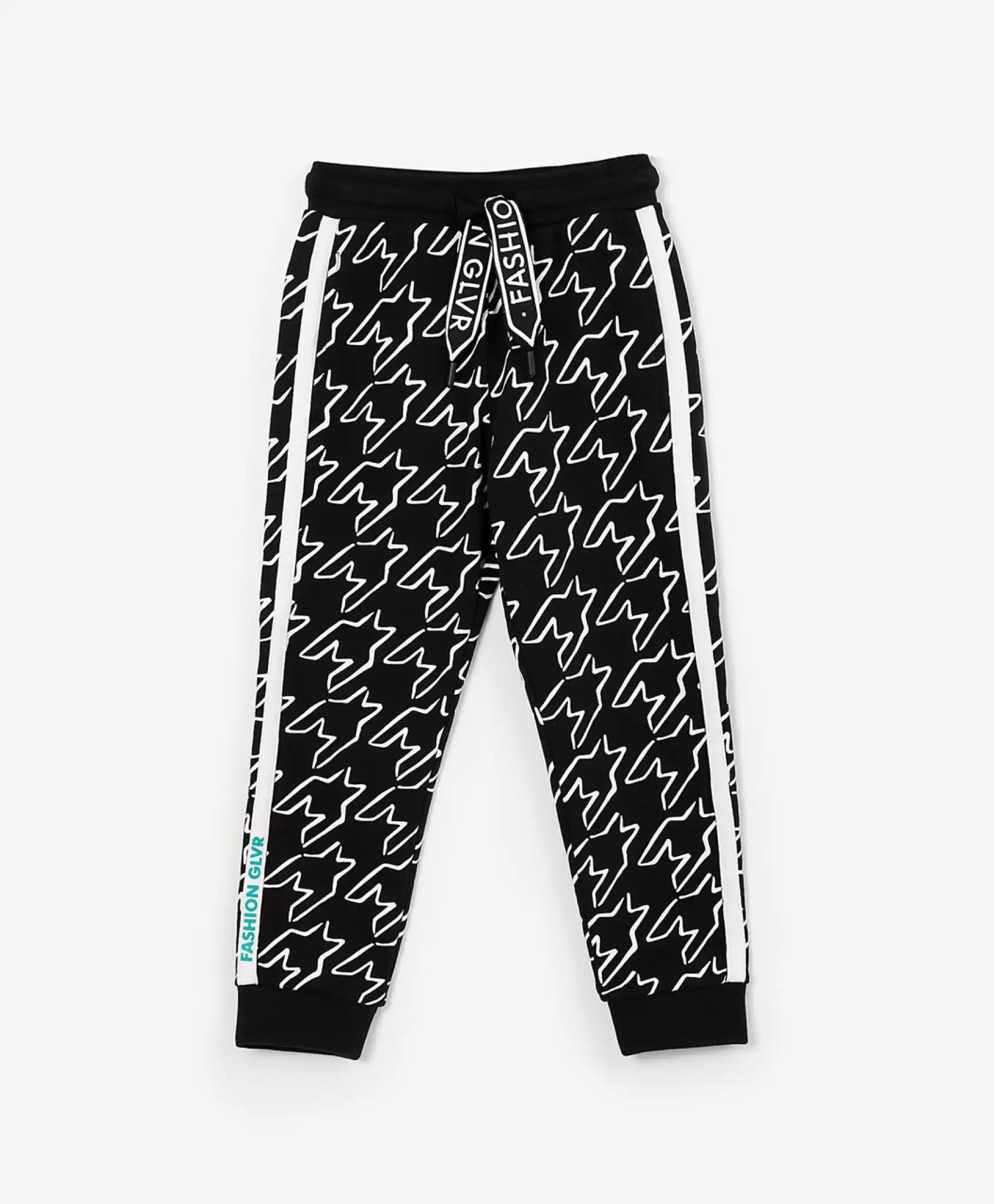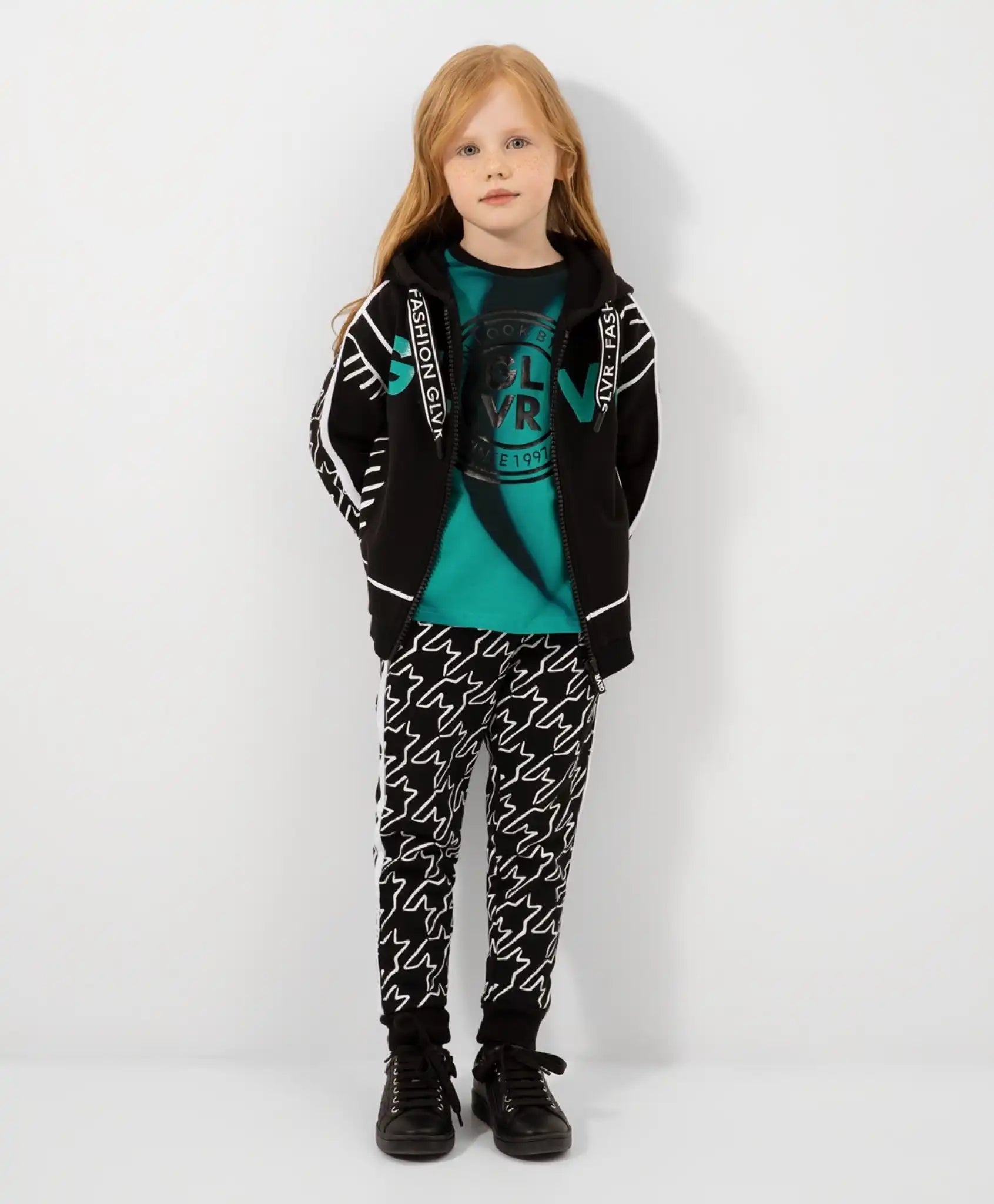Pantalonii tricot sunt un element esențial al garderobei zilnice pentru copii. Foarte confortabili, flexibili și practici, acești pantaloni cu talie elastică și șnur suplimentar, împletit lat, garantează confort și libertate de mișcare. Designul interesant al modelului, bazat pe o grafică alb-negru a materialului de bază și un contur contrastant cu dungi tricotate, face ca pantalonii să fie expresivi și memorabili. Pantalonii sunt decorați cu un petic din cauciuc colorat și un imprimeu tipografic strălucitor.