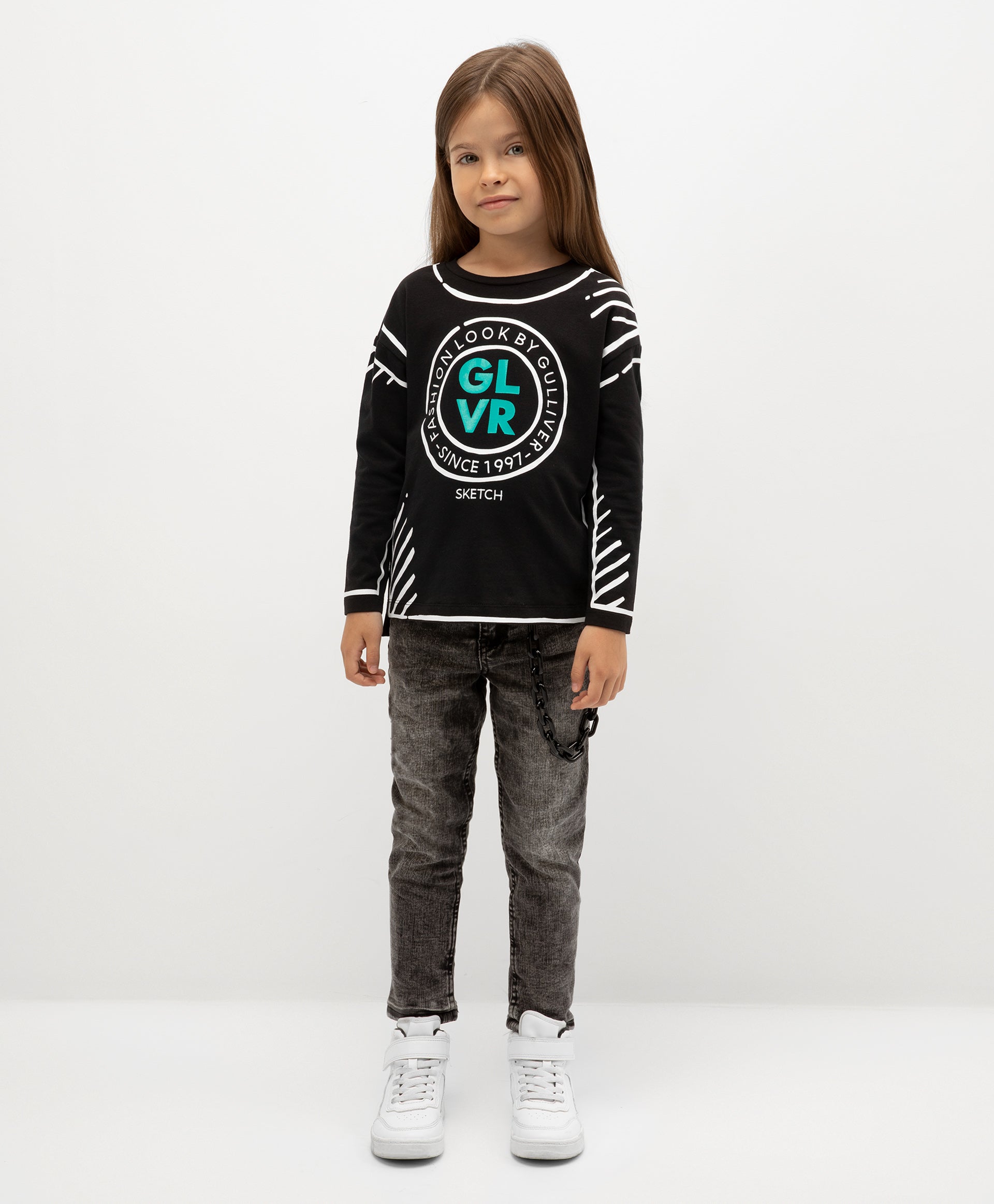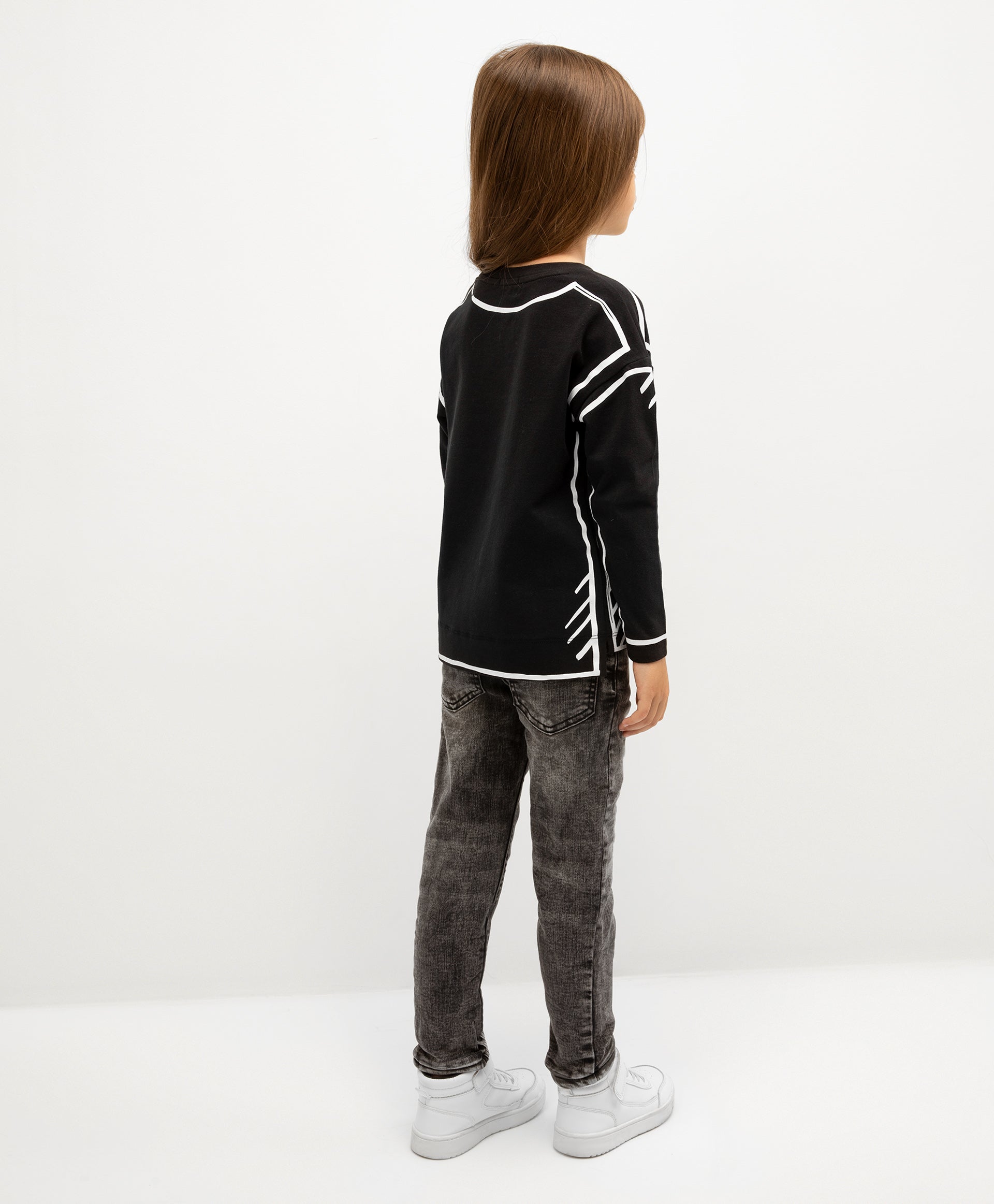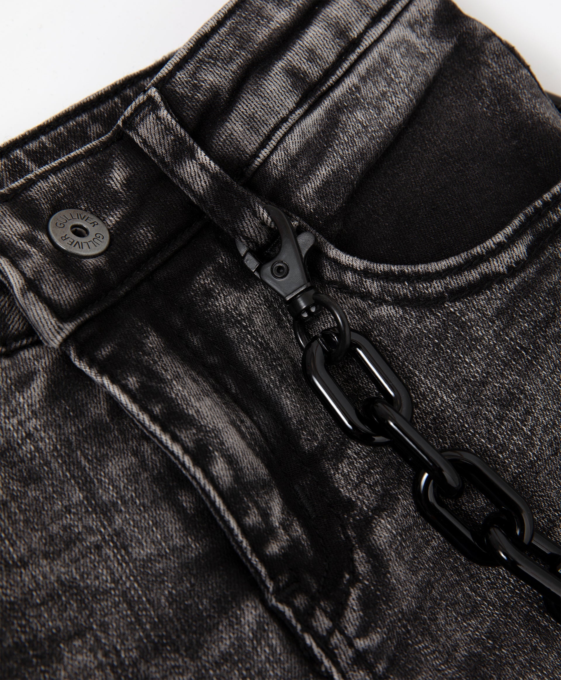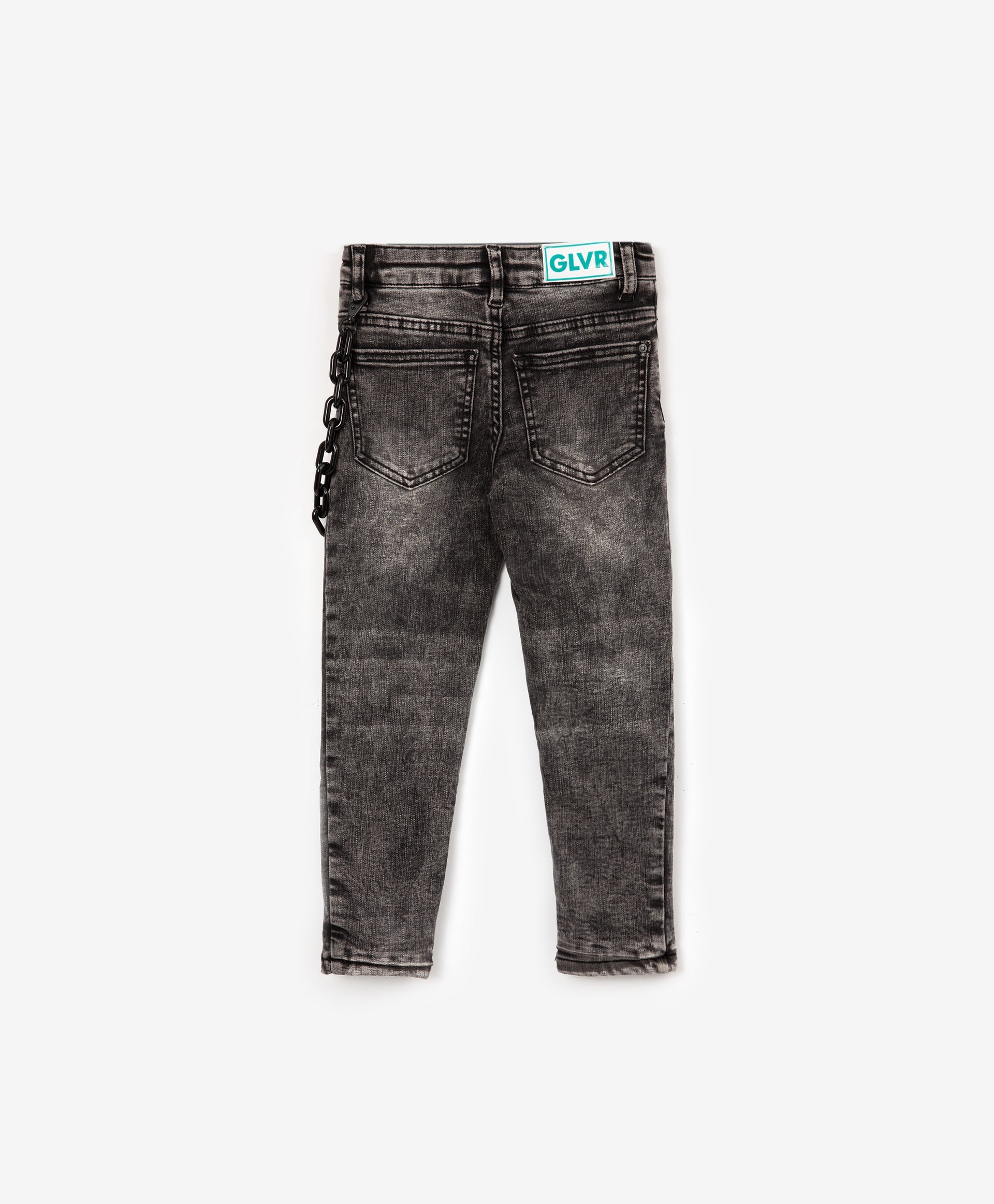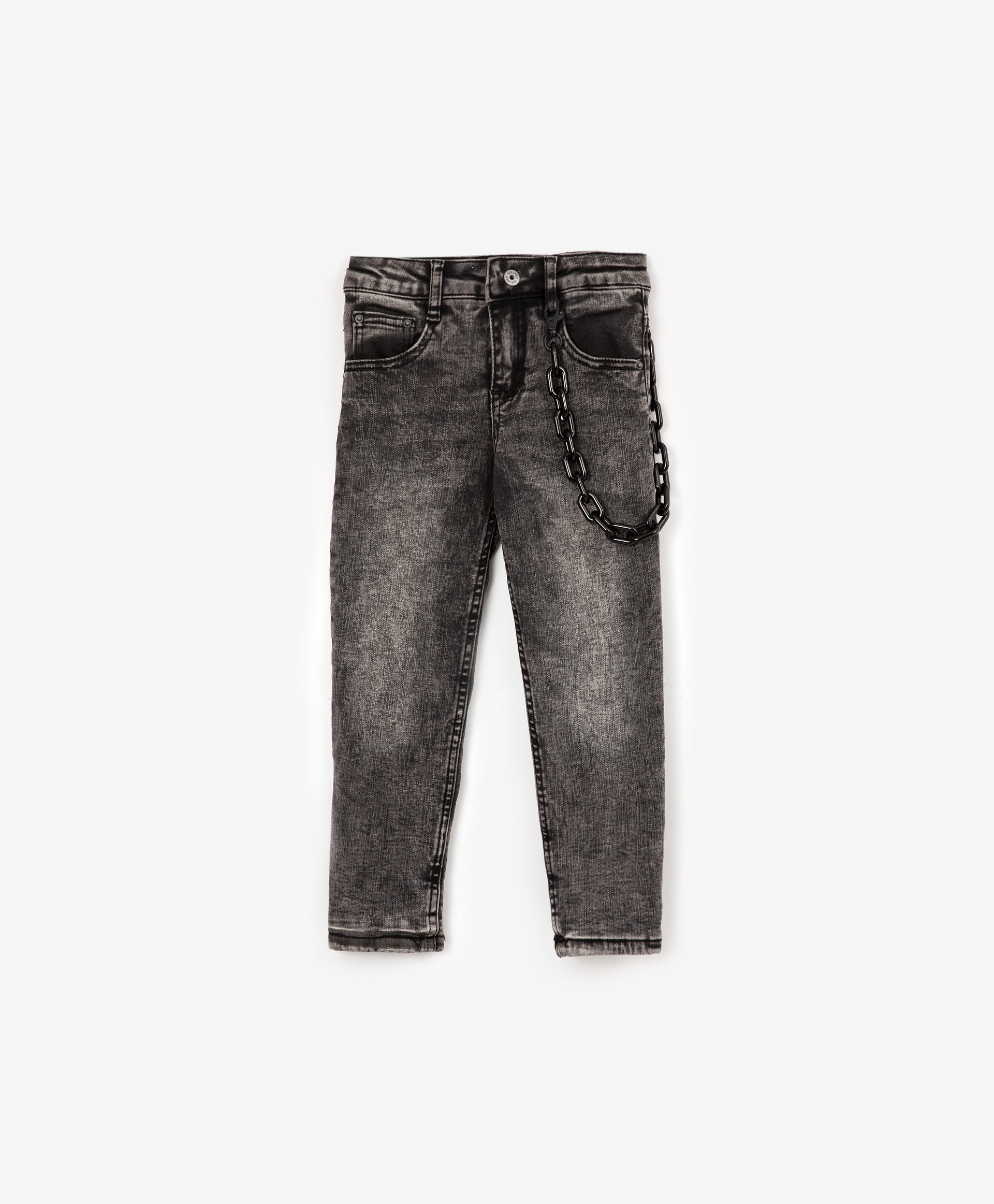 Дънки с подплата от флис – „must have“ за функционалния гардероб за разходки. Изработени от модерен сив деним с красива мраморна обработка, Дънките са удобни, практични и функционални. Еластанът в състава на материята прави носенето на модела със силует „slim“ комфортно за момичето. В декорацията е използвана цветна пластмасова верижка, която се прикрепя към гайките с карабинери, както и ярък гумен пач с обемни букви.