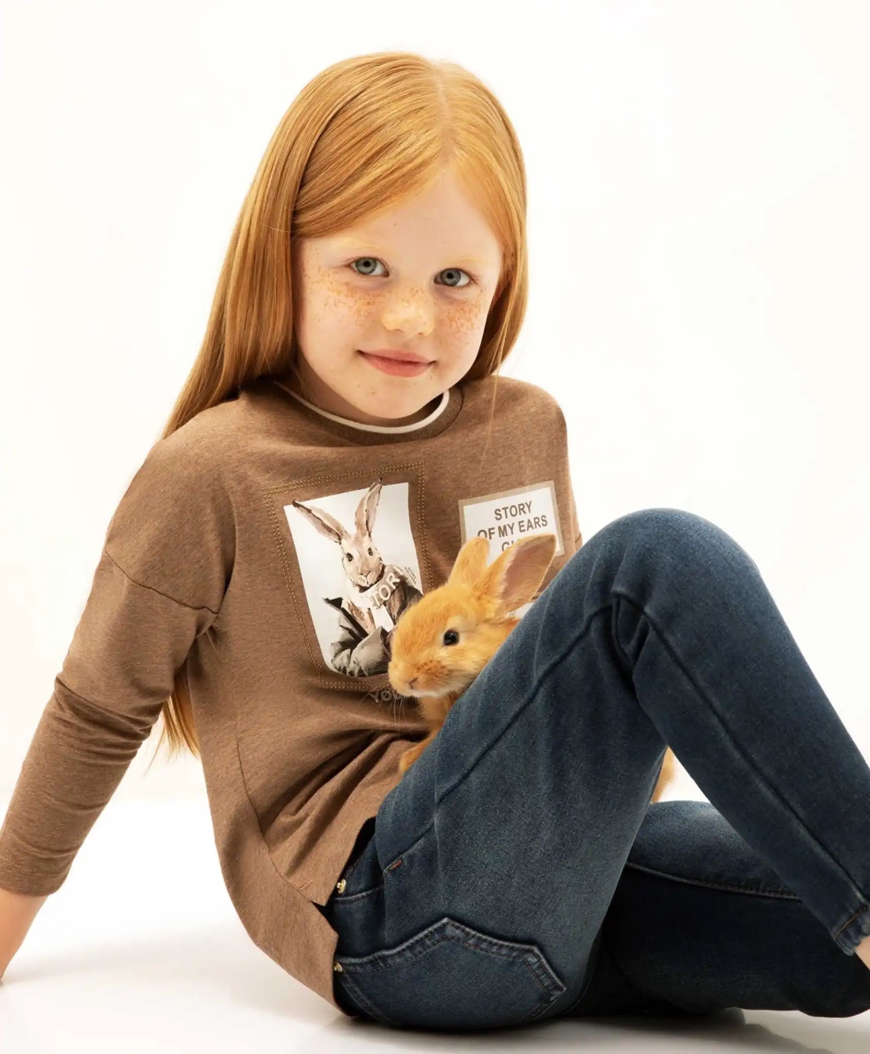 Tricoul cu mânecă lungă este o piesă esențială în garderoba de iarnă a unei fete. Confecționat dintr-un tricot melanj rafinat, oferă un aspect elegant și sofisticat. Croiala lejeră, umerii lăsați și linia spatelui prelungită conturează o formă modernă, extrem de confortabilă pentru copil. Designul discret, dar delicat, include imprimeuri originale, o etichetă cu elemente tipografice și mici accesorii metalice în nuanța „aur deschis”, oferind un aer sofisticat.
