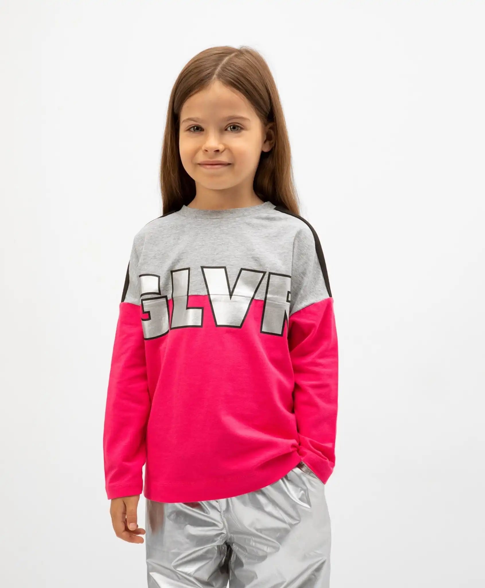 Bluza cu mânecă lungă este concepută pe principiul color blocking. Forma modernă voluminoasă și umerii lăsați fac ca această bluză să fie extrem de confortabilă pentru purtarea zilnică. Designul interesant al modelului, evidențiat printr-un imprimeu argintiu de mari dimensiuni, contribuie la crearea unor ținute energice și vibrante în stil sportiv.
