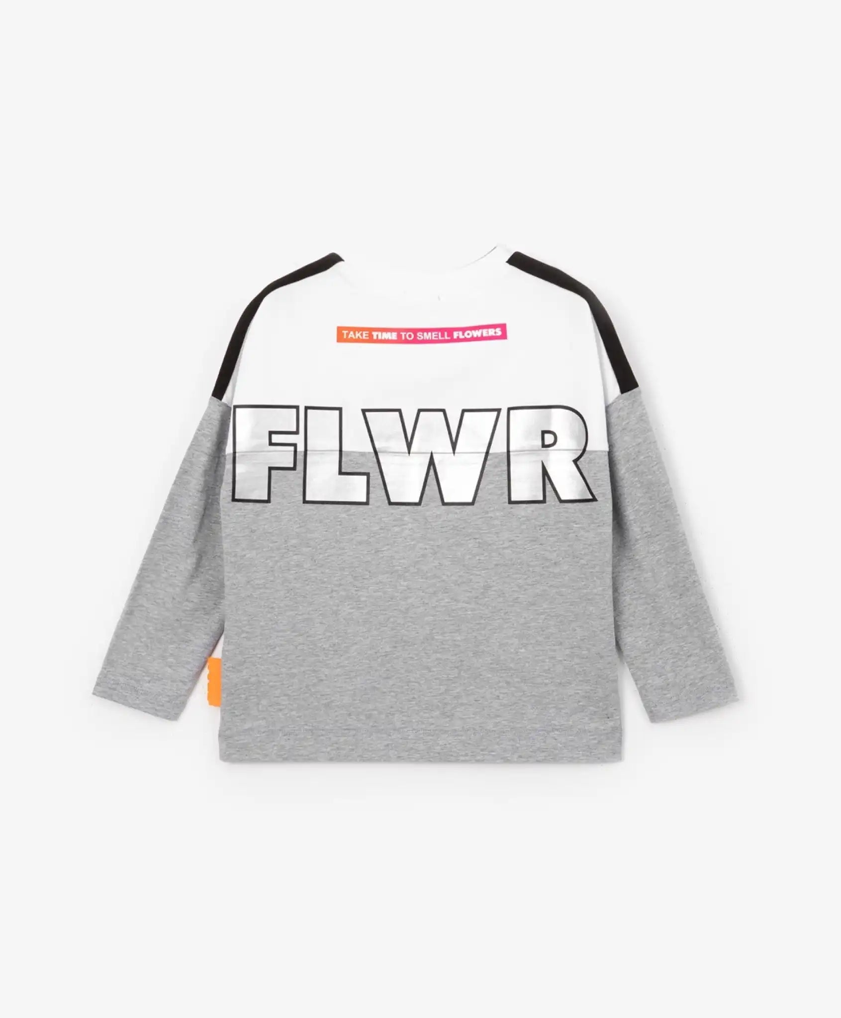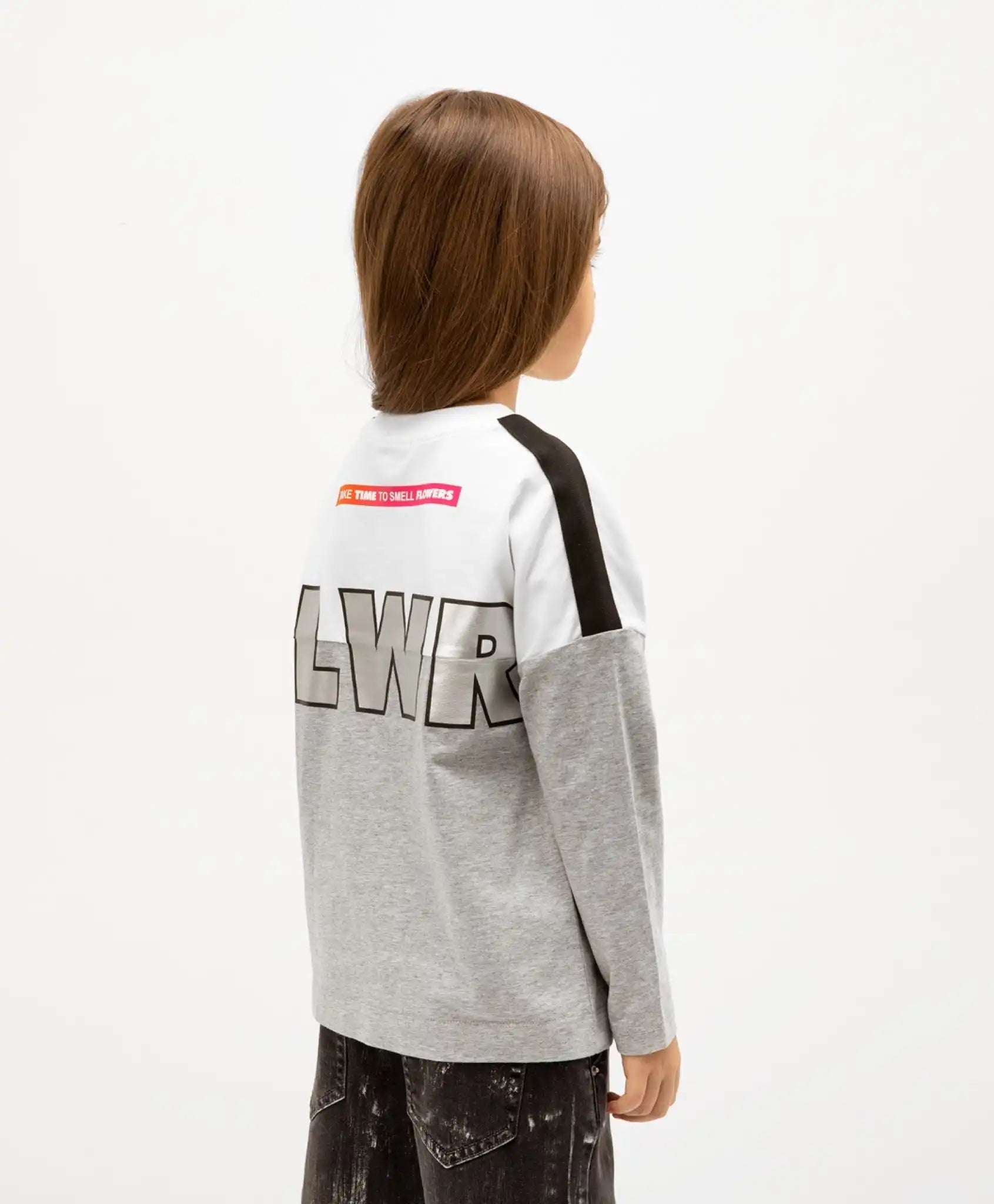 Bluza cu mânecă lungă este concepută pe principiul color blocking. Forma modernă voluminoasă și umerii lăsați asigură confort maxim pentru purtarea zilnică. Designul interesant al modelului, cu un imprimeu argintiu supradimensionat, contribuie la formarea unor ținute energice și dinamice în stil sportiv.