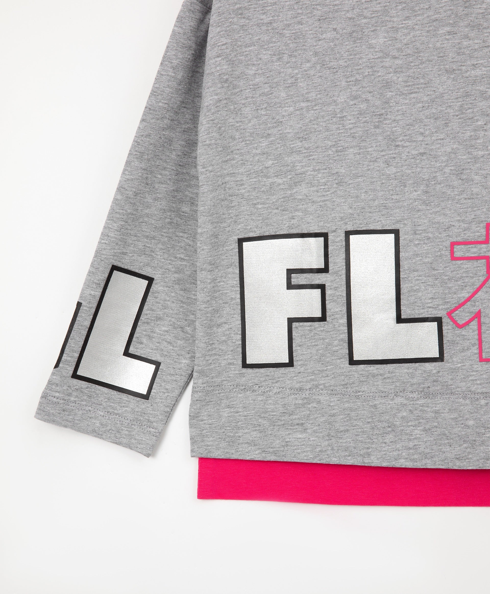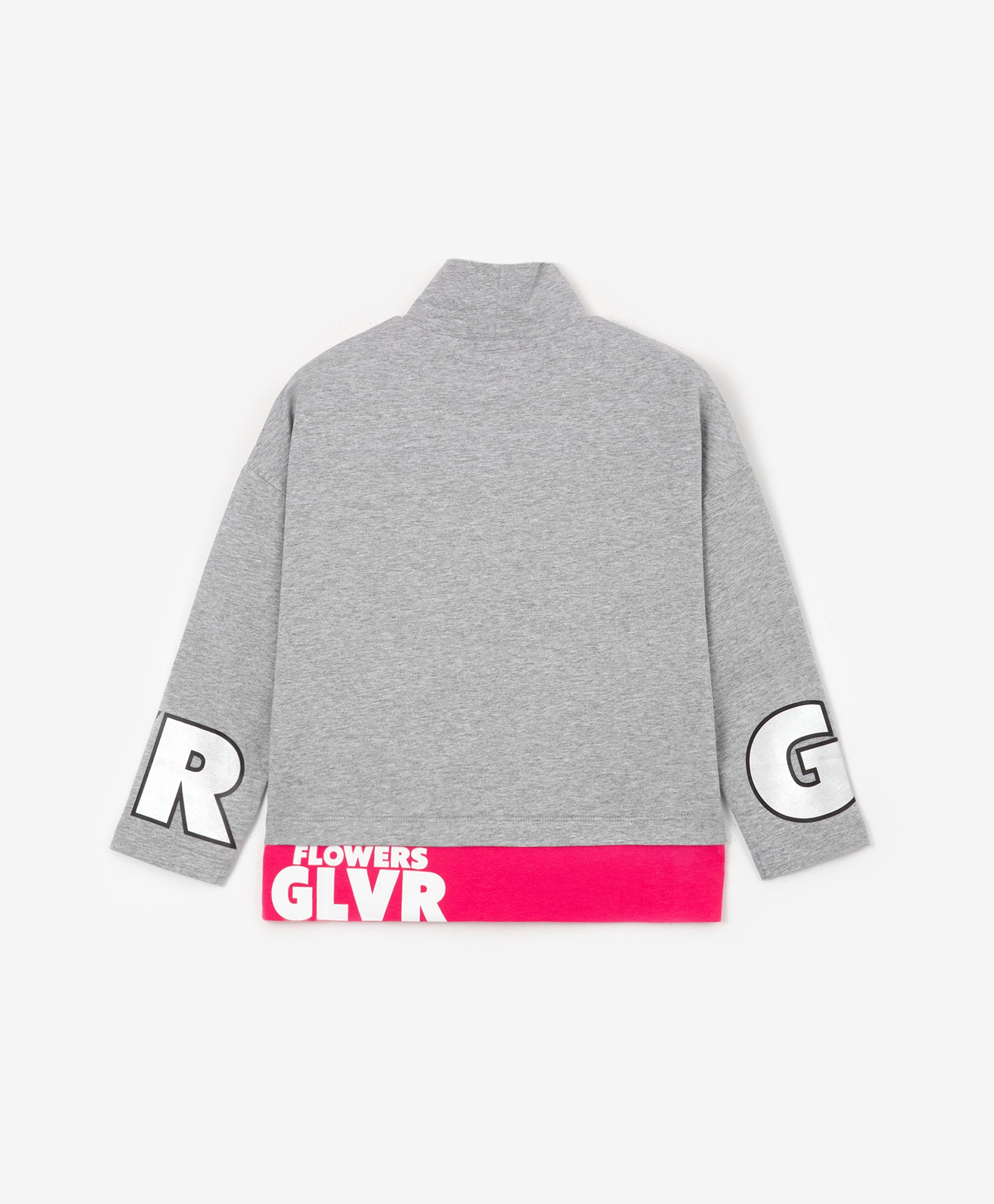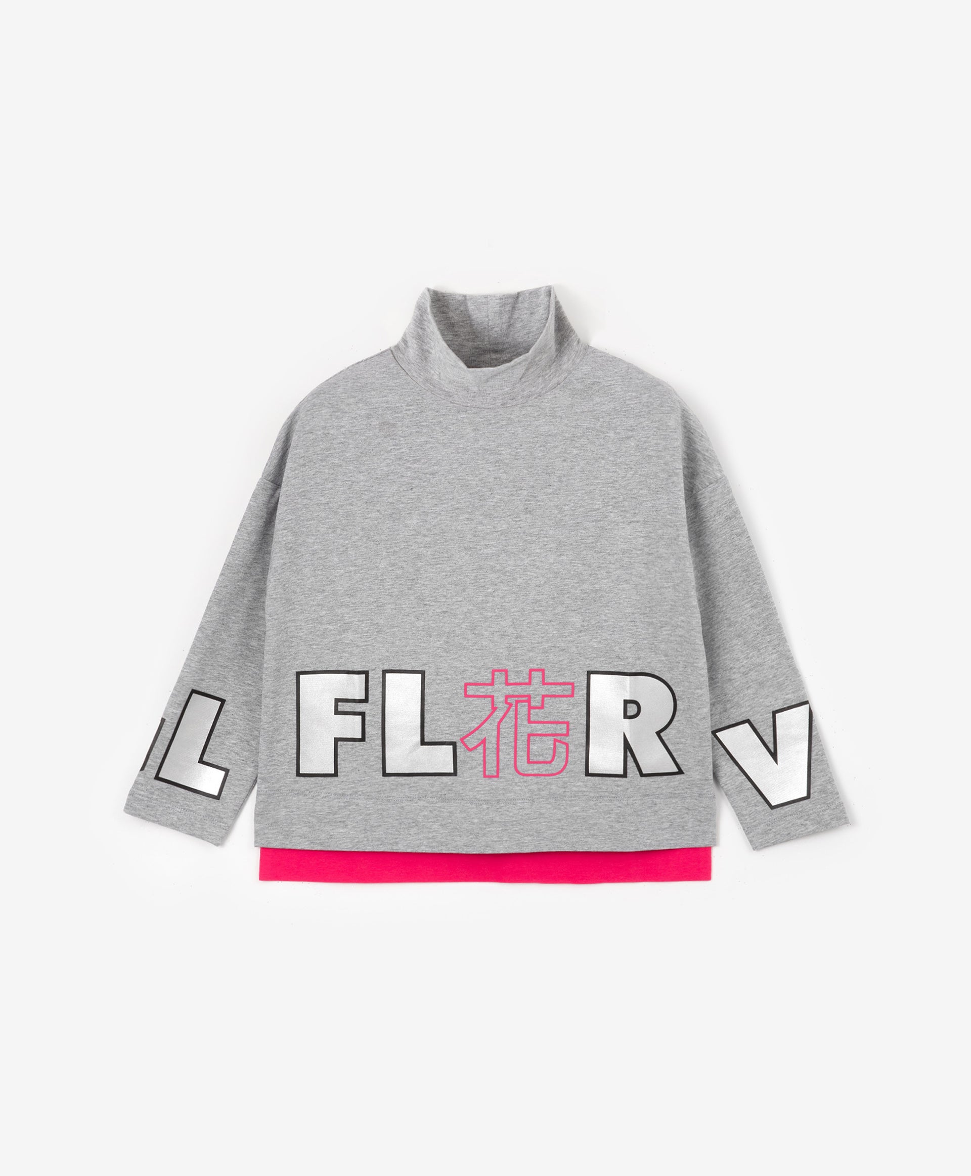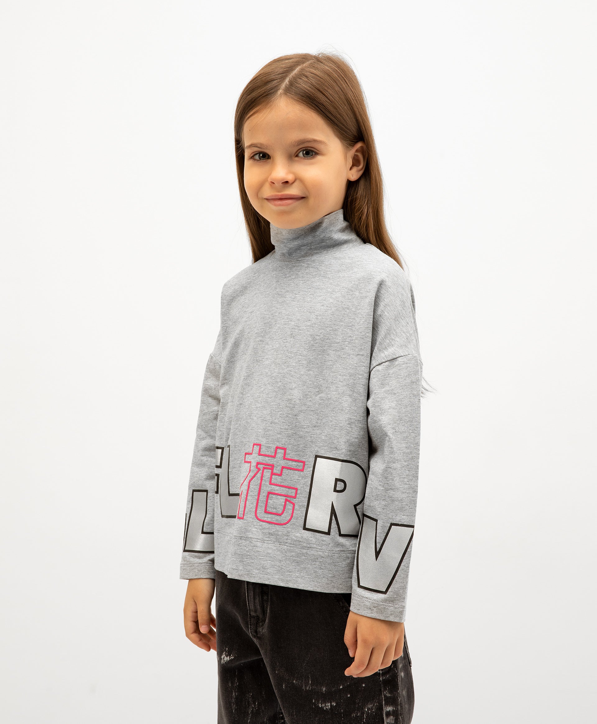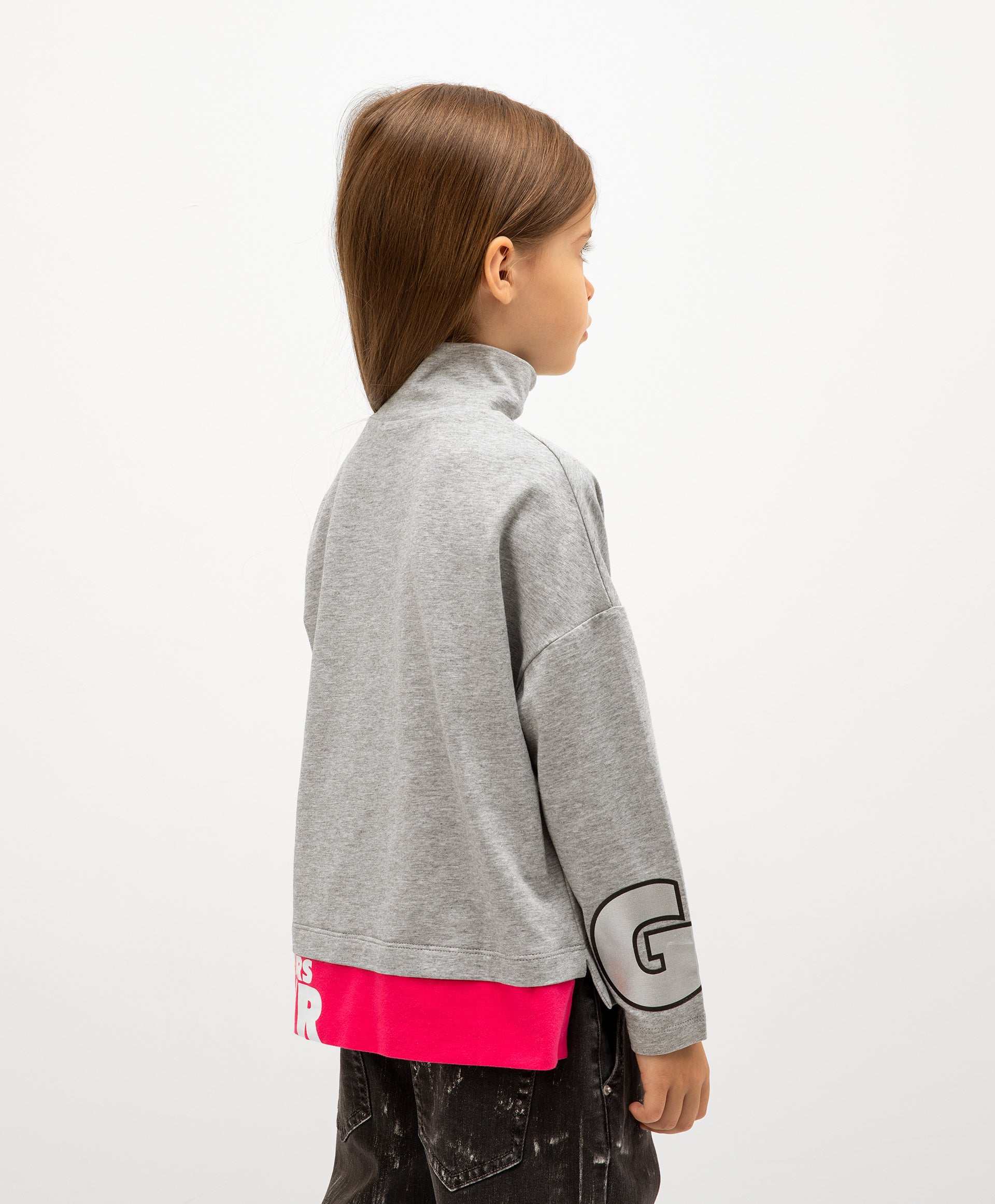 Сива меланжирана поло-блуза с детайли от ярък едноцветен трикотаж, имитираща модерна многослойност. Обемната форма и падналото рамо правят блузата удобна и приятна за ежедневно носене. Интересният дизайн, фокусиращ вниманието върху голям сребрист декор (принт и бродерия), допринася за формирането на ярки и енергични детски образи в спортен стил.