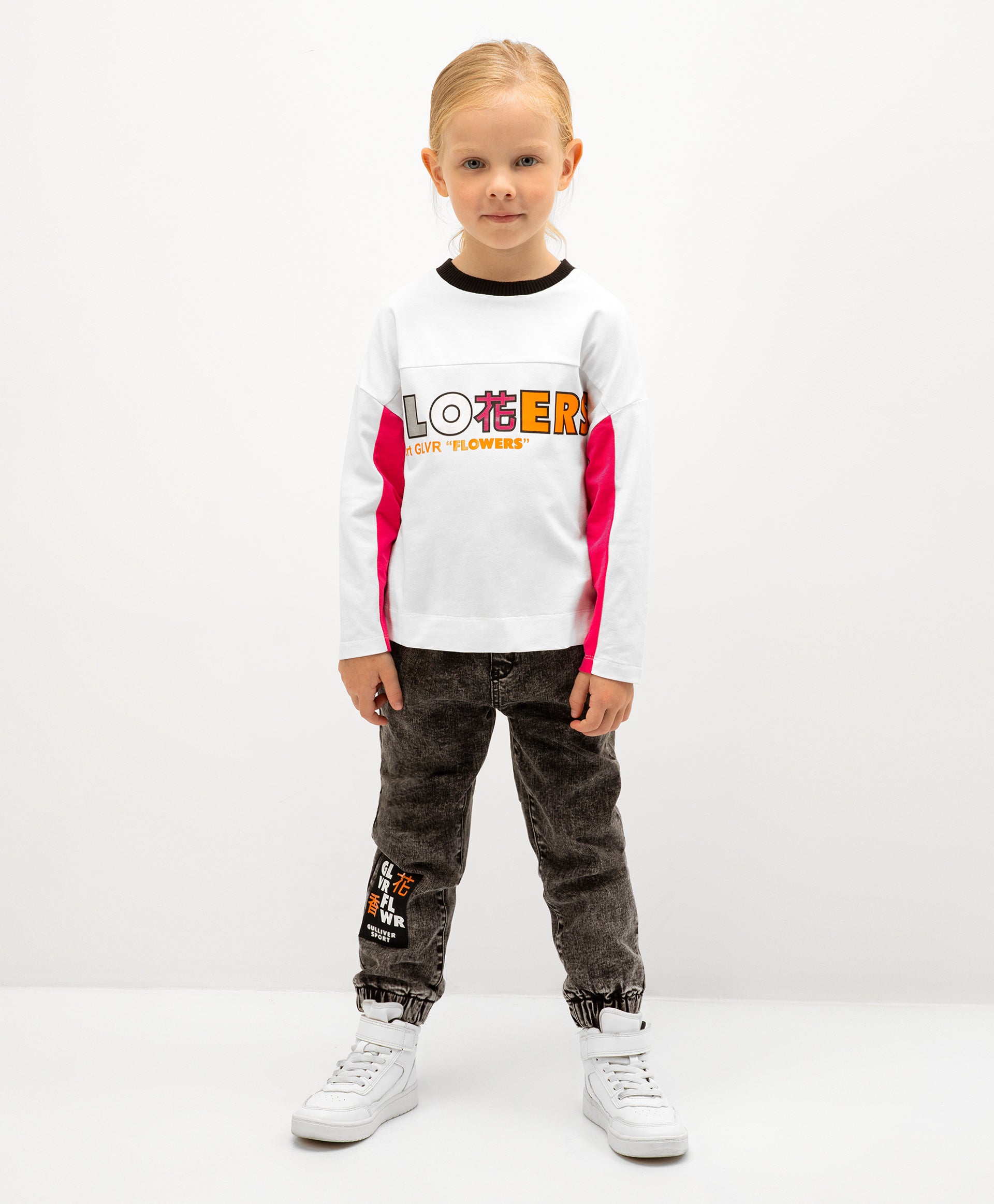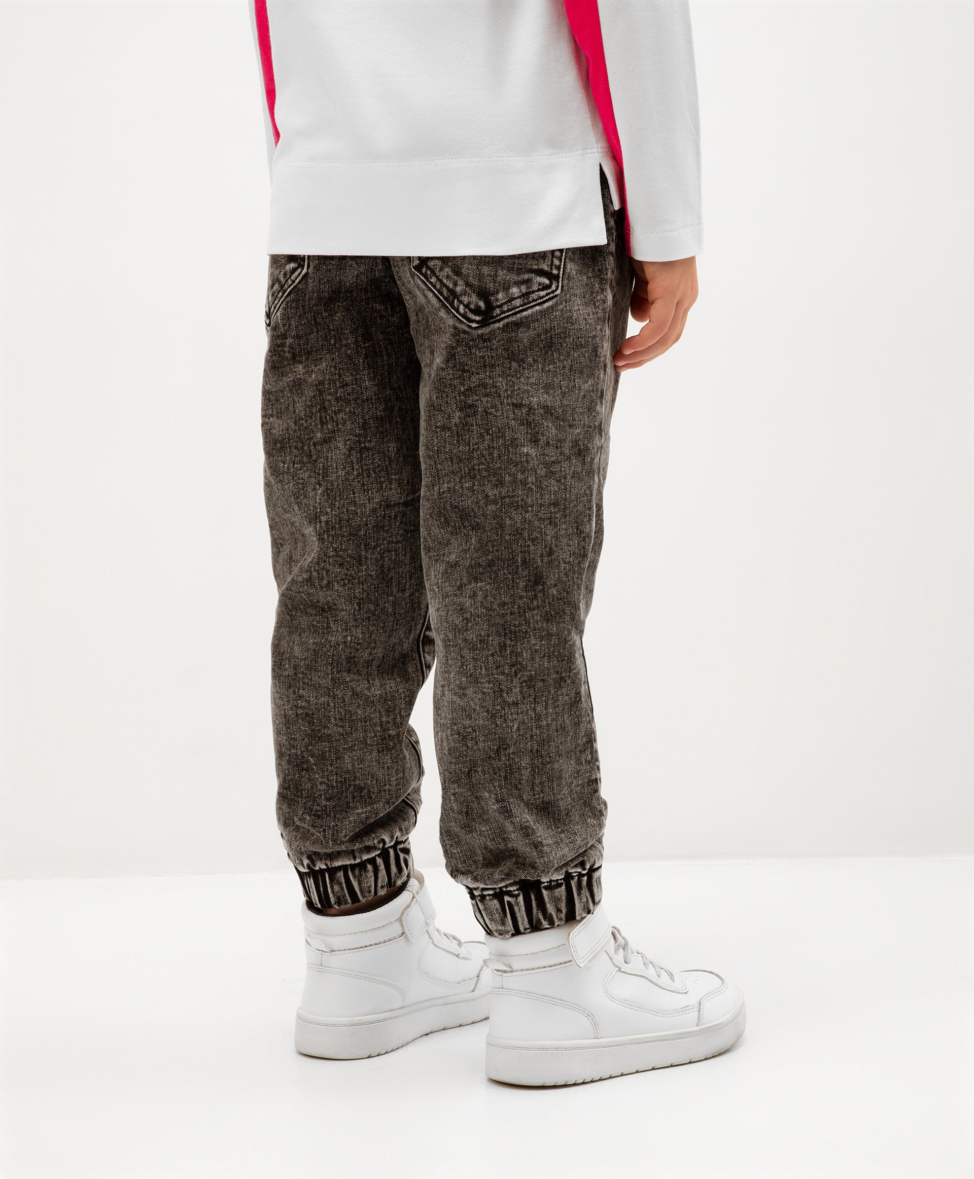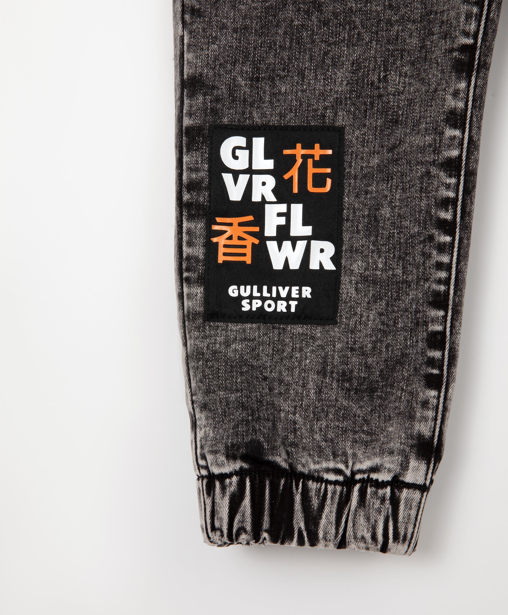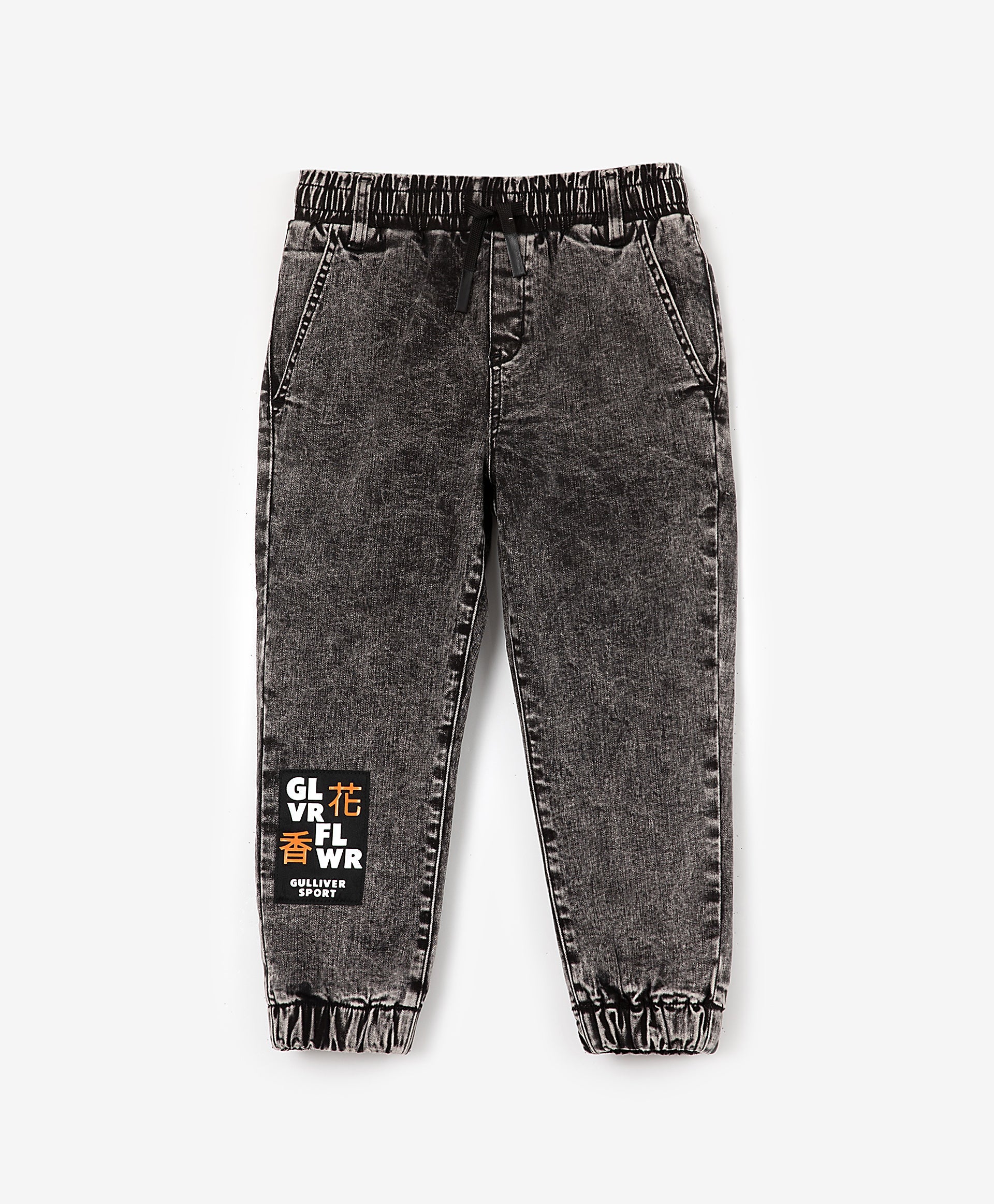 Дънки с подплата от флис – „must have“ за функционалния гардероб на момичето. Изработени от модерен сив деним с мраморен ефект, те са удобни и практични. Модерната форма тип „джогър“ гарантира комфорт дори в дъждовно време. В оформлението е използван жакардов пач със светлоотразителни елементи за по-голяма безопасност в тъмната част на денонощието. (В декора присъства йероглиф, който означава „аромат на цветя“).