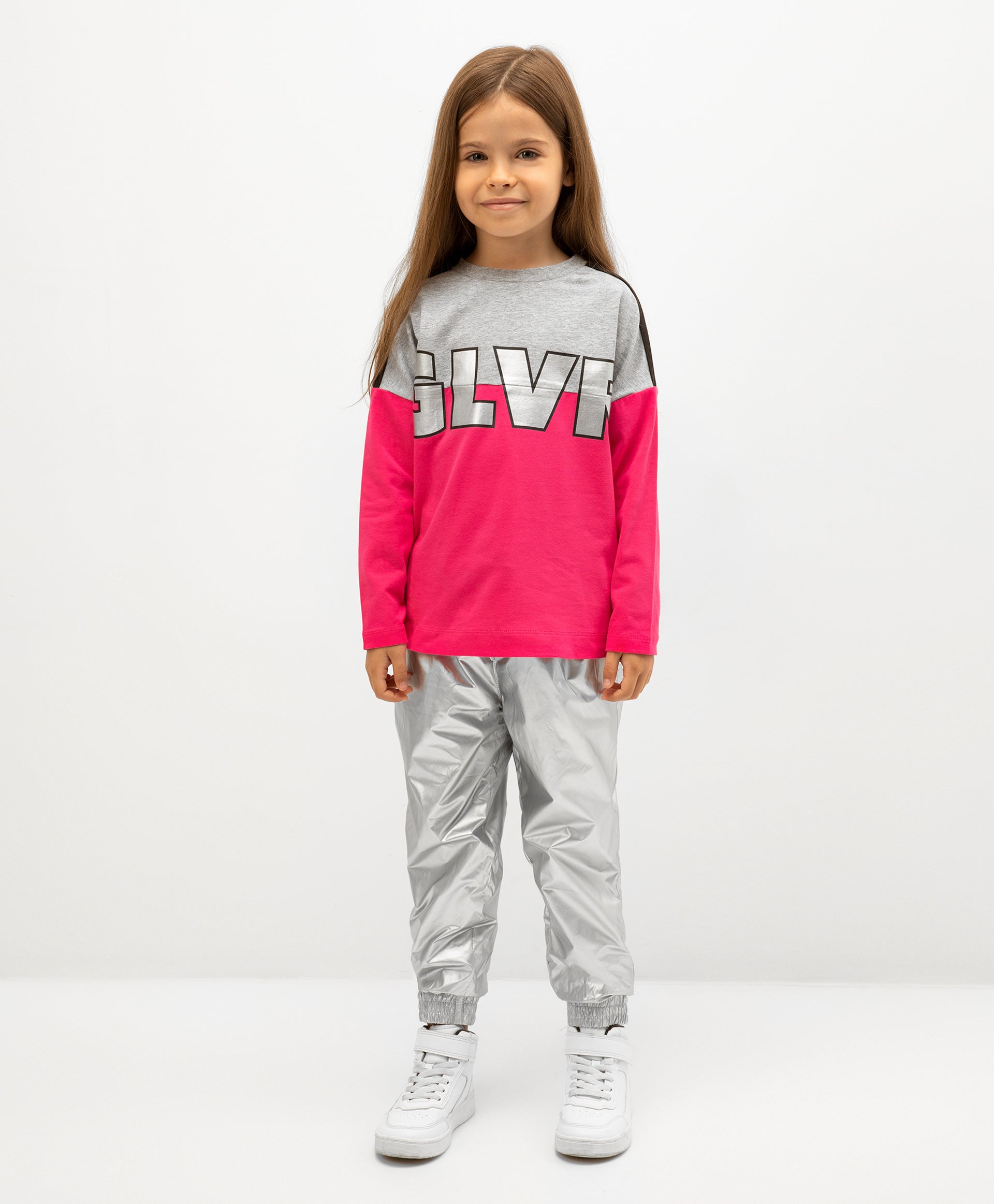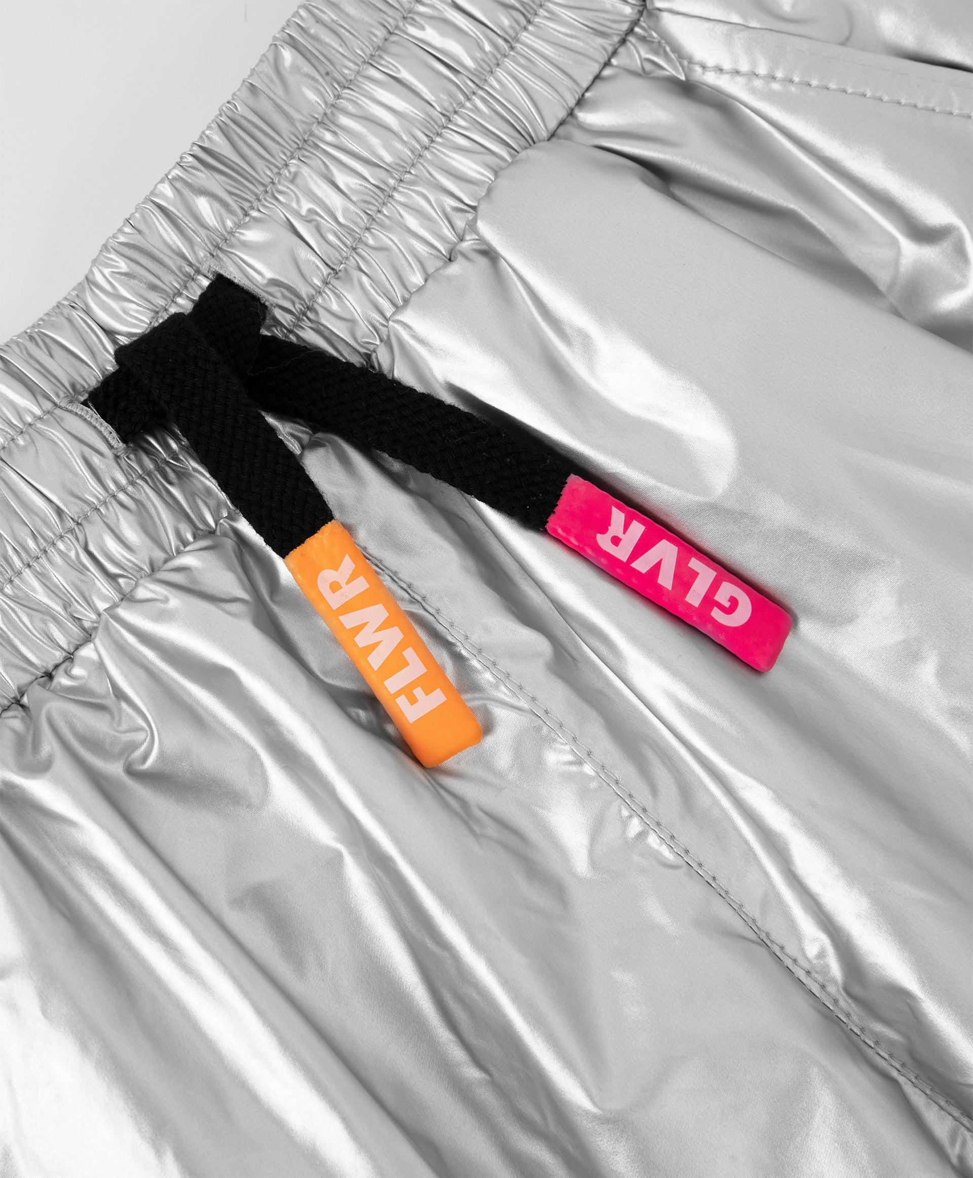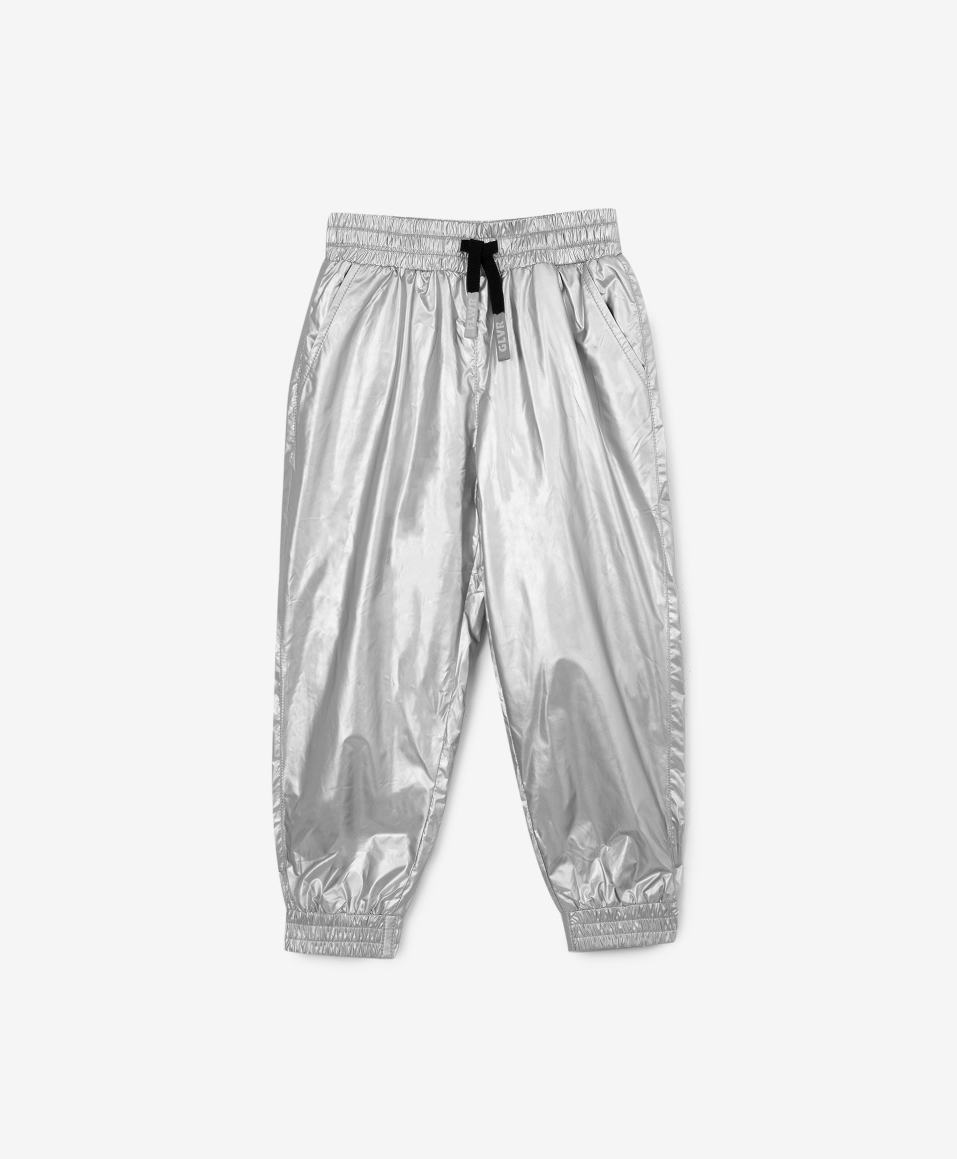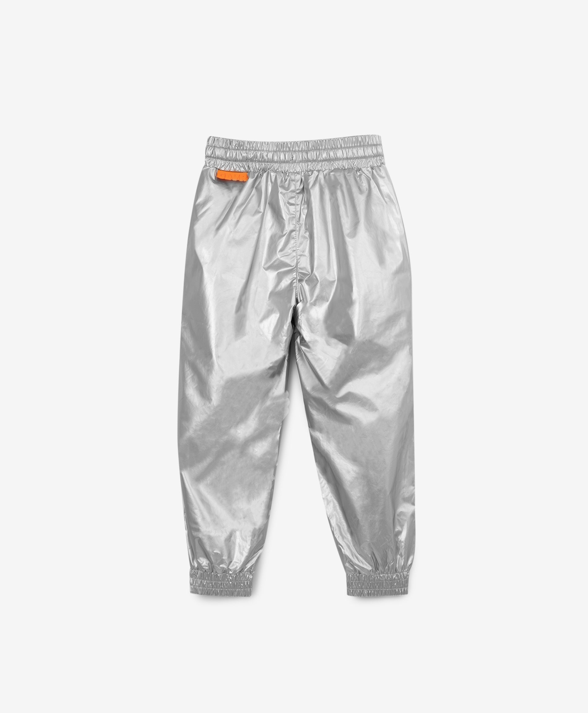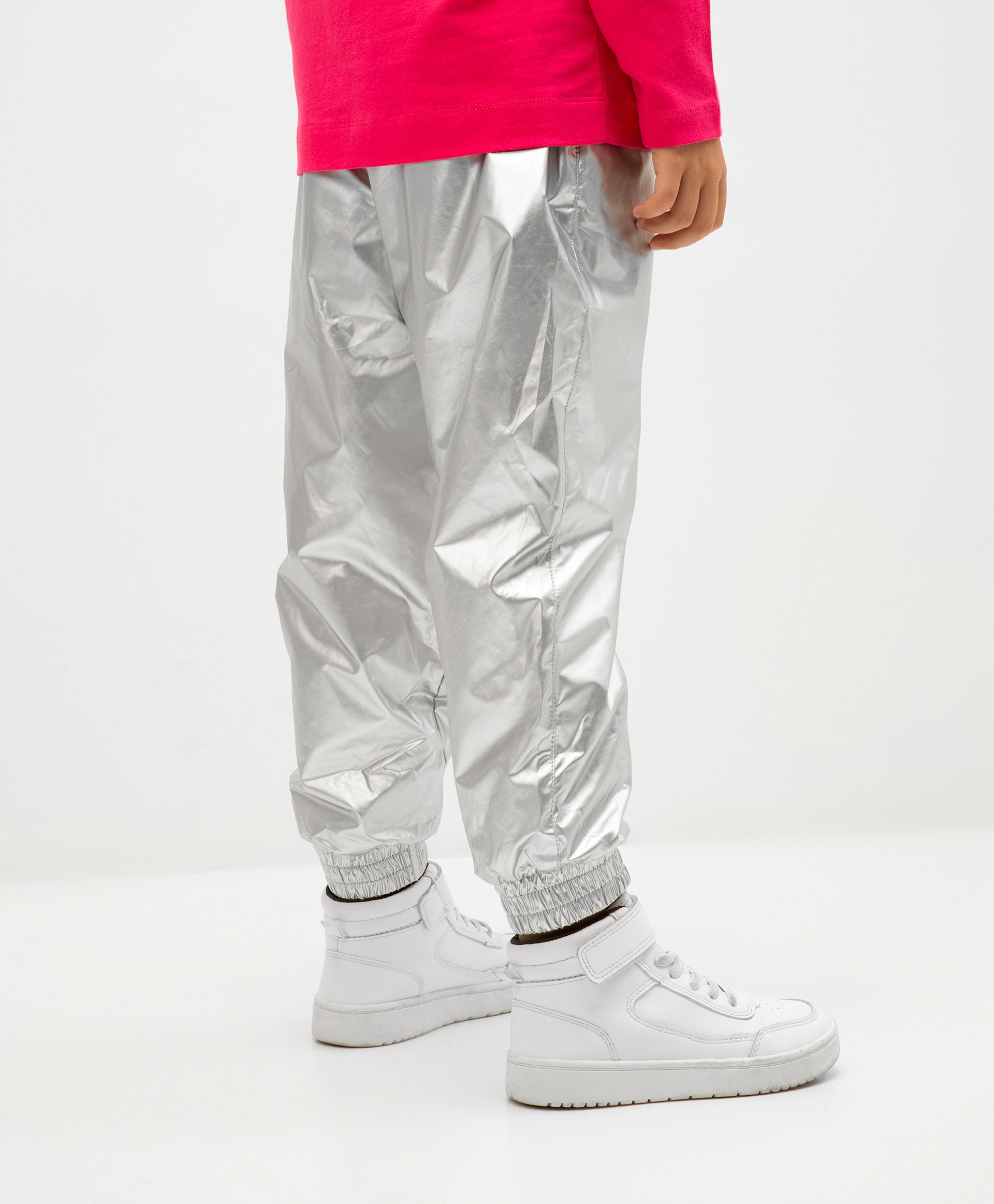 Панталони с подплата от флис, изработени от сребрист плащов плат – стилен, оригинален и интересен вариант! Ластикът на талията и маншетите прави панталоните удобни и практични. В оформлението са използвани връзки на колана с плоски цветни накрайници и брандиран гумен елемент (флагче).