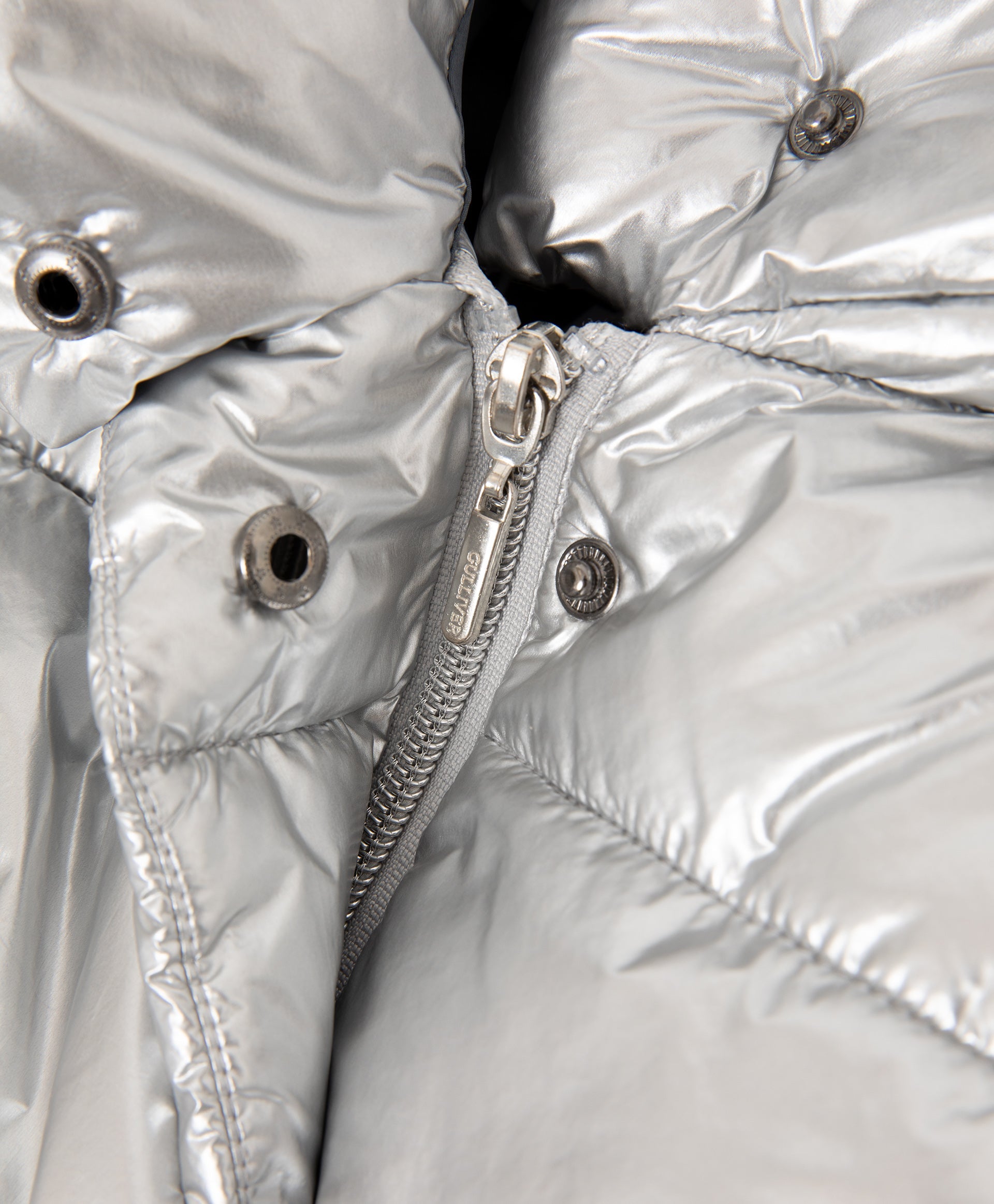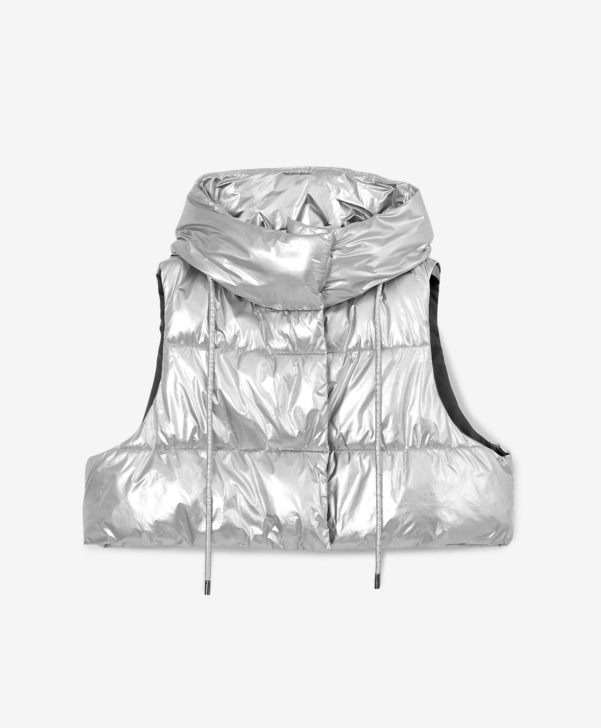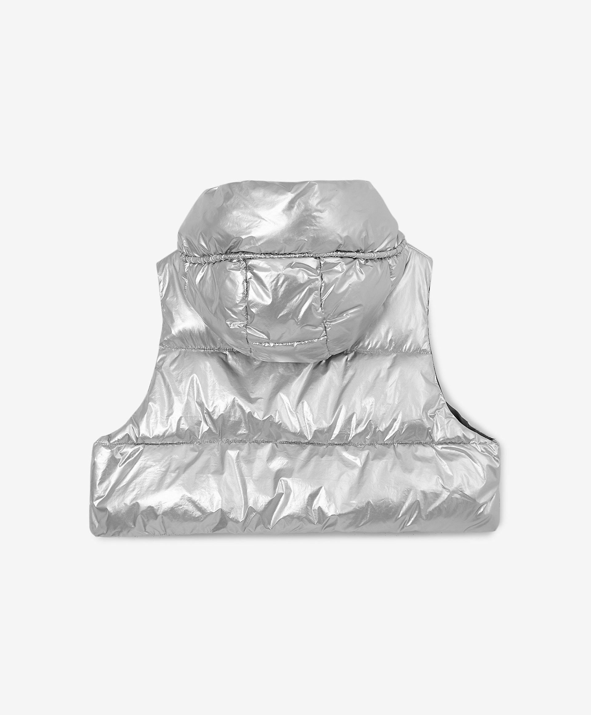 Елек от сияен сребрист плащов плат с изкуствен пух – ярък тренди модел, който ще утвърди имиджа на момичето като модна икона! Скъсената дължина и свободният обем подчертават модерните пропорции и правят визията по-дръзка.