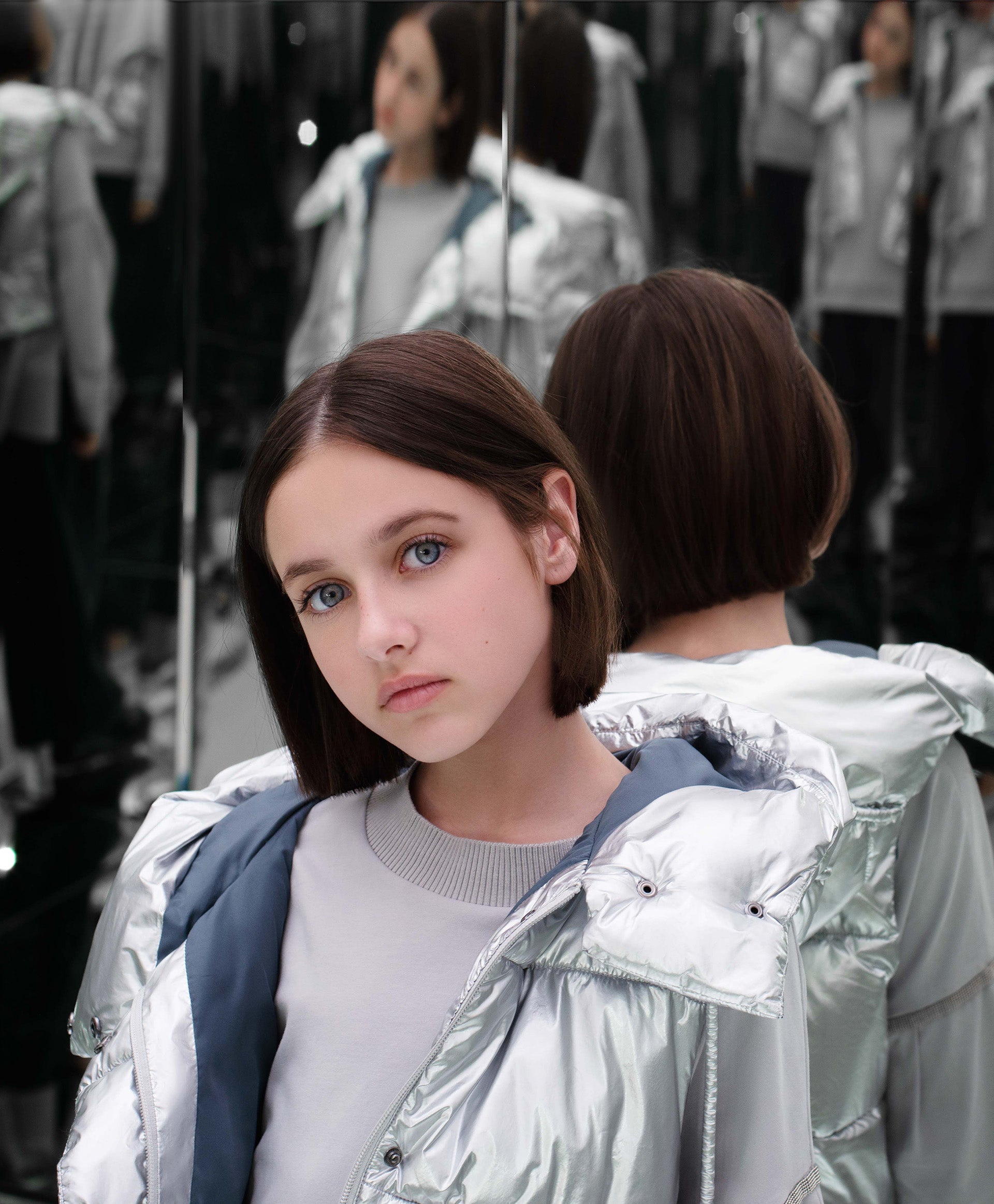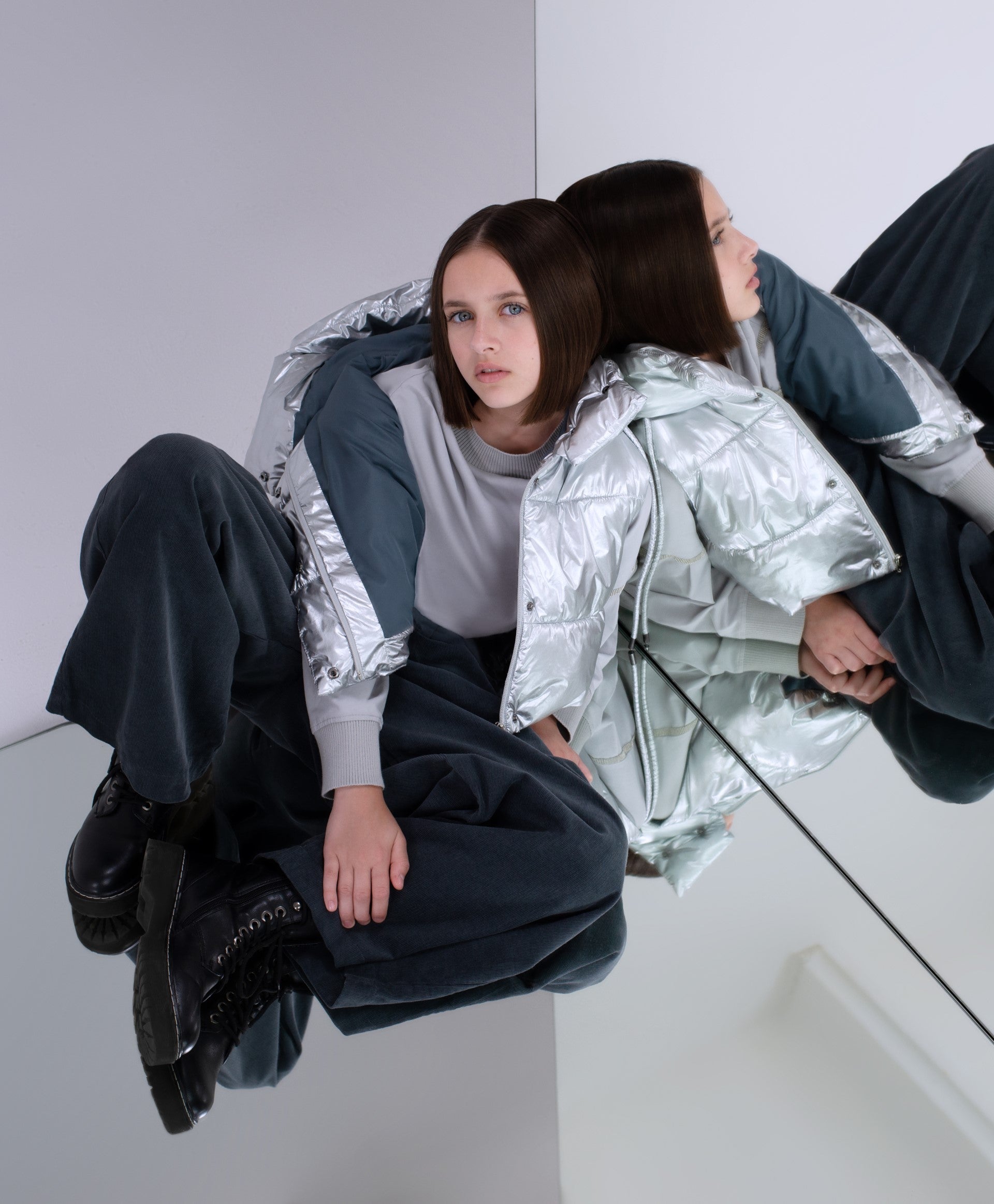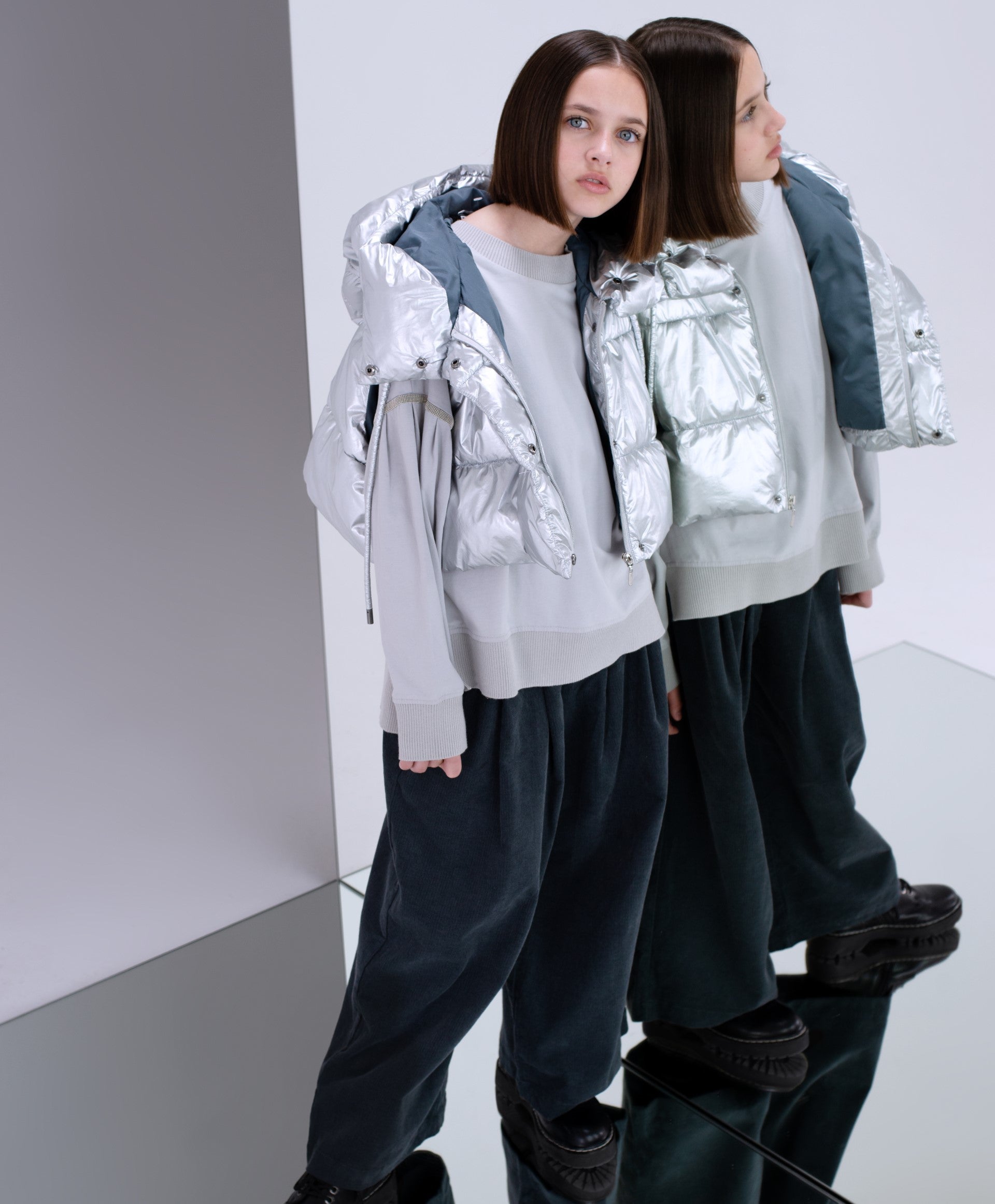 Елек от сияен сребрист плащов плат с изкуствен пух – ярък тренди модел, който ще утвърди имиджа на момичето като модна икона! Скъсената дължина и свободният обем подчертават модерните пропорции и правят визията по-дръзка.